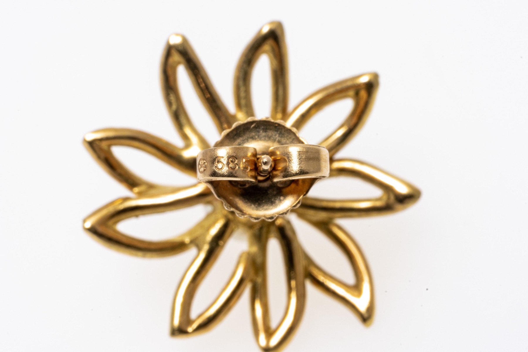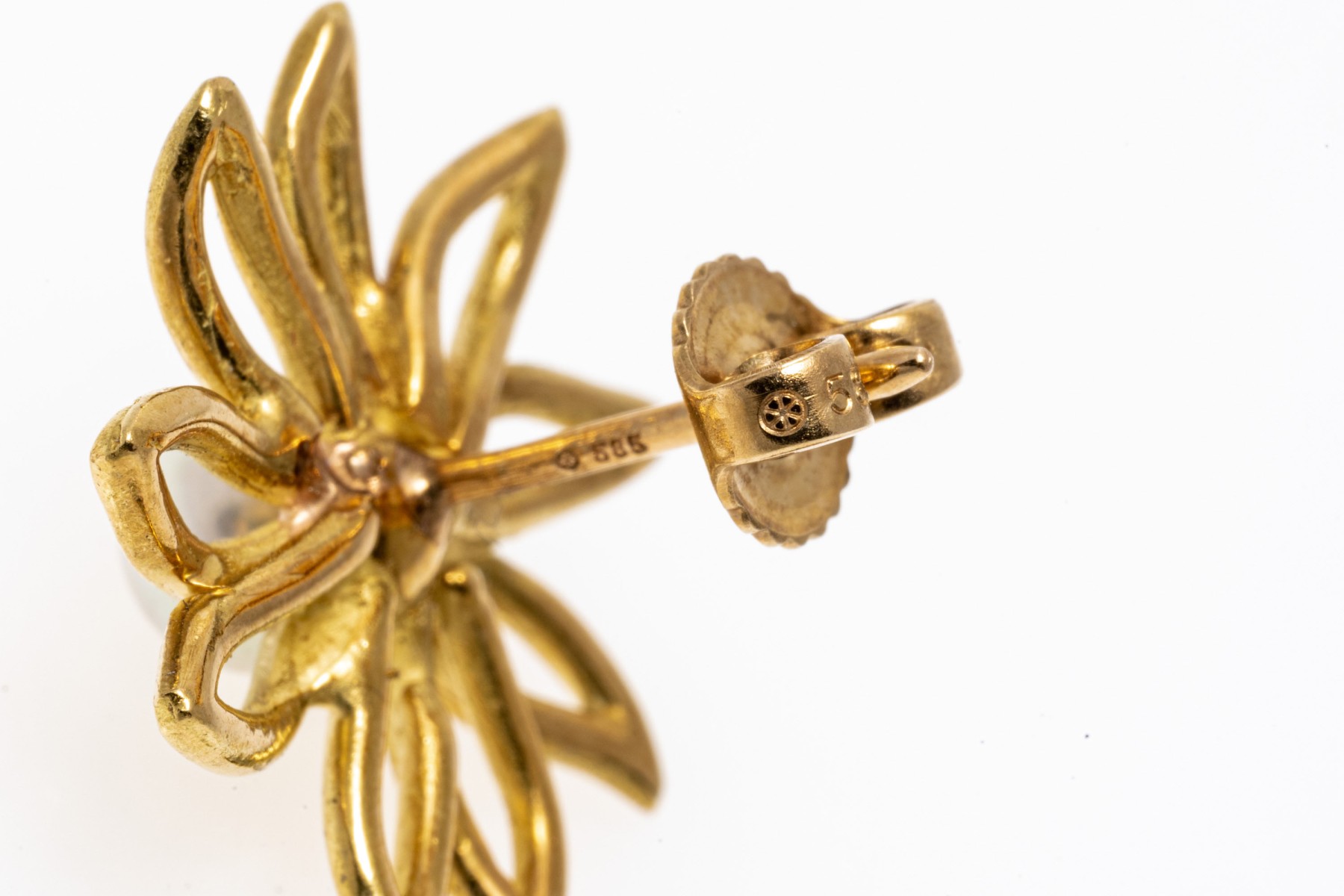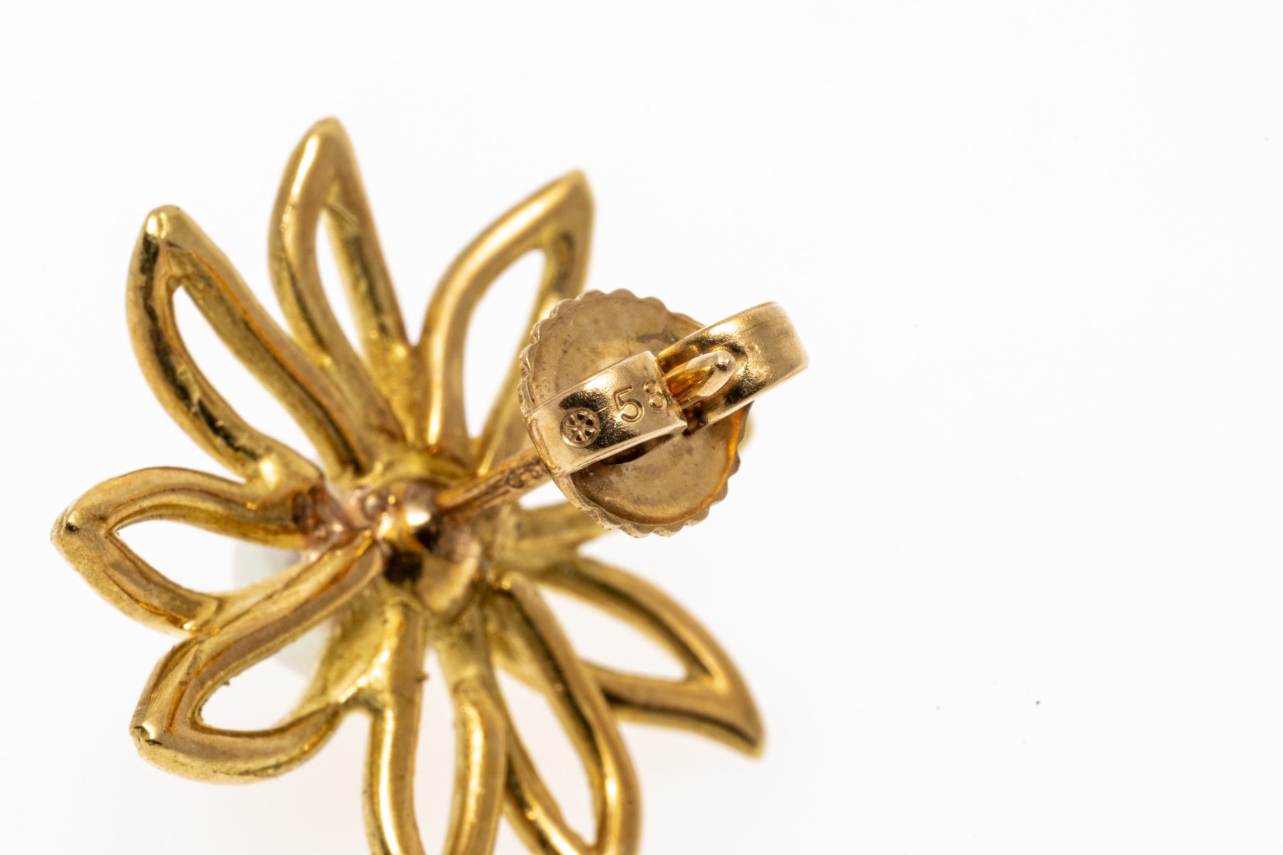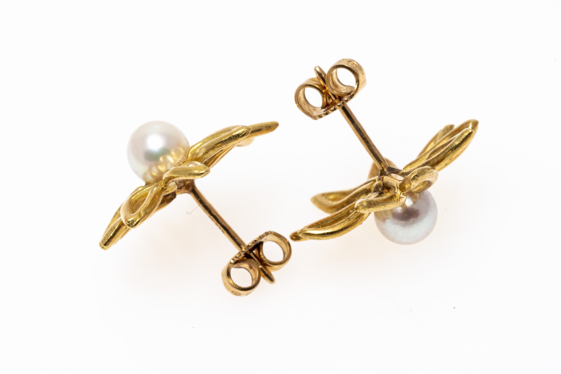 14K yellow gold earrings. These earrings display single 5.5mm cultured pearl with light pink overtones, at the center of an open floral design. Post and clutch backings.