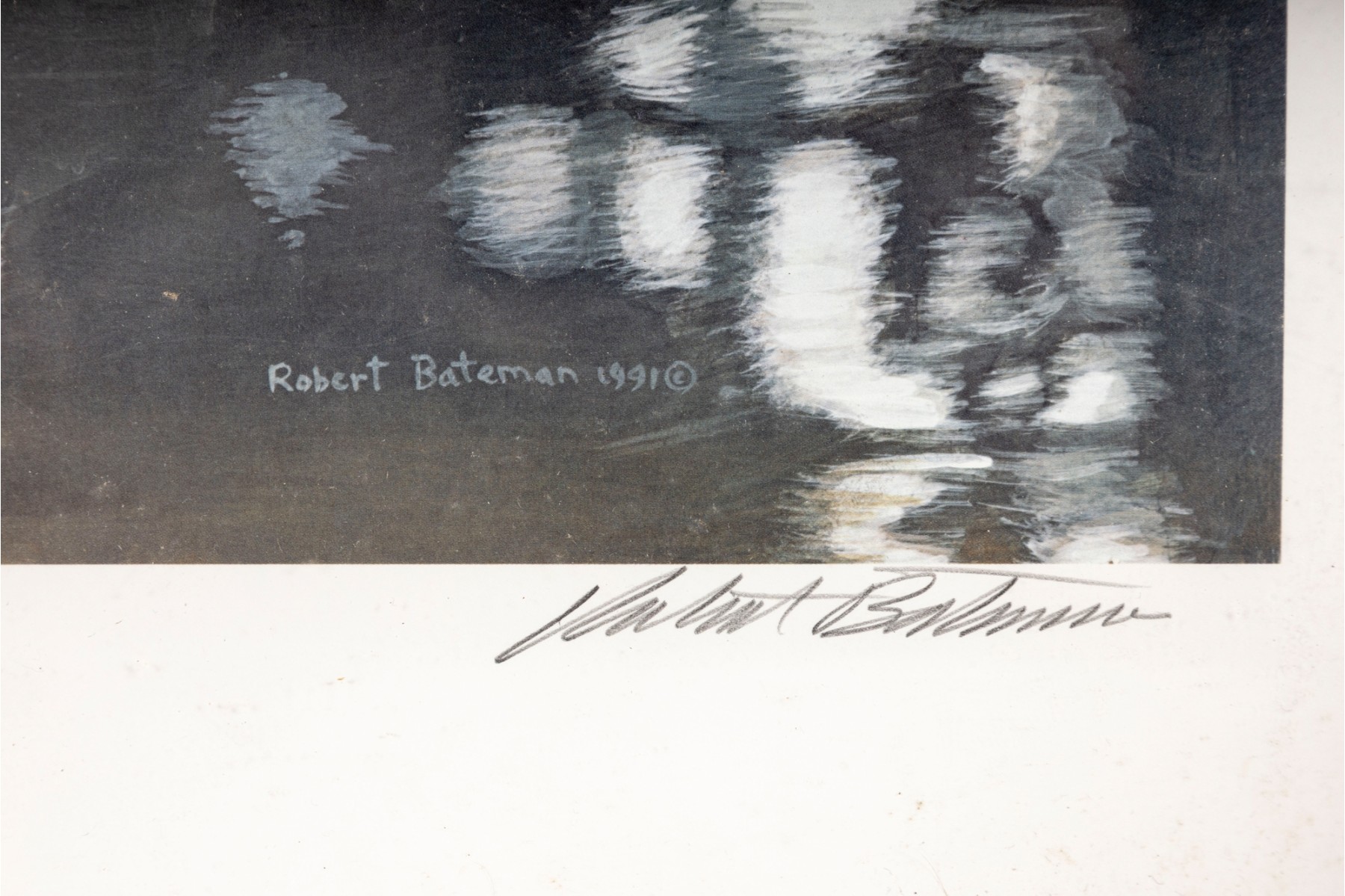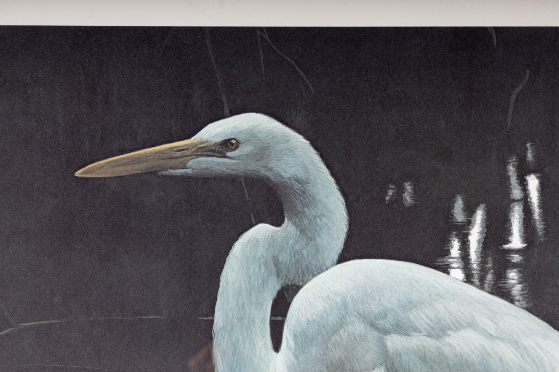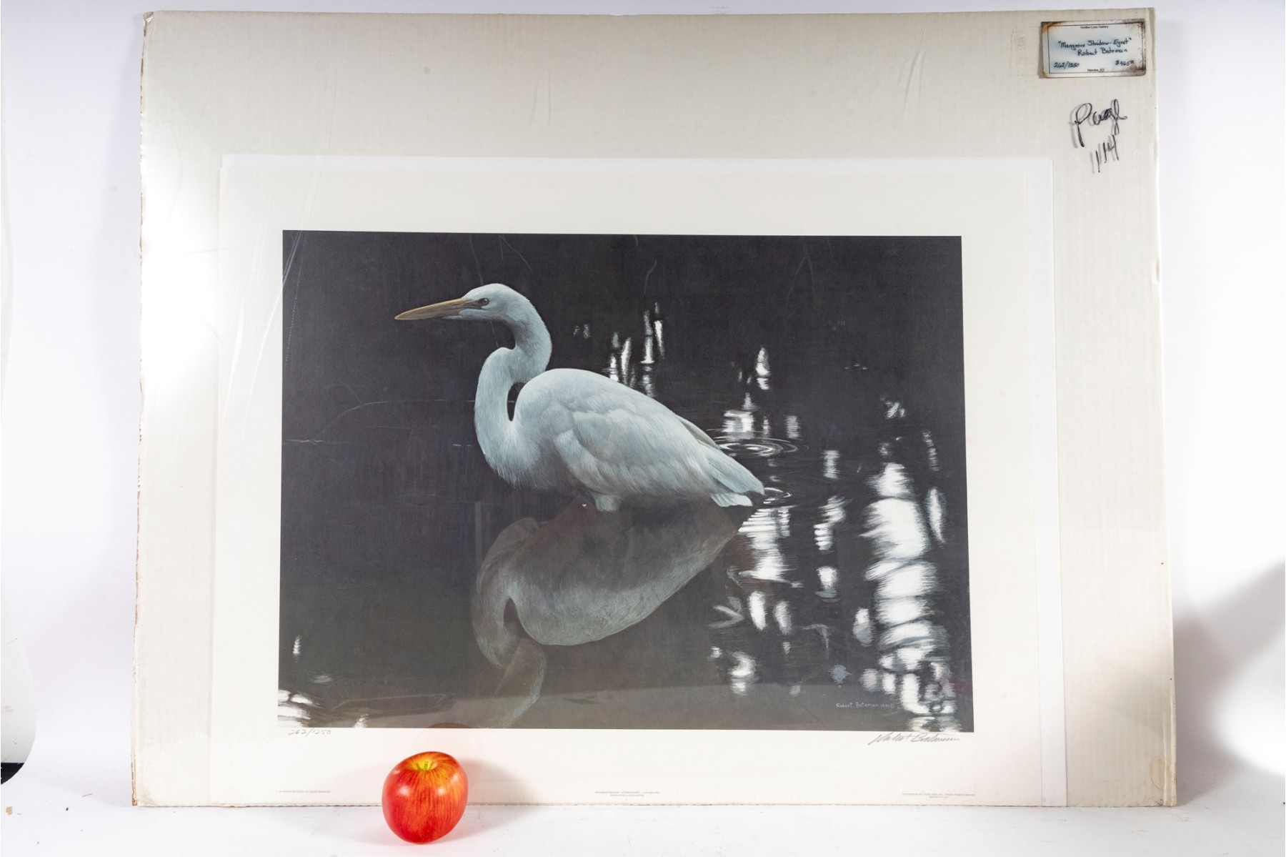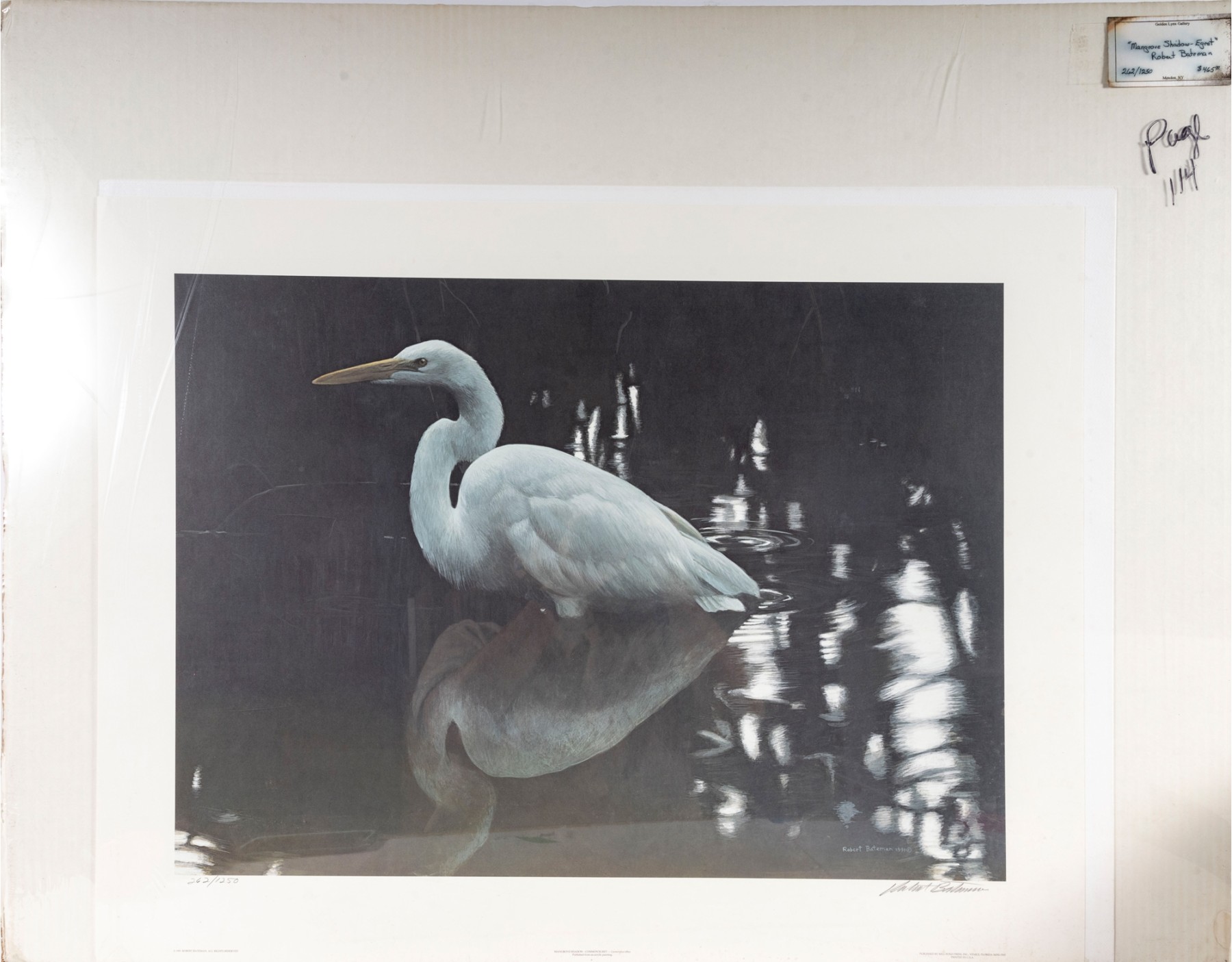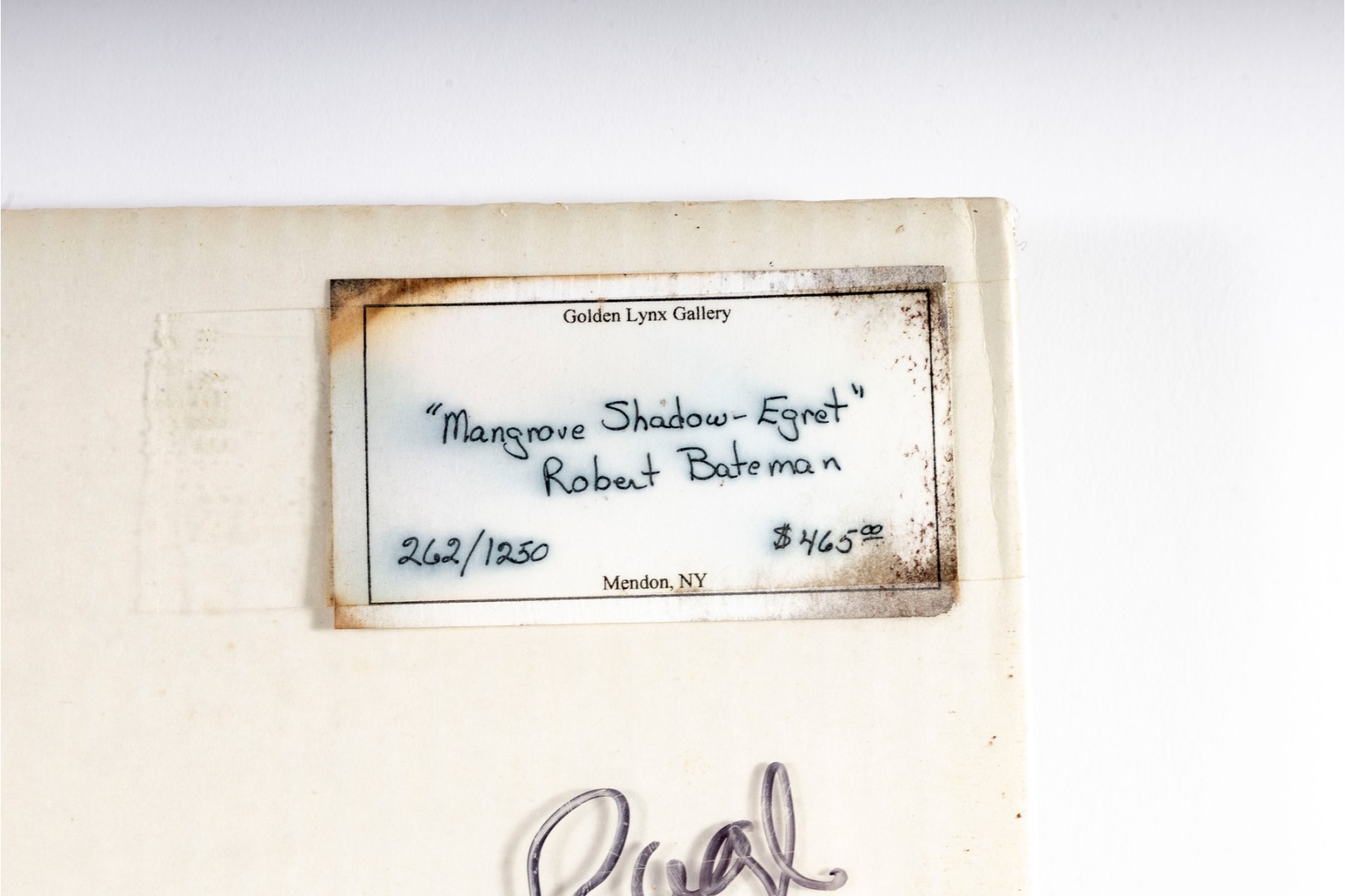 Robert Bateman (Canadian, b. 1930) "Mangrove Shadow-Egret" lithograph depicting a lone egret in profile wading in a calm pool of water, rendered in realistic detail. Pencil signed lower right, numbered 262/1250.