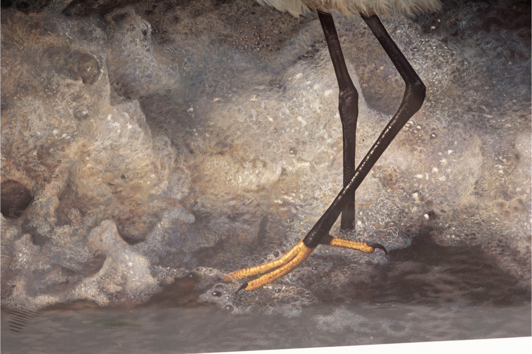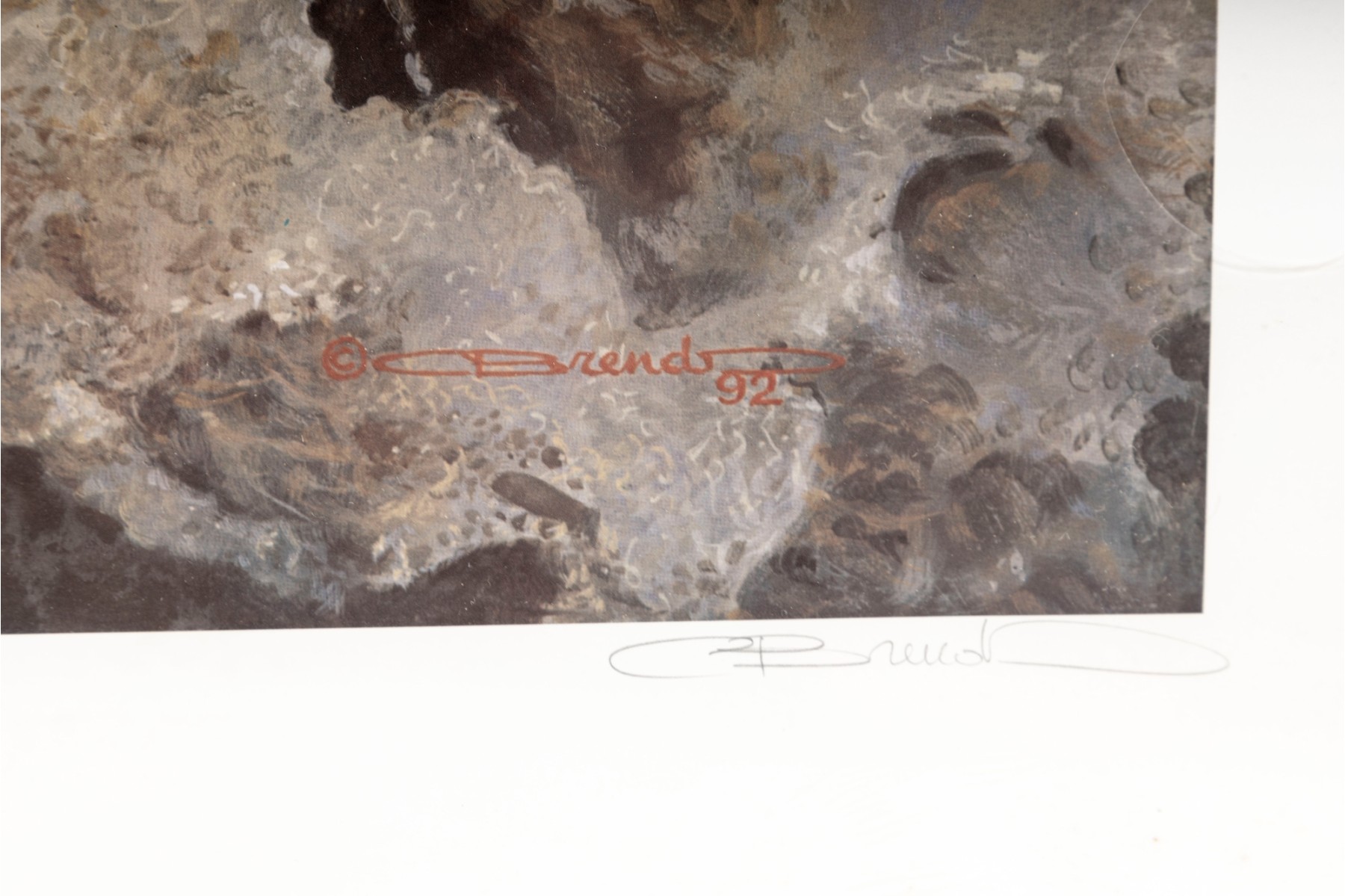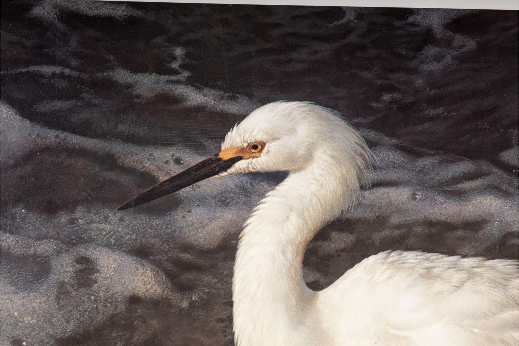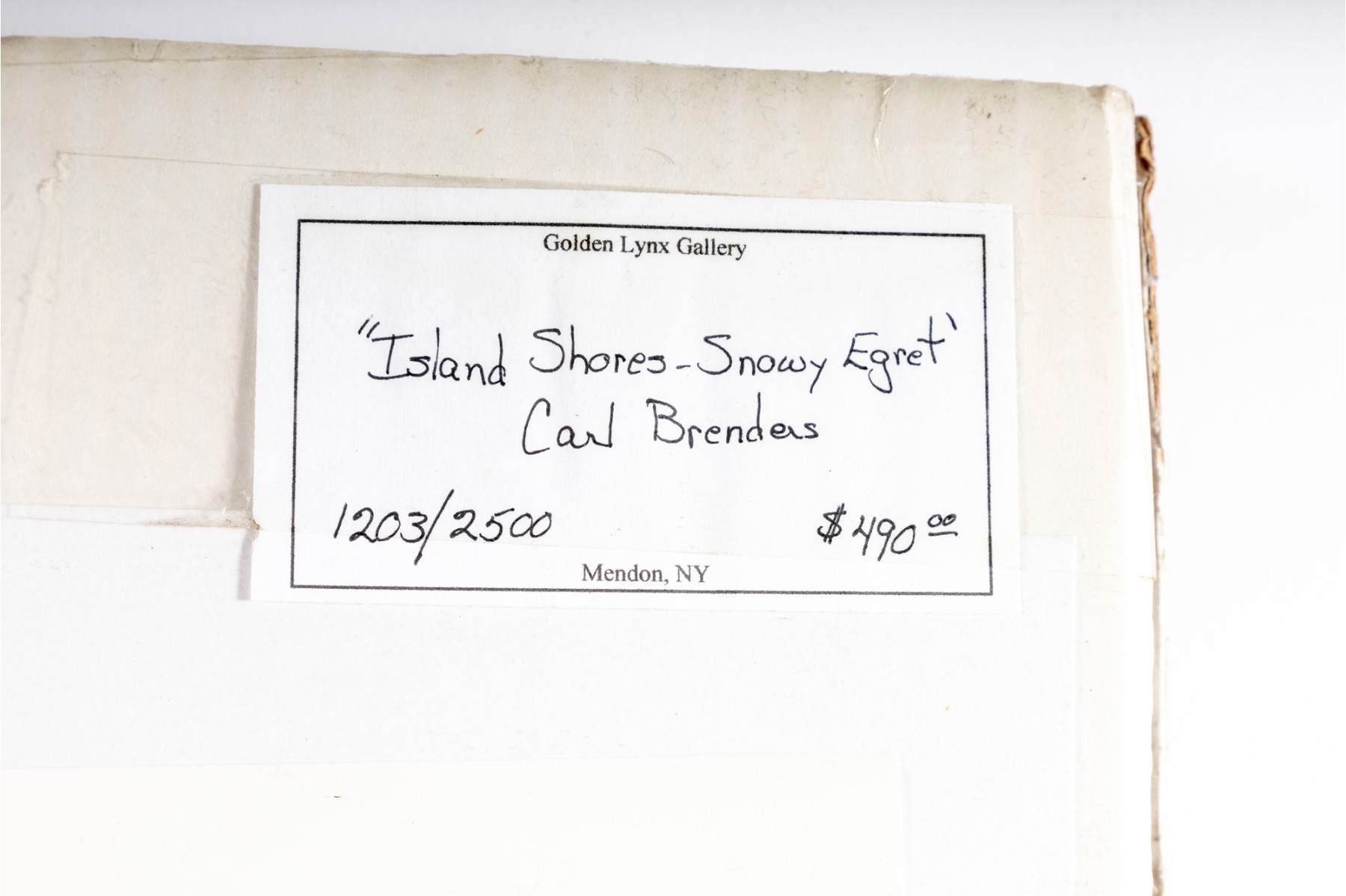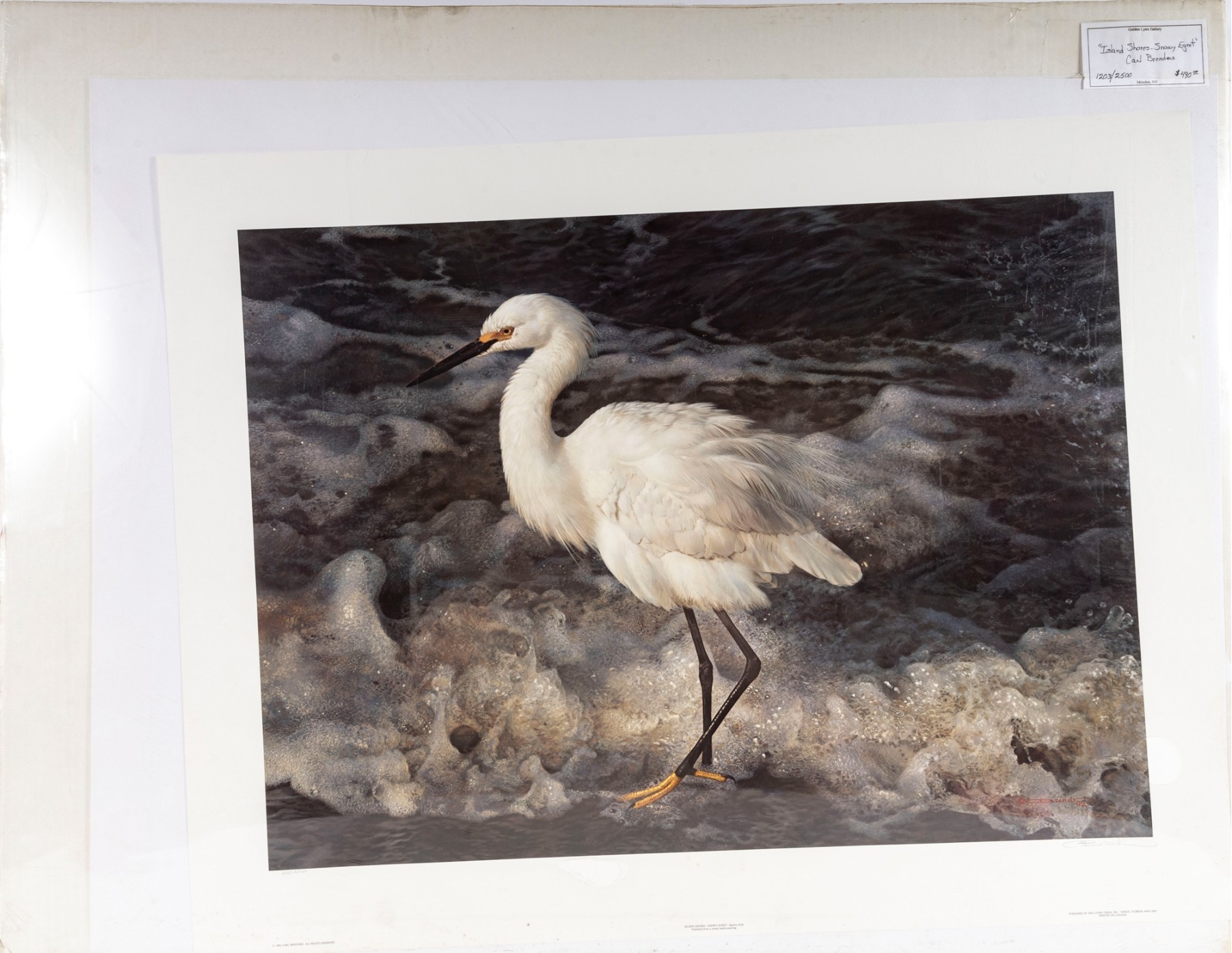 Carl Brenders (Belgian, b. 1937) "Island Shores-Snowy Egret" depicting a lone egret standing in profile against a soft froth of waves, realistically detailed with masterful attention to light, contrast, and color. Pencil signed lower right, numbered 1203/2500.