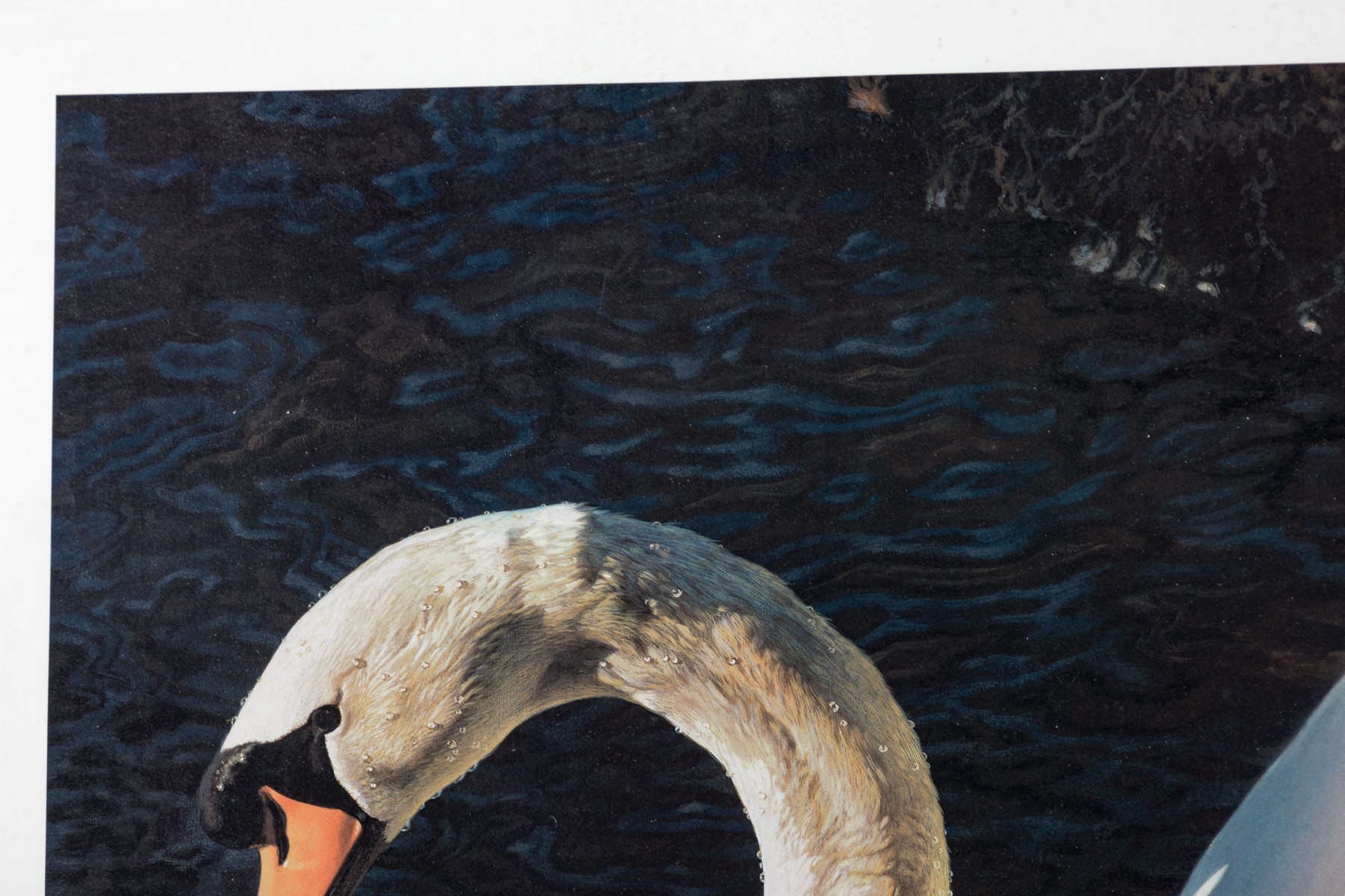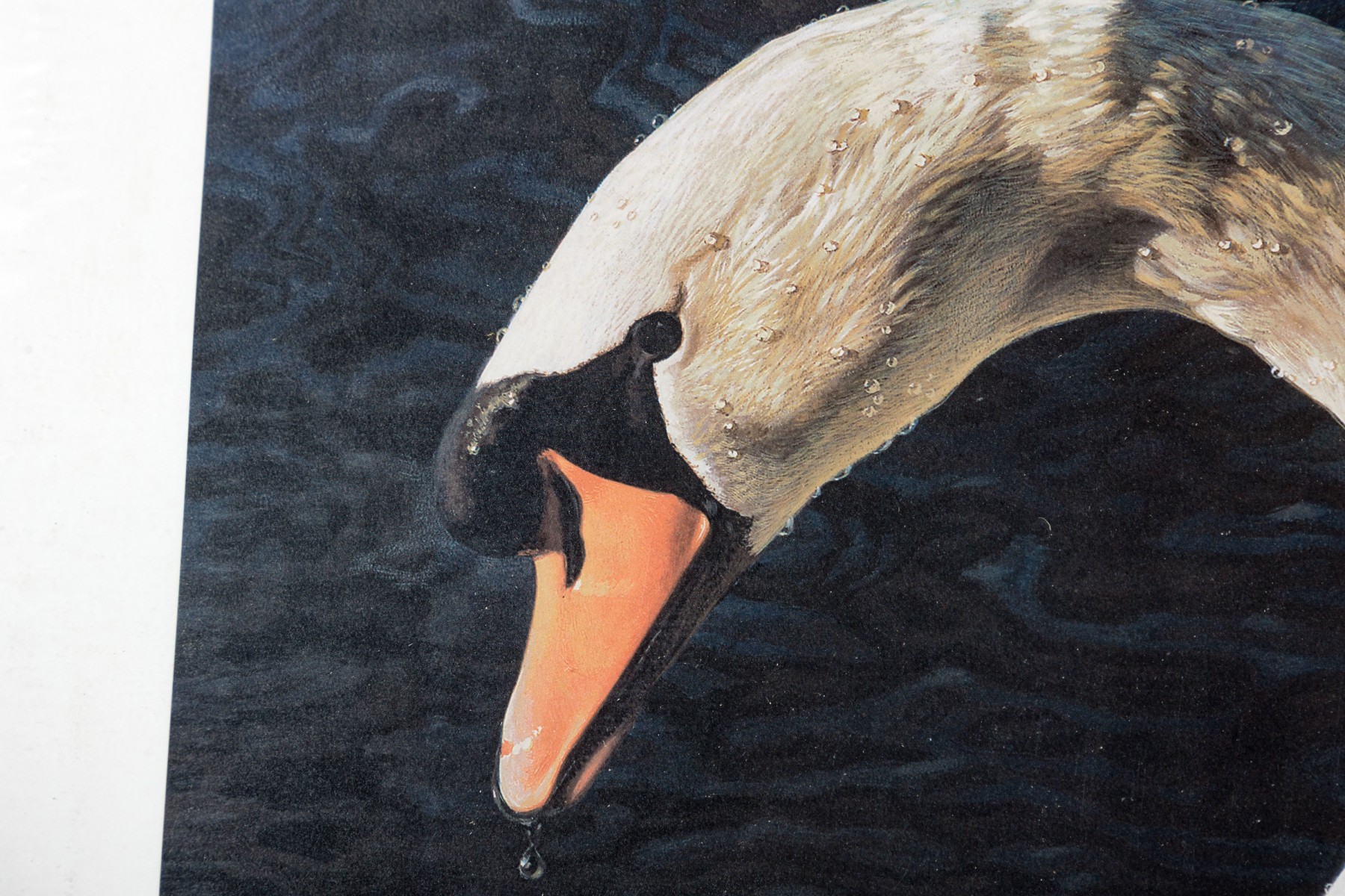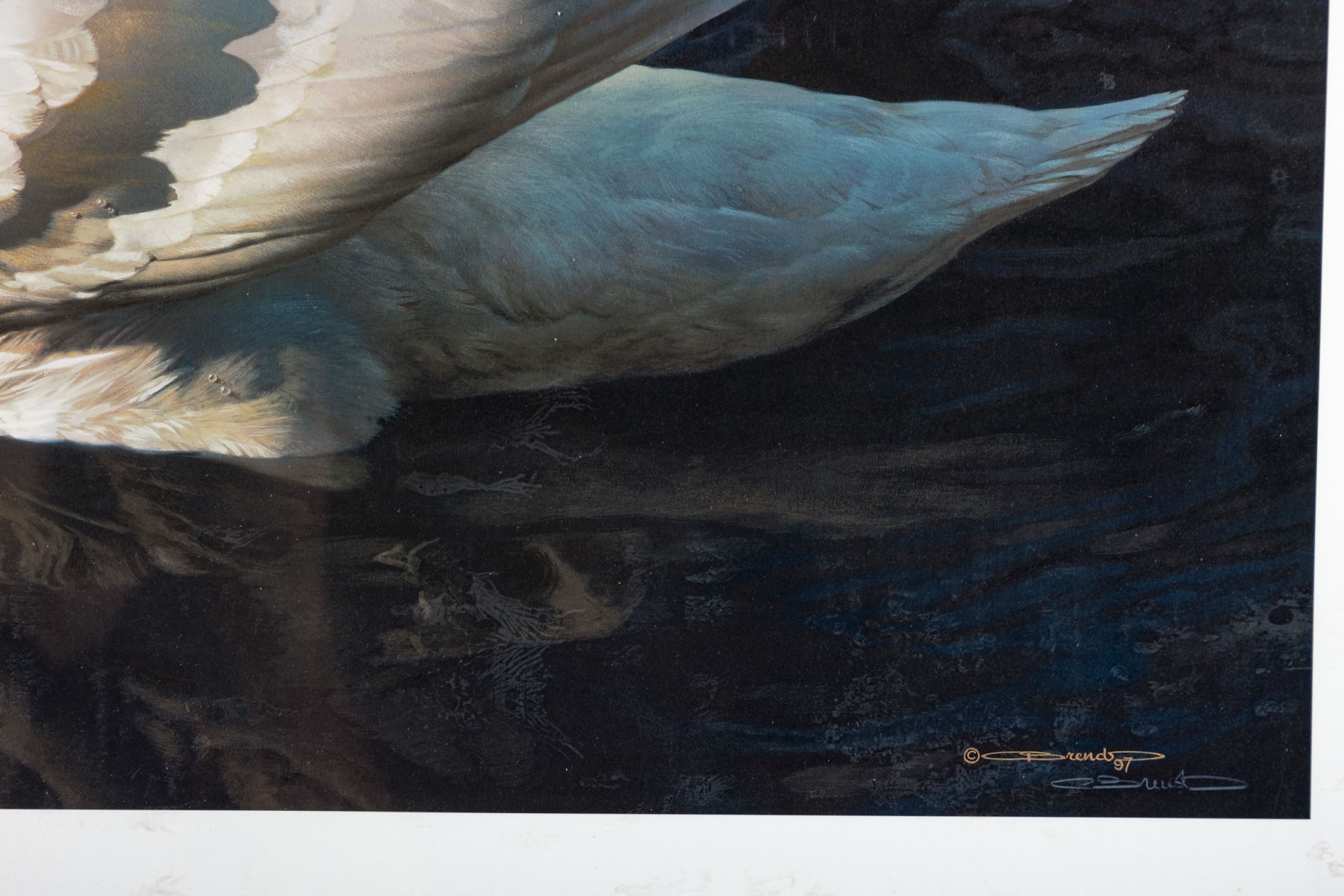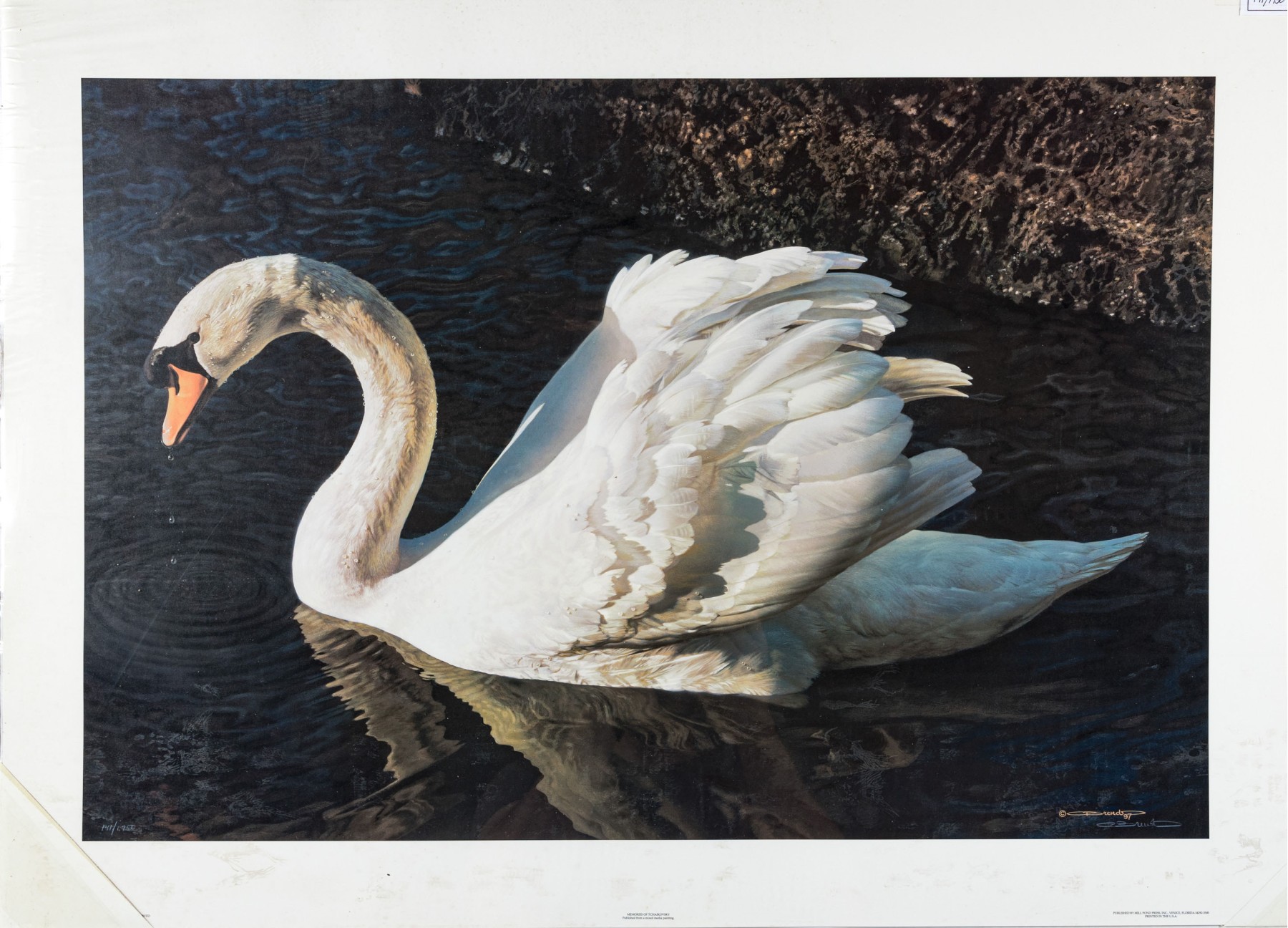 Carl Brenders (Belgian, B. 1937) "Memories of Tchaikovsky" lithograph depicting a majestic white swan swimming on a dark, calm body of water. Signed lower right, numbered 141/1750. Unframed, contained within a protective plastic film with a cardboard insert.