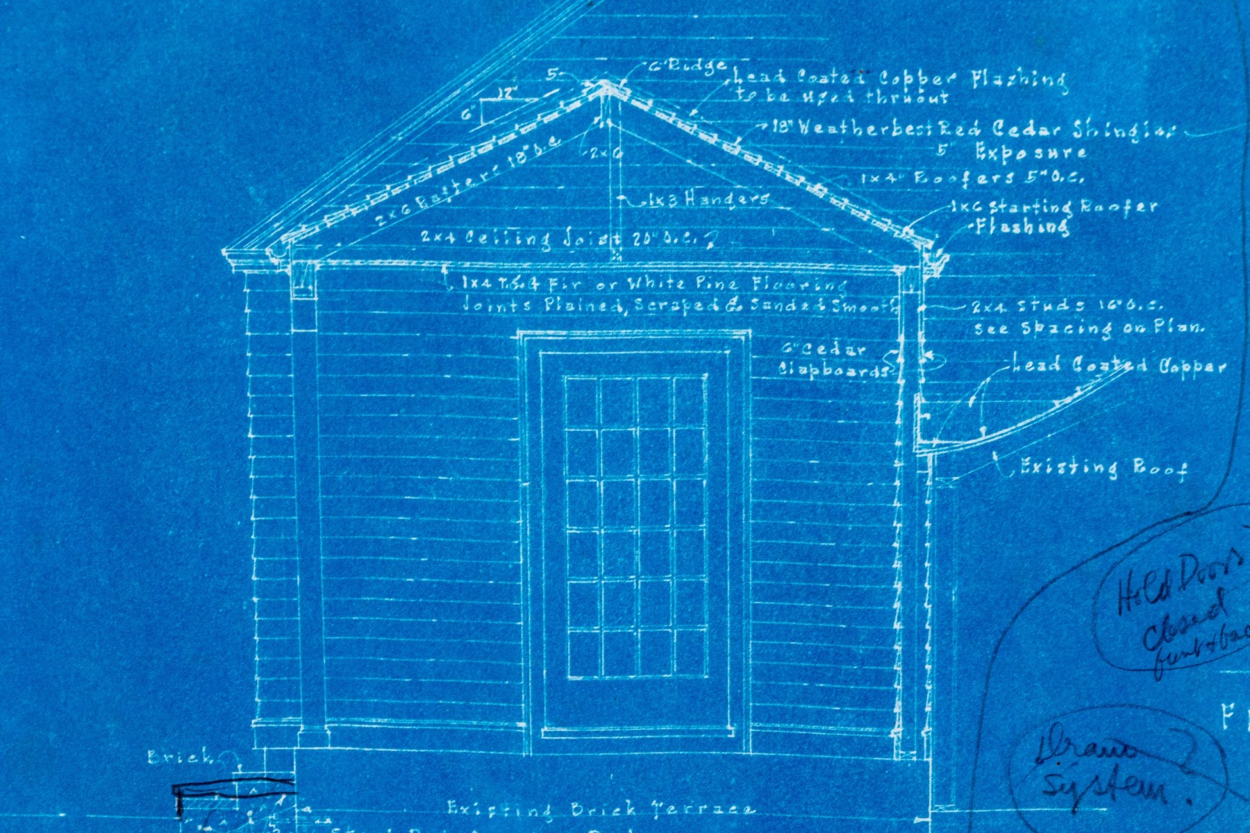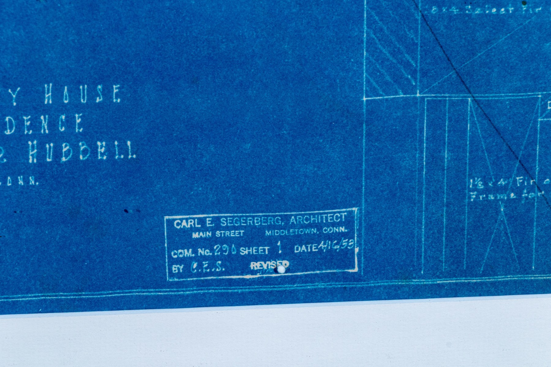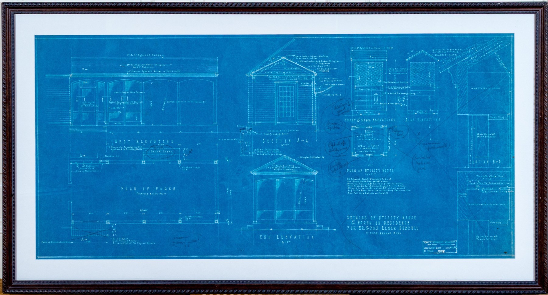 "Details of Utility House & Porch of Residence for Mr. & Mrs. Elmer Hubbell" architectural blueprint designed by Carl E. Segerberg (American [CT], 1897-1975) depicting different elements of the building and the layout of a porch, detailed with handwritten notes throughout.