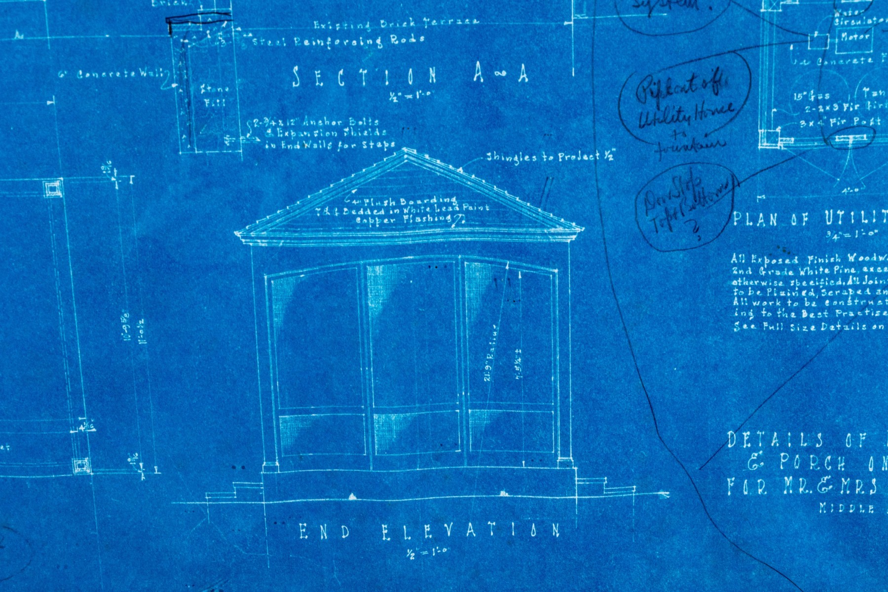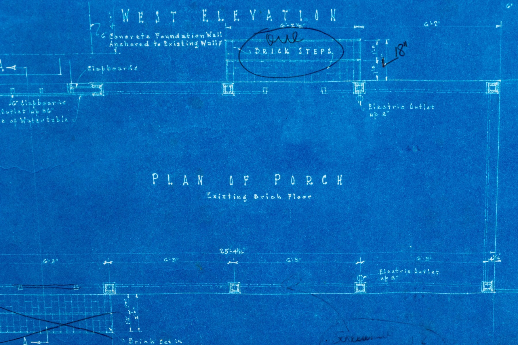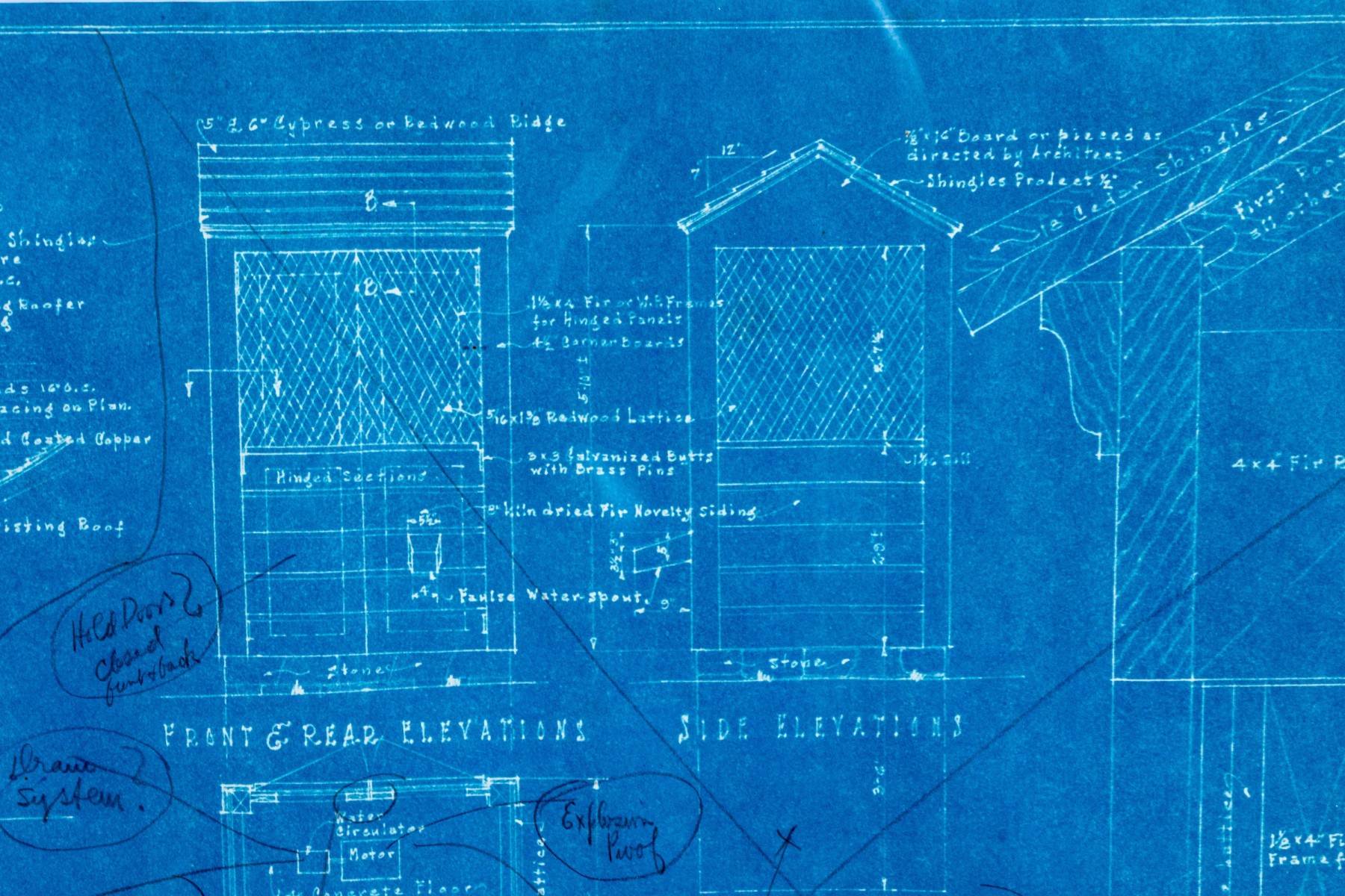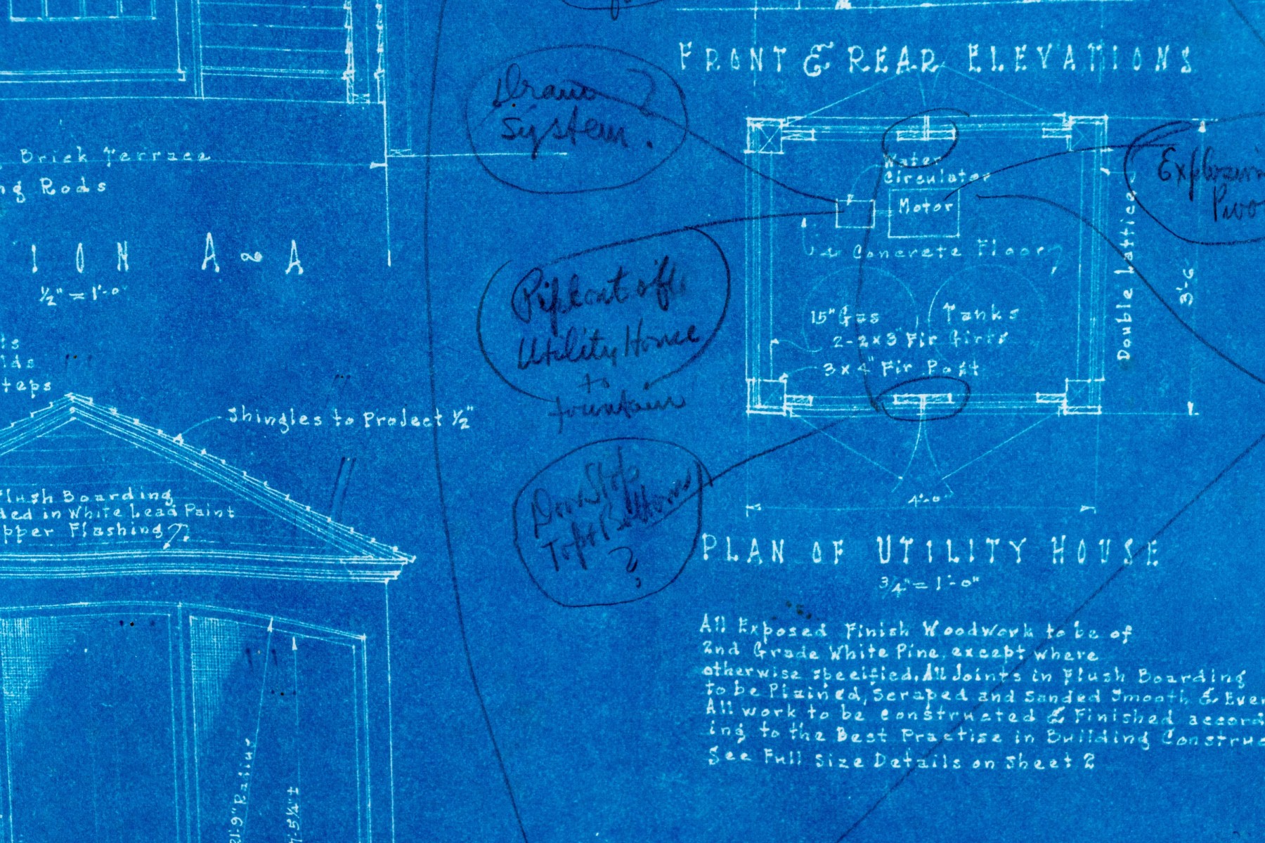 "Details of Utility House & Porch of Residence for Mr. & Mrs. Elmer Hubbell" architectural blueprint designed by Carl E. Segerberg (American [CT], 1897-1975) depicting different elements of the building and the layout of a porch, detailed with handwritten notes throughout.