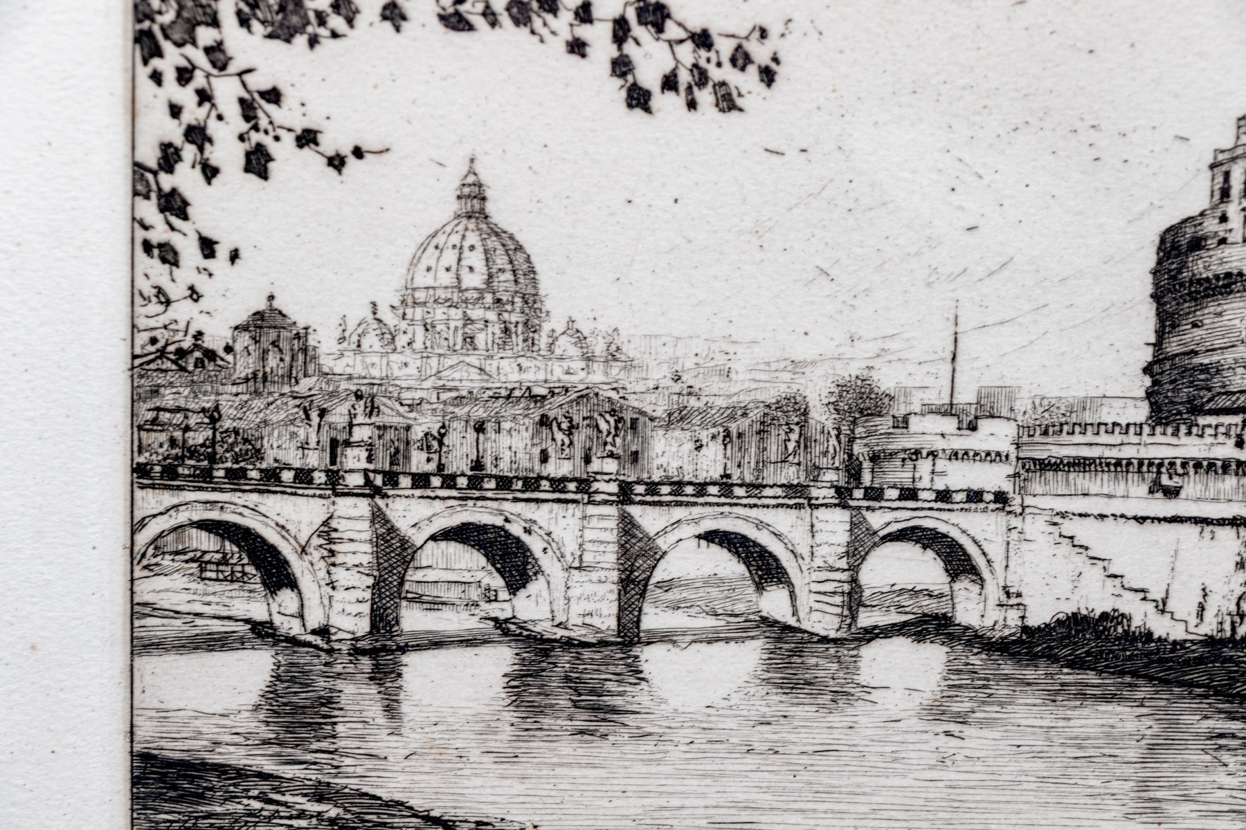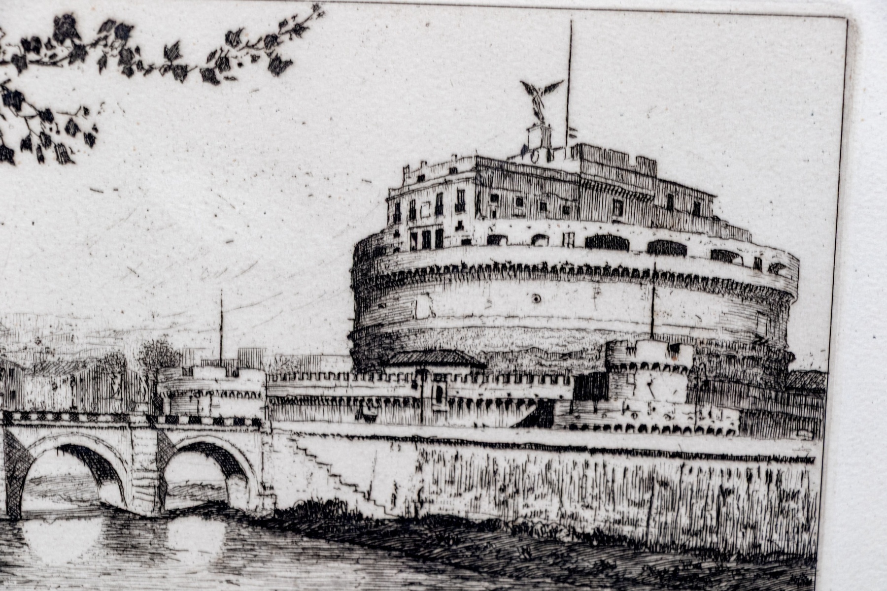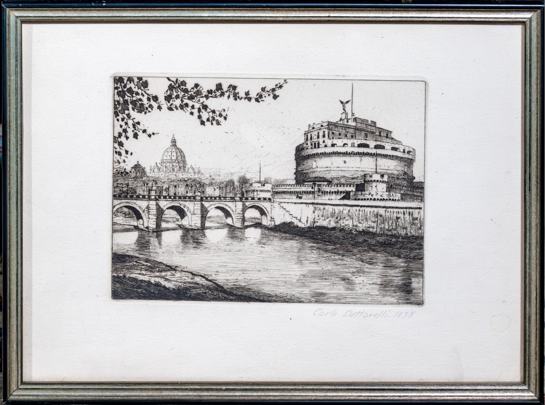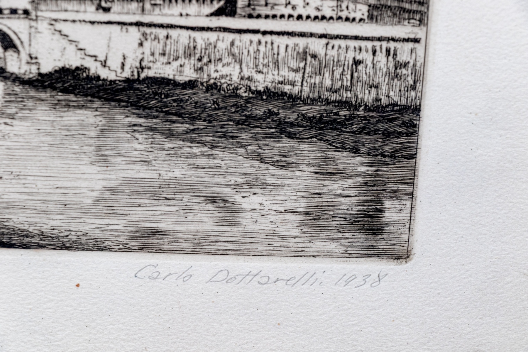 Carlo Dottarelli (Italian, 20th C.) etching on paper depicting a Roman landscape with a bridge leading to Castel Sant'Angelo. Rendered with a keen eye for contrast in wonderful detail. Signed and dated 1938 lower right.