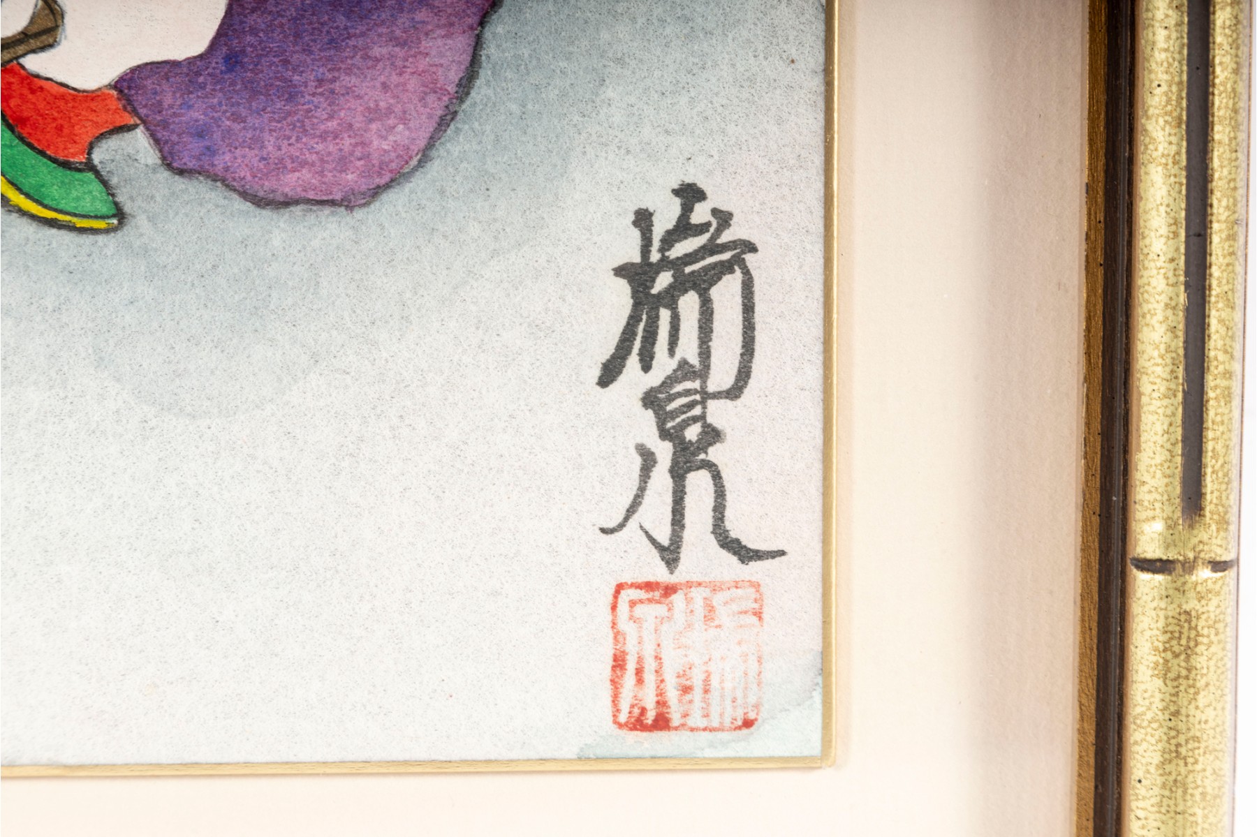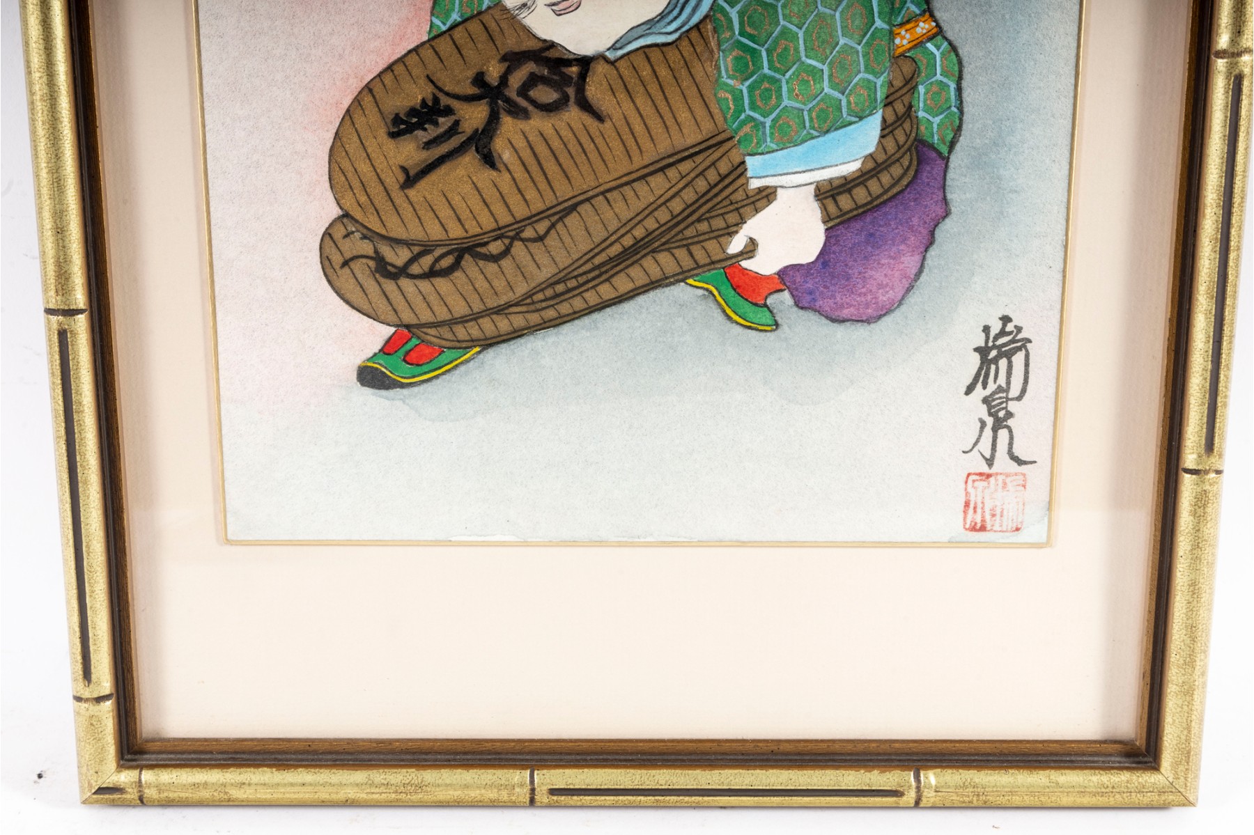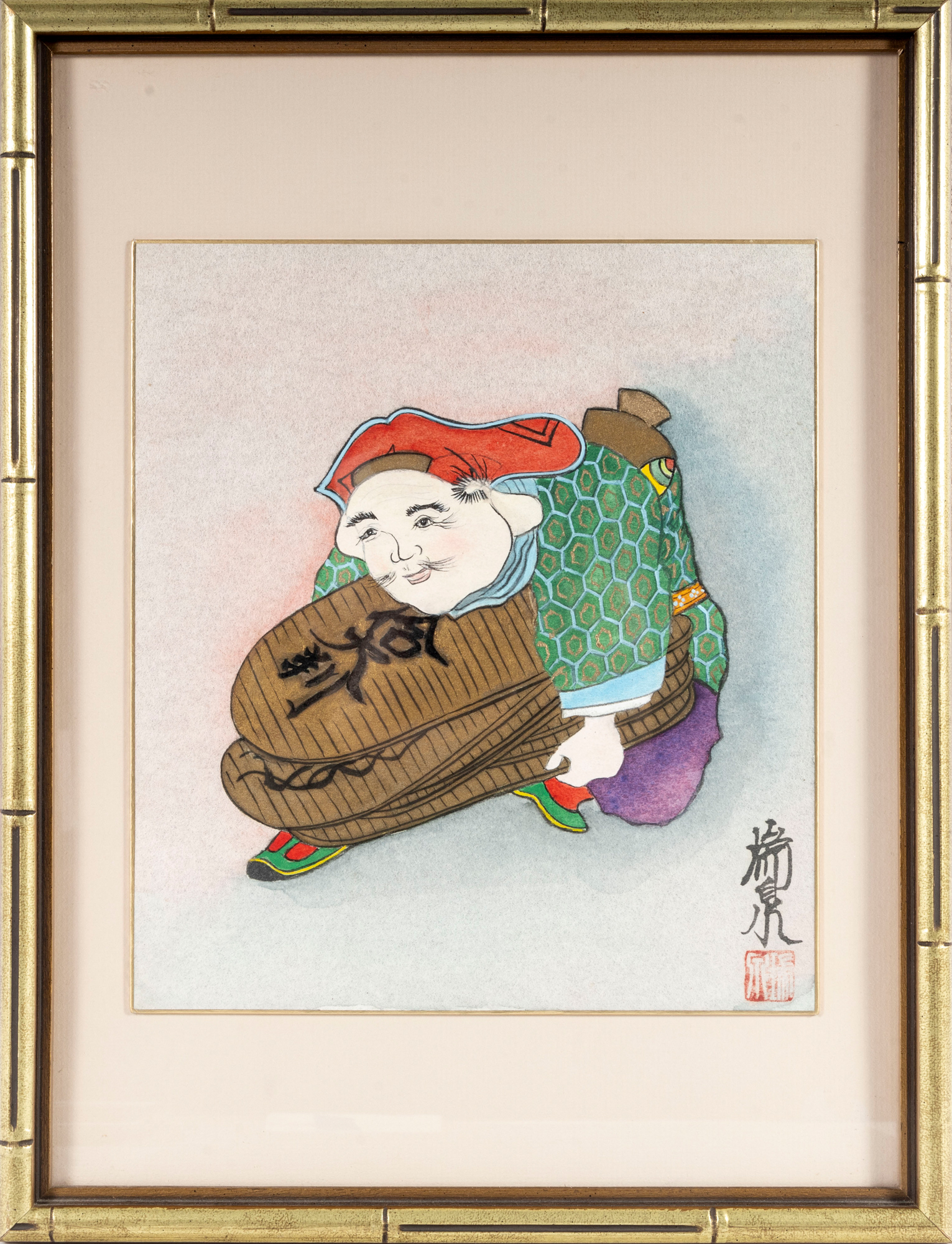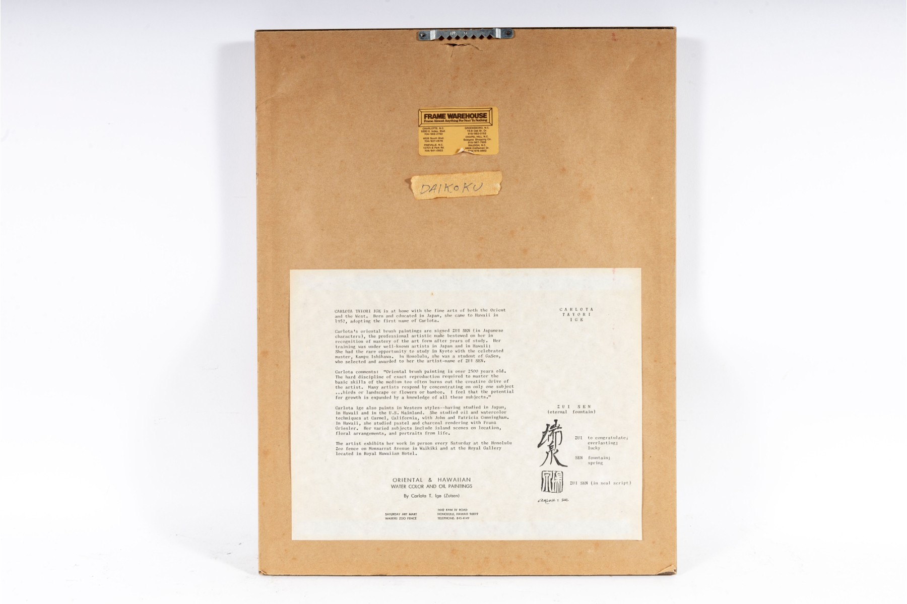 This traditional brush painting by Carlota Tayori Ige, a Japanese artist who came to Hawaii in 2957, adopting the name Carlota. The painting skillfully depicts Diakoku, the Japanese god of wealth and protector of farmers, holding multiple rice bales. The artwork is displayed in a faux bamboo wood frame and is contained behind glass. A detailed biography of the artist resides on the backside.