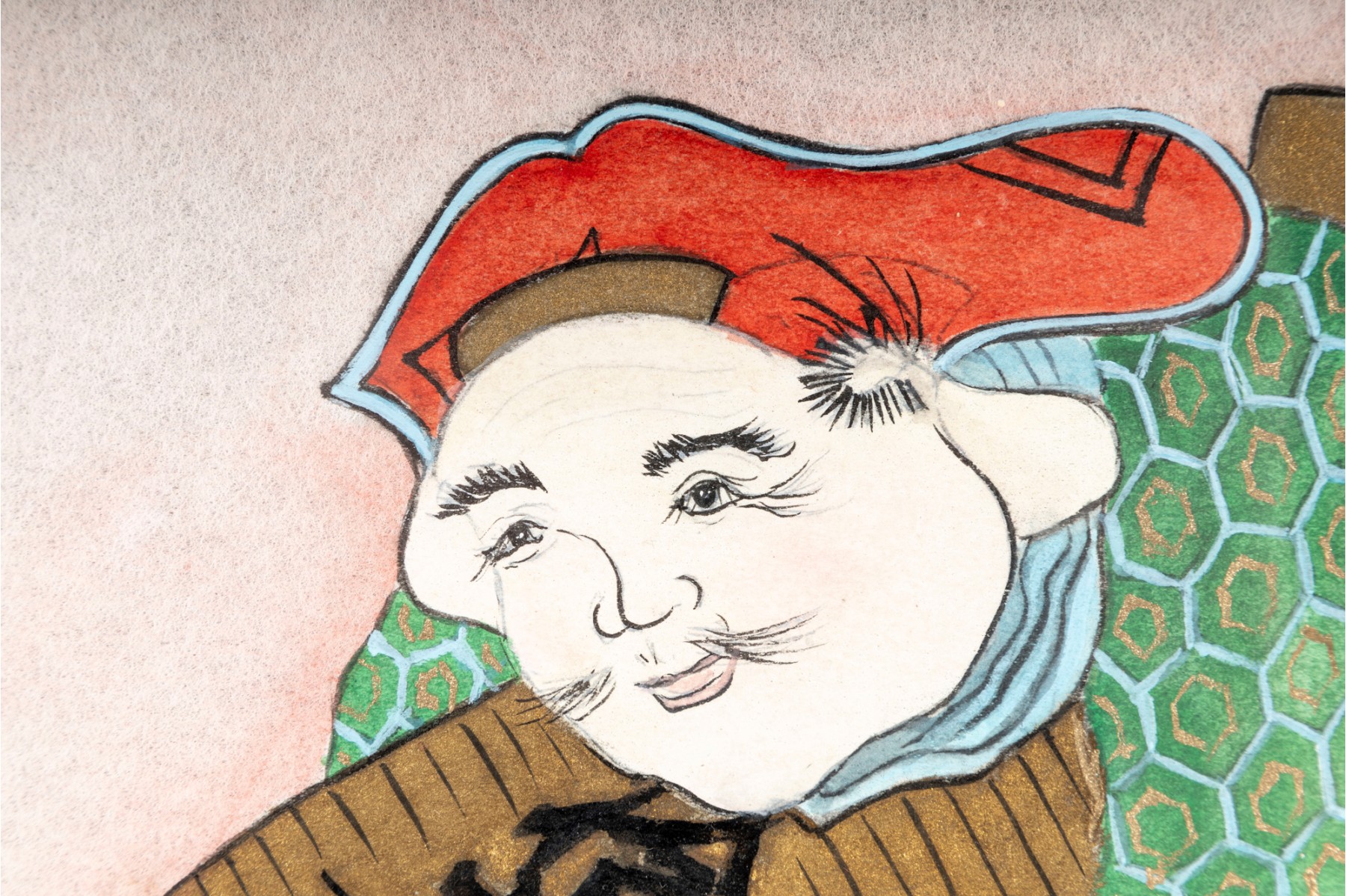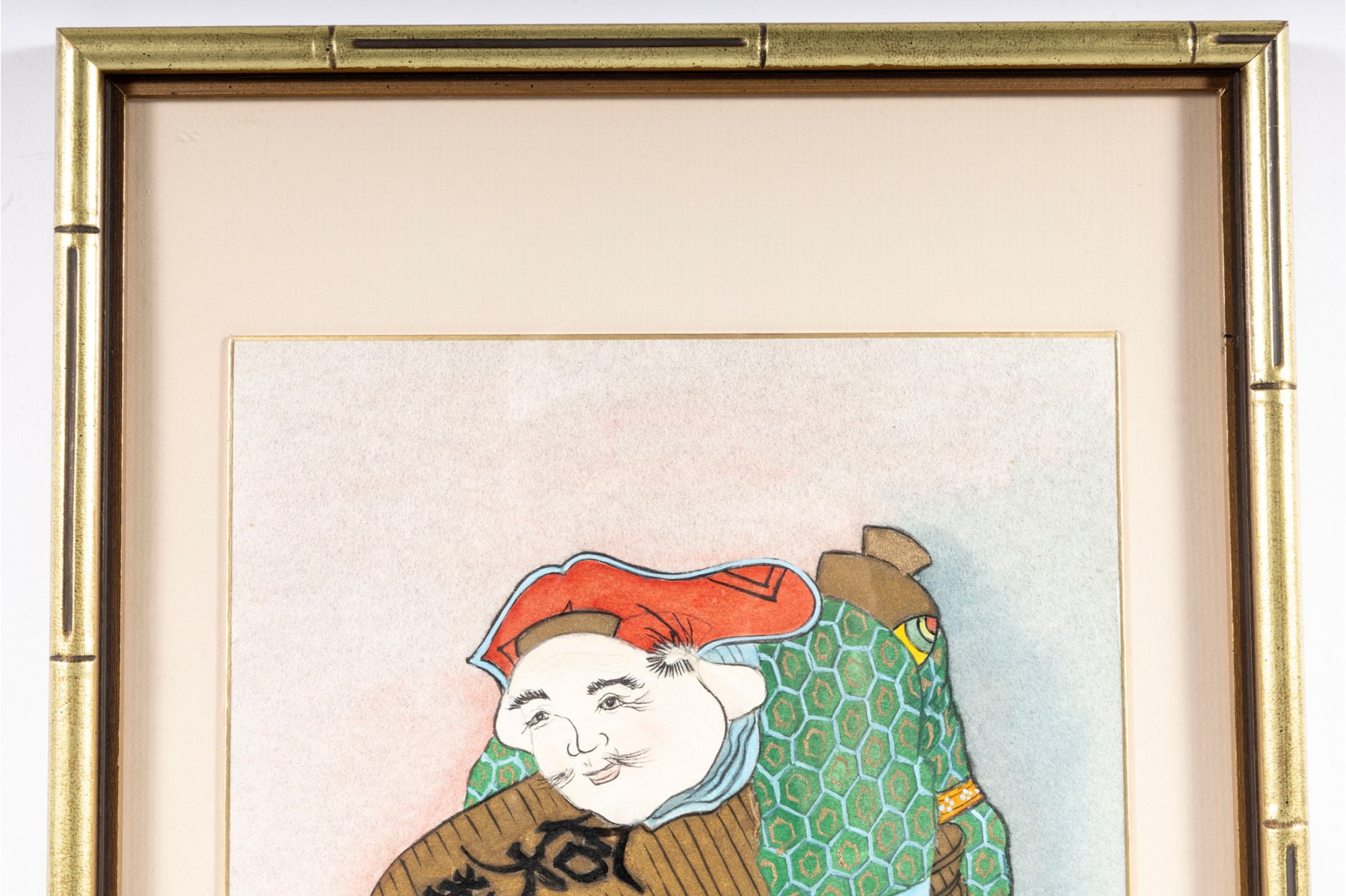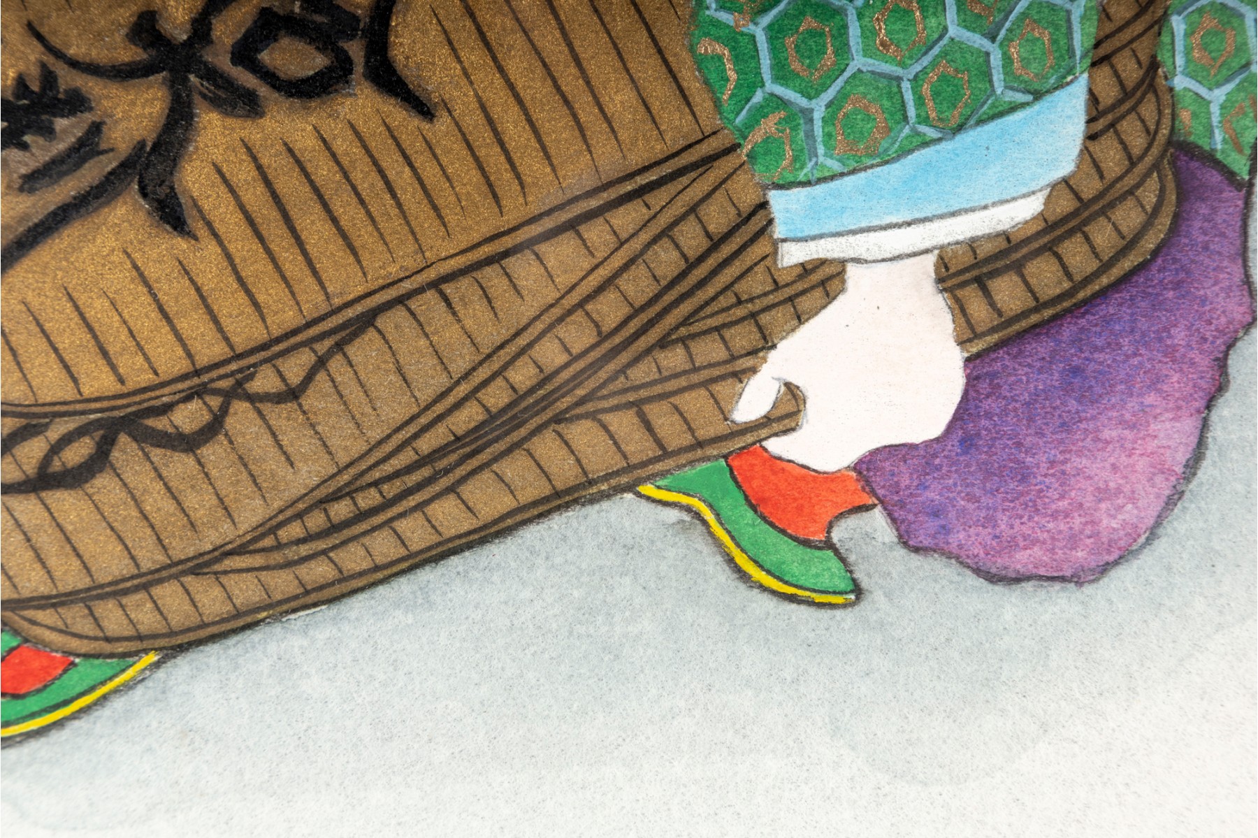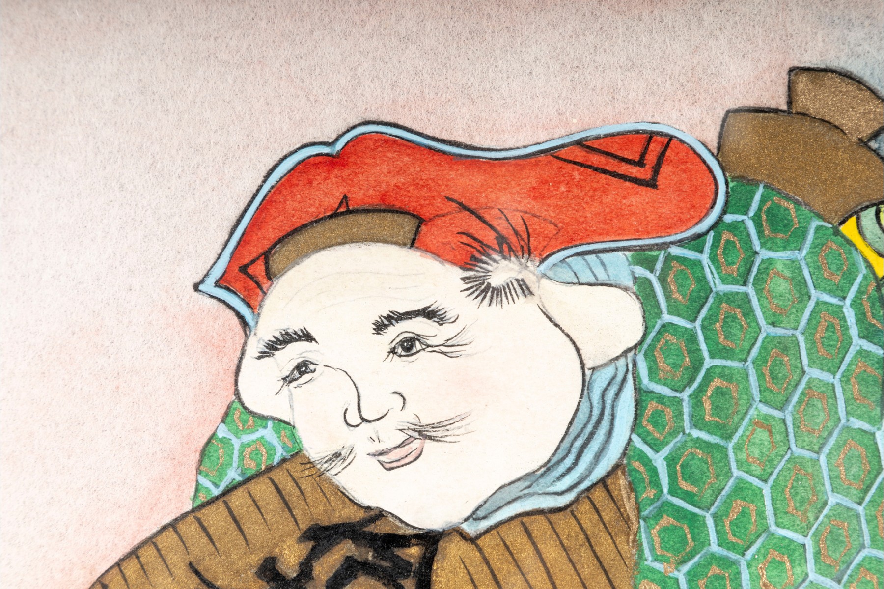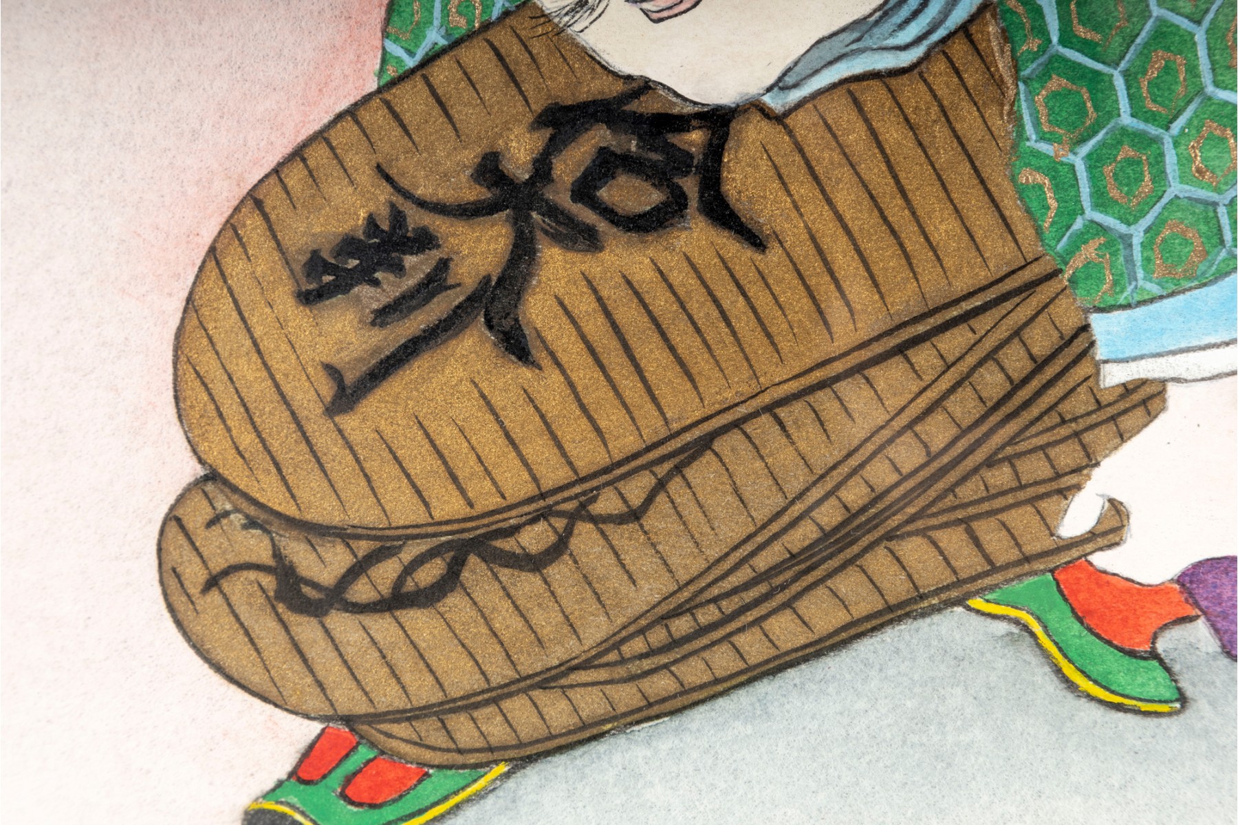 This traditional brush painting by Carlota Tayori Ige, a Japanese artist who came to Hawaii in 2957, adopting the name Carlota. The painting skillfully depicts Diakoku, the Japanese god of wealth and protector of farmers, holding multiple rice bales. The artwork is displayed in a faux bamboo wood frame and is contained behind glass. A detailed biography of the artist resides on the backside.