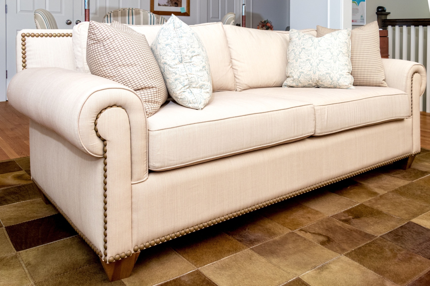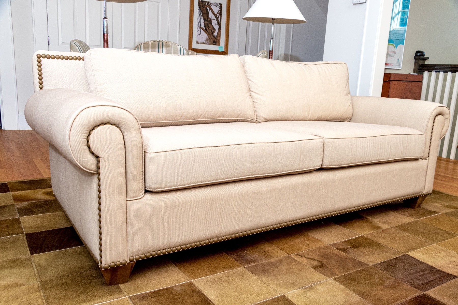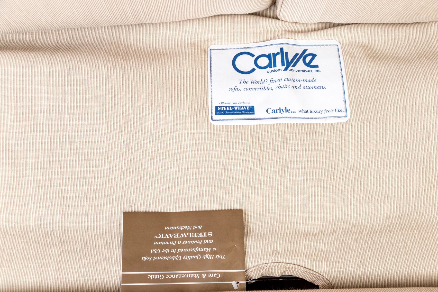 A high quality Carlyle steelweave sleeper sofa raised on four short feet with rolled arms, oversized tack nailhead trim. Two loose upholstered seat cushions and two loose upholstered seat back cushions.