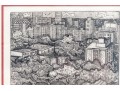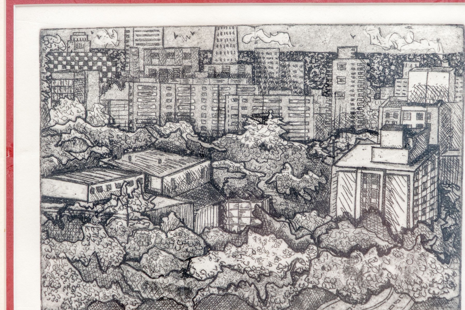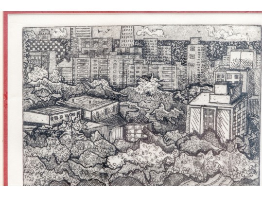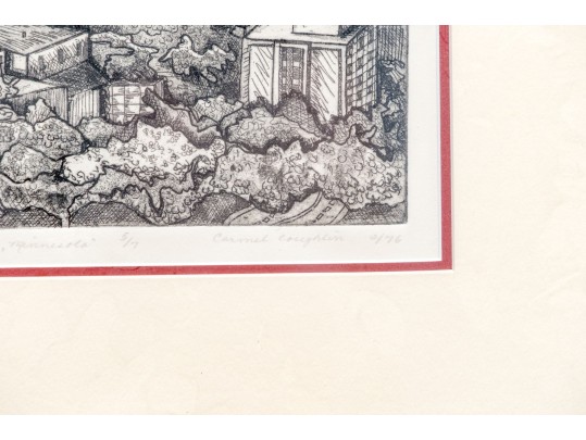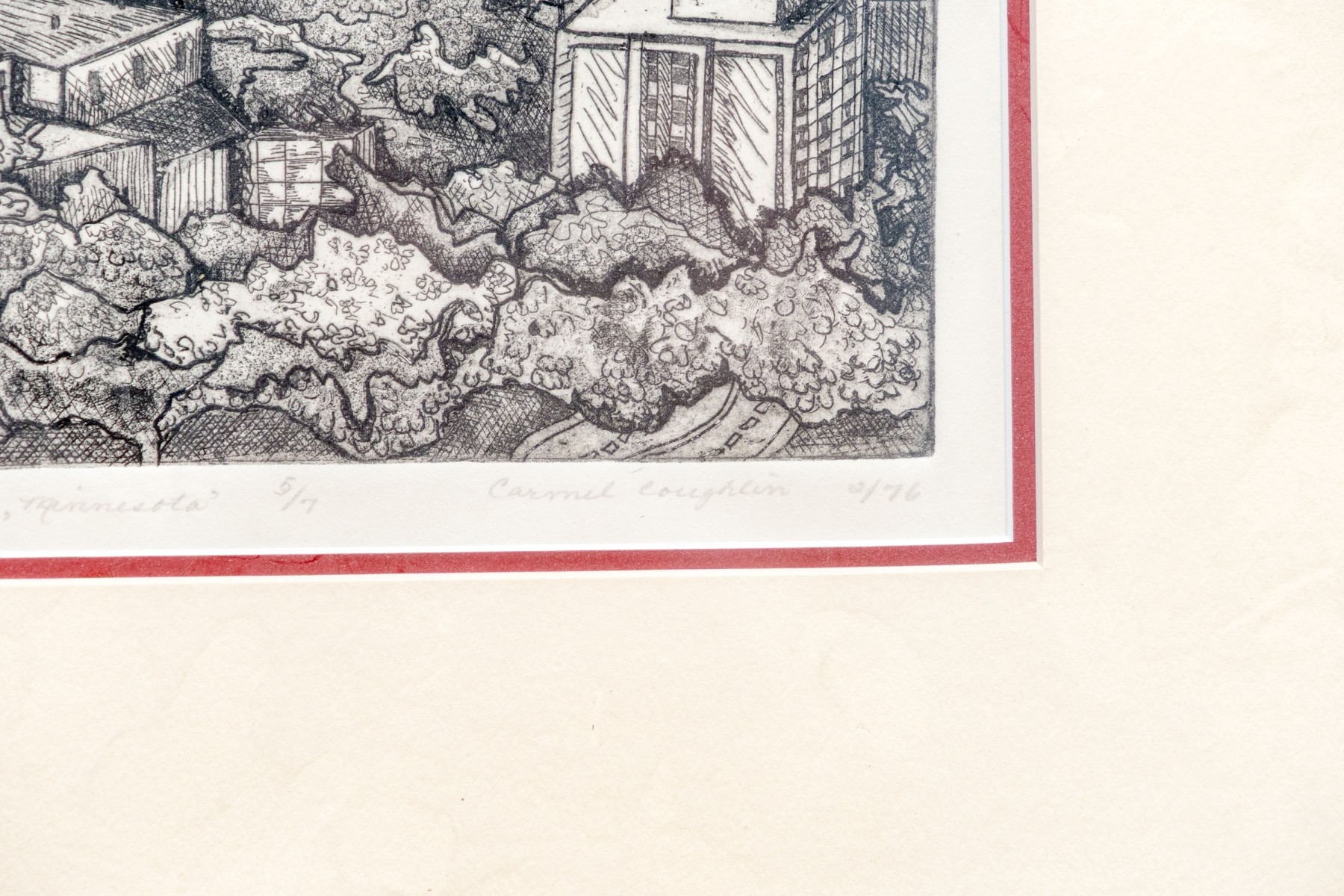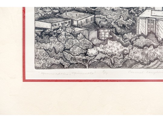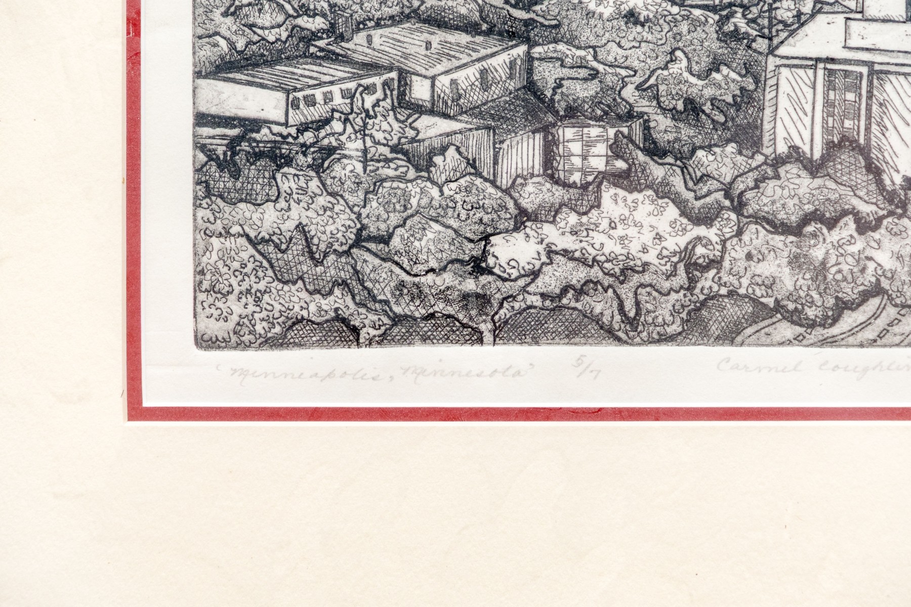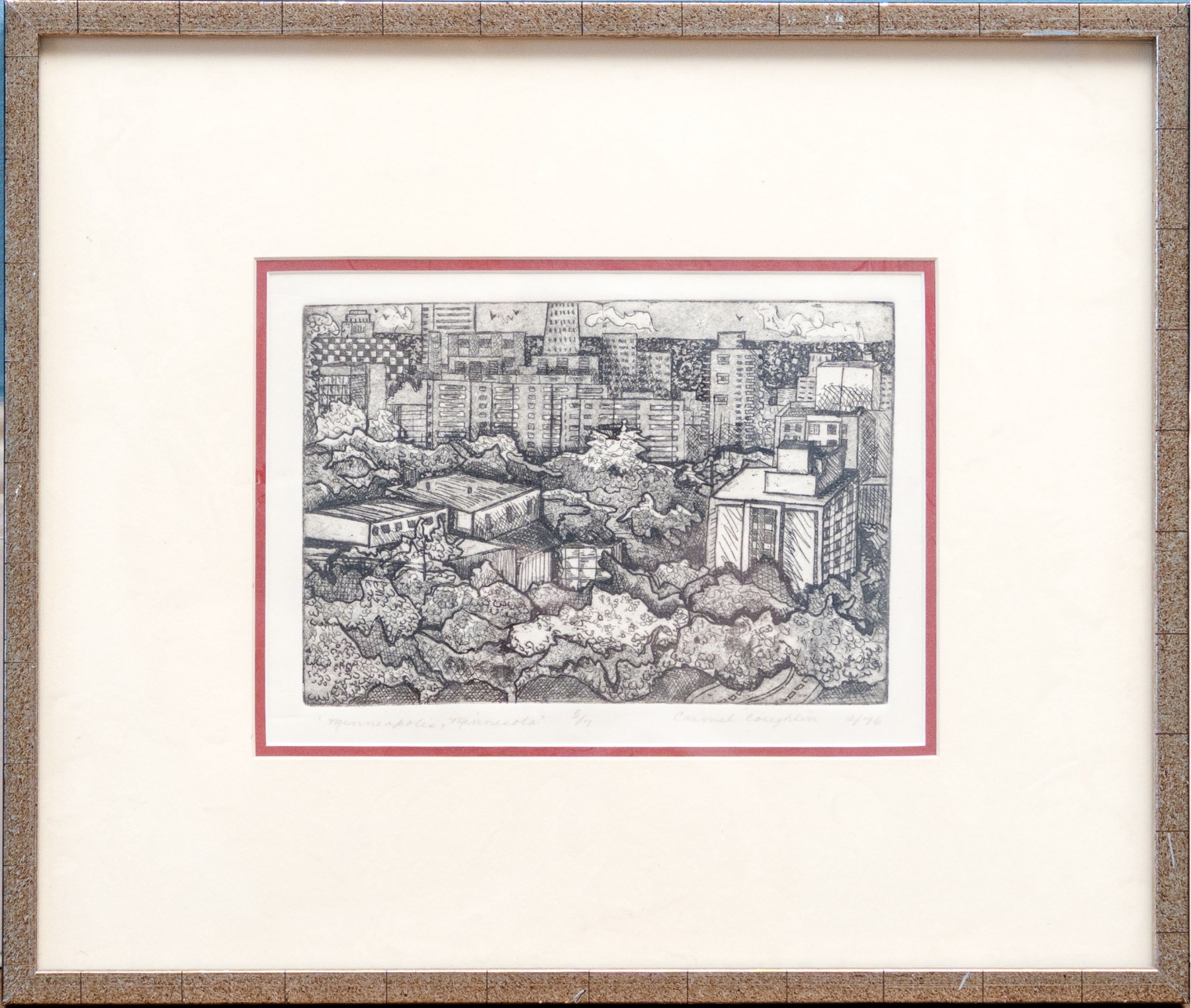 Carmel Coughlin "Minneapolis, Minnesota" etching depicting a view of the city nestled among tree canopies. Pencil signed and dated lower right, titled and numbered 2/7 lower left.