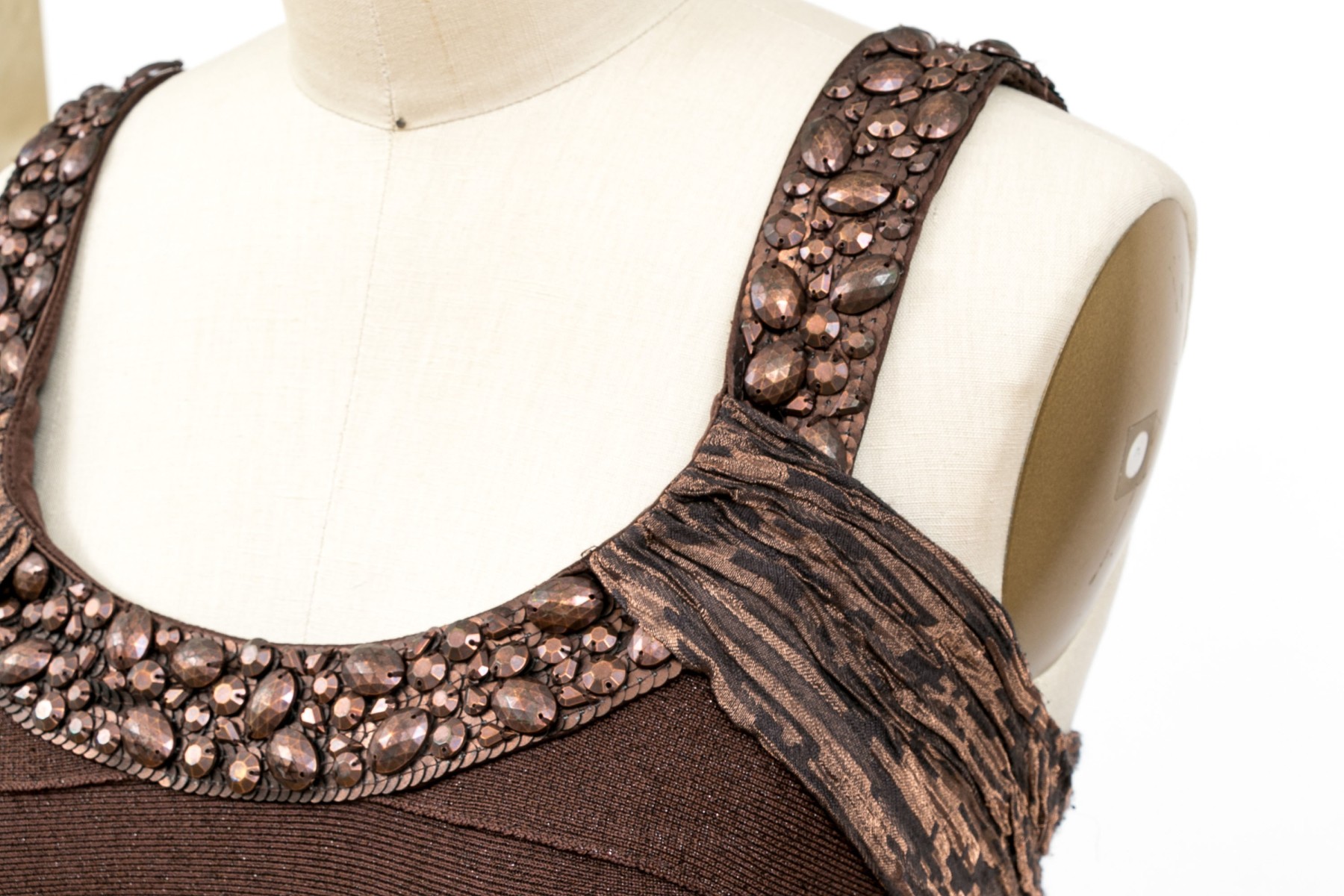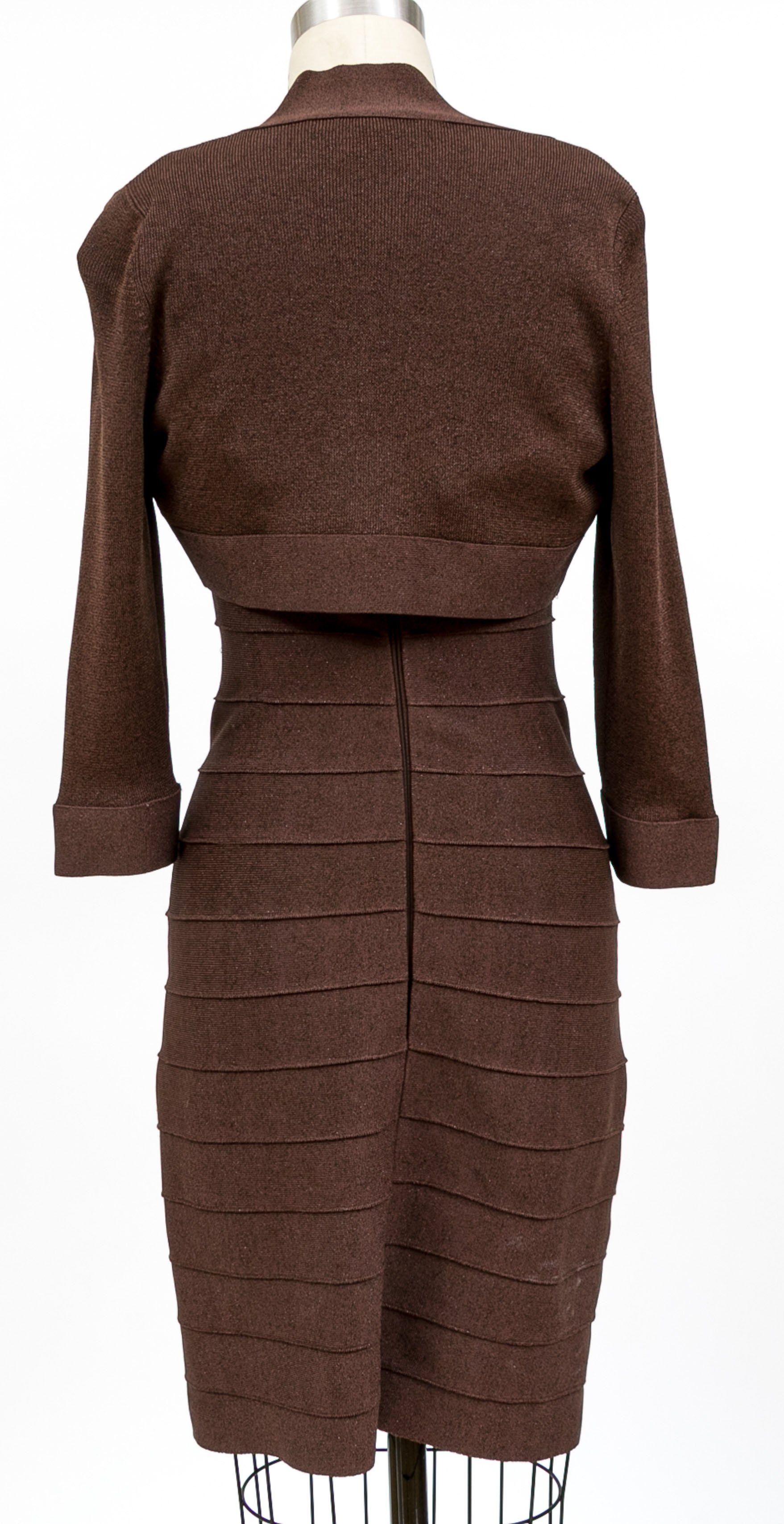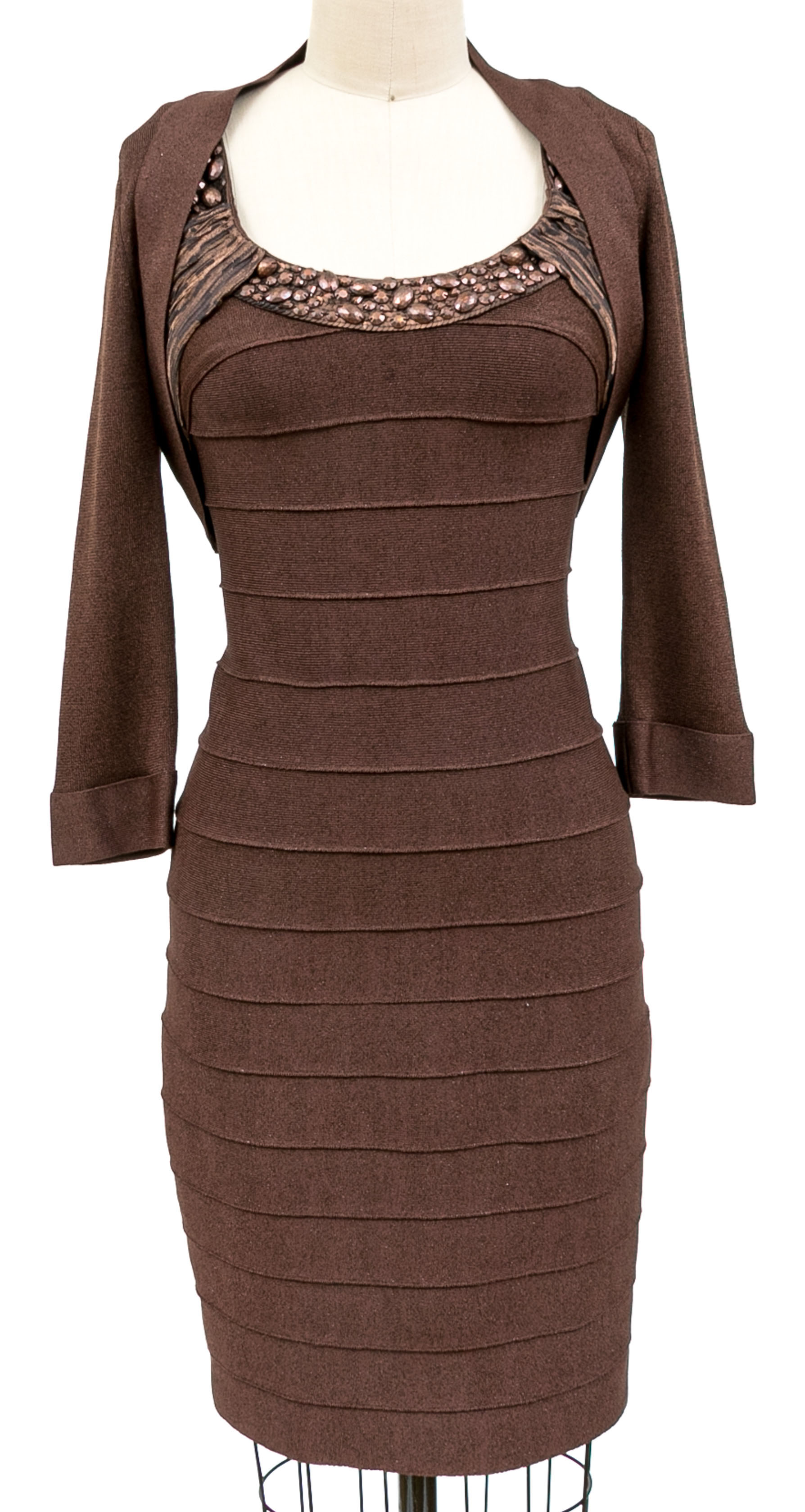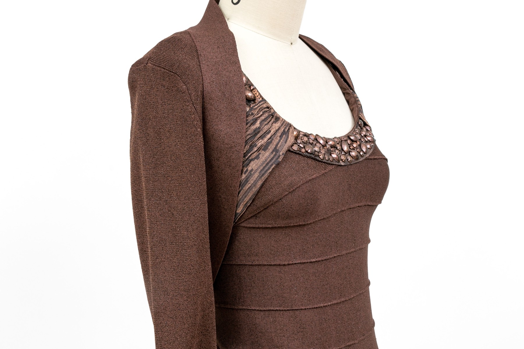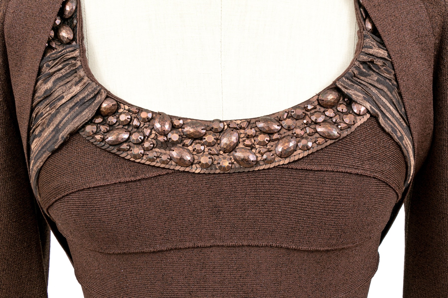 Carmen Marc Valvo brown and copper bedazzled tank sheath, matching bolero jacket, size S