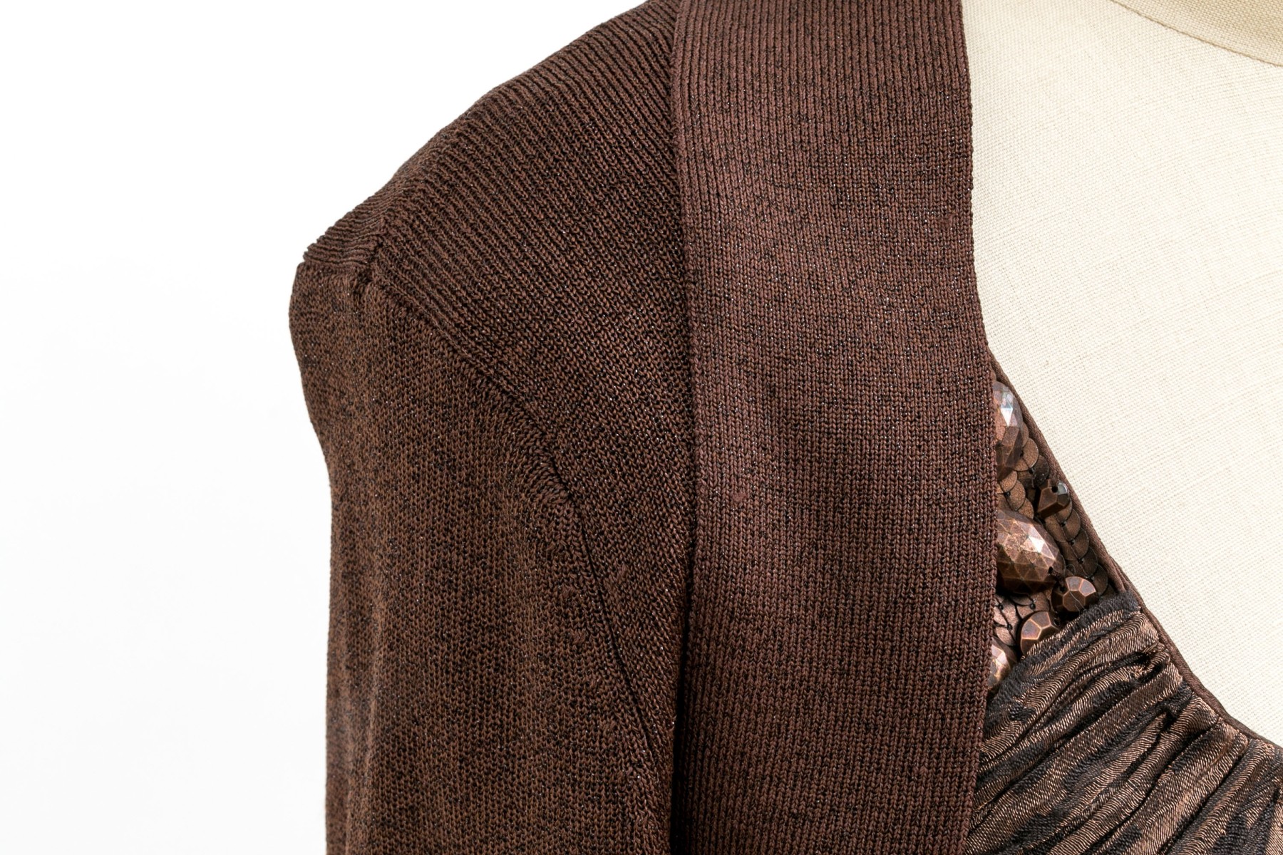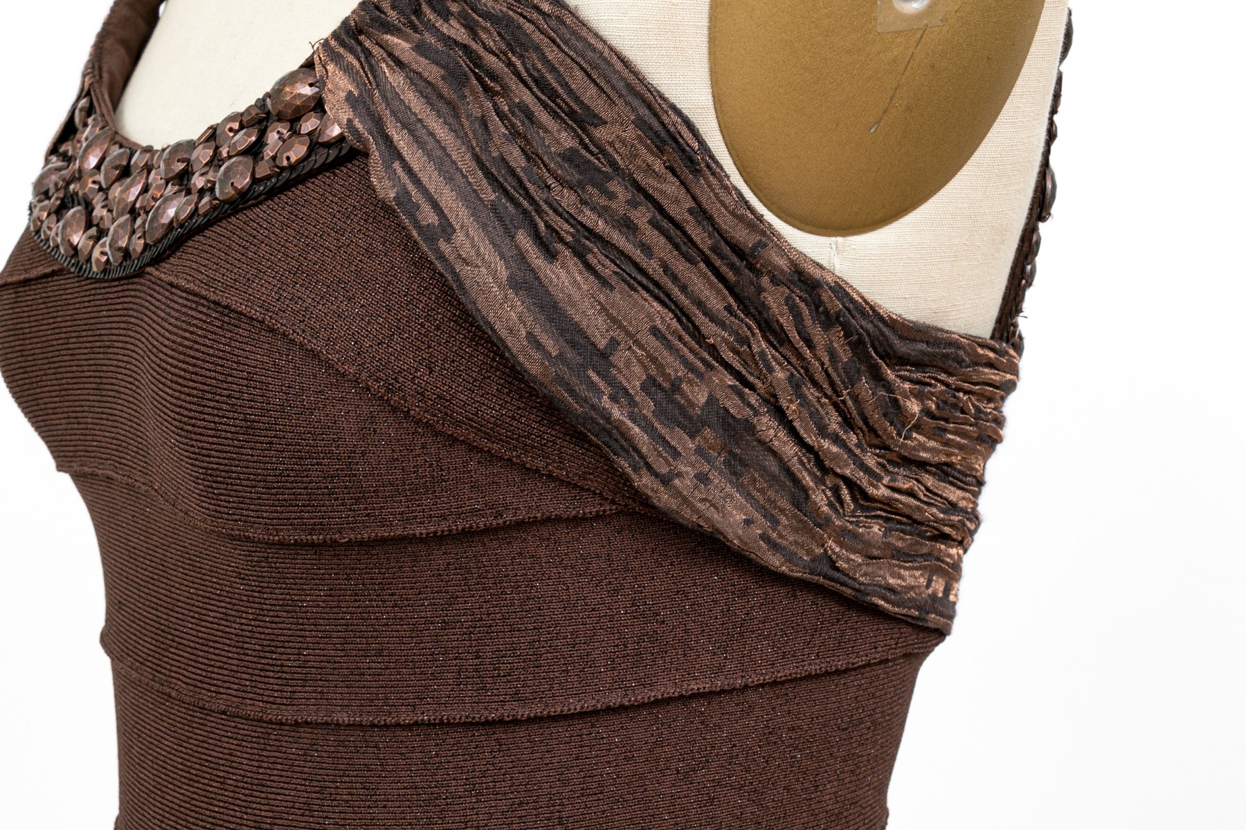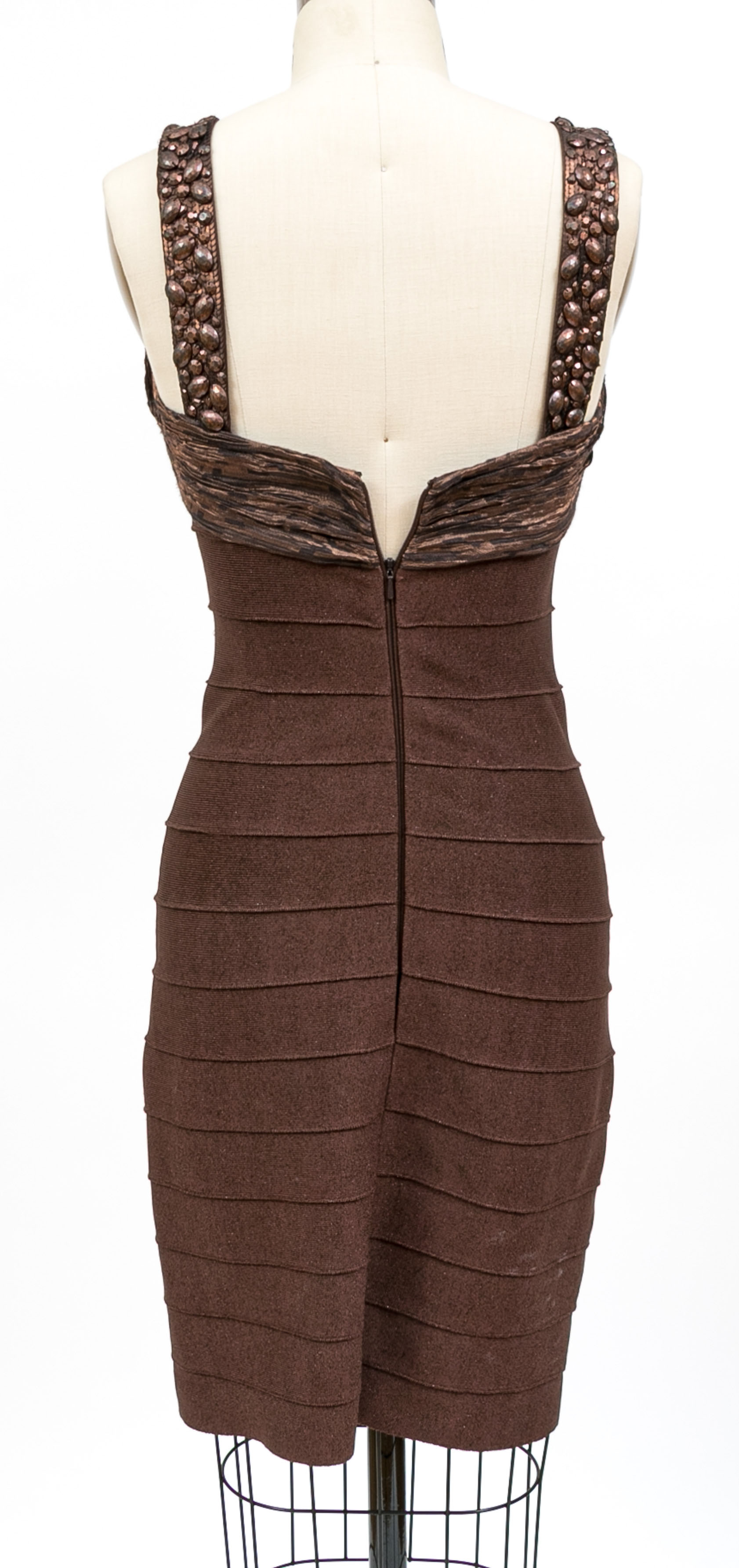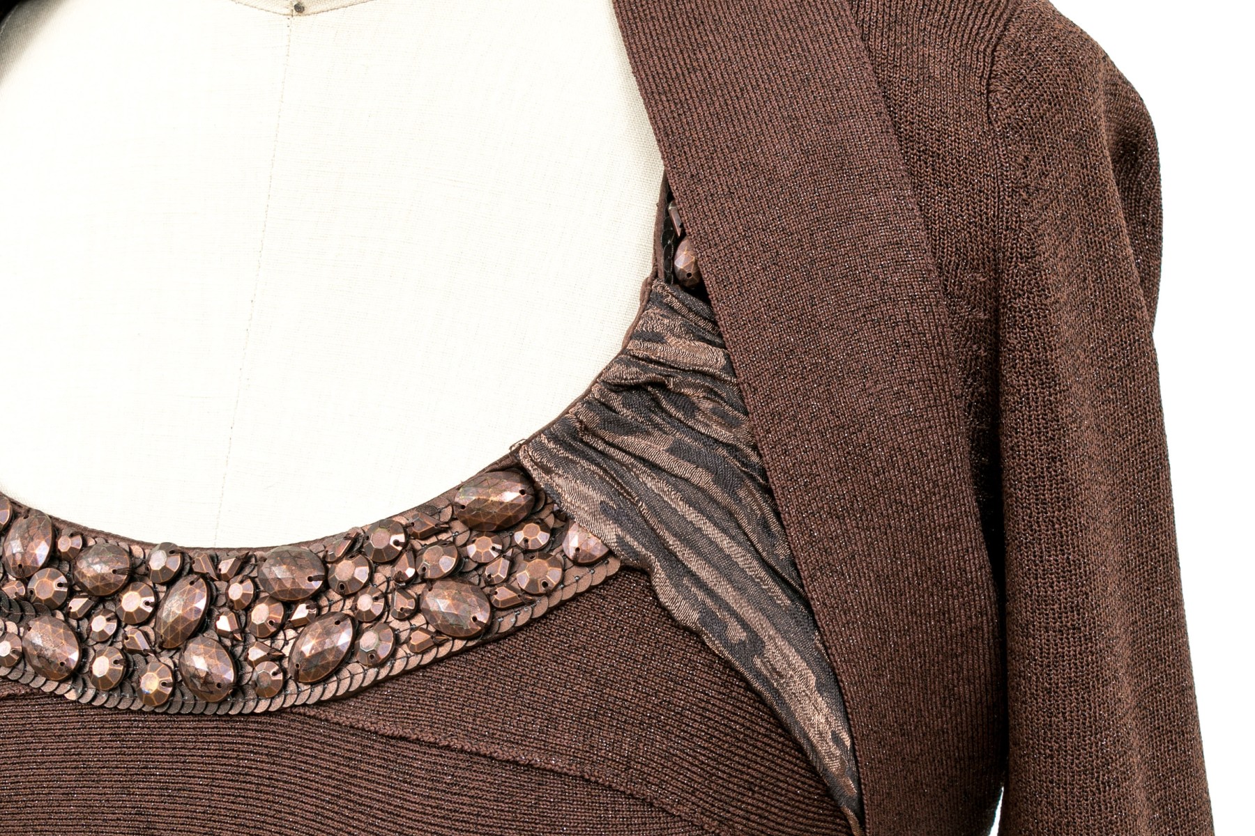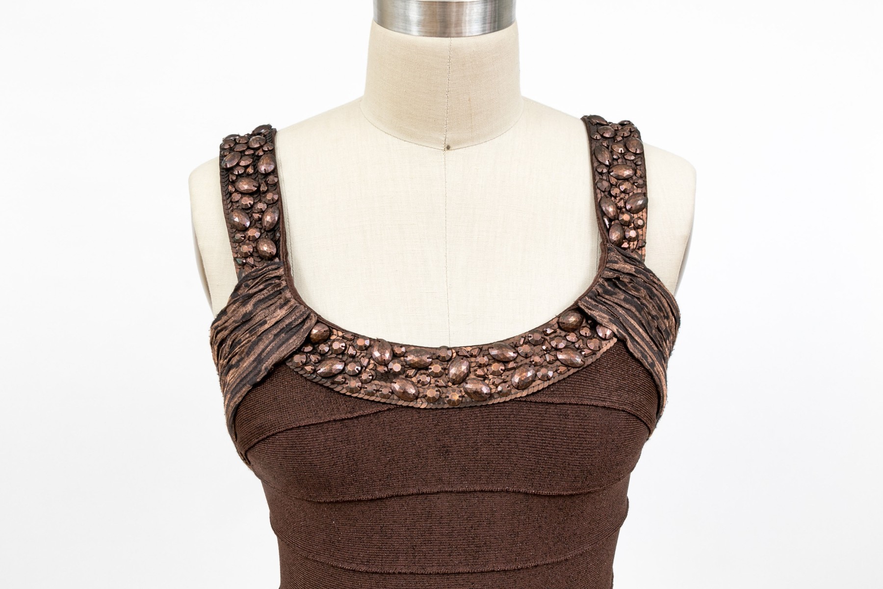 Carmen Marc Valvo brown and copper bedazzled tank sheath, matching bolero jacket, size S