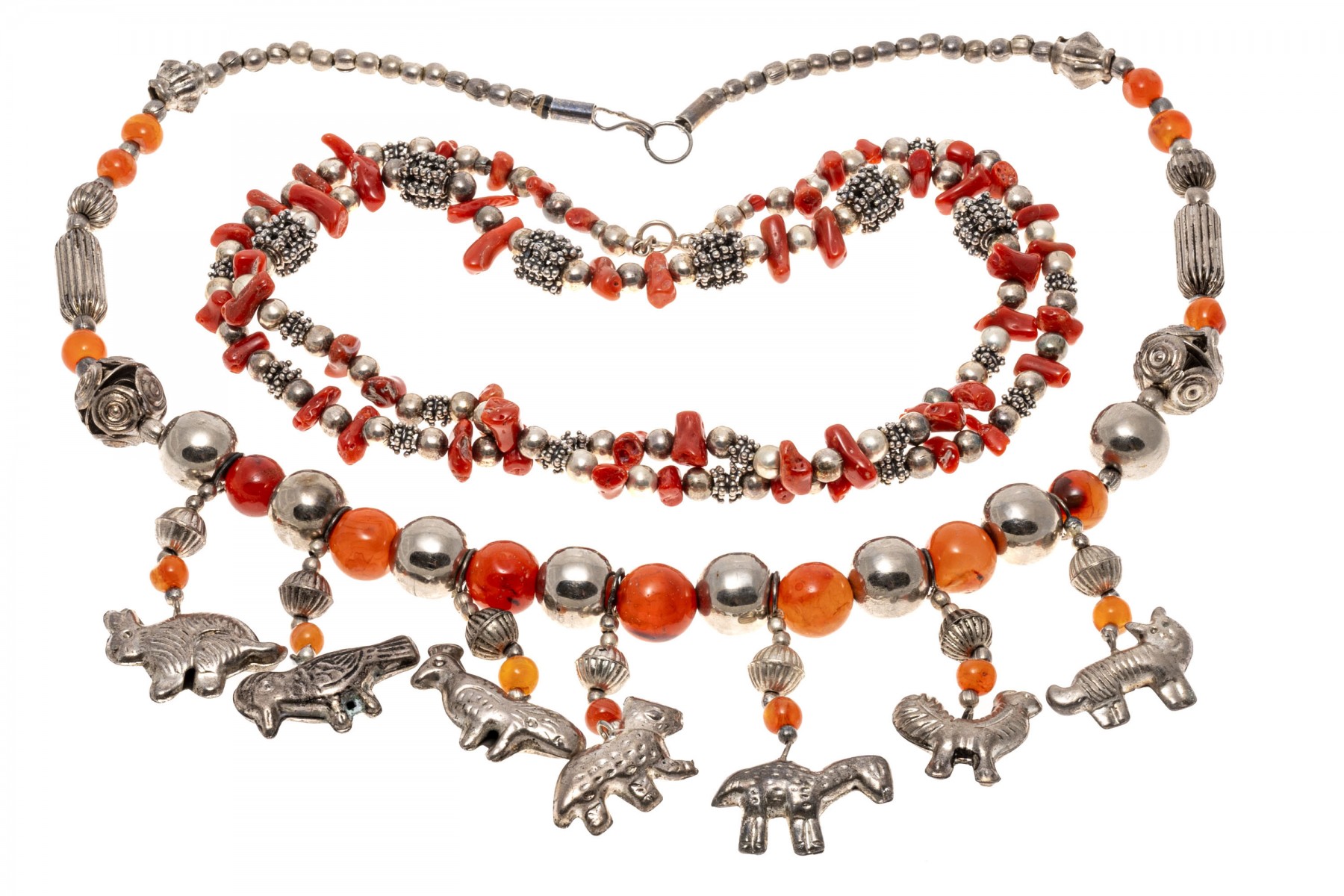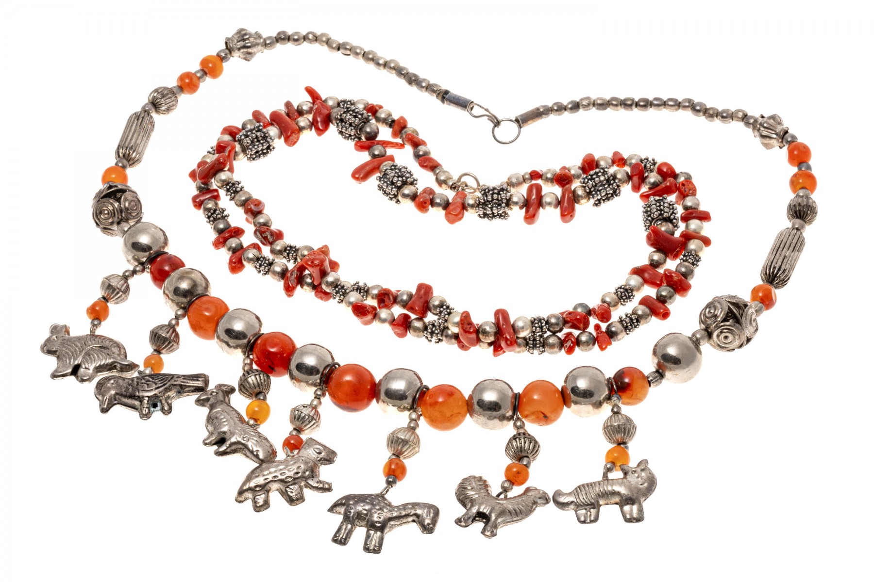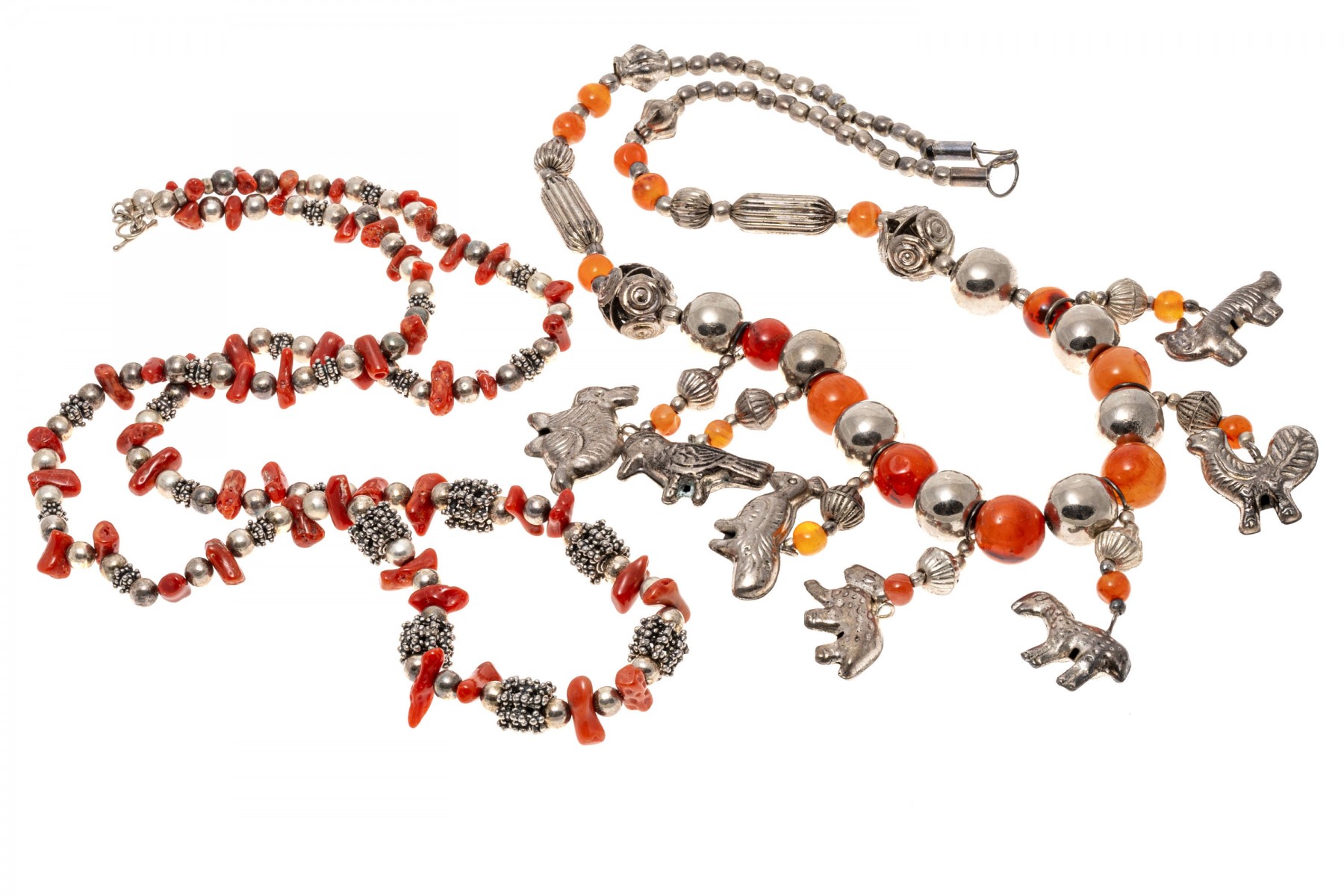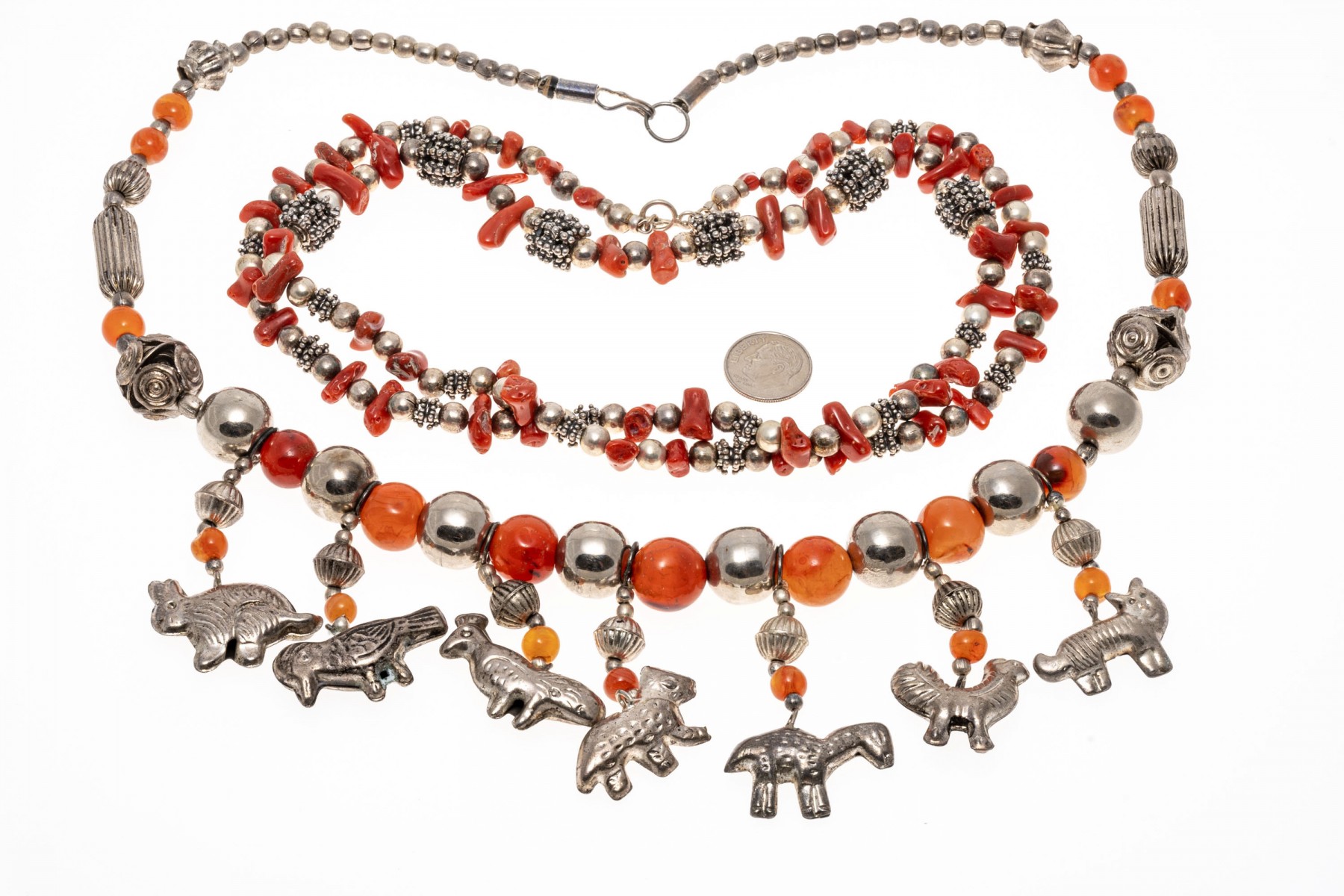 Two strung beaded necklaces. The first necklace is strung with carnelian and metallic beads, with suspended animal figural beads. The second necklace is strung with coral and sterling silver studded beads. Hooks and toggle clasps.