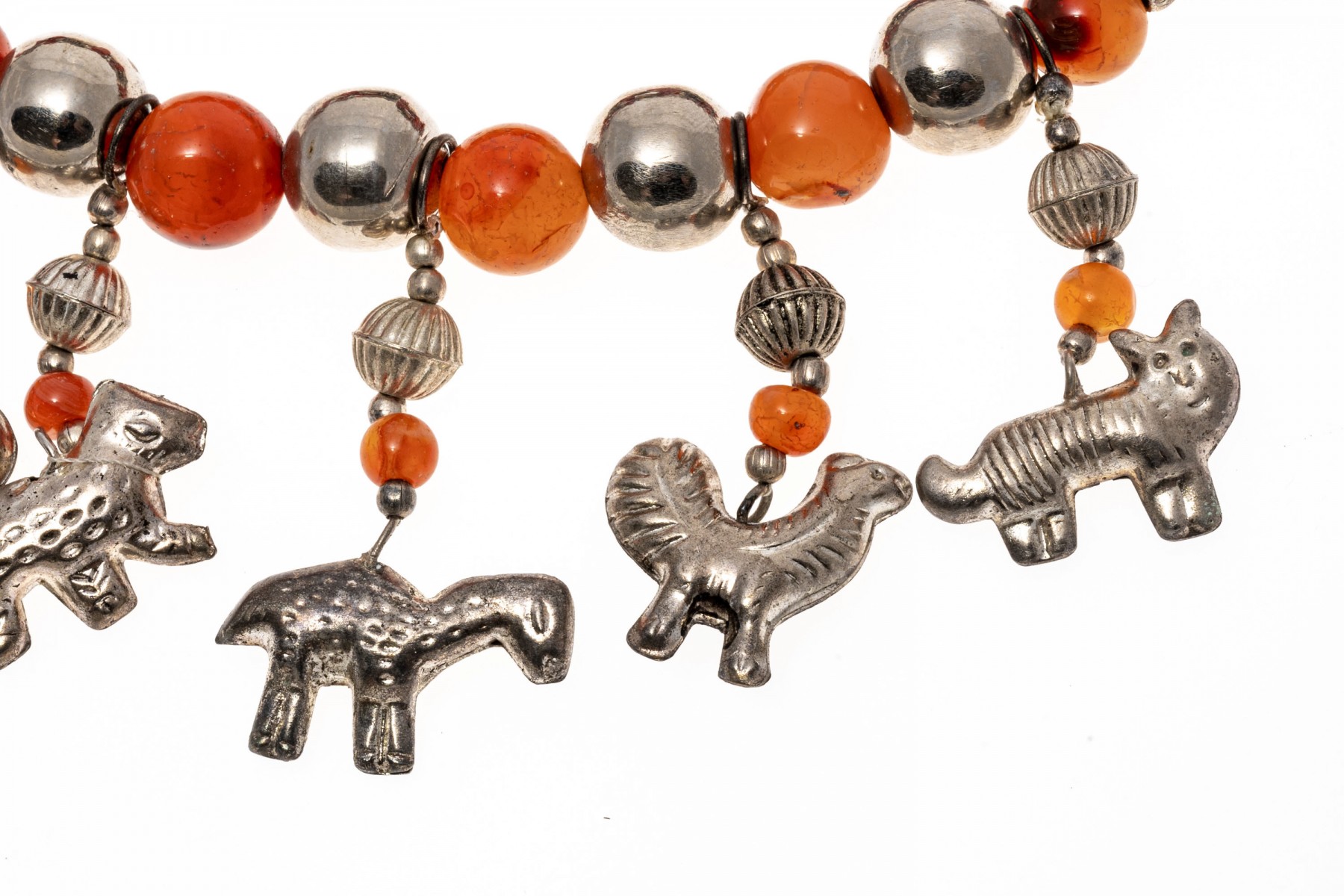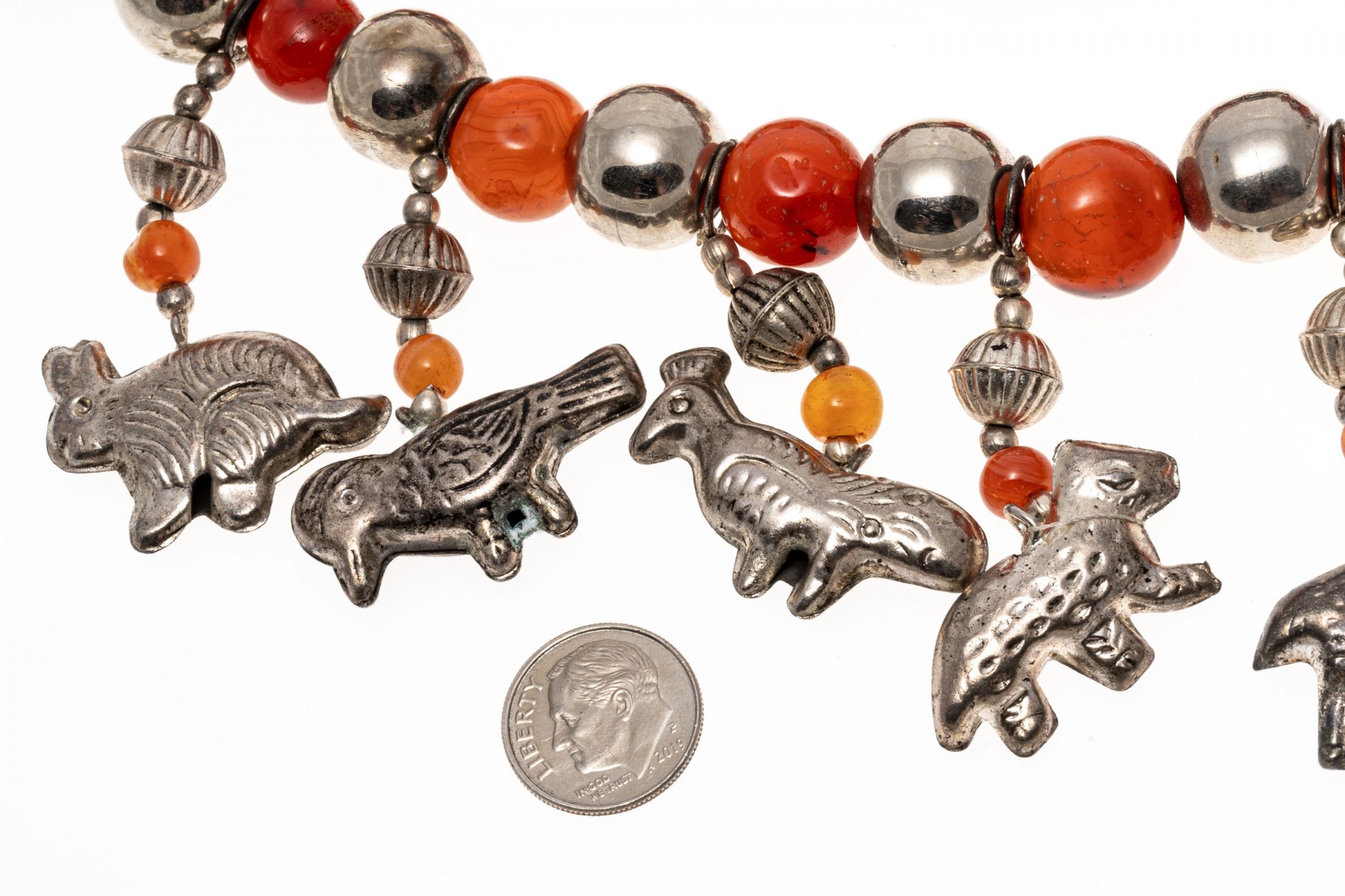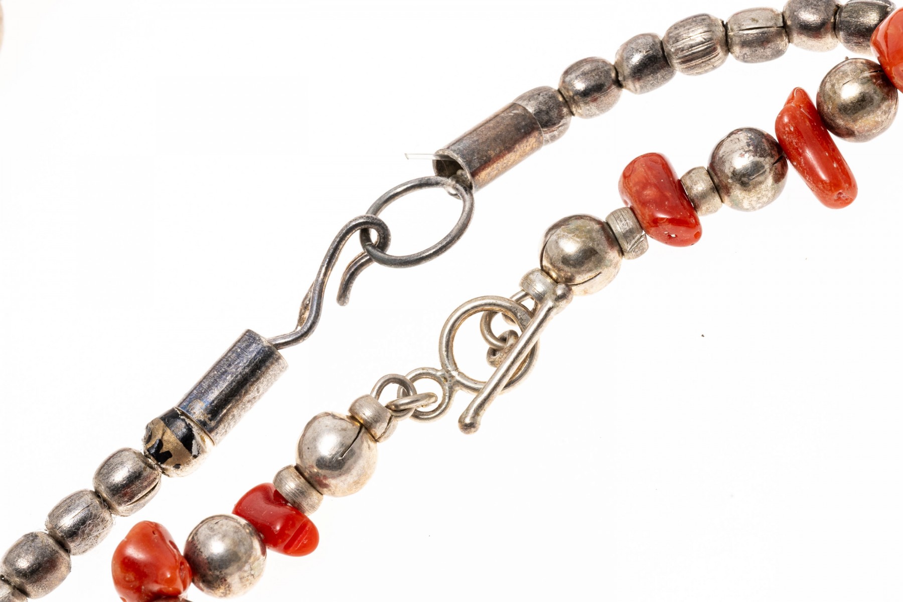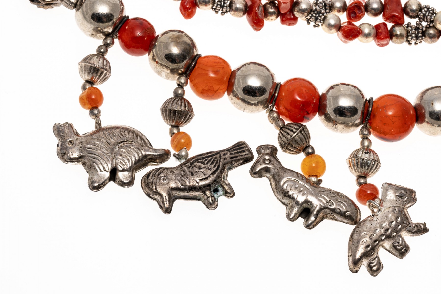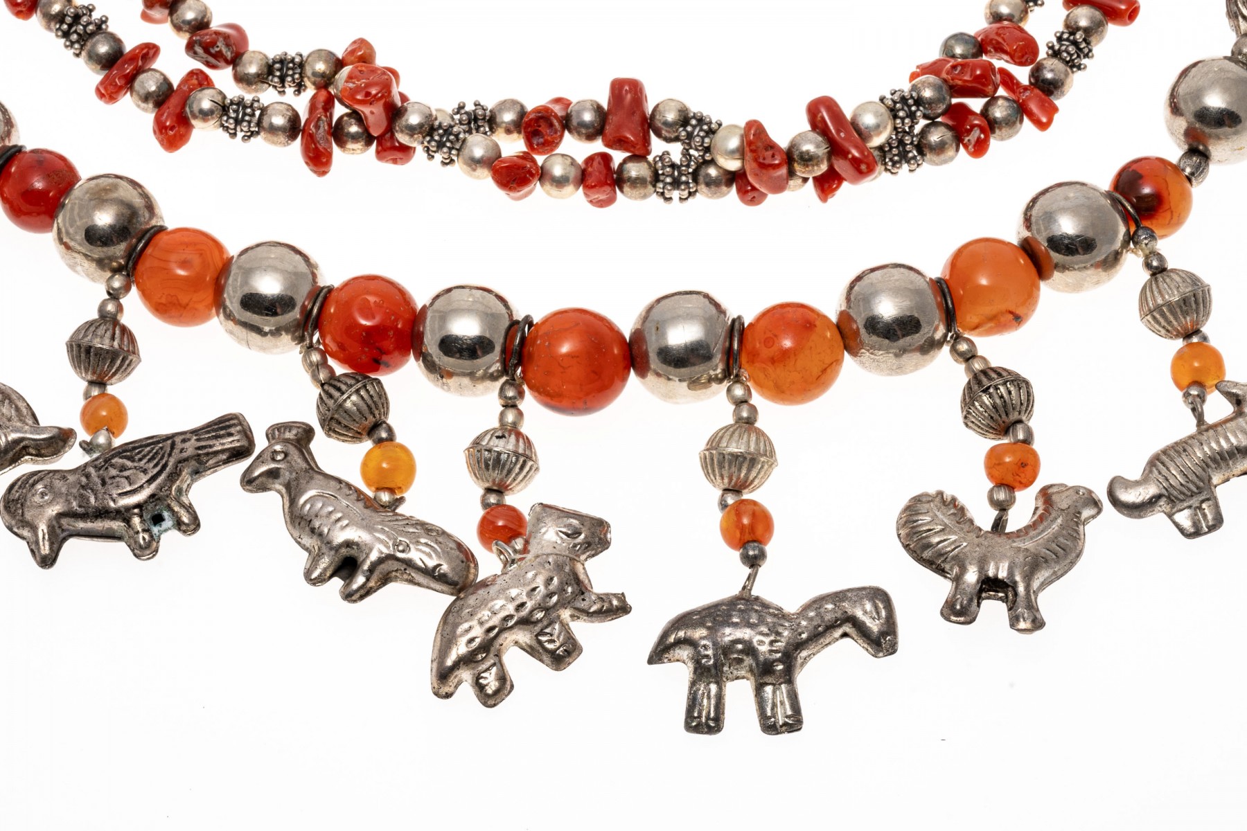 Two strung beaded necklaces. The first necklace is strung with carnelian and metallic beads, with suspended animal figural beads. The second necklace is strung with coral and sterling silver studded beads. Hooks and toggle clasps.