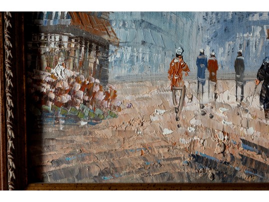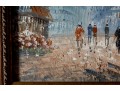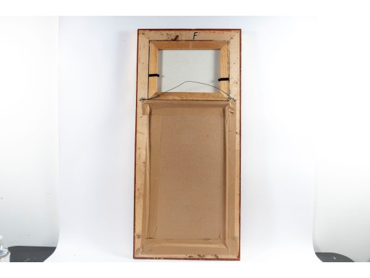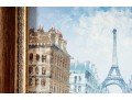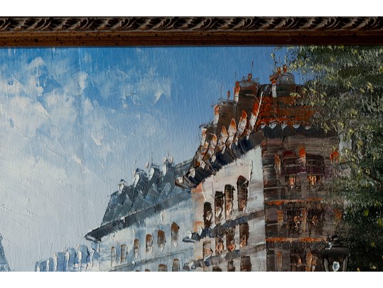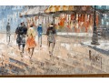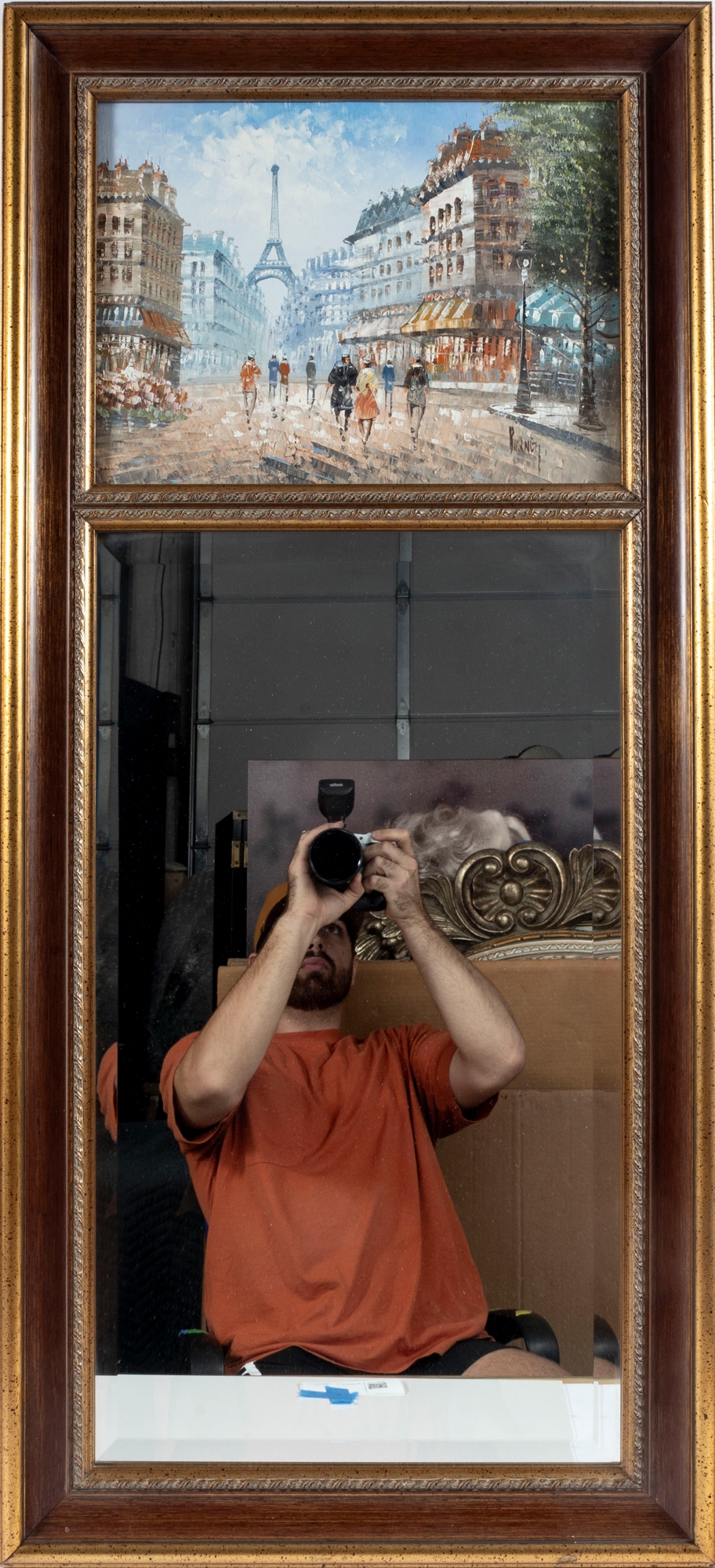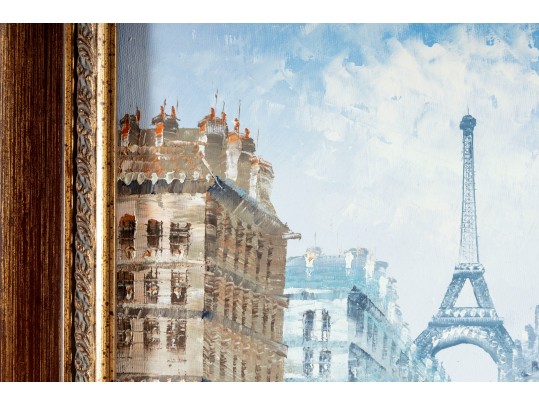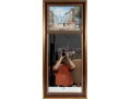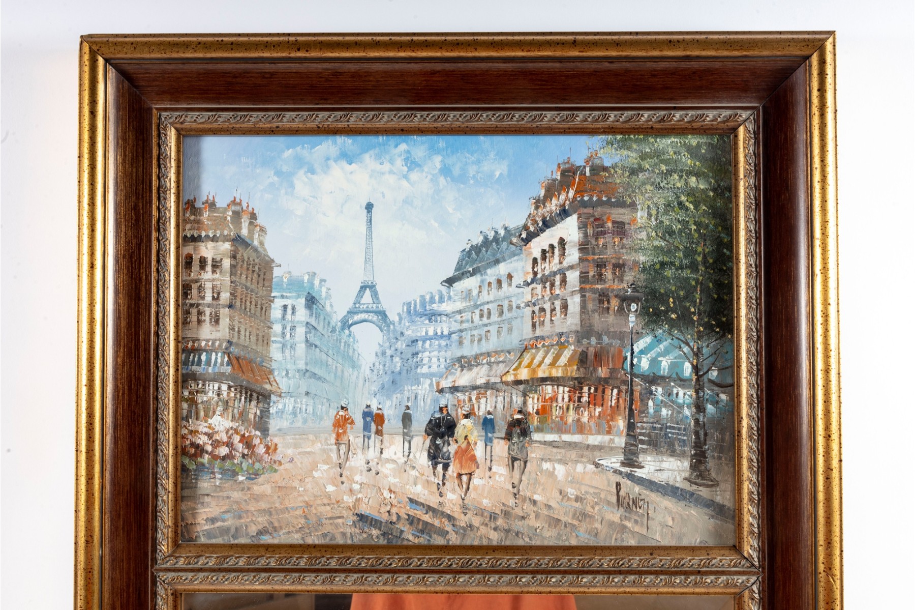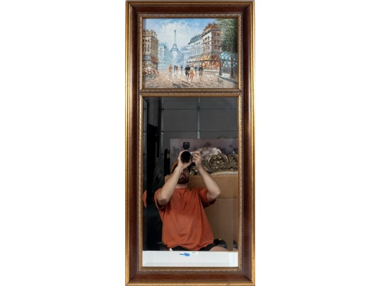 Above this elegant, gold tone frame and beveled glass wall mirror panel features a hand-painted, oil on canvas Parisian street scene signed by Caroline C. Burnett. The impressionist painting provides a window into vintage Paris, bustling with life and romantic charm.