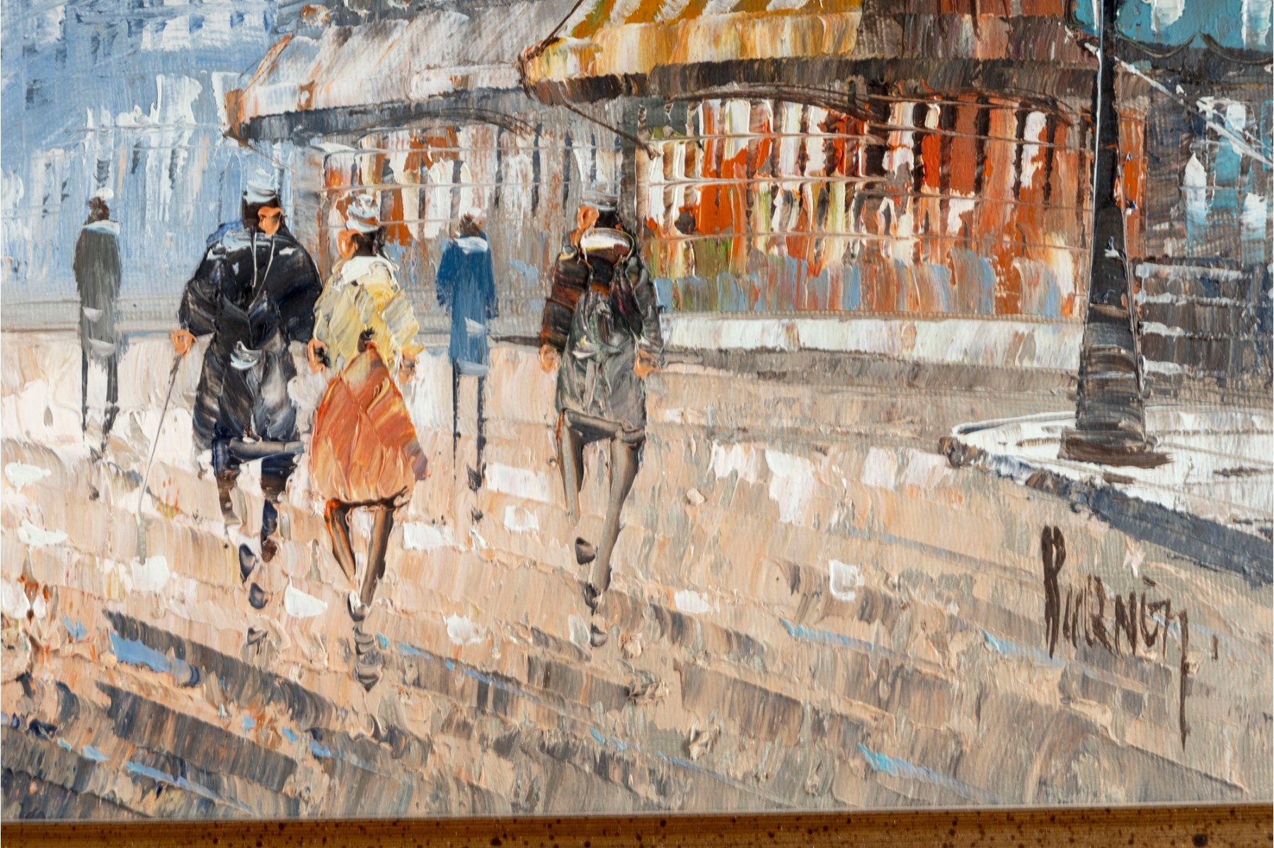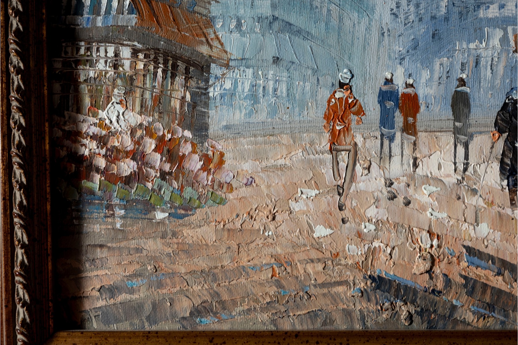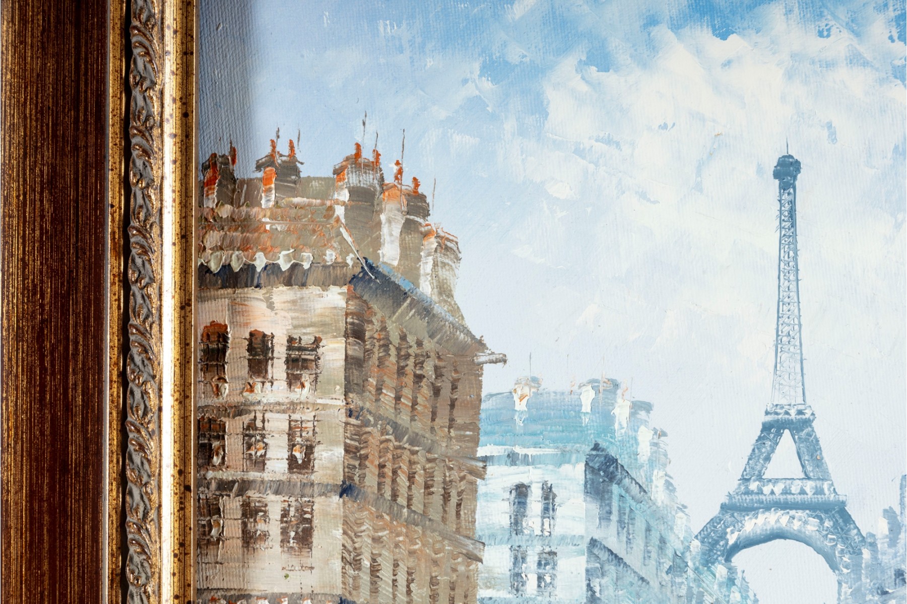 Above this elegant, gold tone frame and beveled glass wall mirror panel features a hand-painted, oil on canvas Parisian street scene signed by Caroline C. Burnett. The impressionist painting provides a window into vintage Paris, bustling with life and romantic charm.