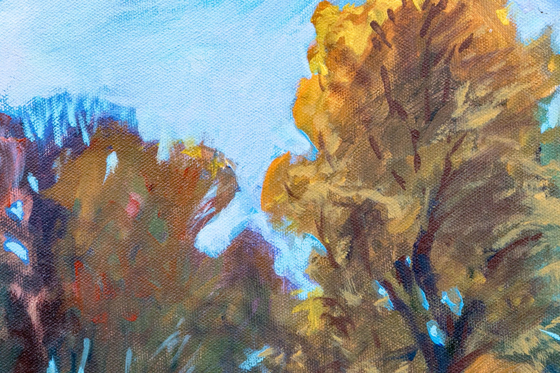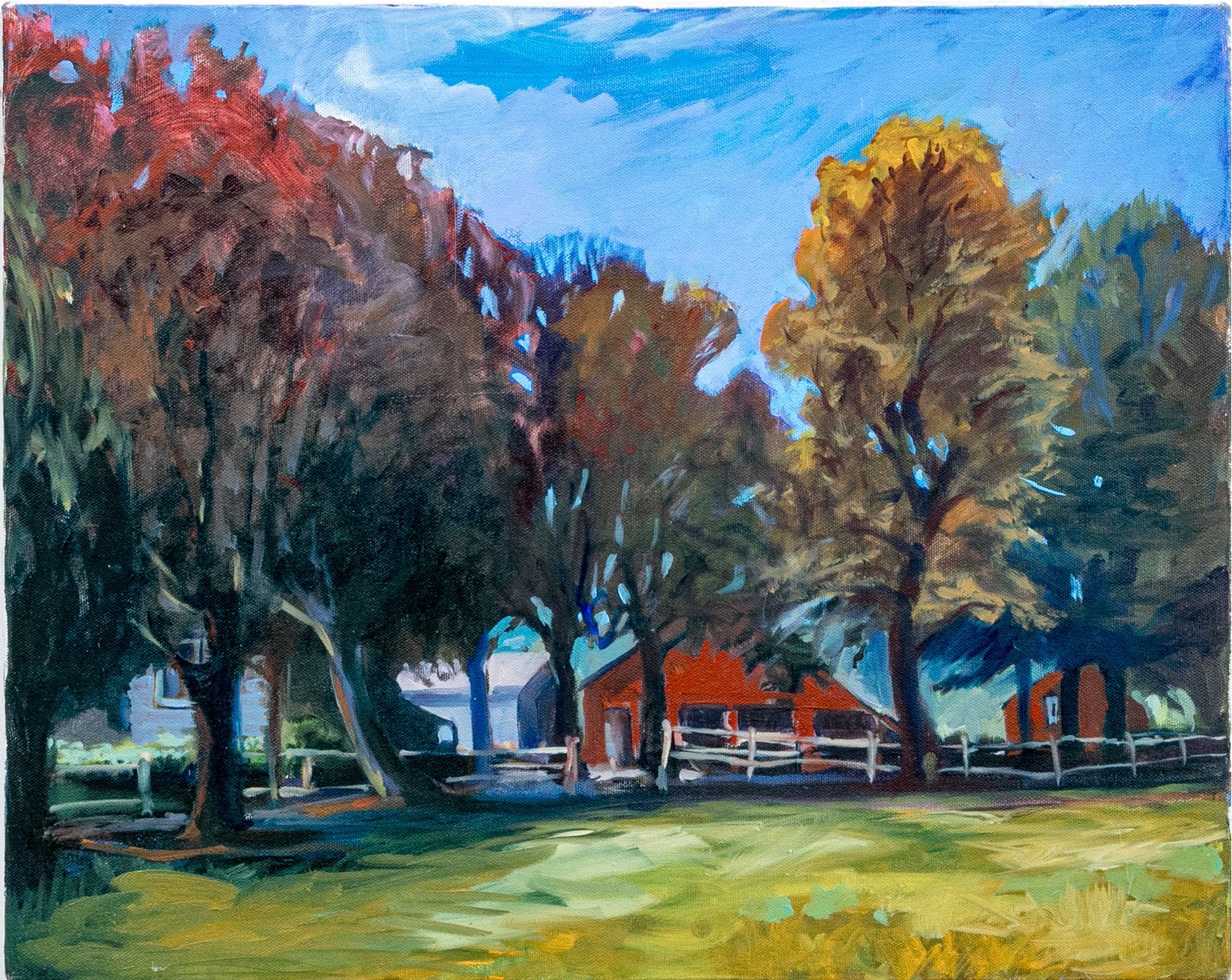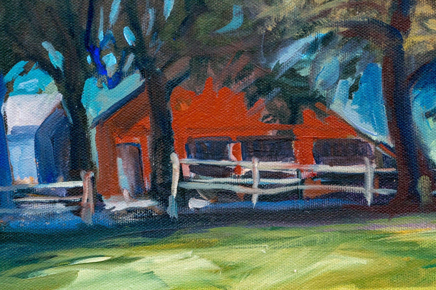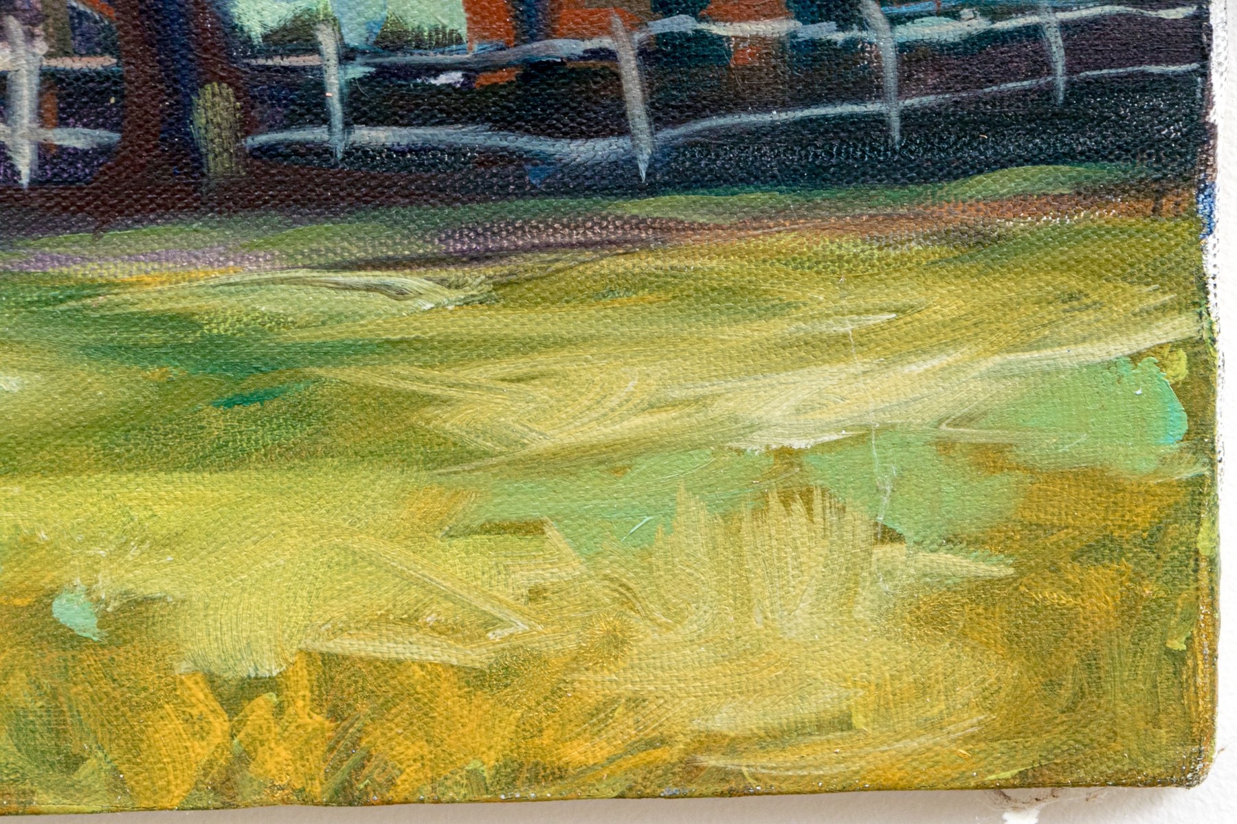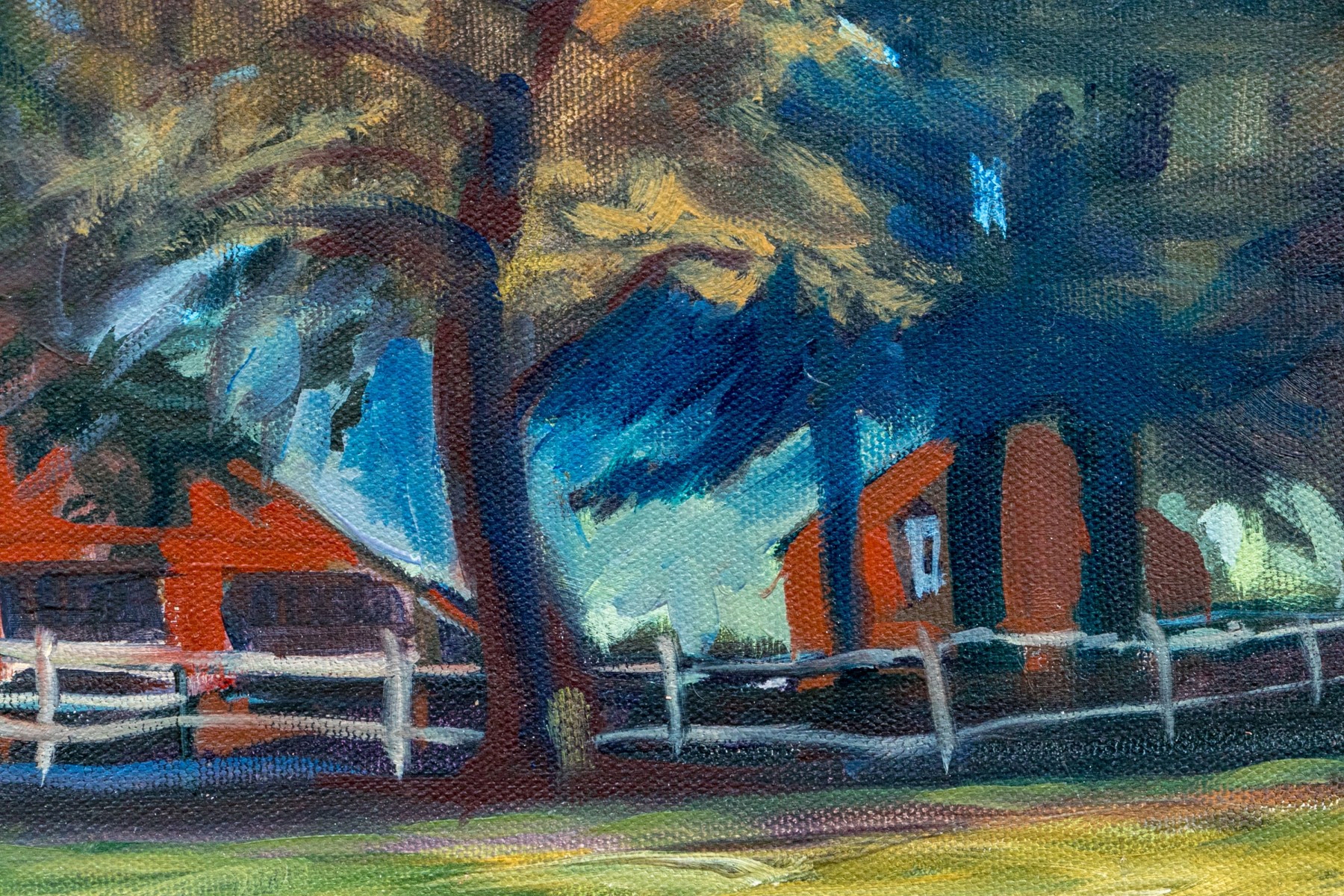 Caroline Gantz (American, b. 1954) impressionist oil painting on canvas depicting an impressionist rural landscape with a white home and two red barns peeking through autumnal trees lined with a white split rail fence opening up to a grass field. The piece is unsigned. The canvas is mounted to a stretcher, unframed.