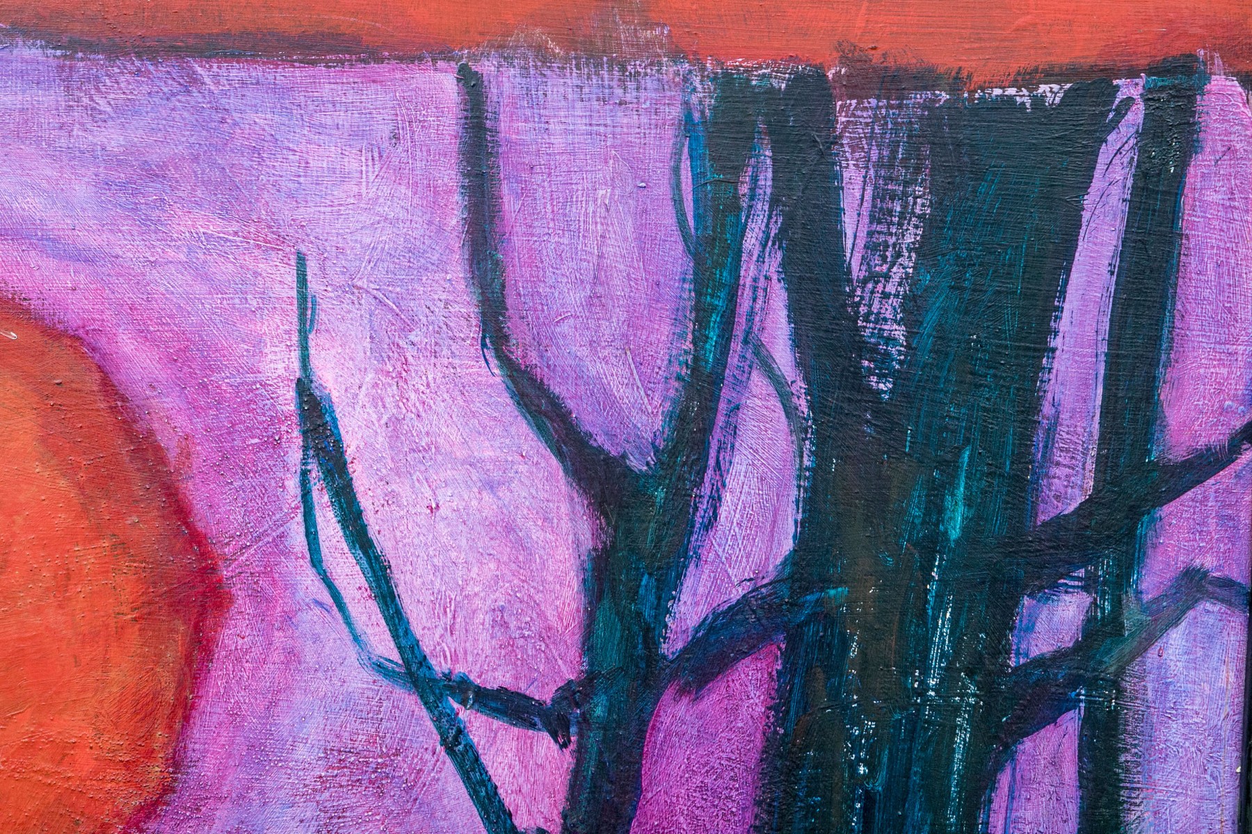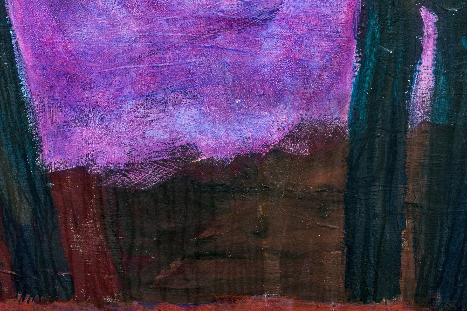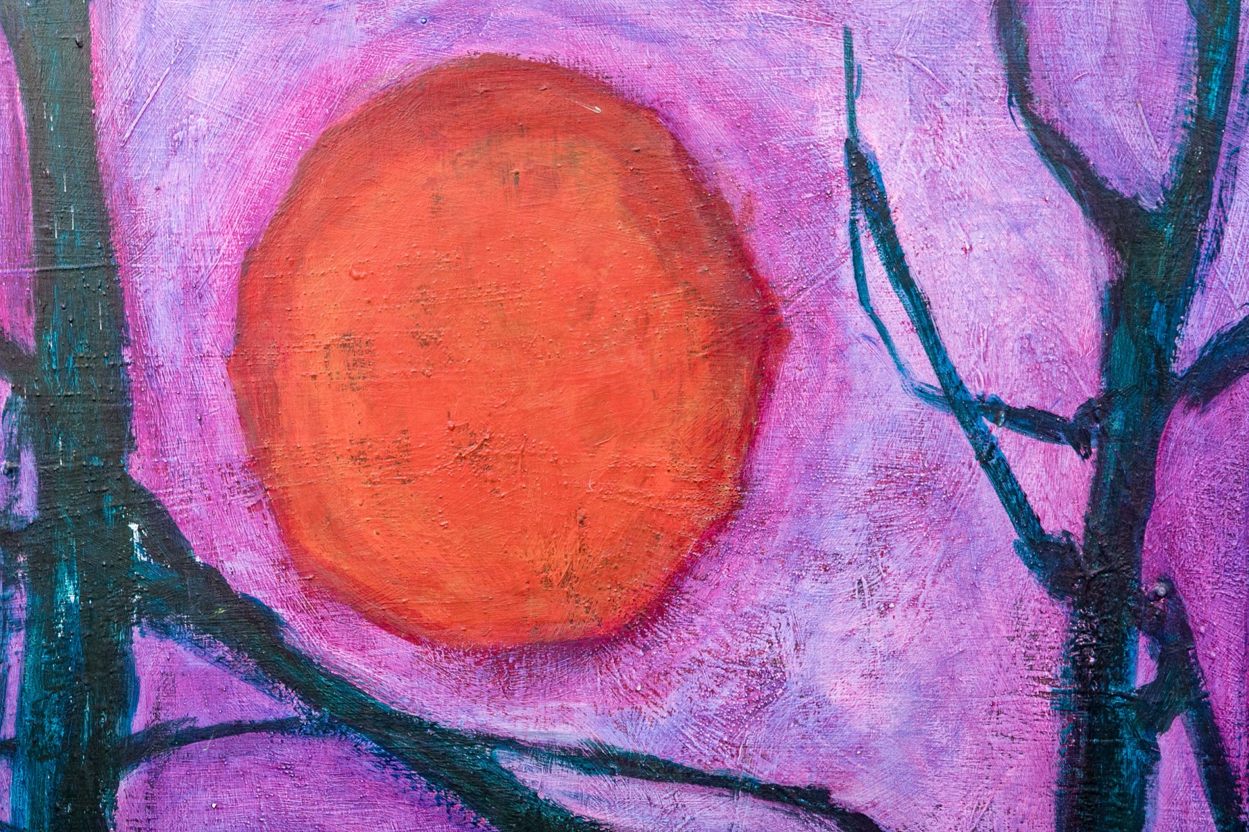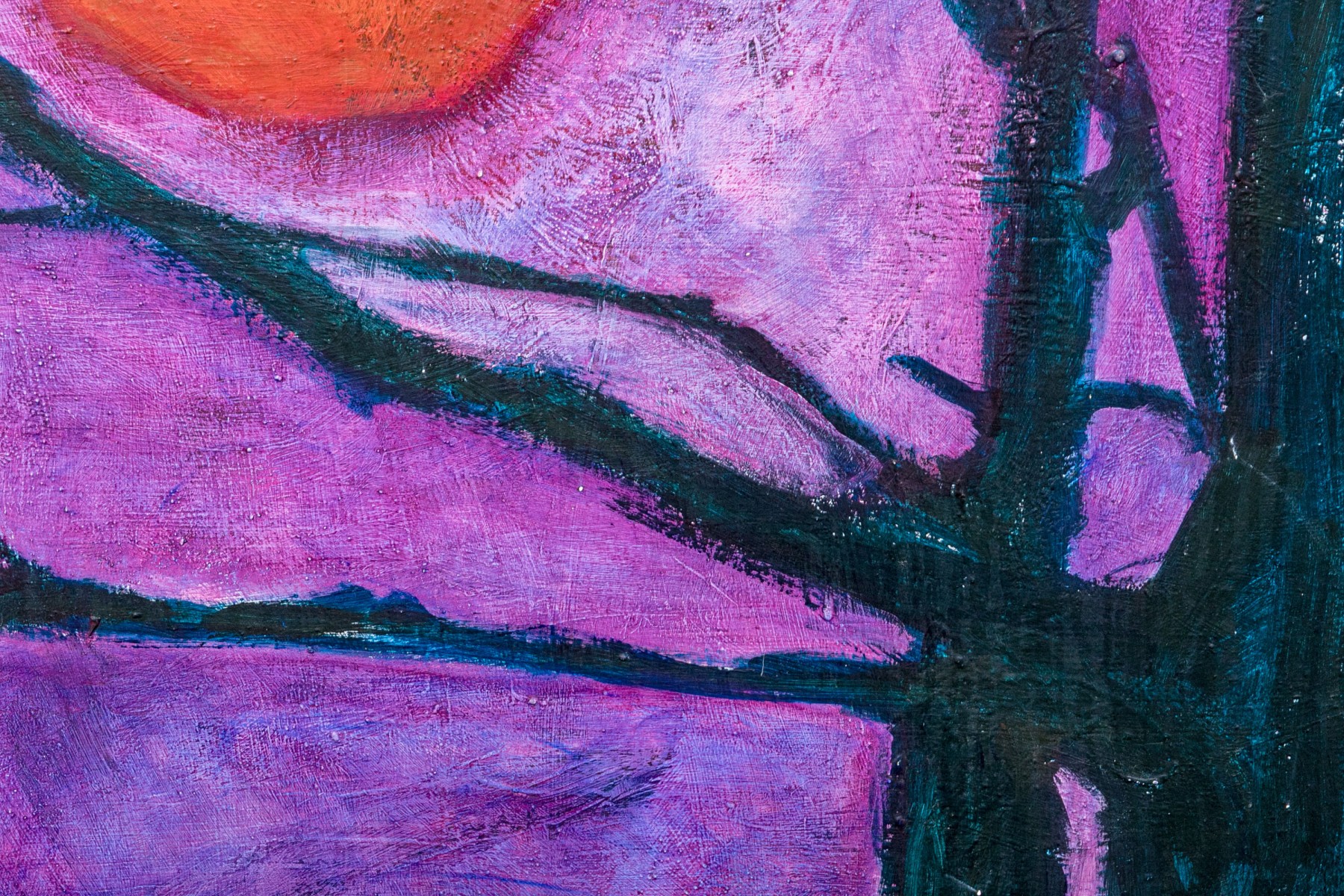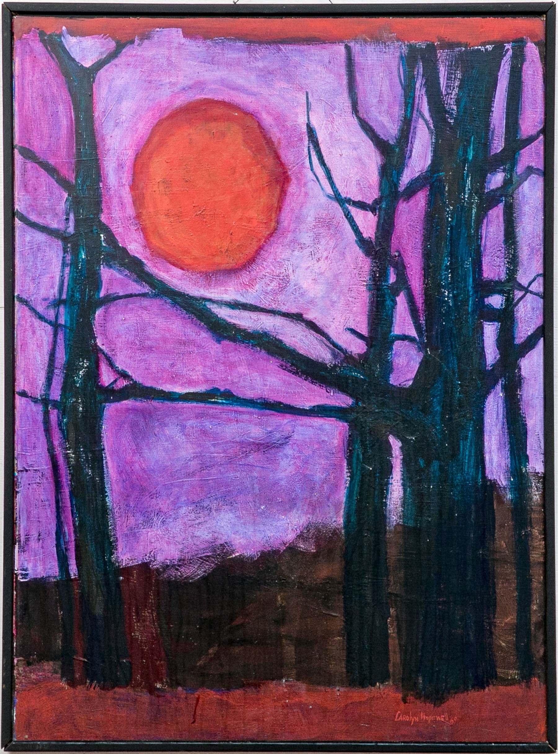 Signed and dated 69 lower right. A large landscape with black trees and a red moon on the purple sky. Set into a black painted wood frame.