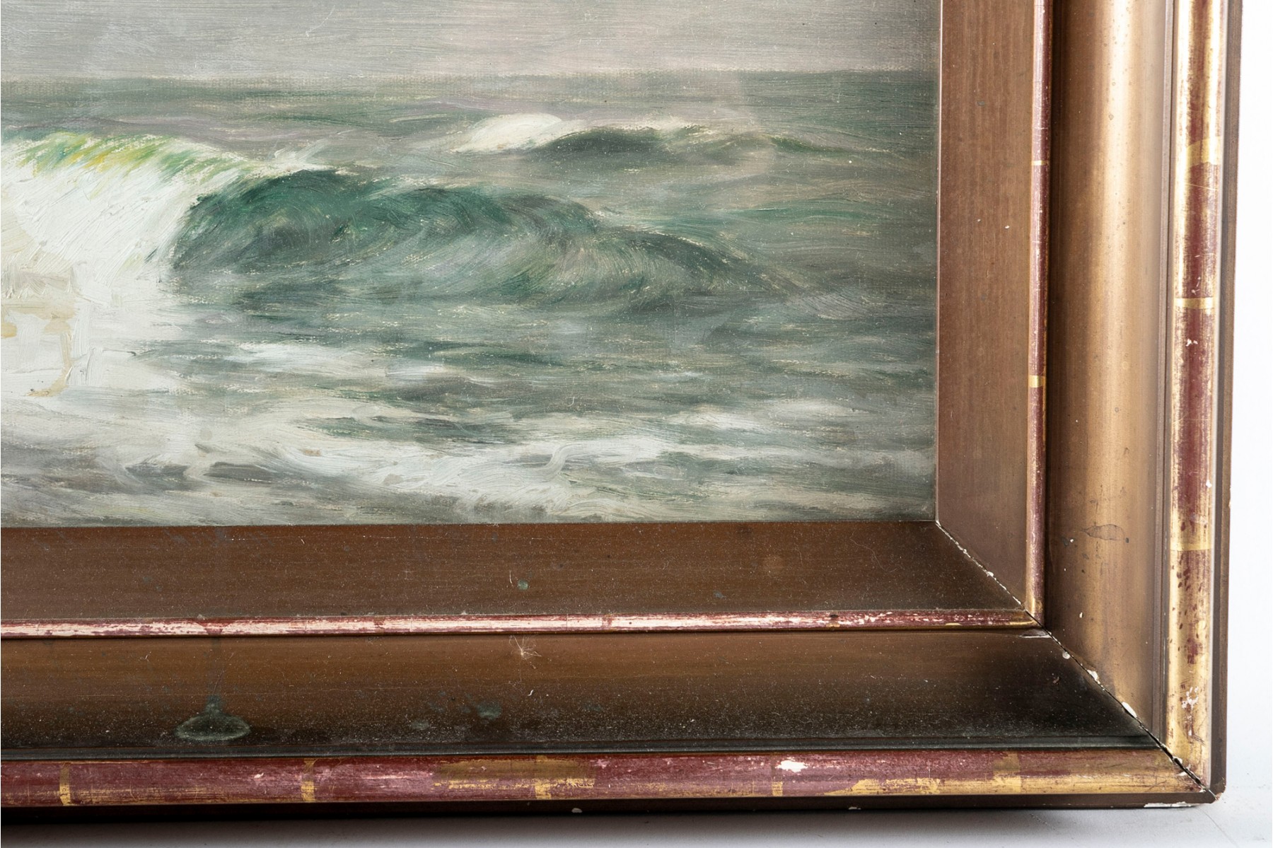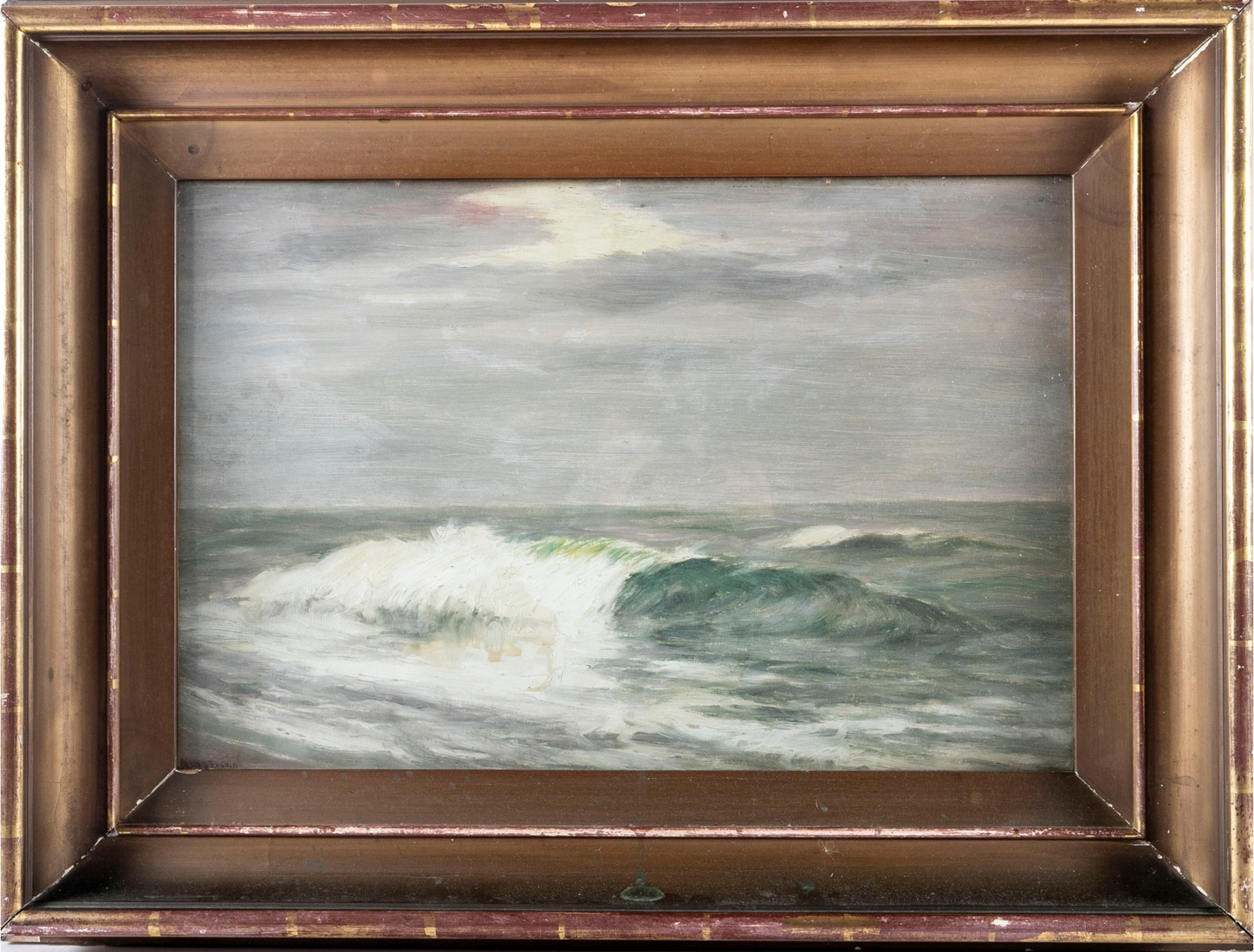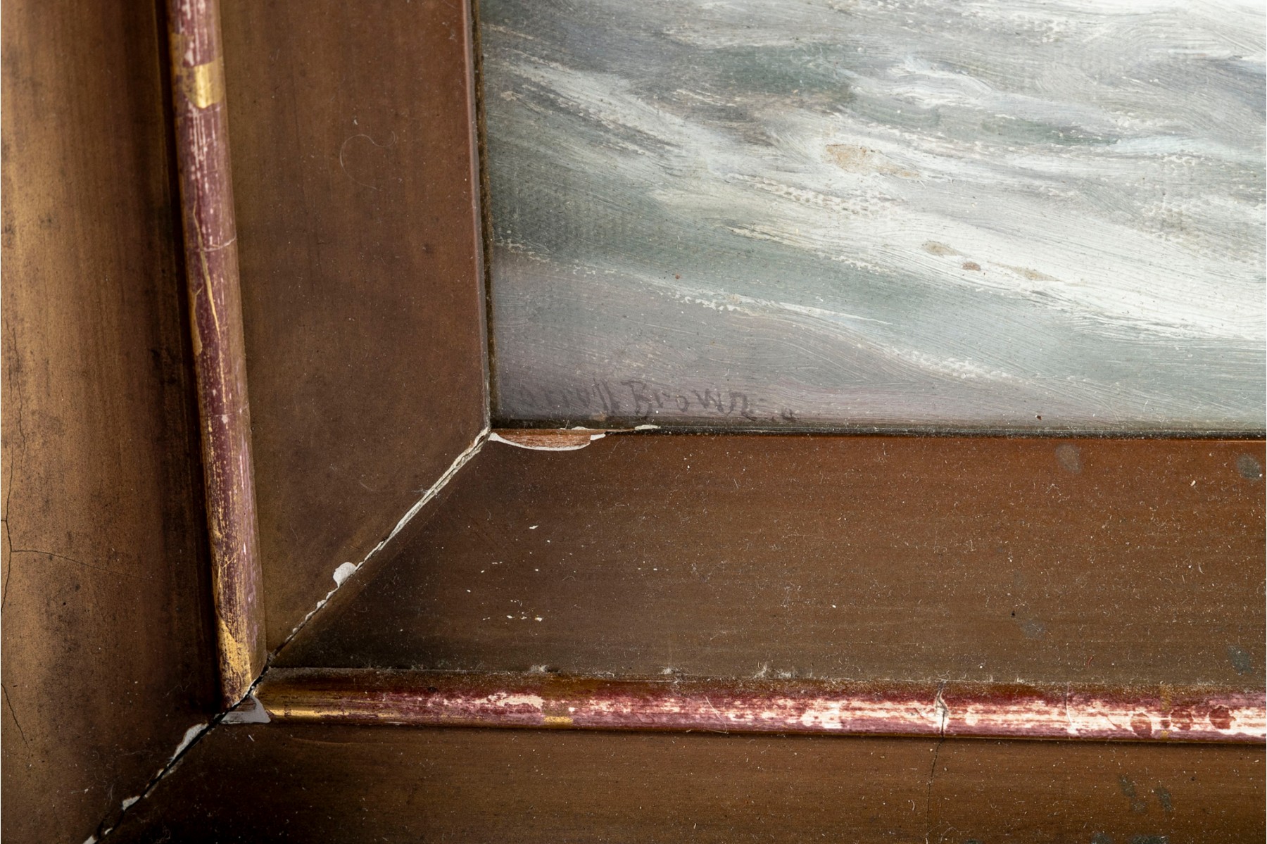 Carroll Butler Brown (American, 1868-1923) oil on canvas board depicting a moody seascape with crazing waves frothing from navy to white with hints of purple and green, the horizon following a gray-purple sky. Signed lower left. Displayed behind glass in a distressed gilt frame.