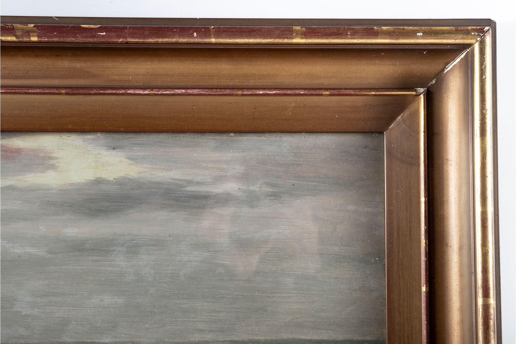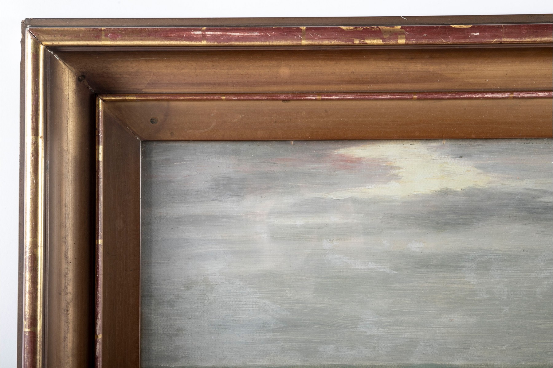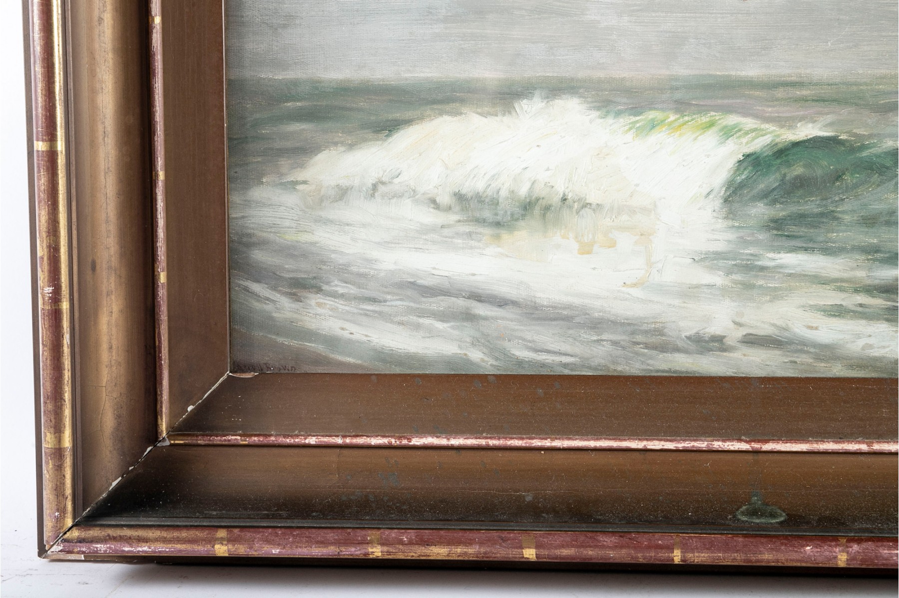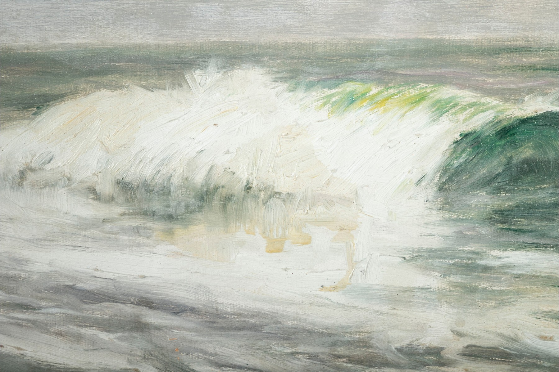 Carroll Butler Brown (American, 1868-1923) oil on canvas board depicting a moody seascape with crazing waves frothing from navy to white with hints of purple and green, the horizon following a gray-purple sky. Signed lower left. Displayed behind glass in a distressed gilt frame.