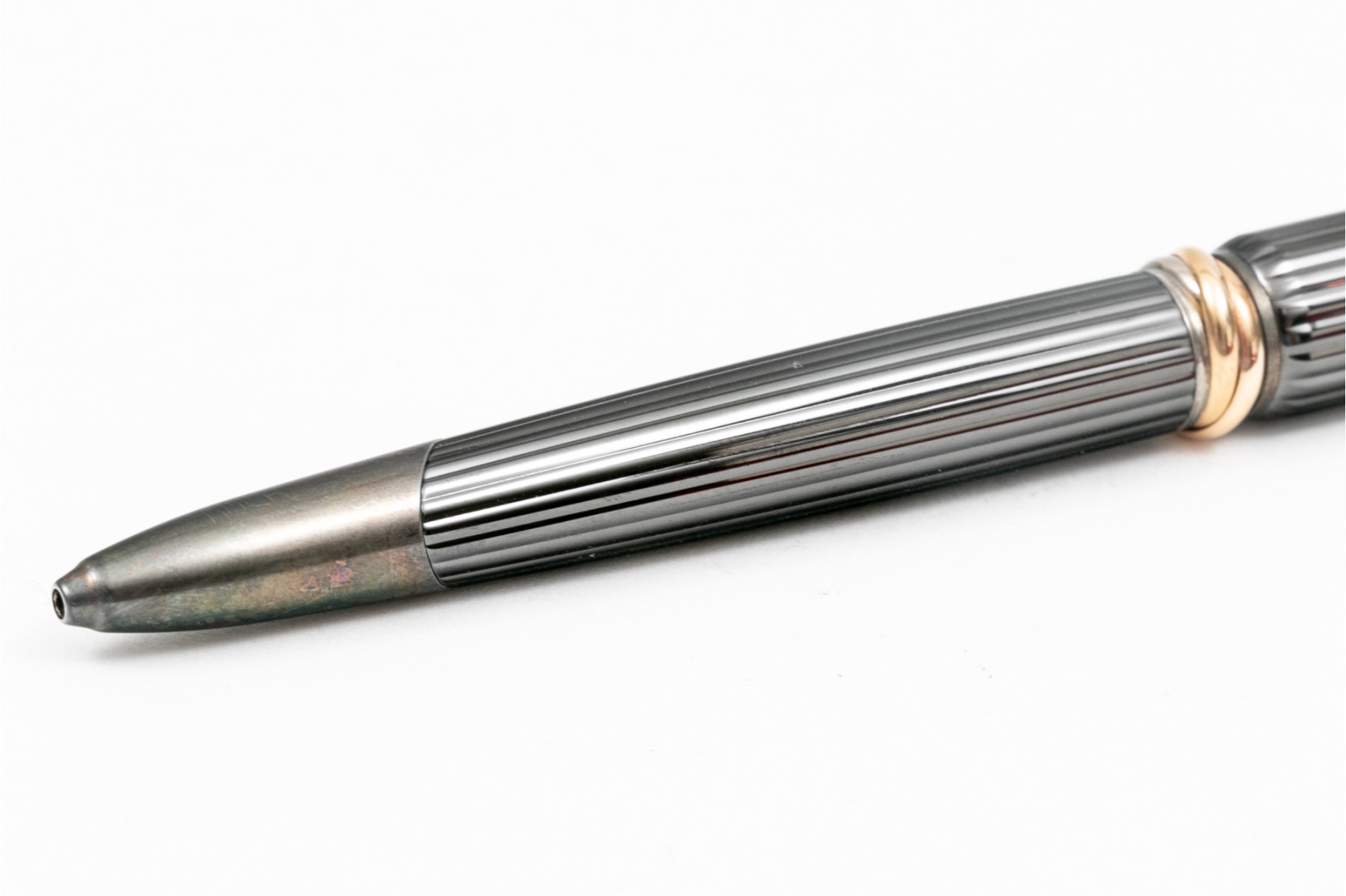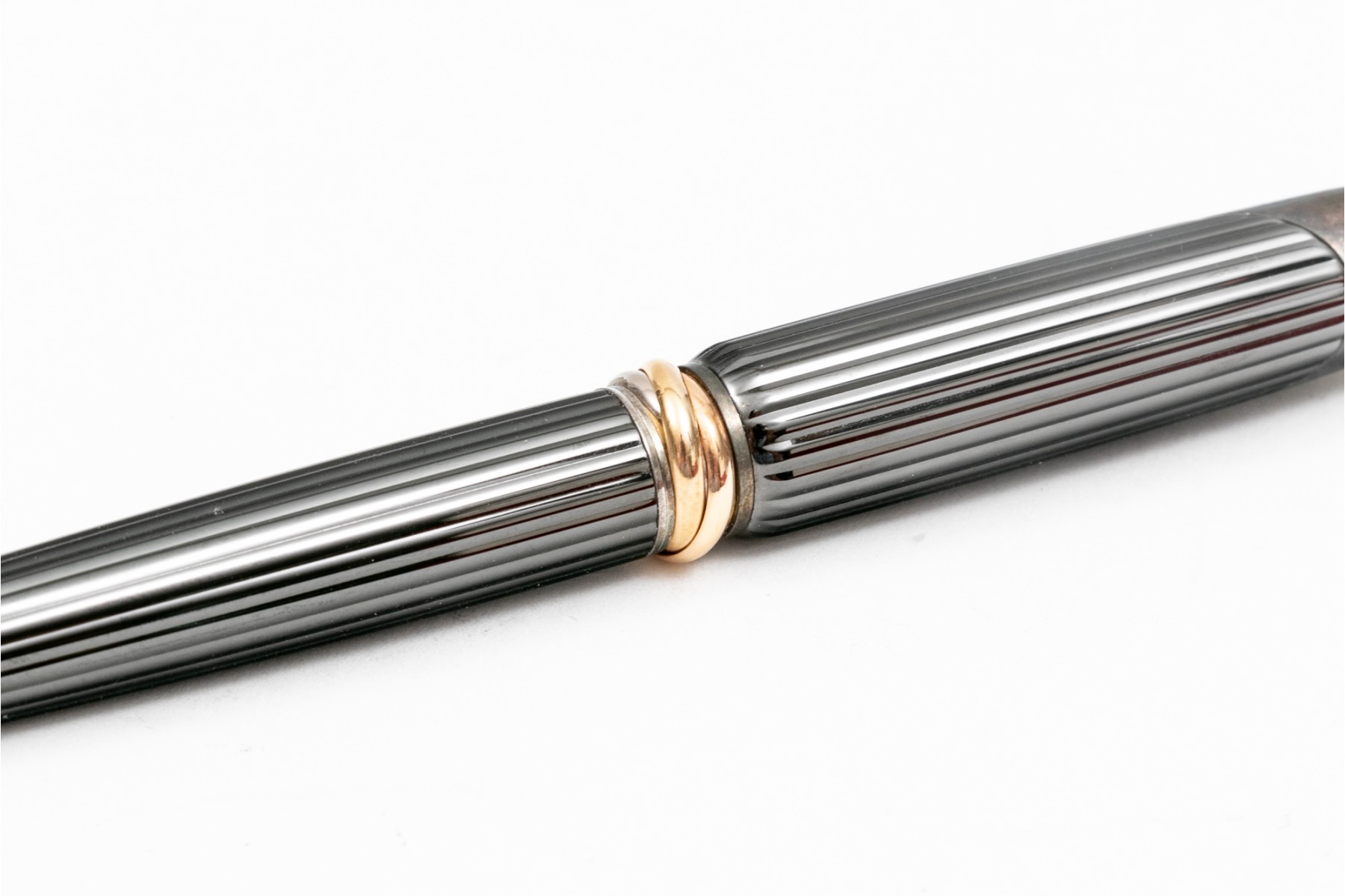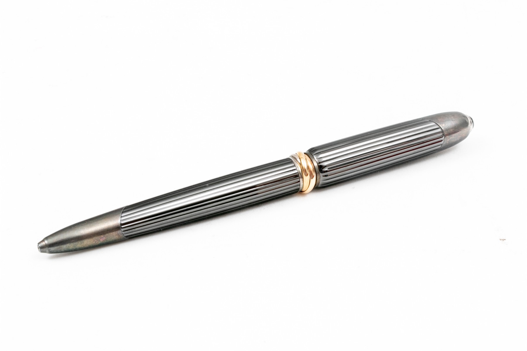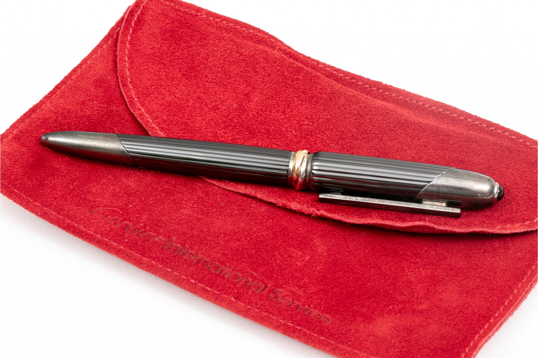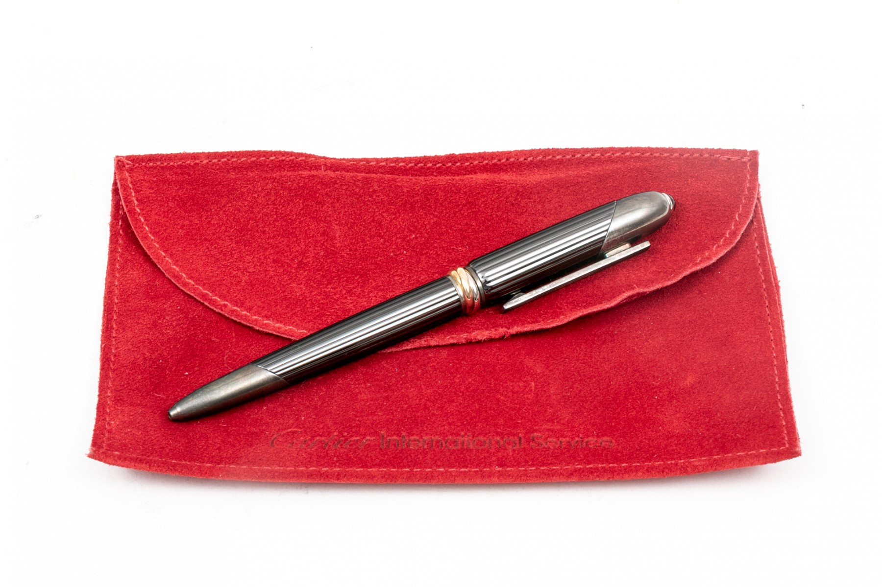 Cartier pen. This stunning pen is a Cartier Cougar de Trinity ballpoint, featuring a ribbed gunmetal color body with silver tone hardware. Accompanied by a service felt