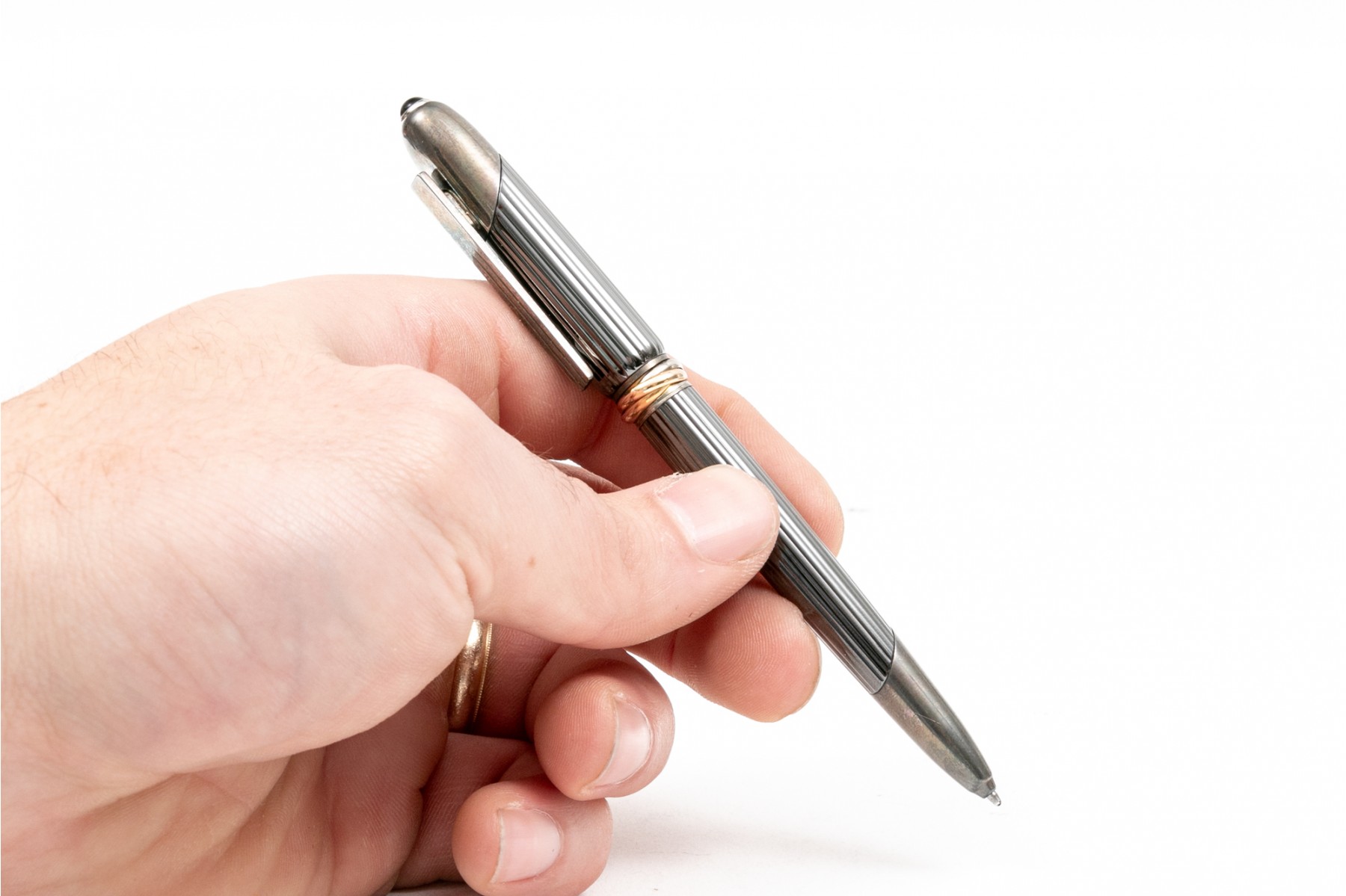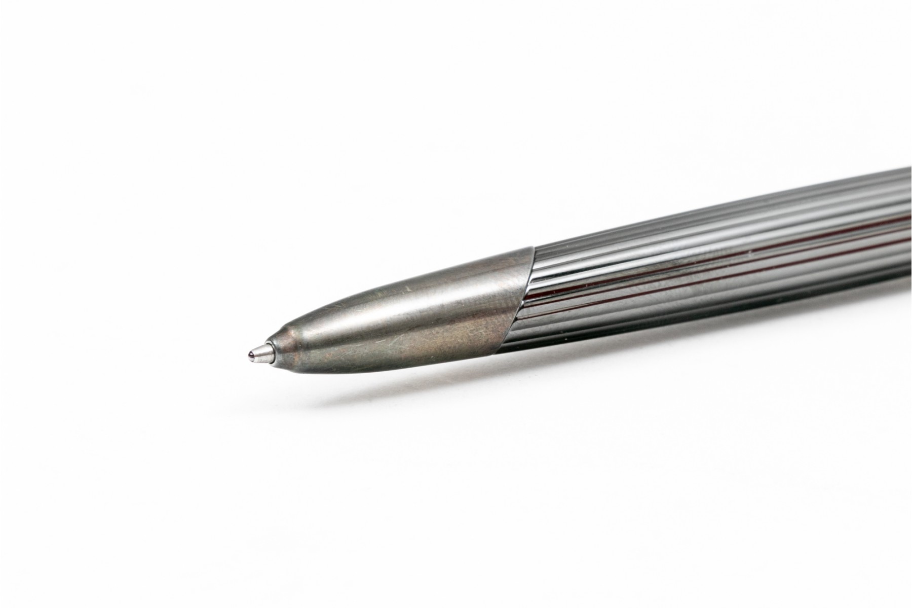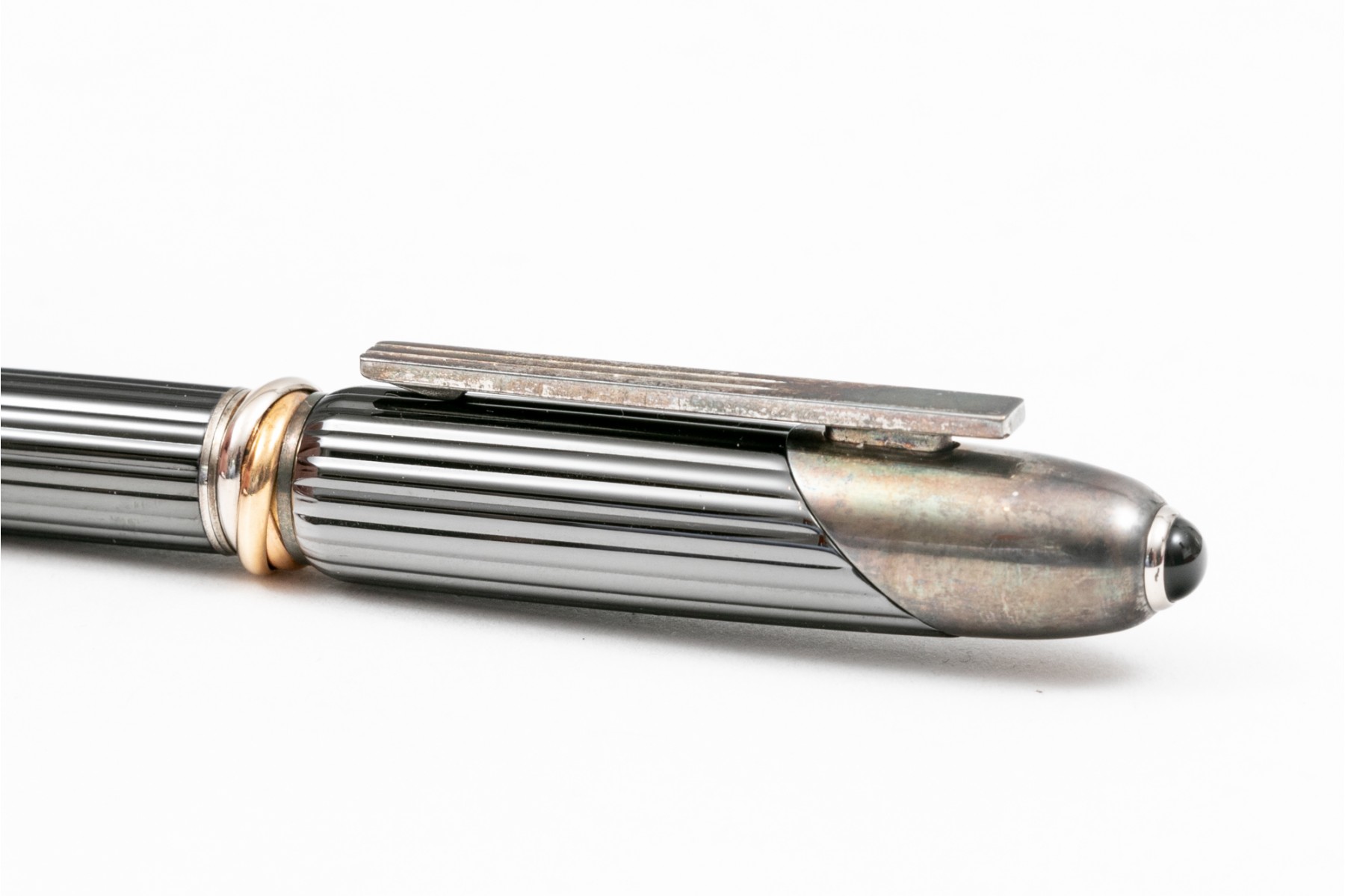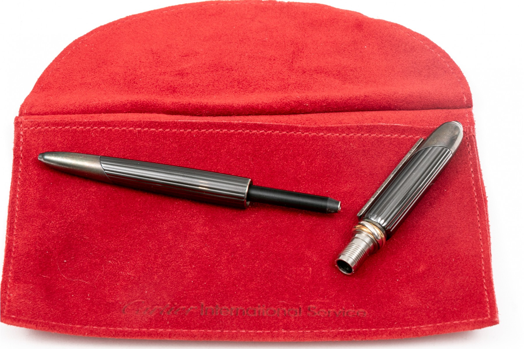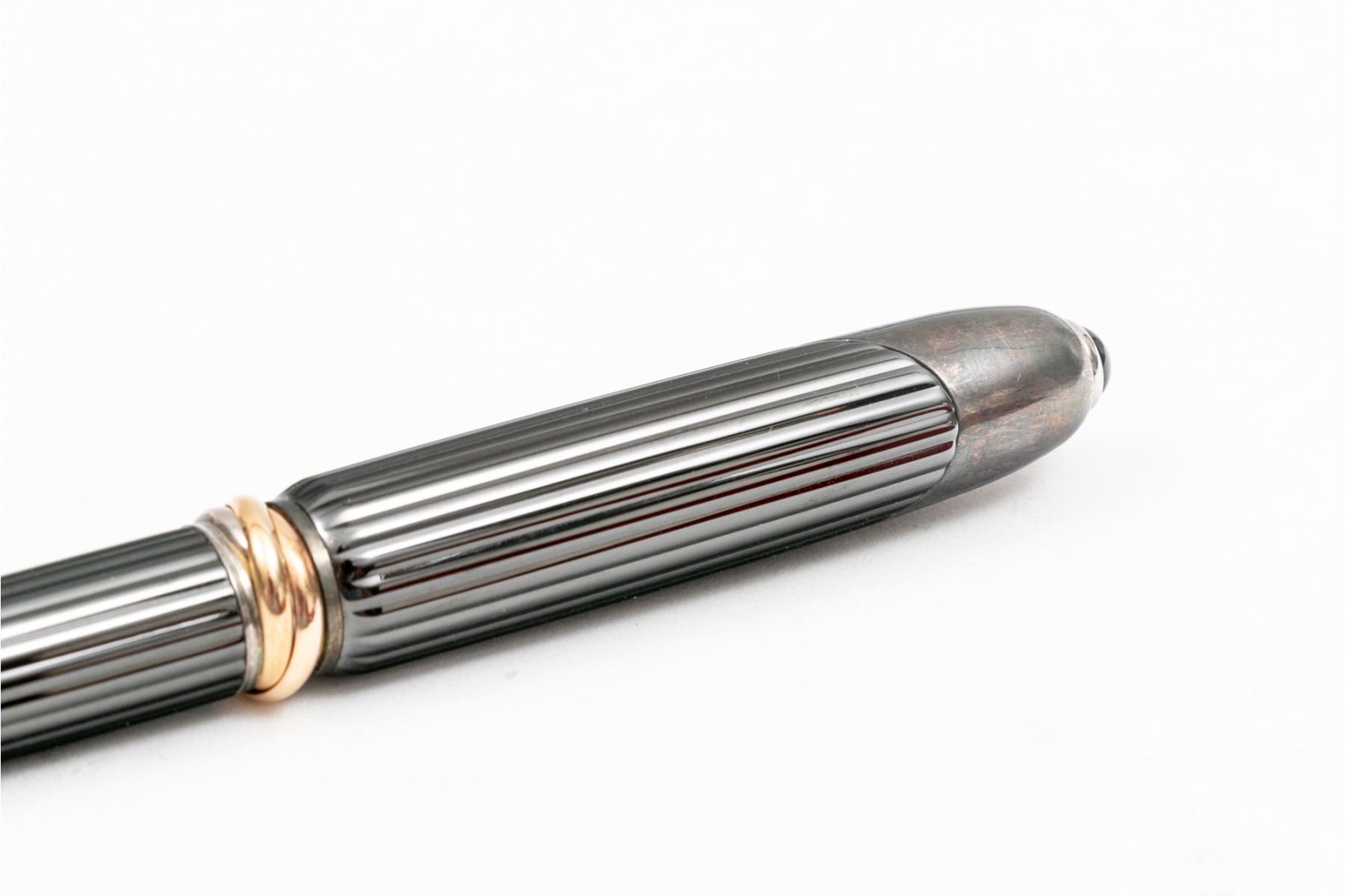 Cartier pen. This stunning pen is a Cartier Cougar de Trinity ballpoint, featuring a ribbed gunmetal color body with silver tone hardware. Accompanied by a service felt
