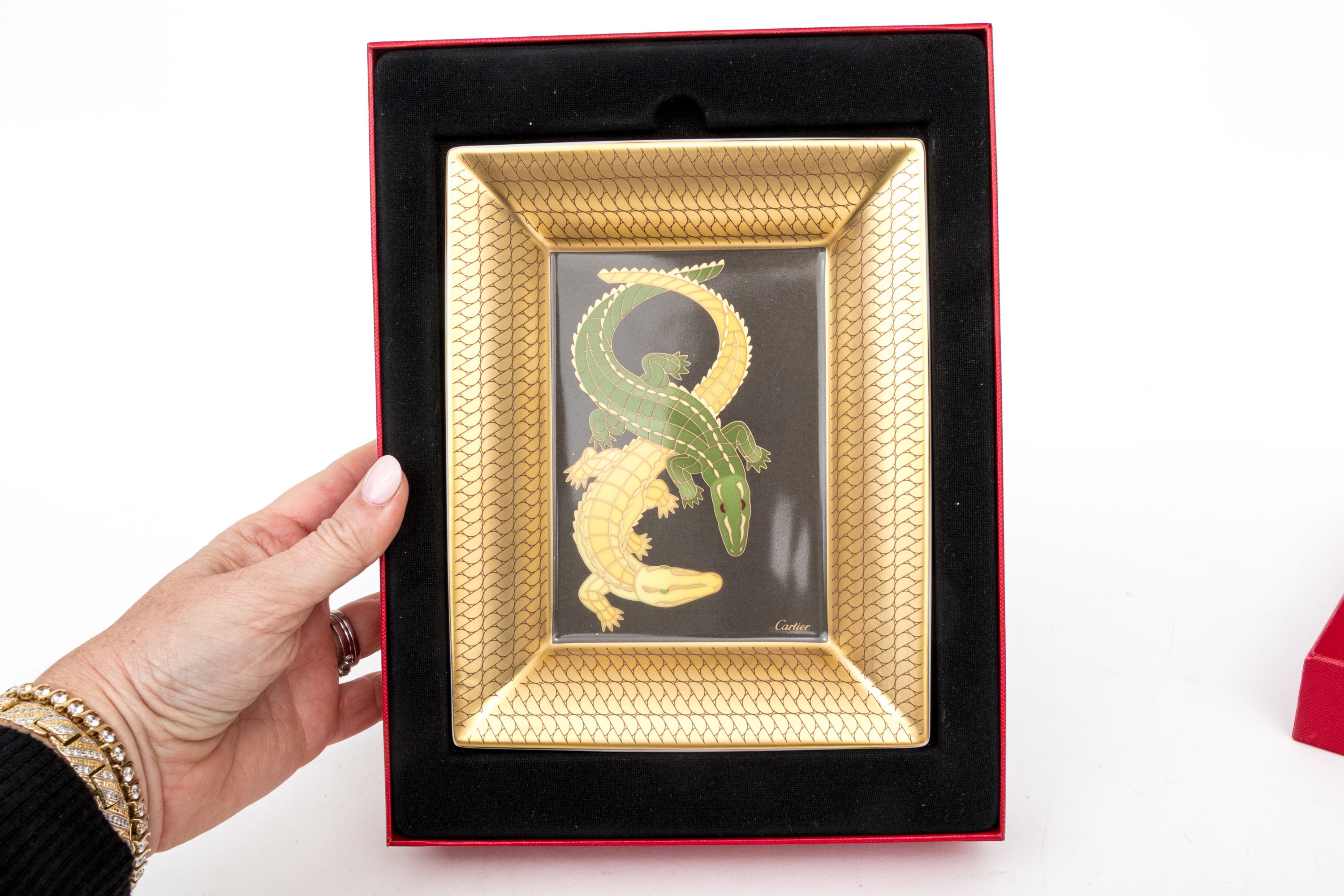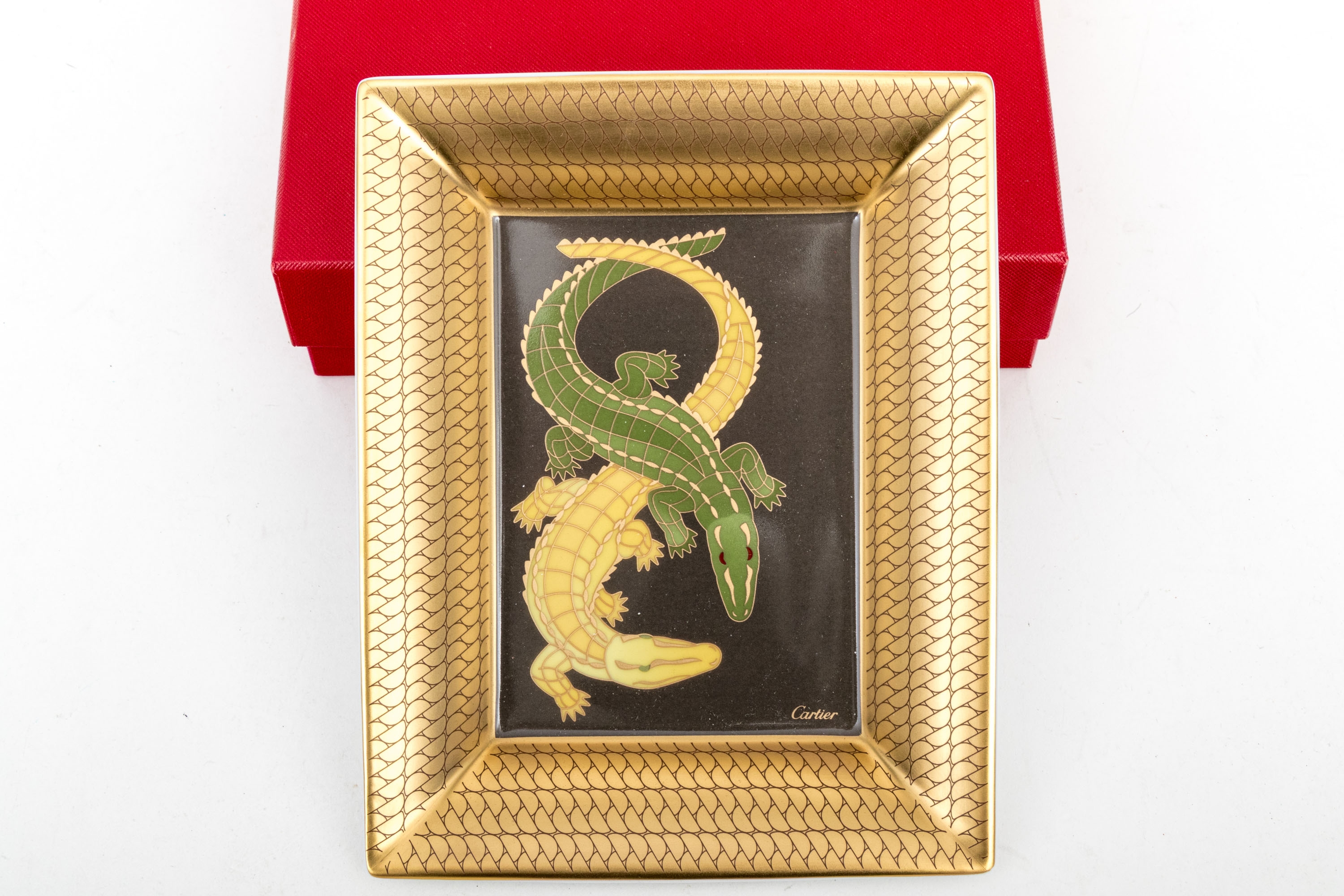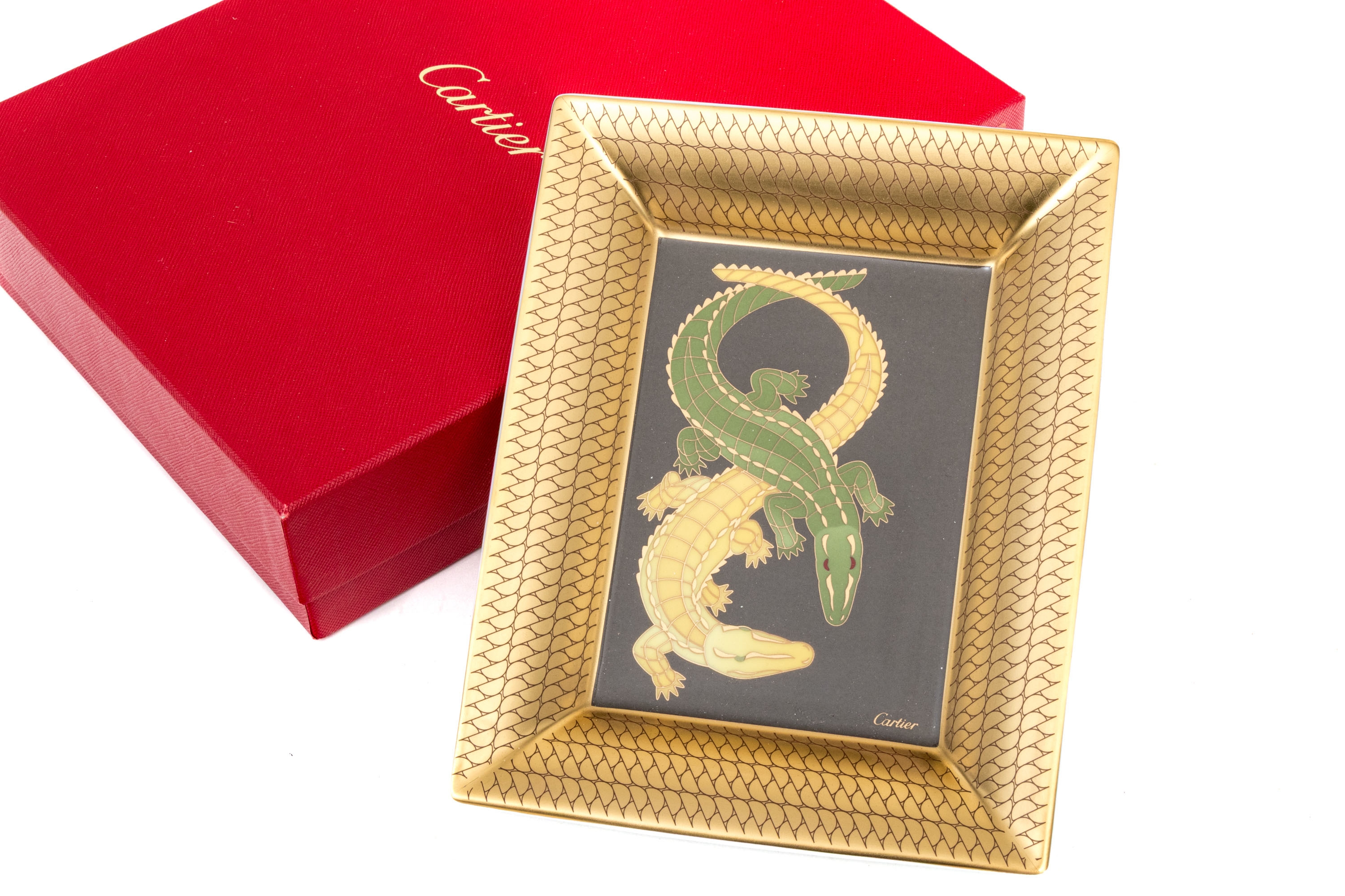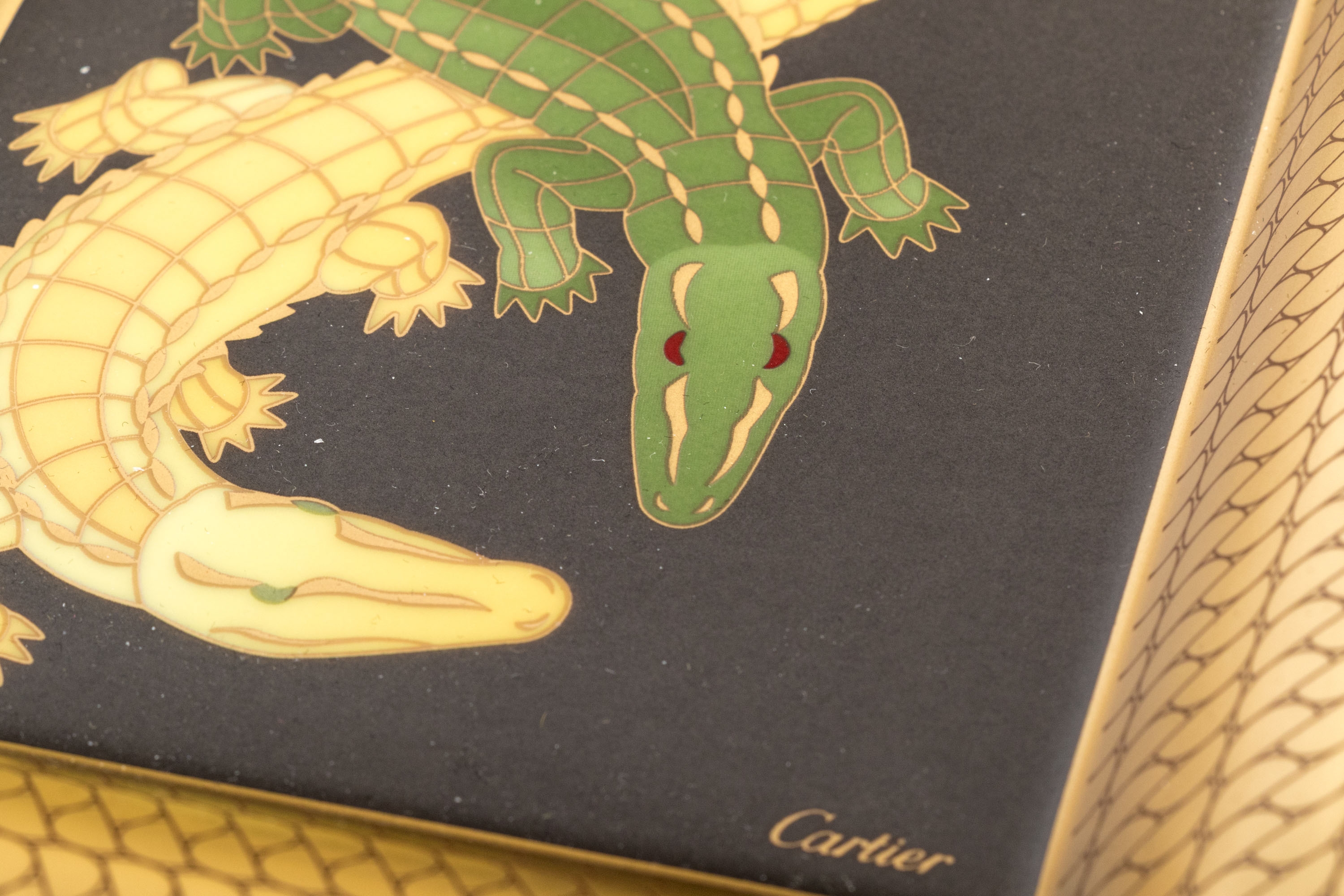 This gorgeous rectangular porcelain trinket tray was made in France for Cartier by Limoges, and features a yellow and green crocodile, intertwining, on a brown field and finished by a scaled motif border. Accompanied by the original fitted box.