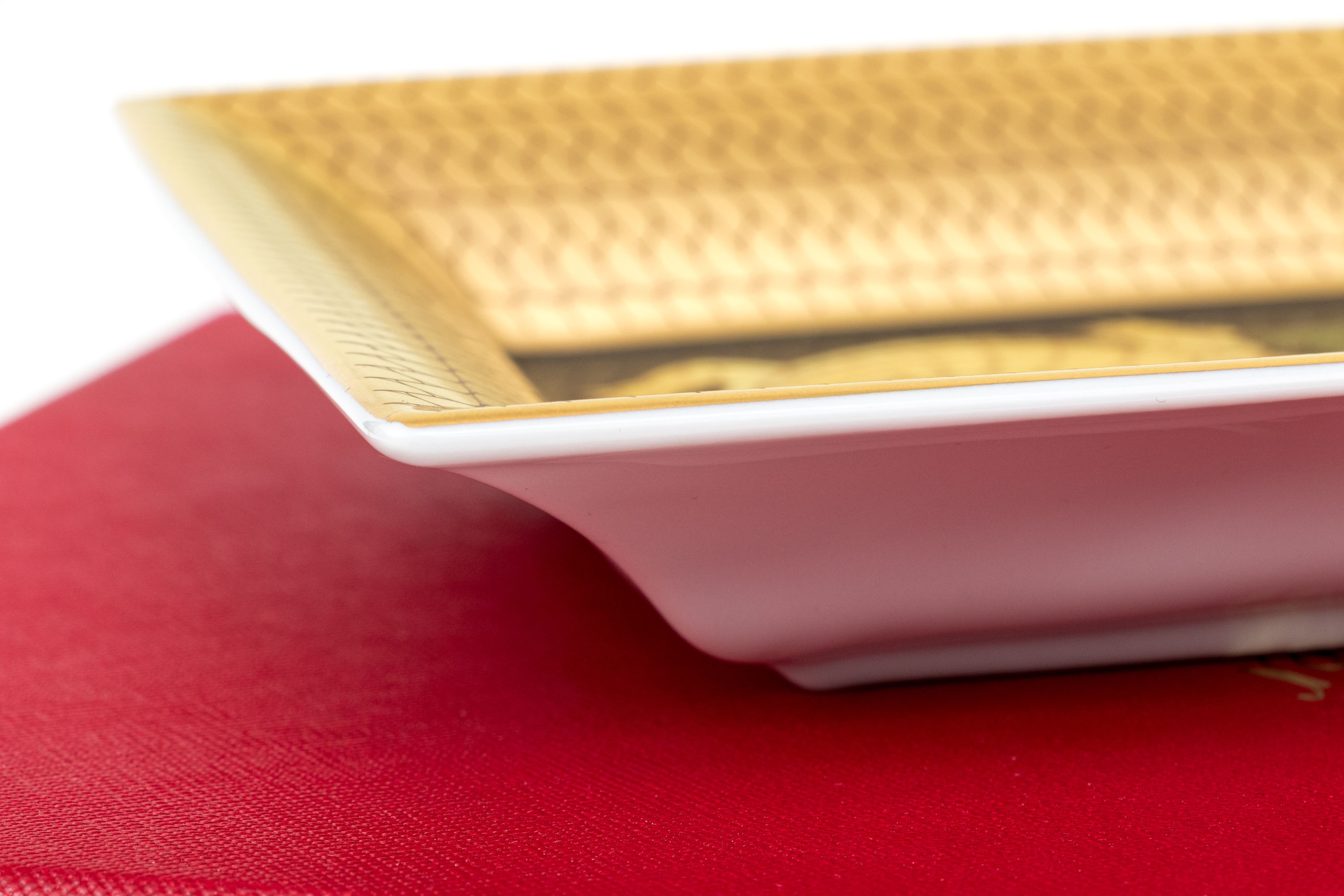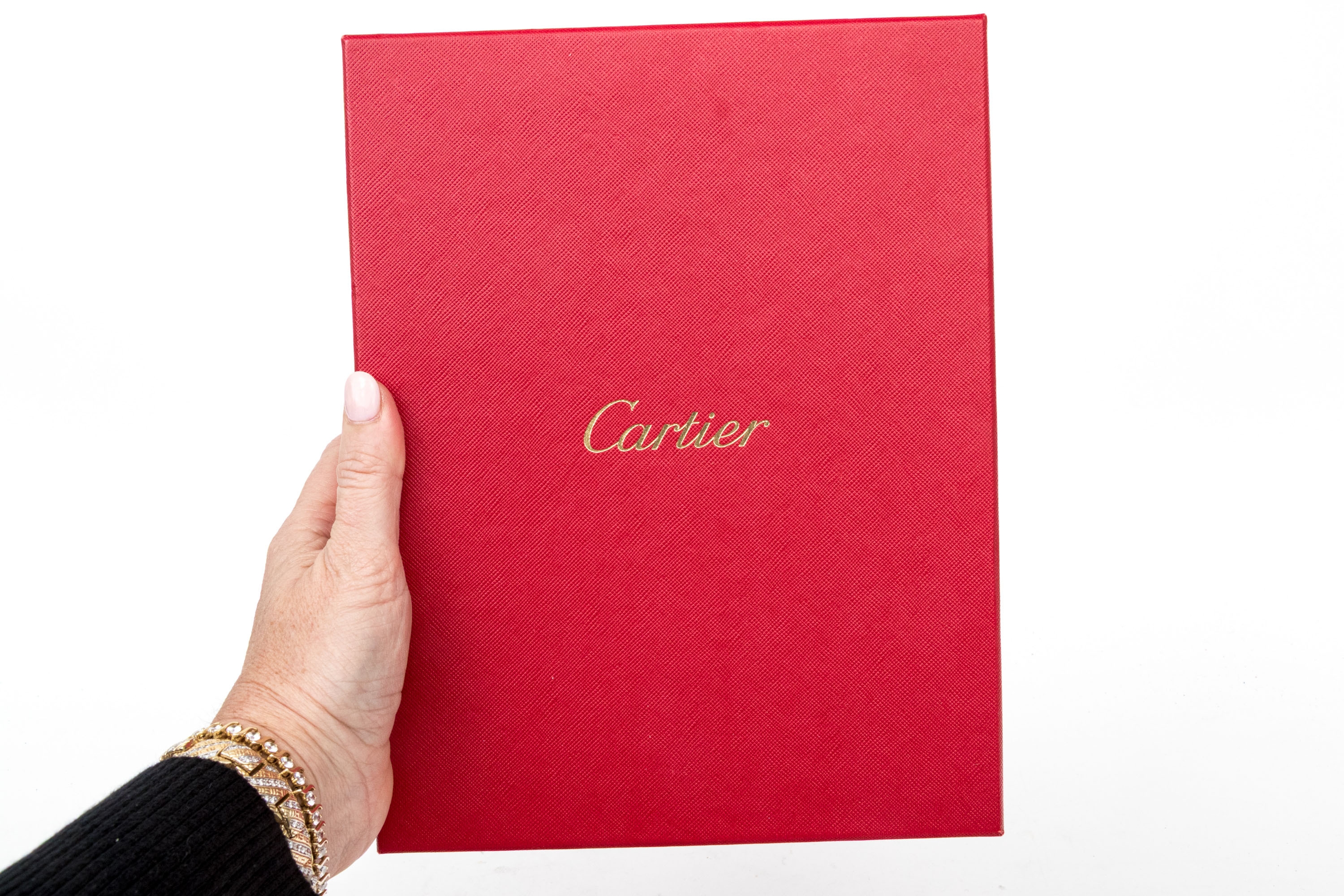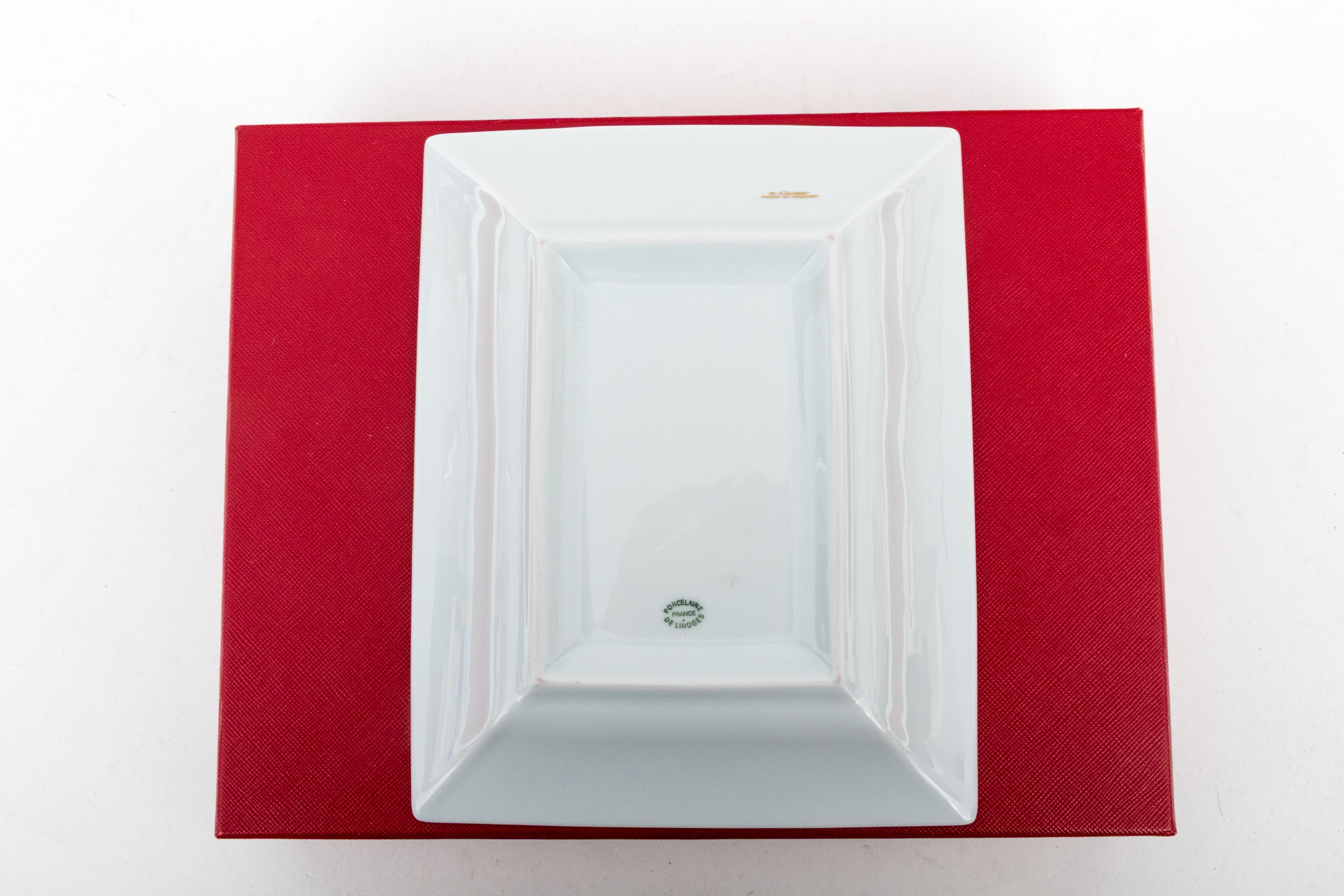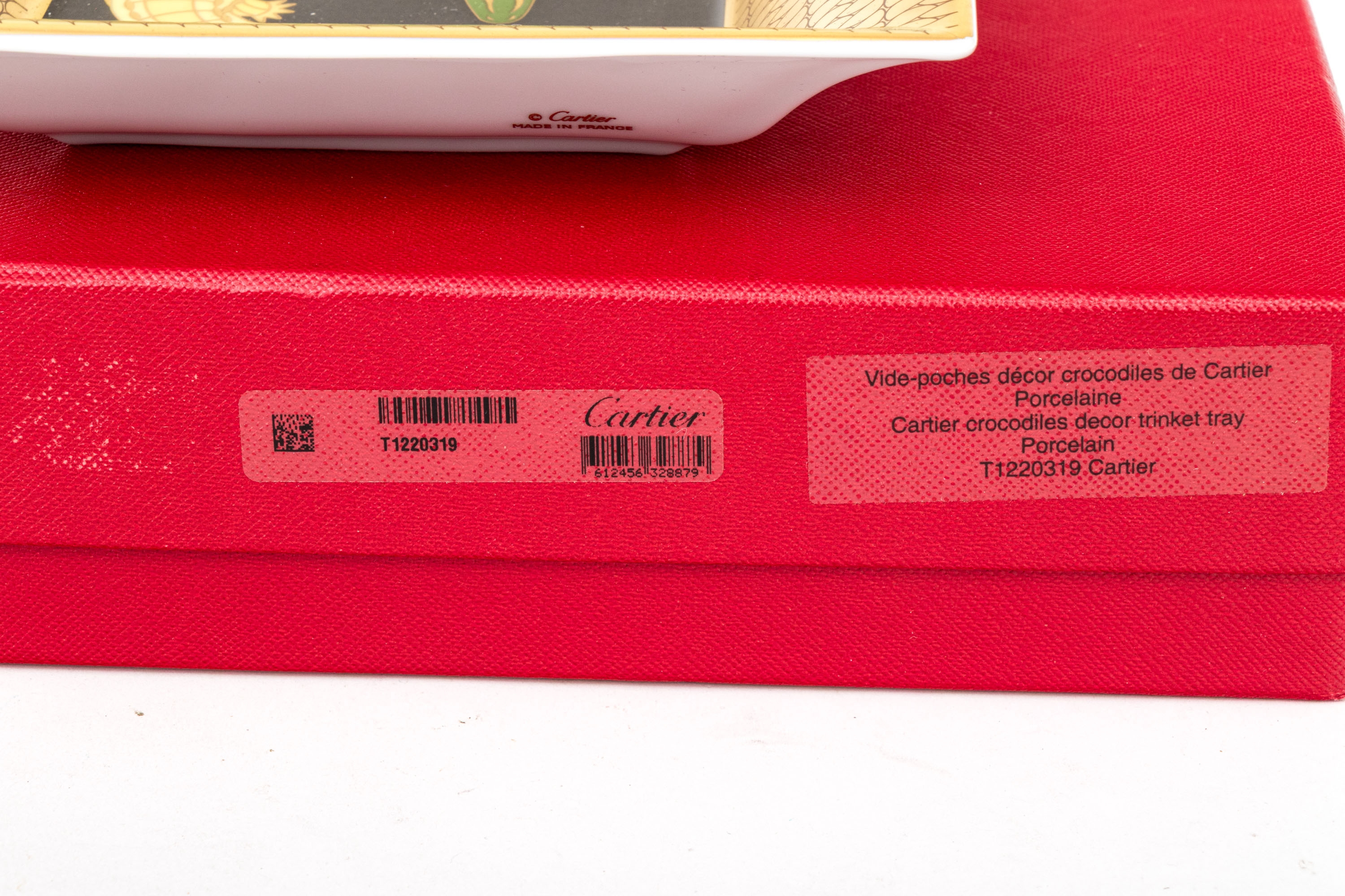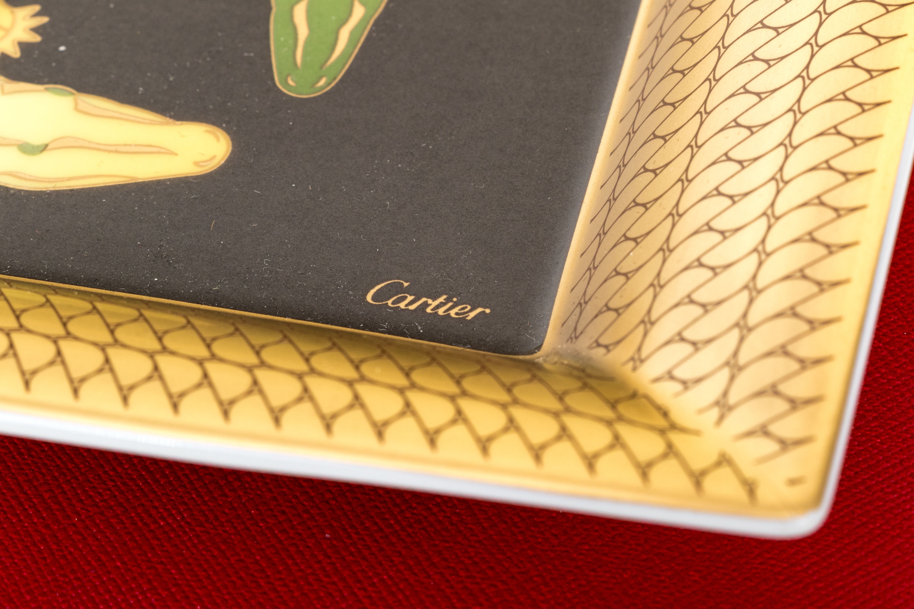 This gorgeous rectangular porcelain trinket tray was made in France for Cartier by Limoges, and features a yellow and green crocodile, intertwining, on a brown field and finished by a scaled motif border. Accompanied by the original fitted box.