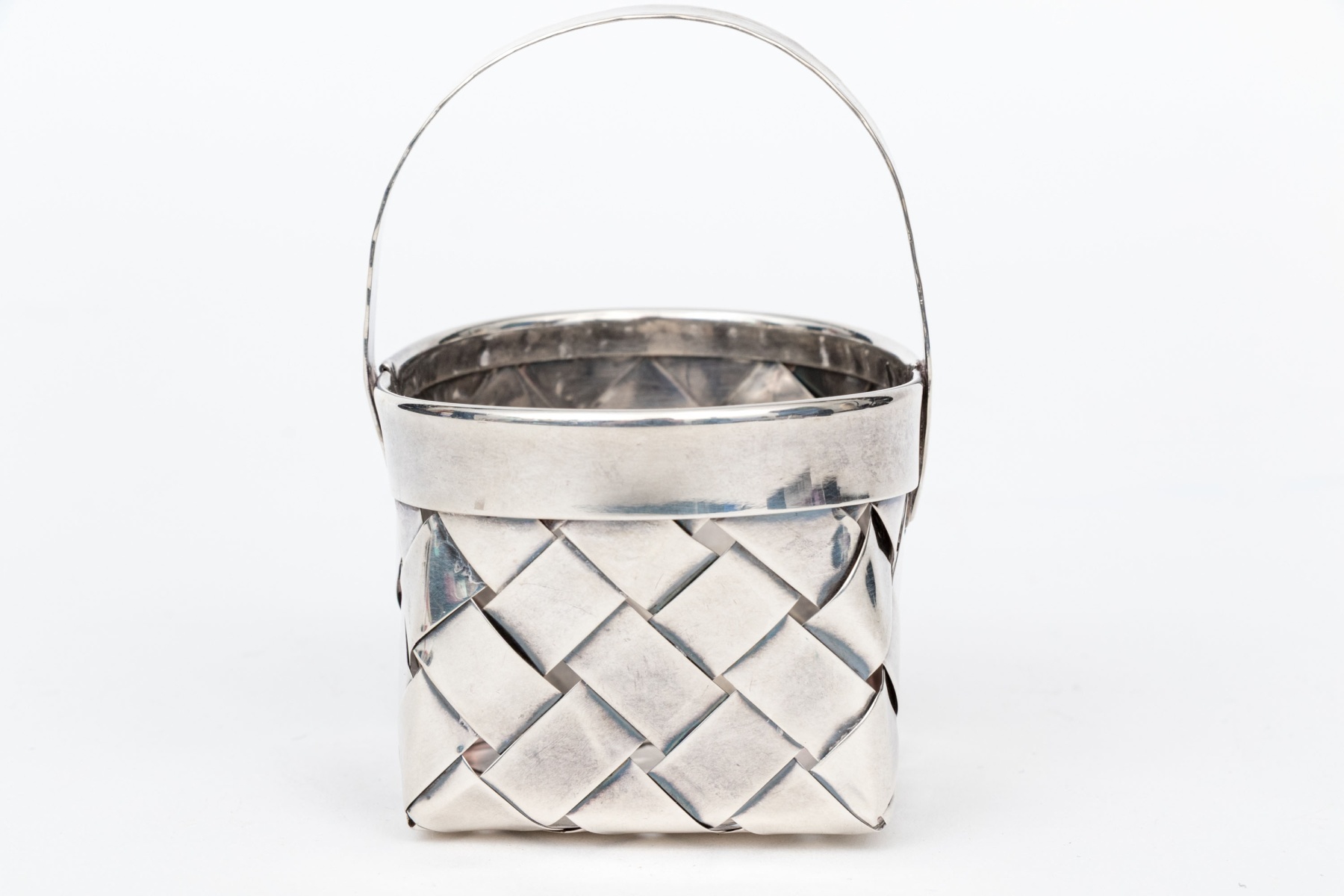 A sweet small sterling silver basket with a tall upright arching handle.