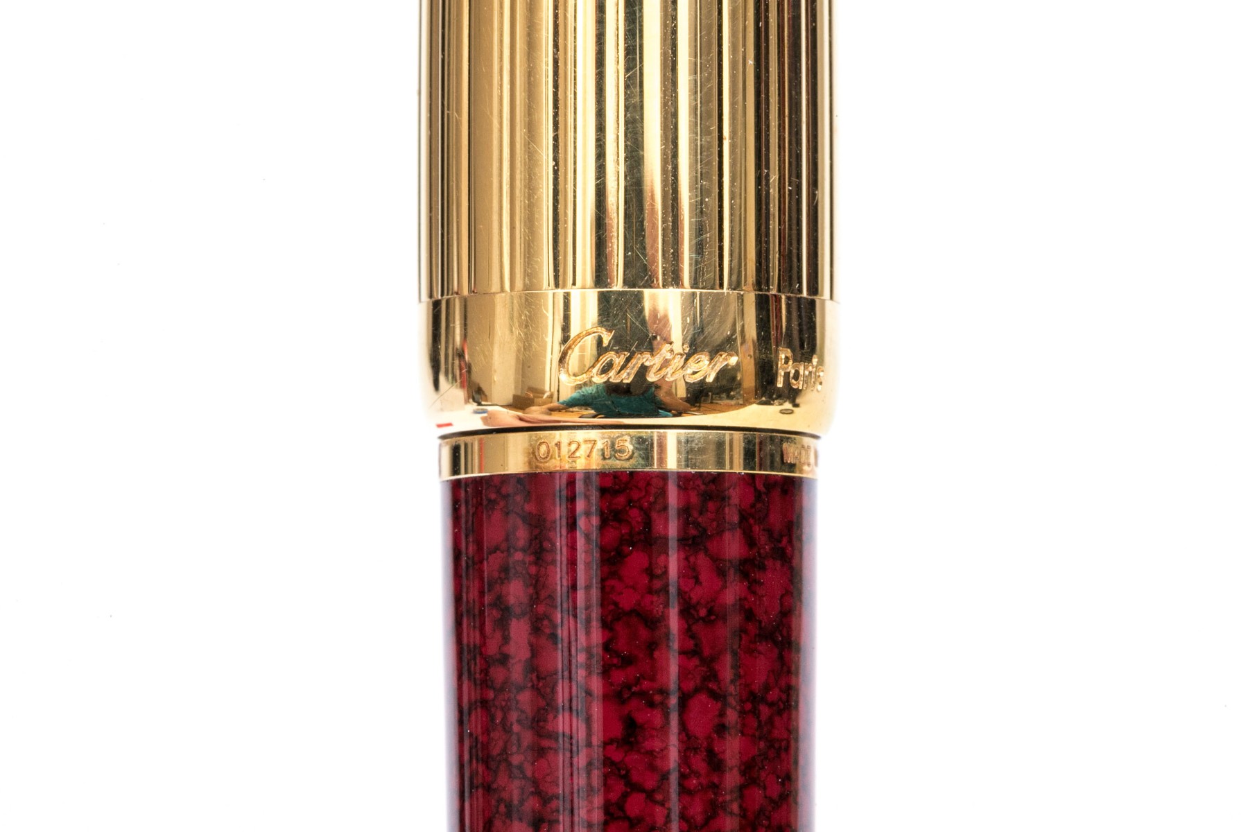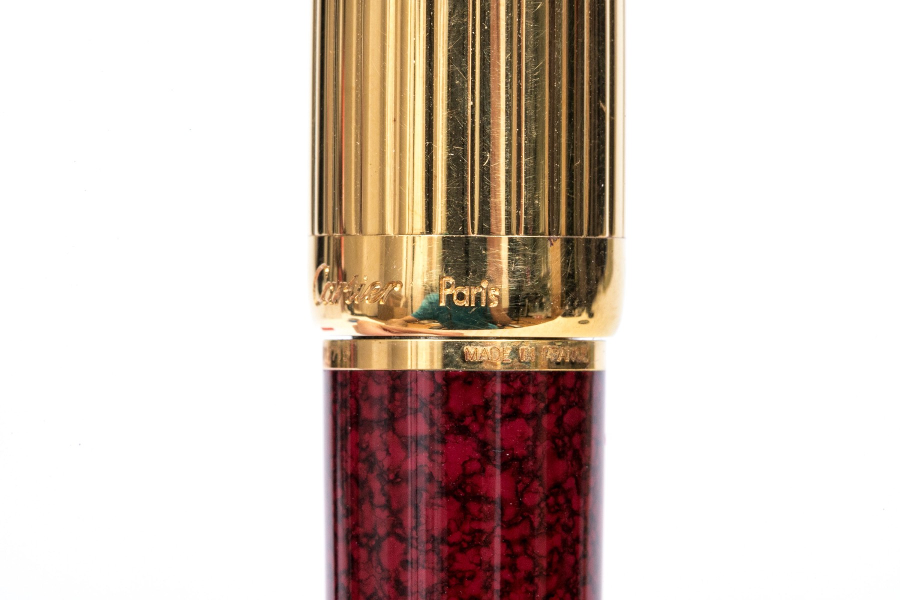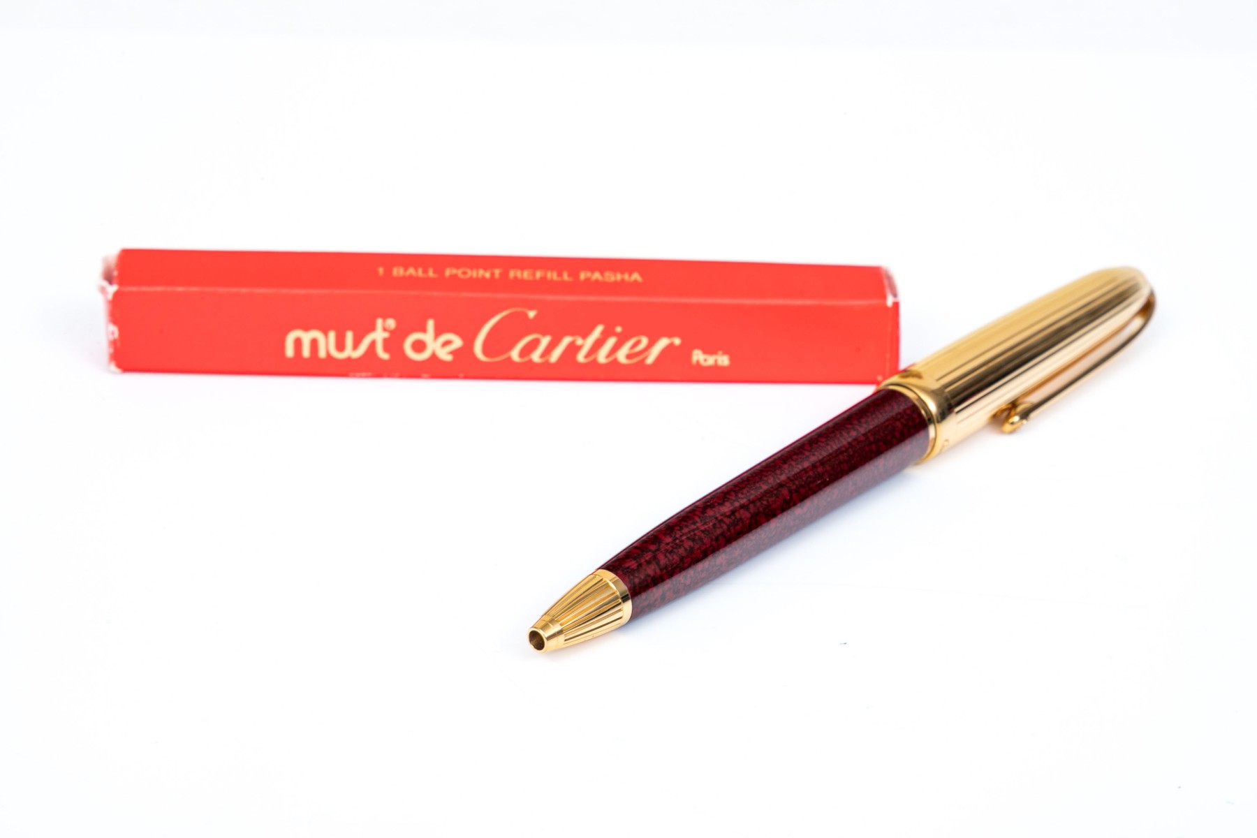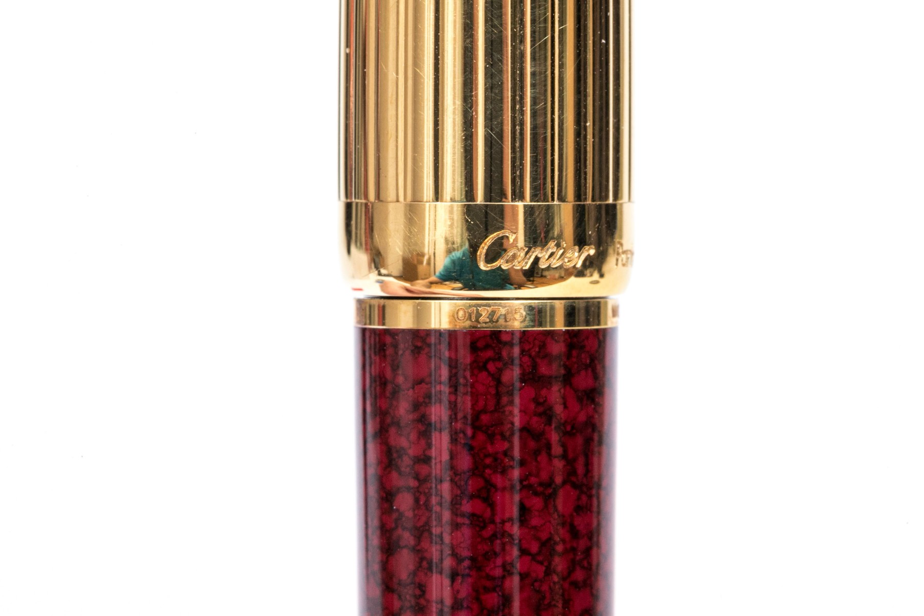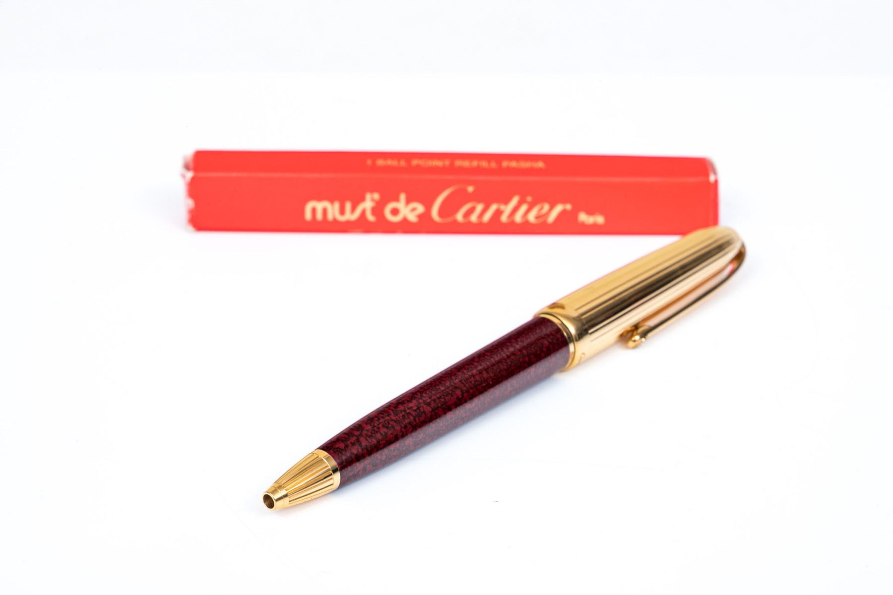 Cartier pen. This iconic pen is a Cartier ballpoint pen, featuring a marbled burgundy composite body with ribbed gold tone top and hardware. Accompanied by the original outer box