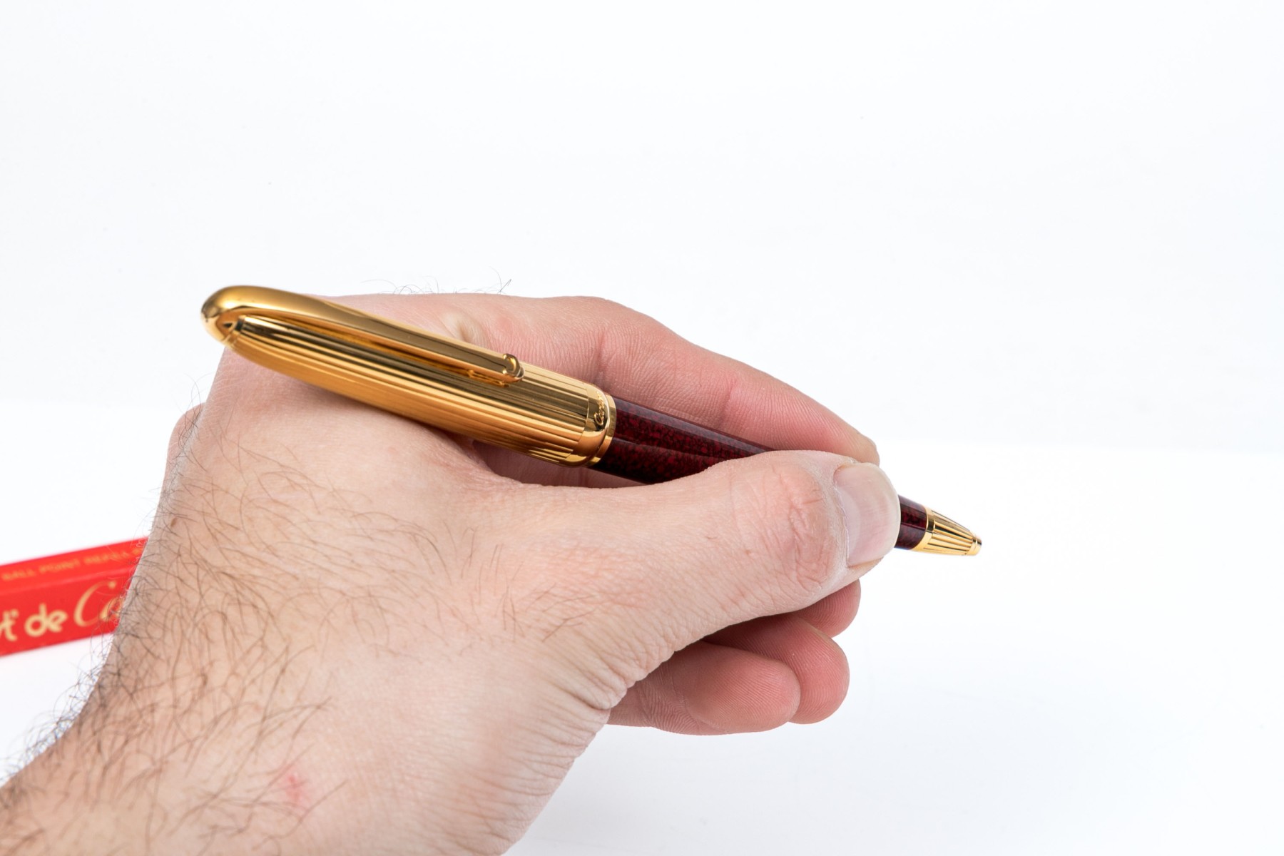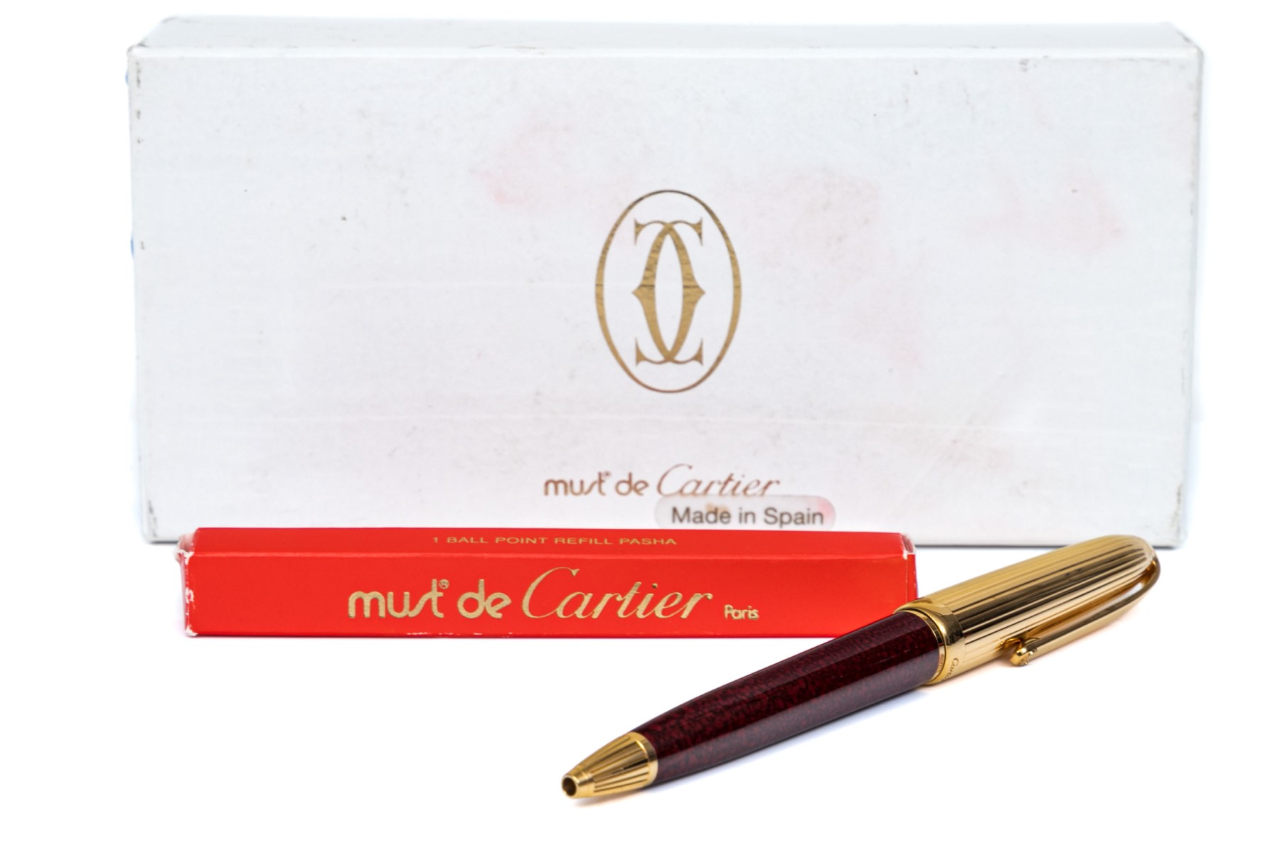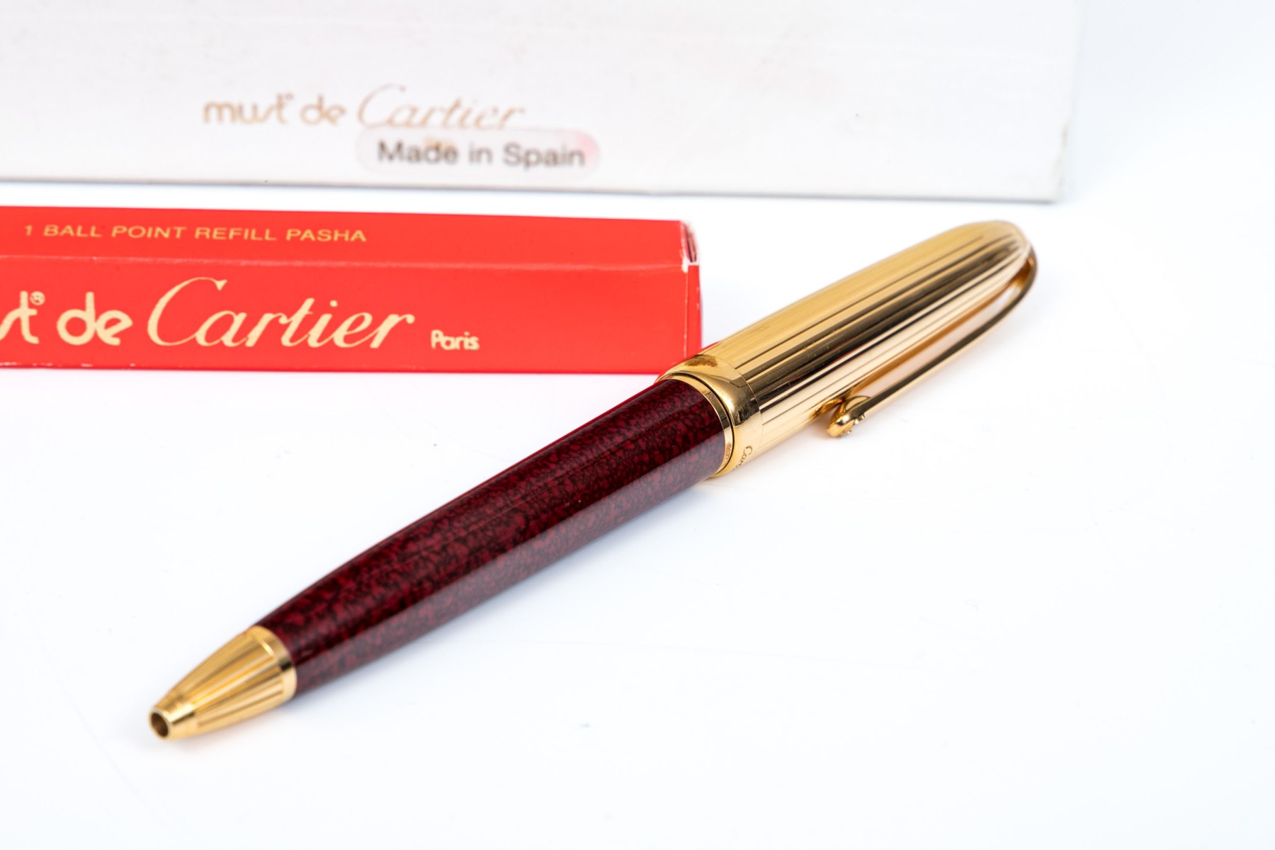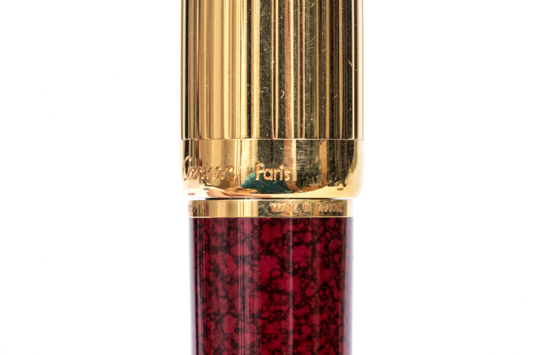 Cartier pen. This iconic pen is a Cartier ballpoint pen, featuring a marbled burgundy composite body with ribbed gold tone top and hardware. Accompanied by the original outer box