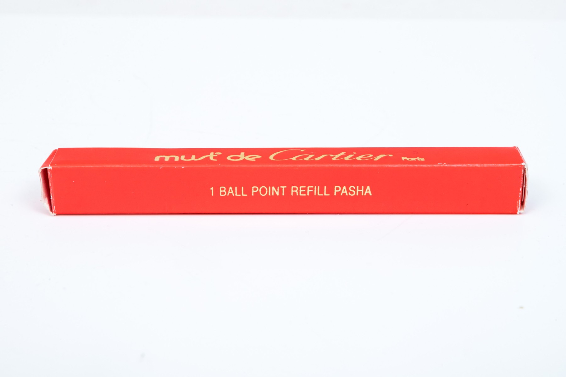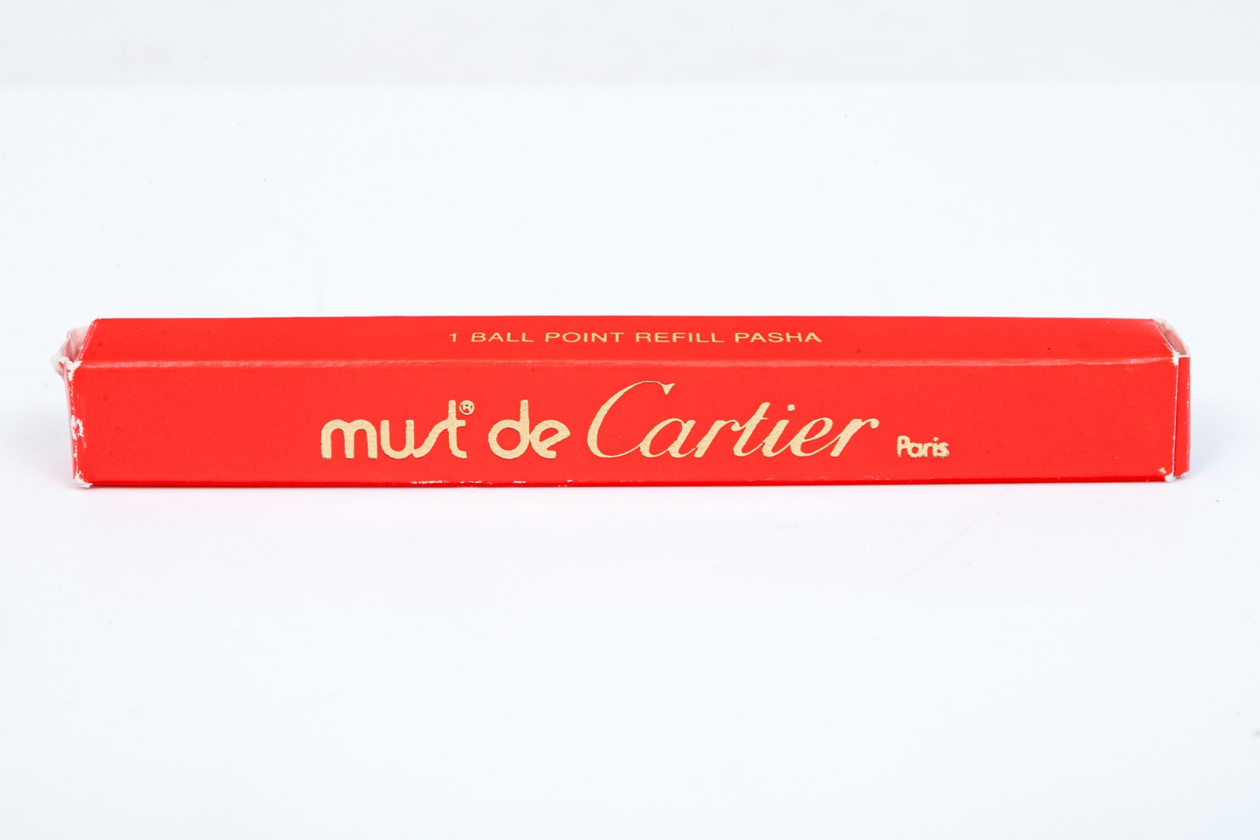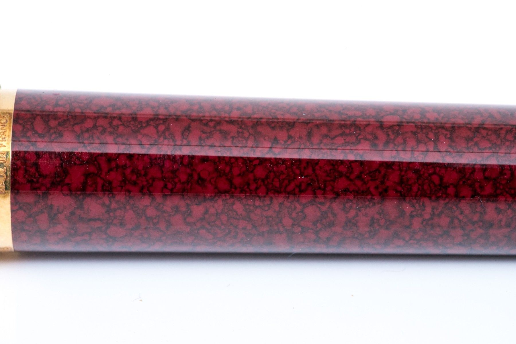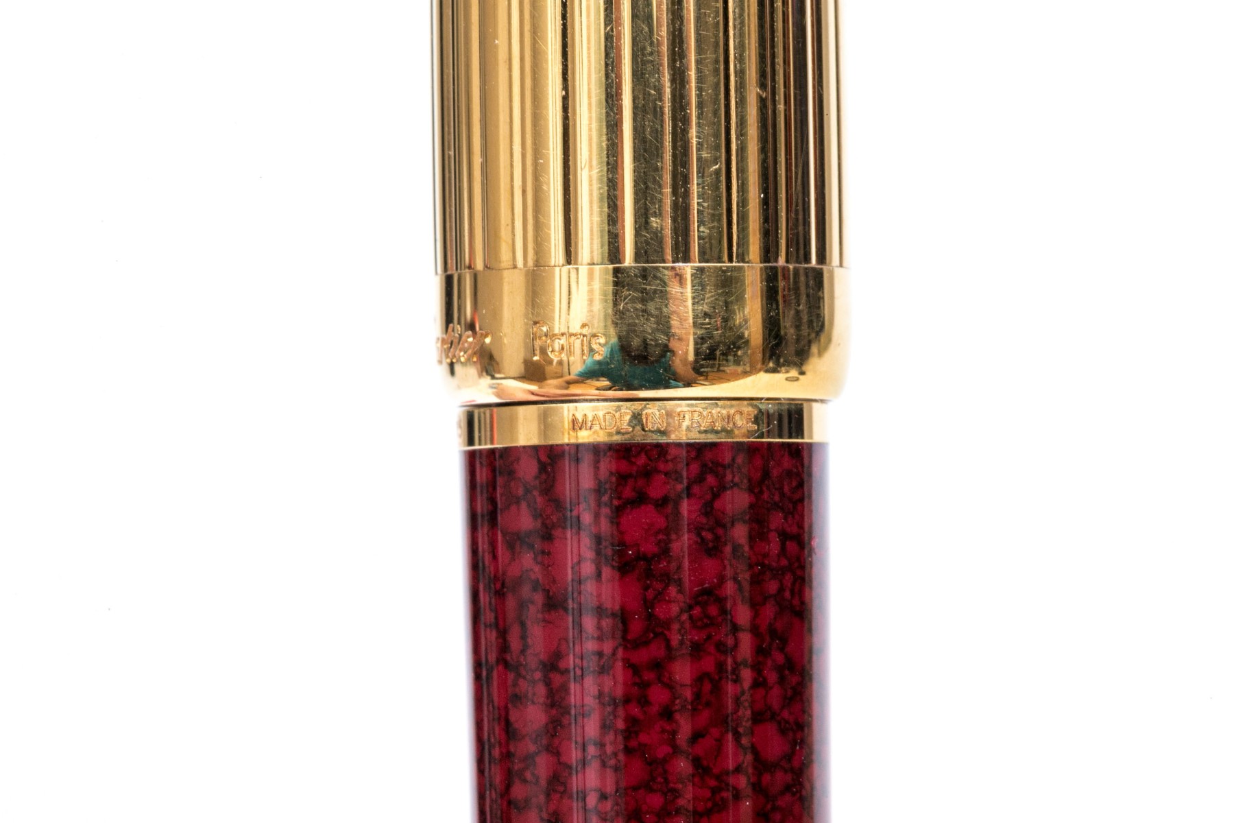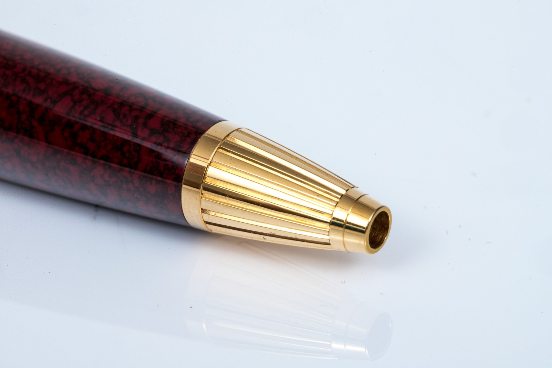 Cartier pen. This iconic pen is a Cartier ballpoint pen, featuring a marbled burgundy composite body with ribbed gold tone top and hardware. Accompanied by the original outer box