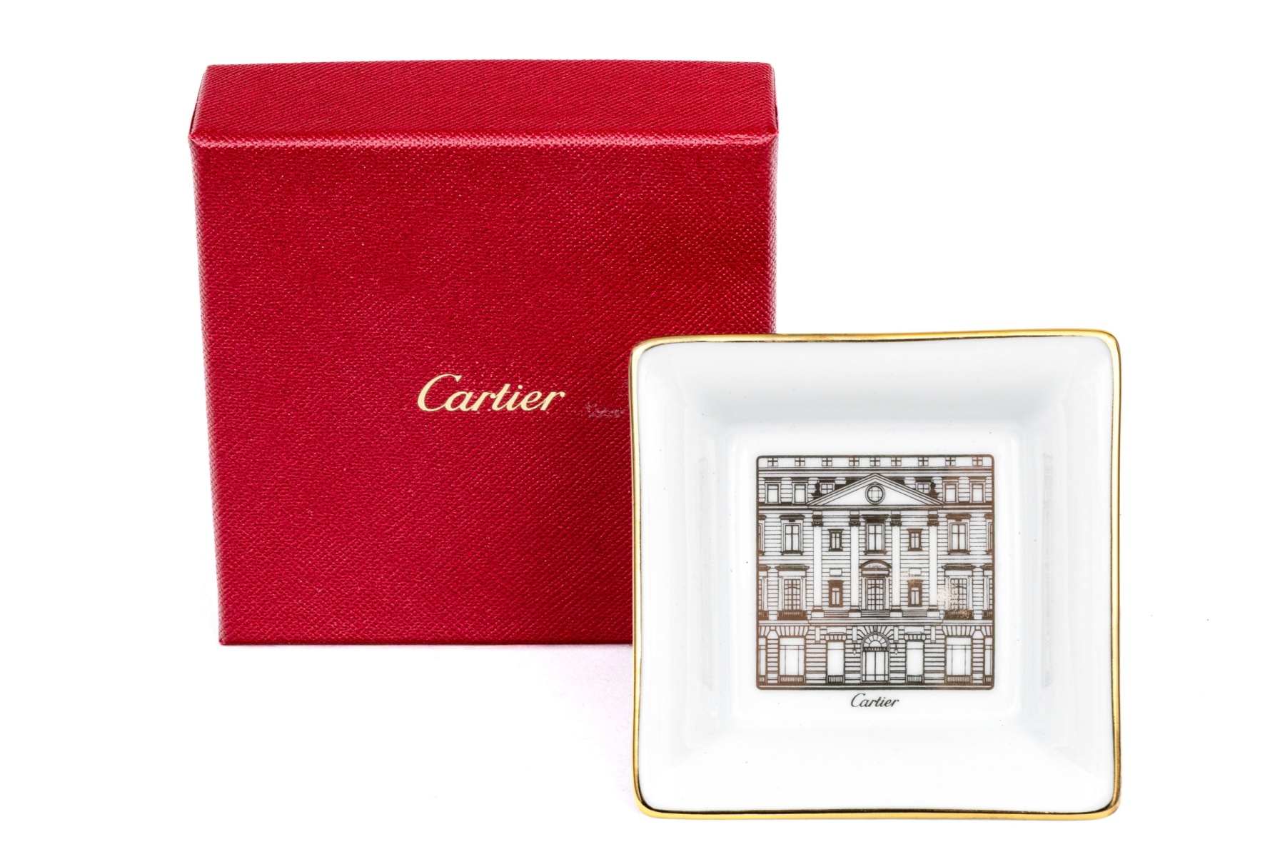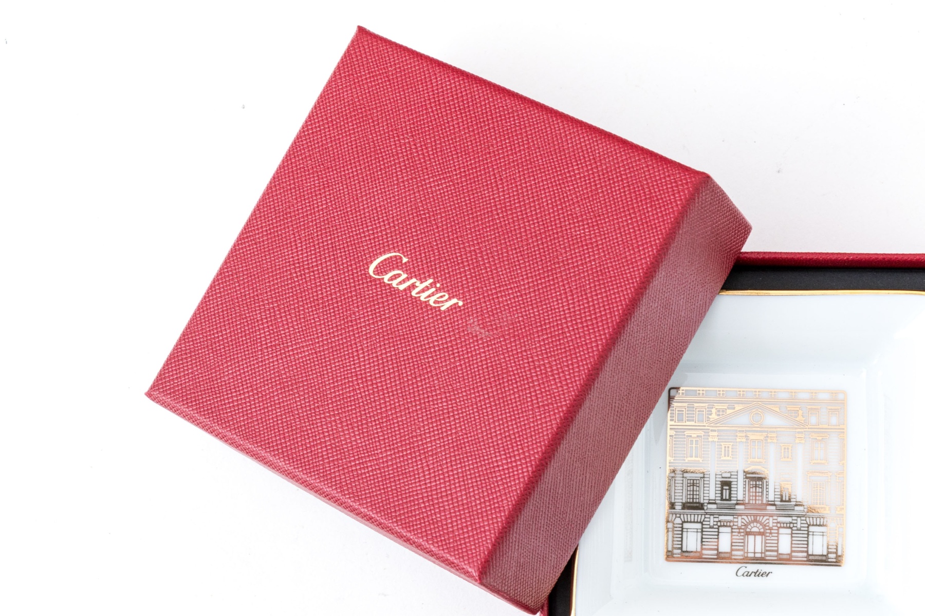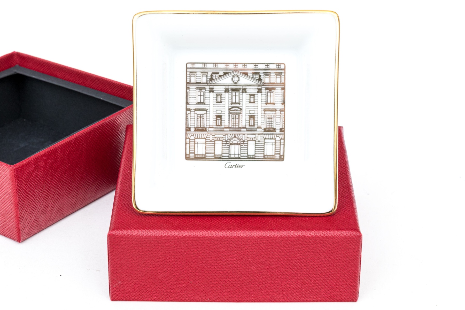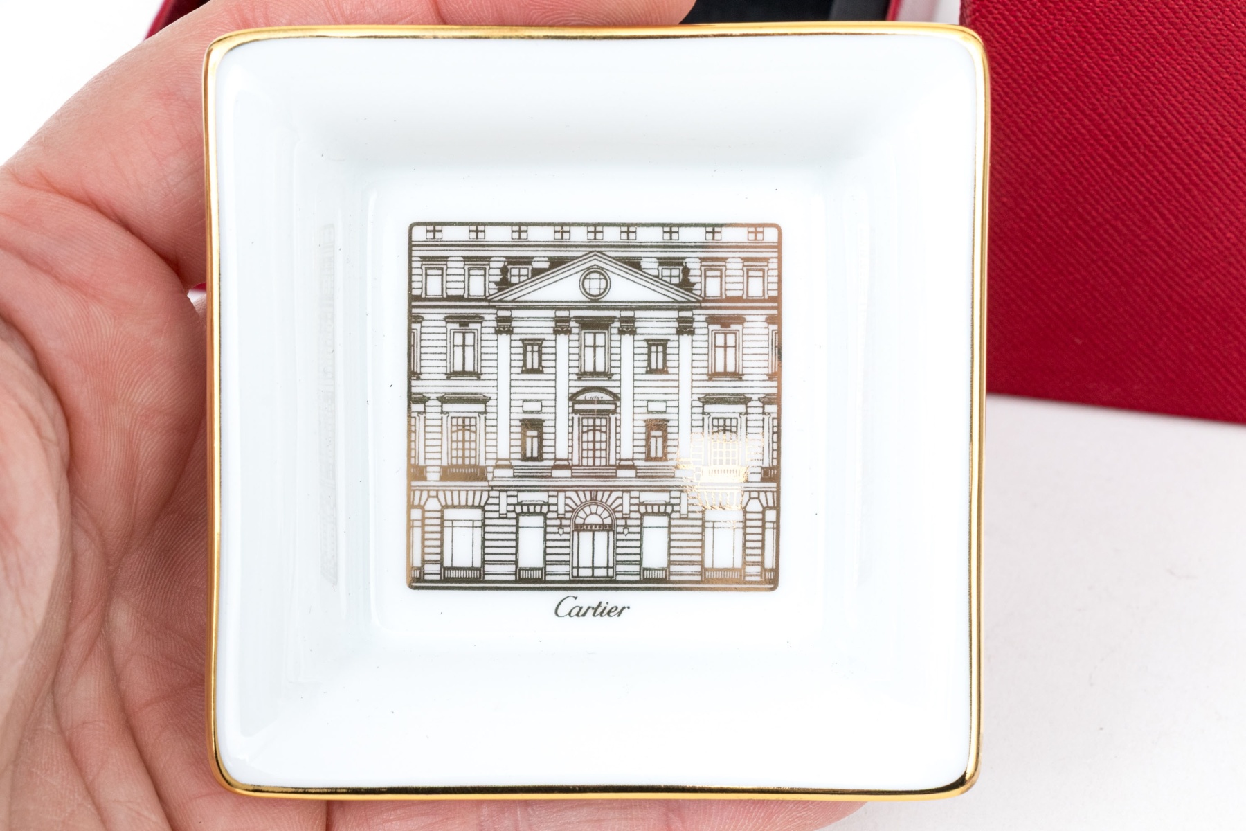 This charming mini square porcelain trinket tray was made in France, for Cartier and features a center depiction of the Fifth Avenue mansion, in New York City. Accompanied by the original fitted box.