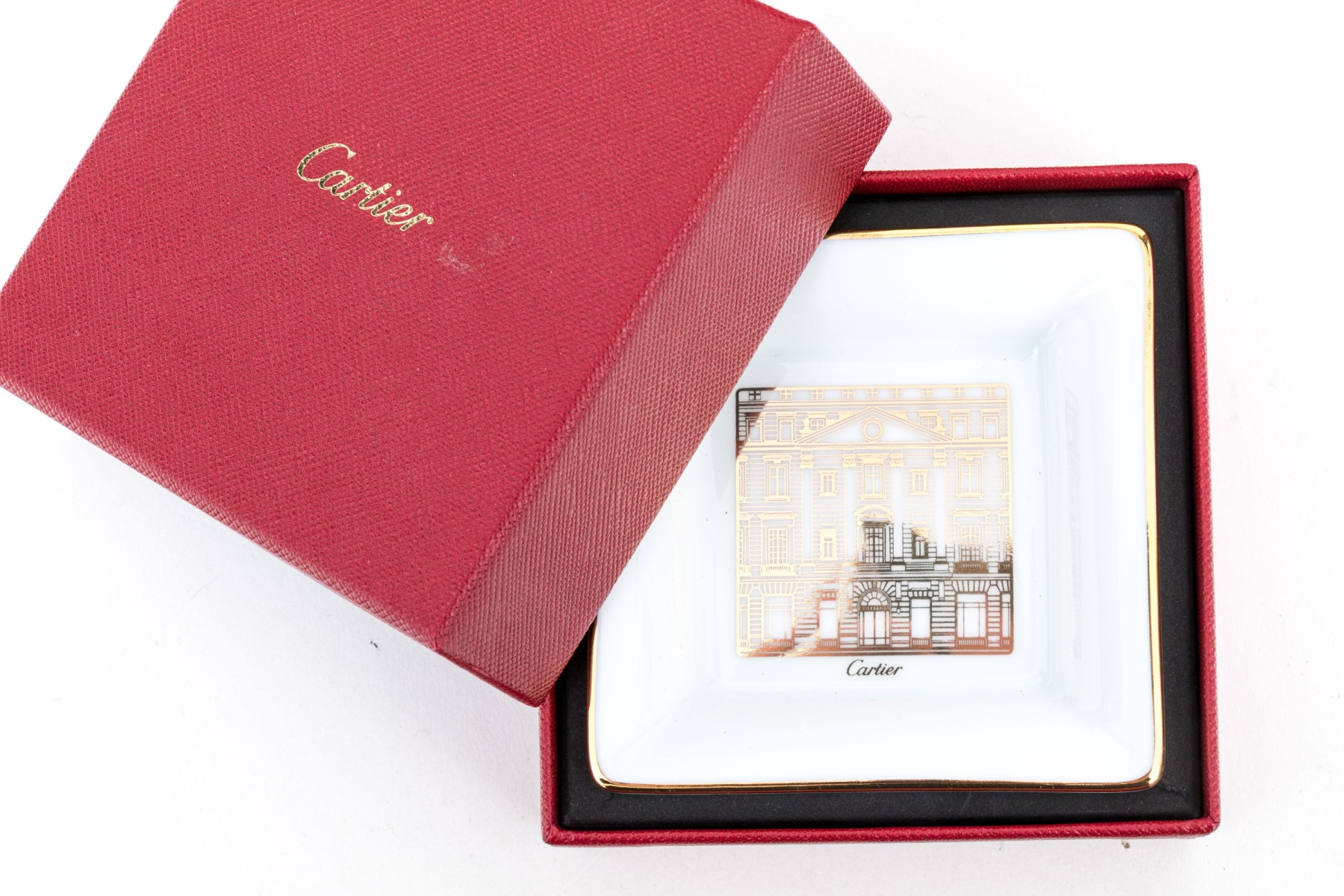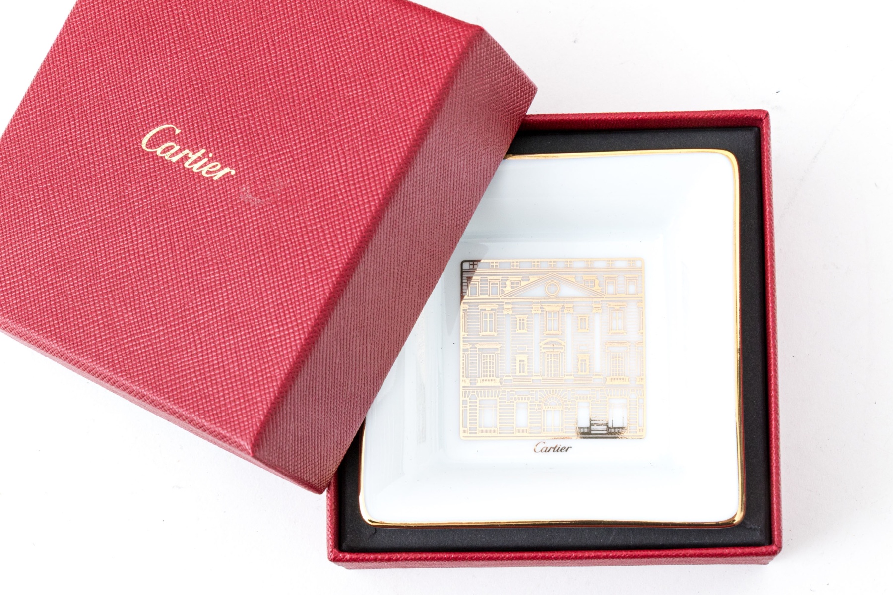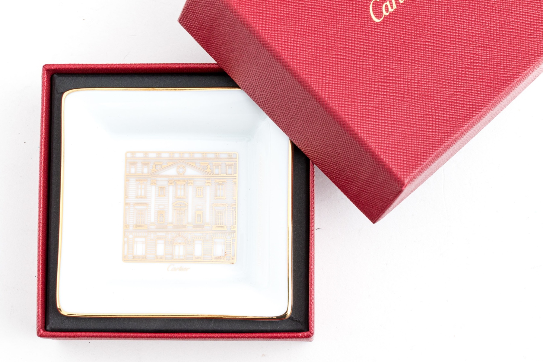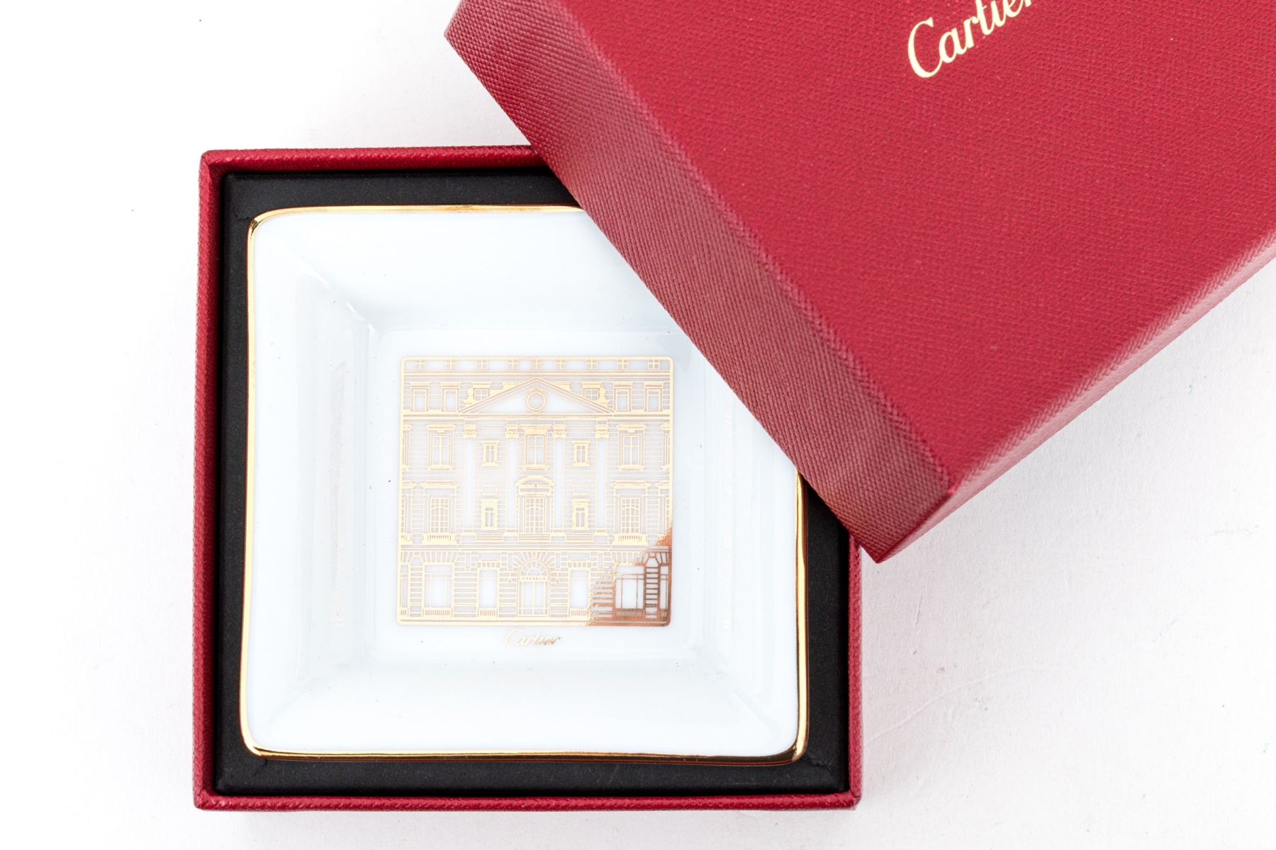 This charming mini square porcelain trinket tray was made in France, for Cartier and features a center depiction of the Fifth Avenue mansion, in New York City. Accompanied by the original fitted box.