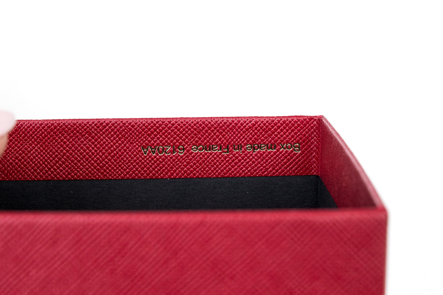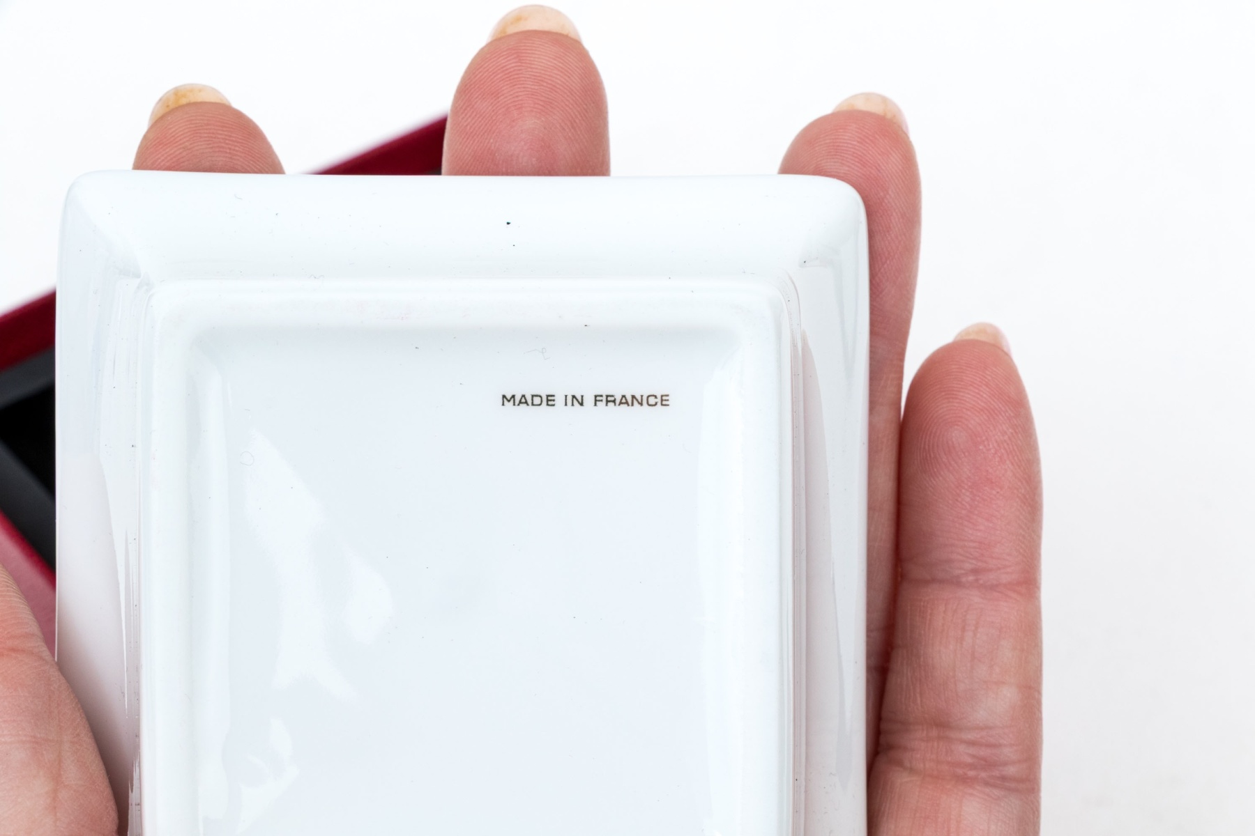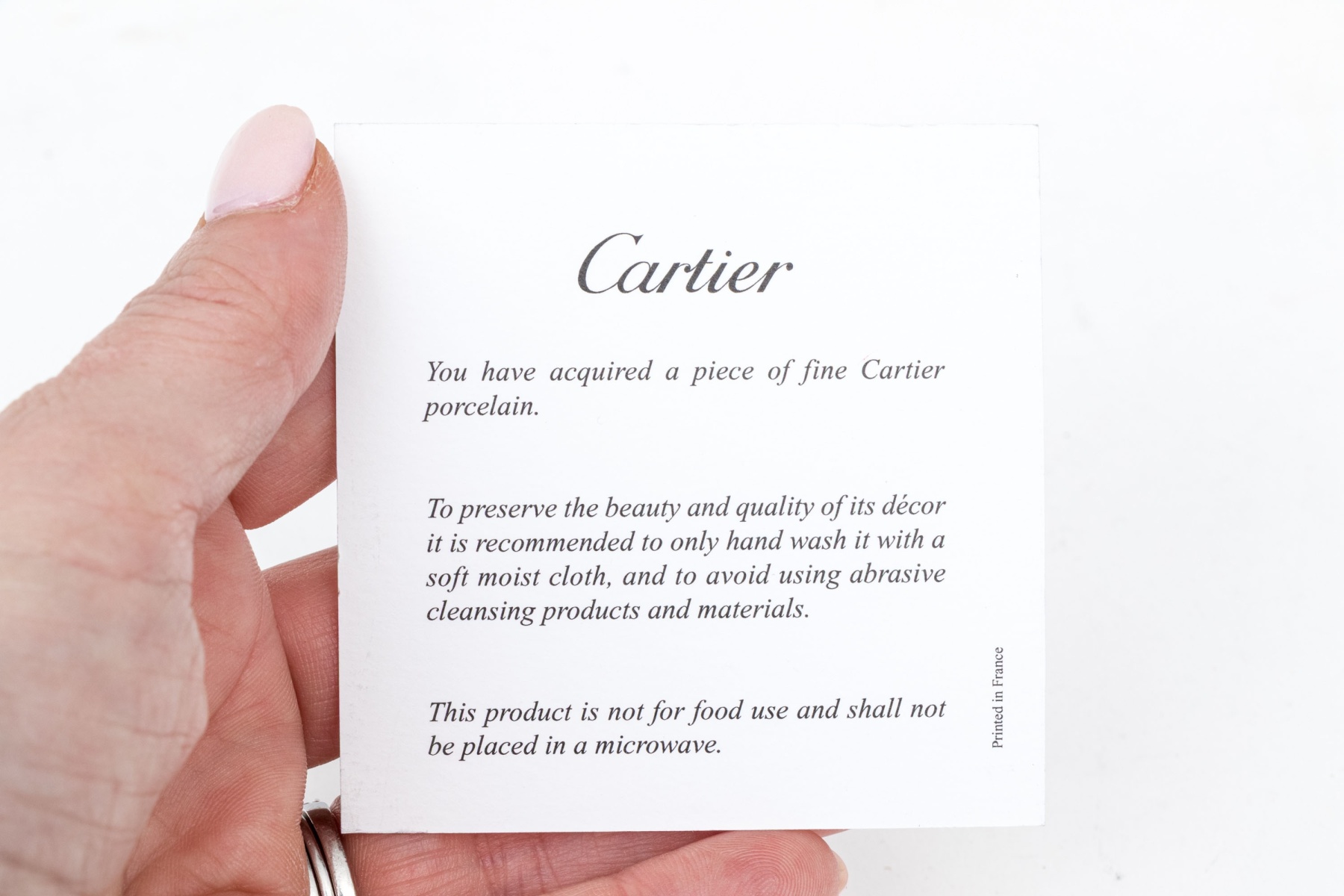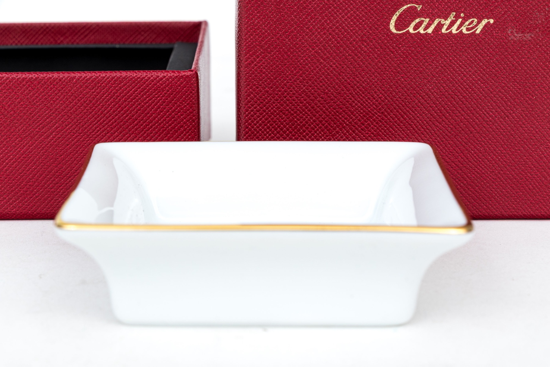 This charming mini square porcelain trinket tray was made in France, for Cartier and features a center depiction of the Fifth Avenue mansion, in New York City. Accompanied by the original fitted box.
