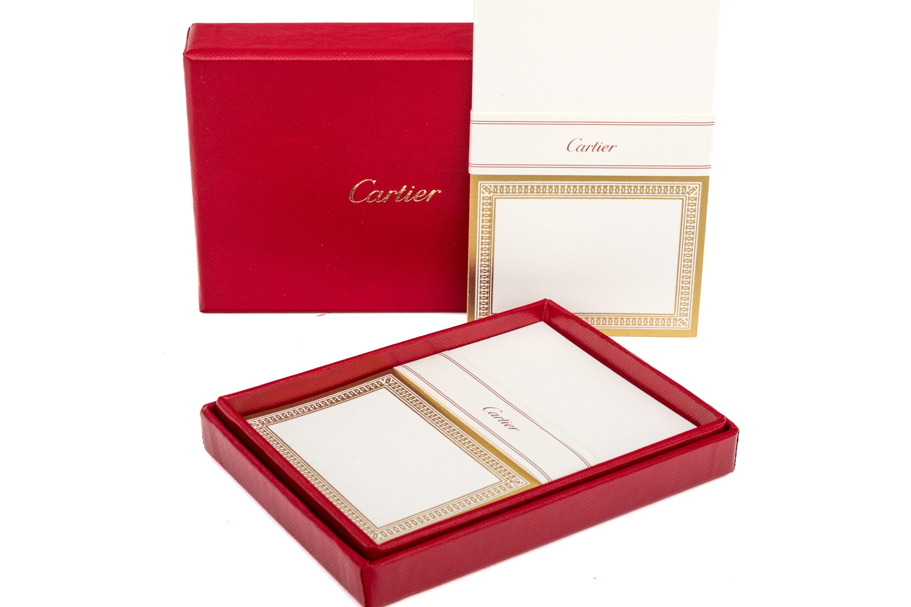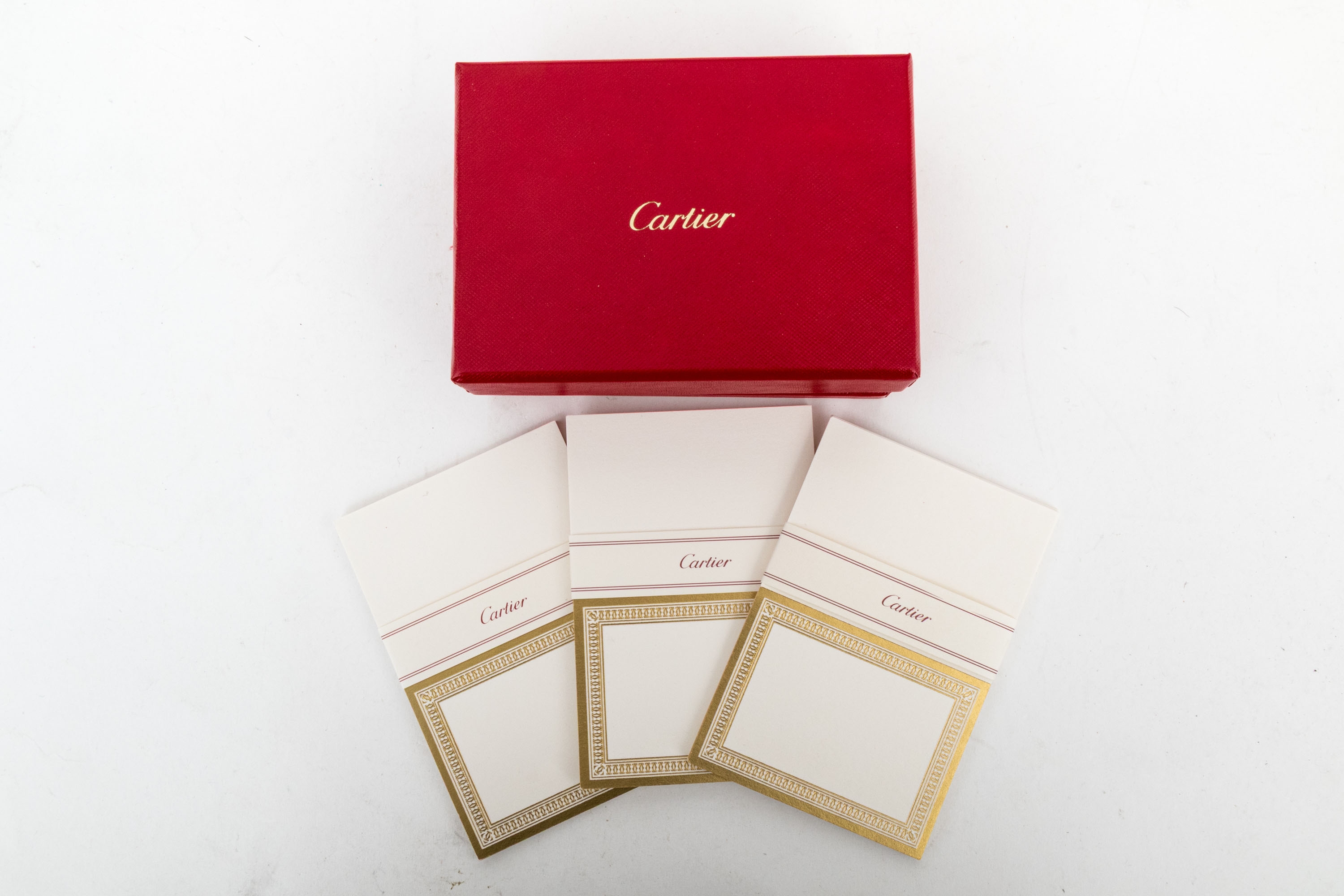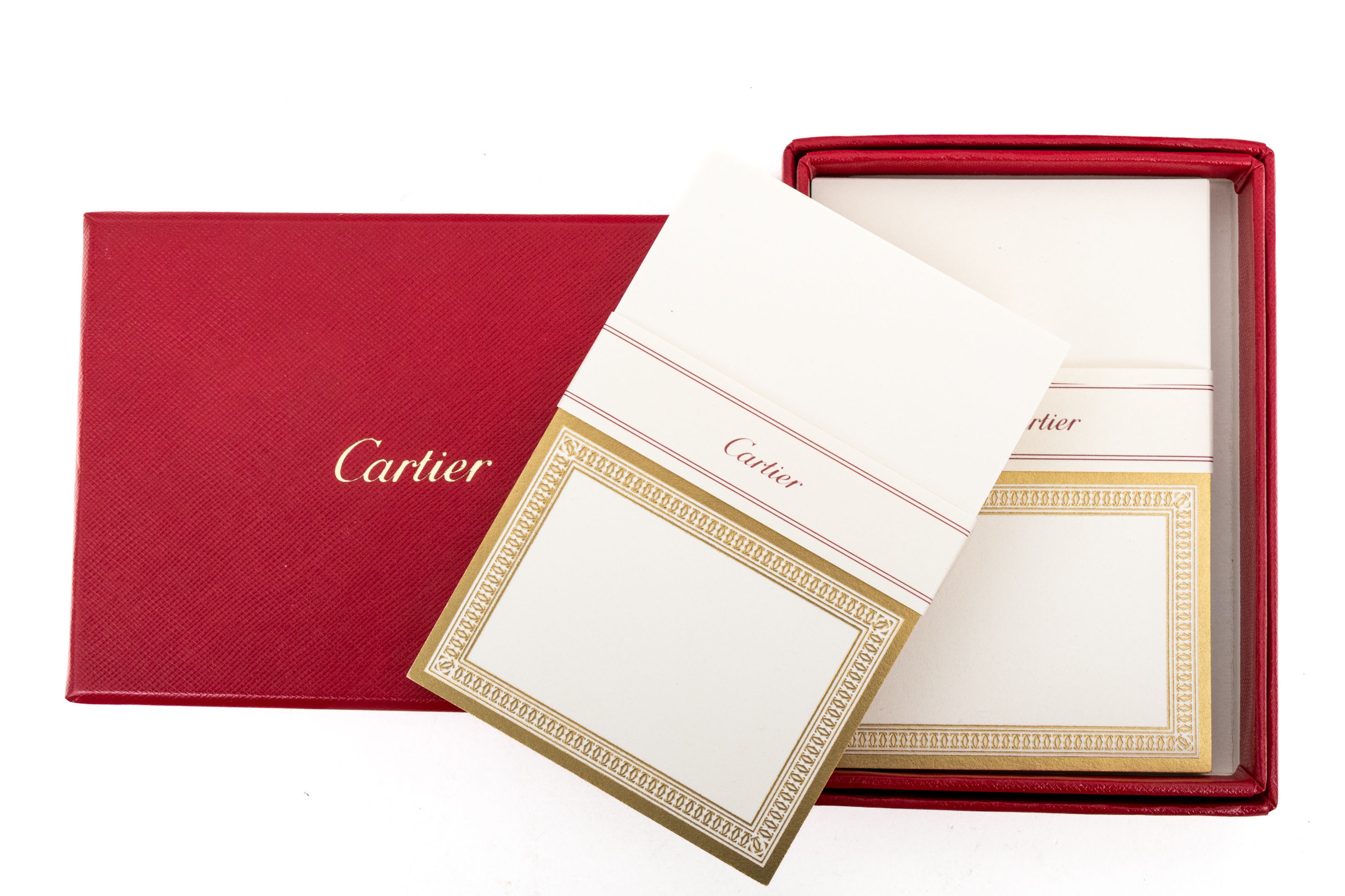 This set contains one complete box of twenty, and one partial box of nine of folded small note cards by Cartier, boxed. These elegant cards feature a gold toned double Cartier "C" border and can be used for note cards or thank you cards. Accompanied by nine corresponding envelopes.