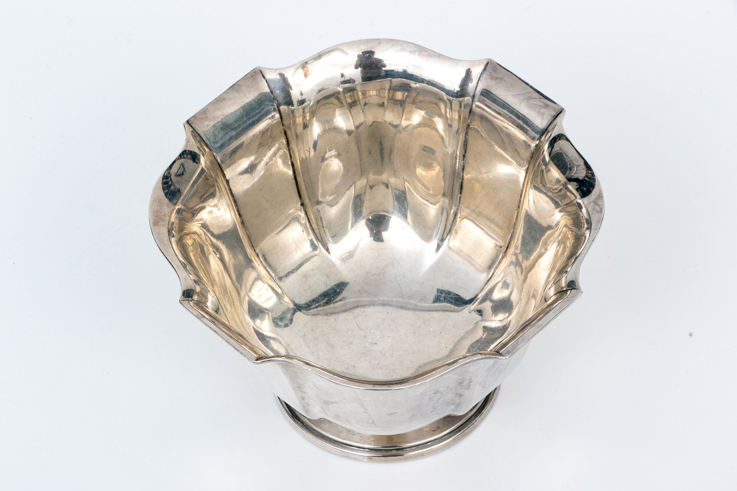 The footed bowl has a shaped bowl with four raised bands with rounded corners.