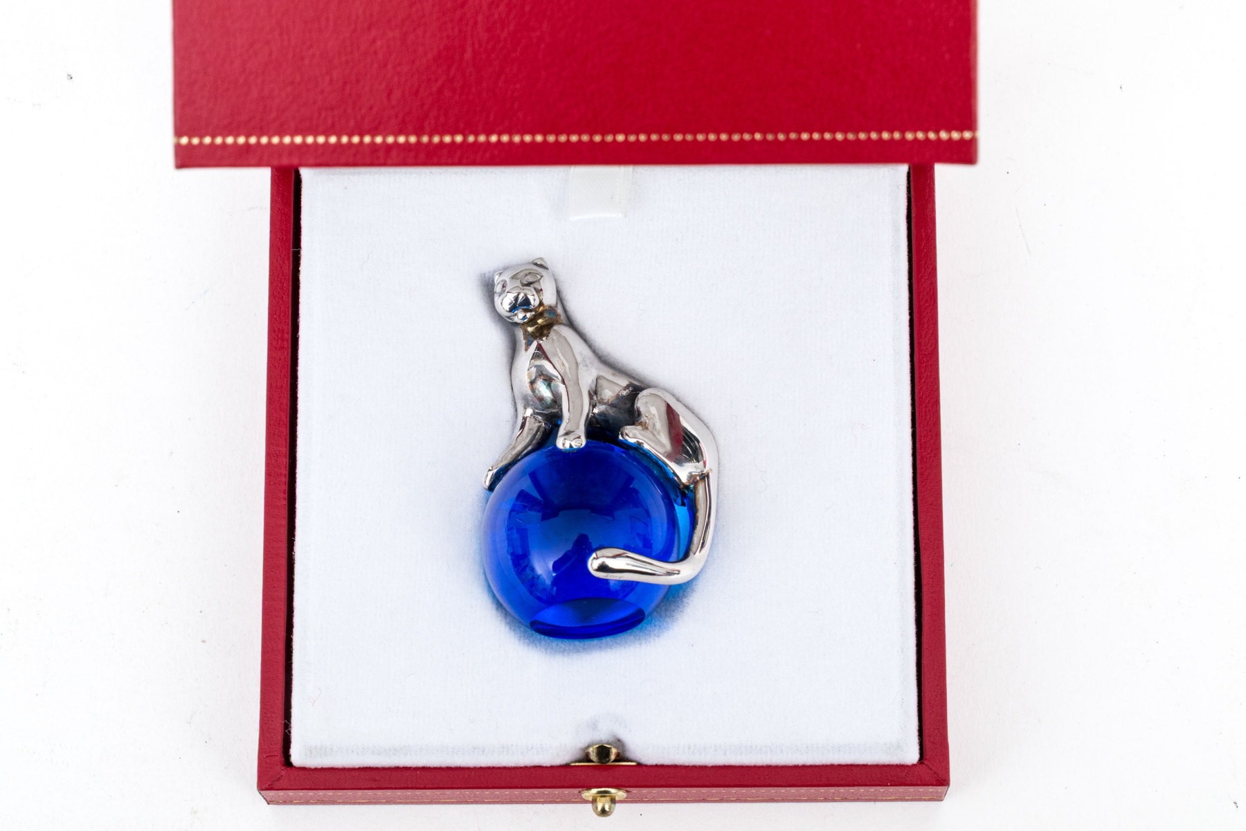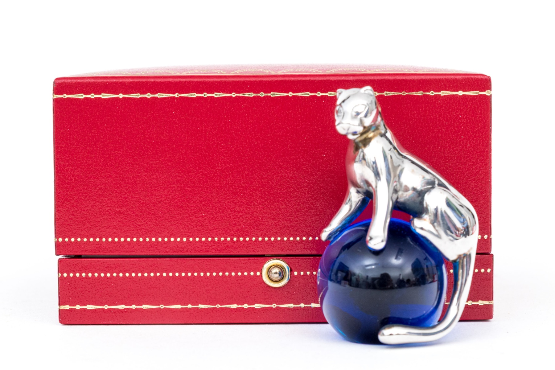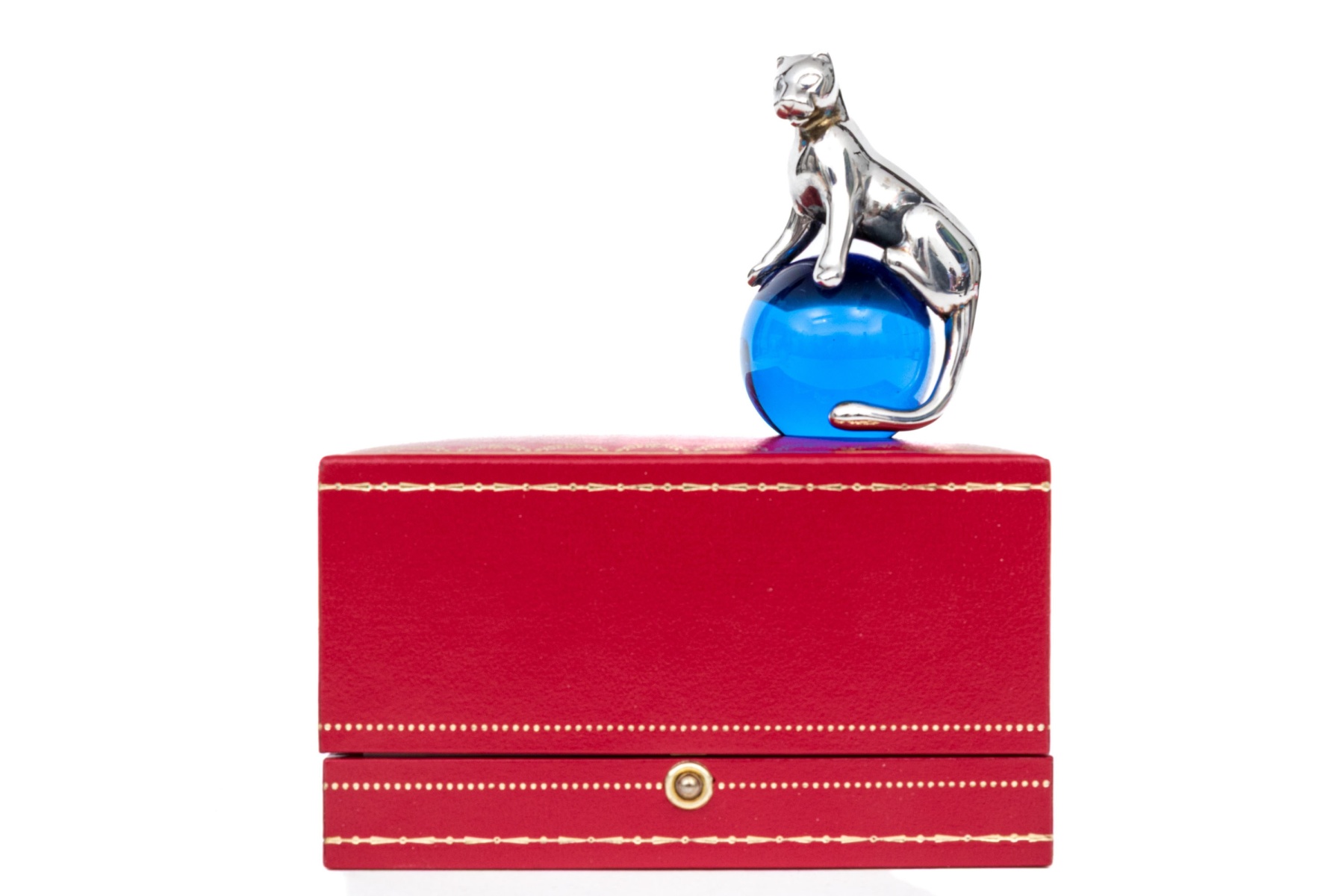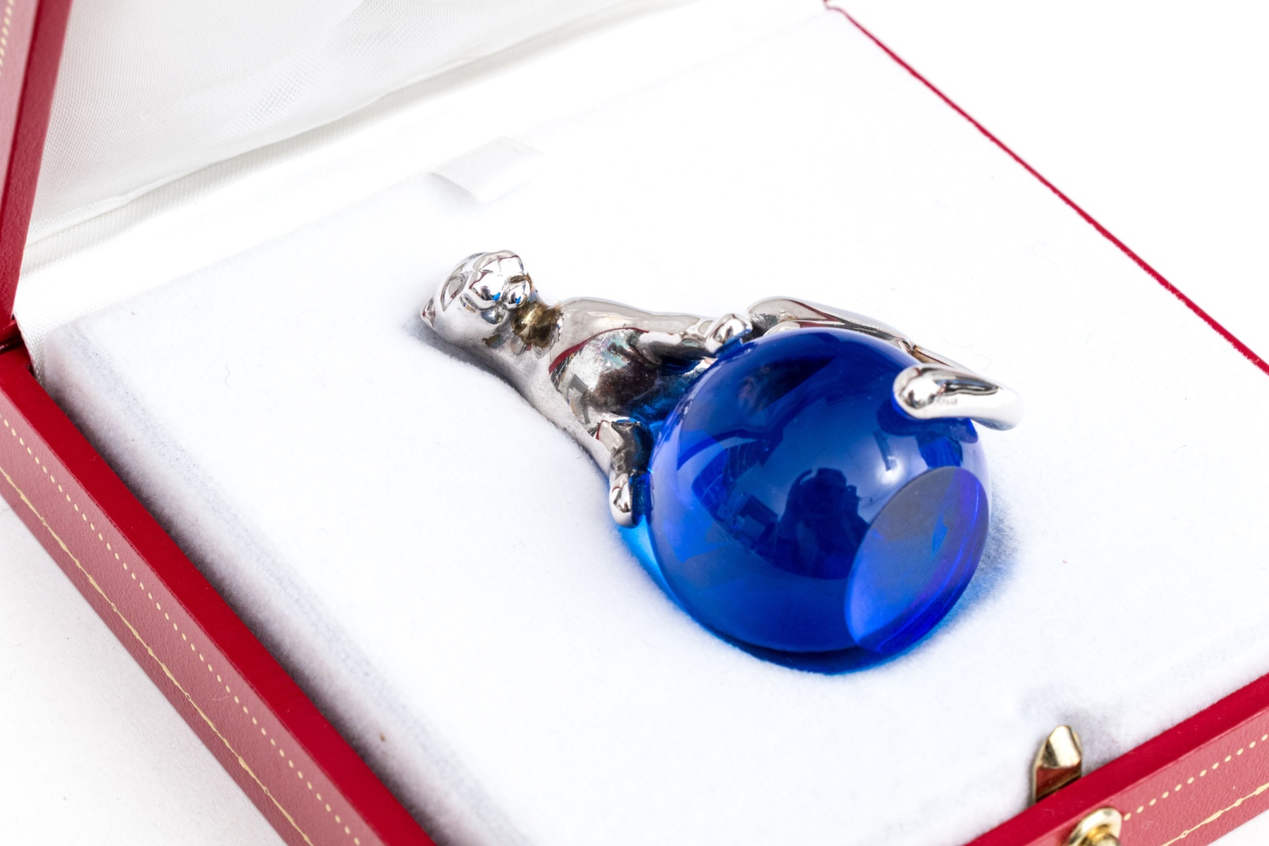 Cartier paperweight, featuring a whimsical sterling silver panther seated on a blue toned crystal ball, presented in a fitted presentation box, outer sleeve and certificate.