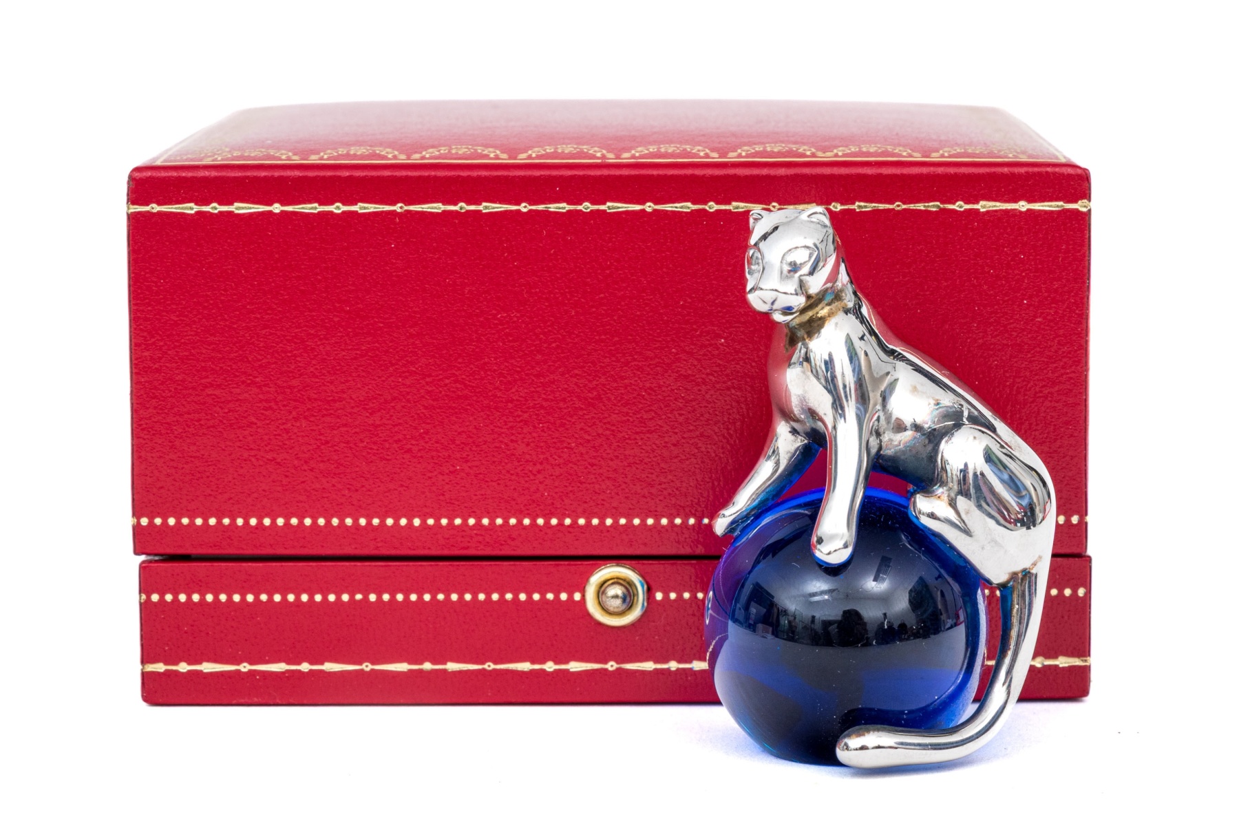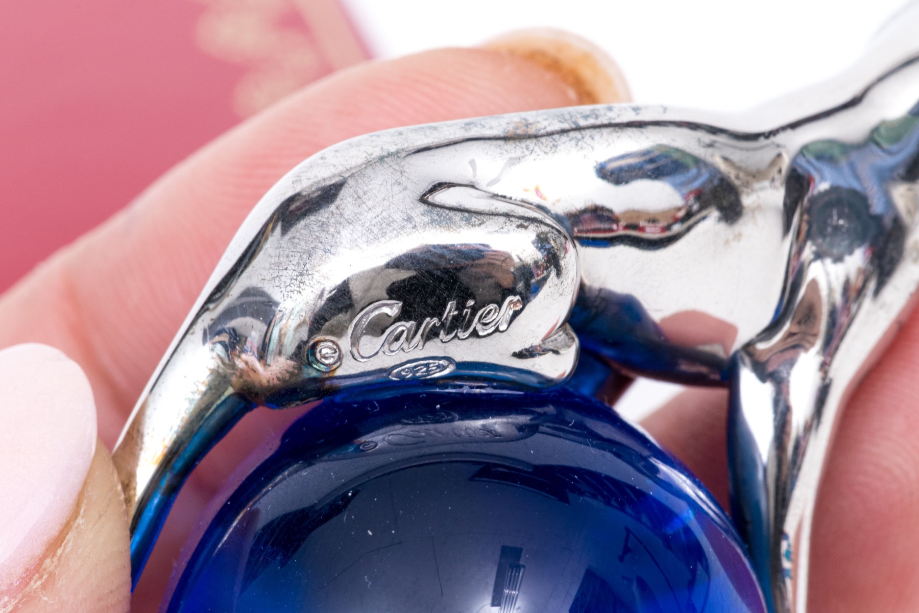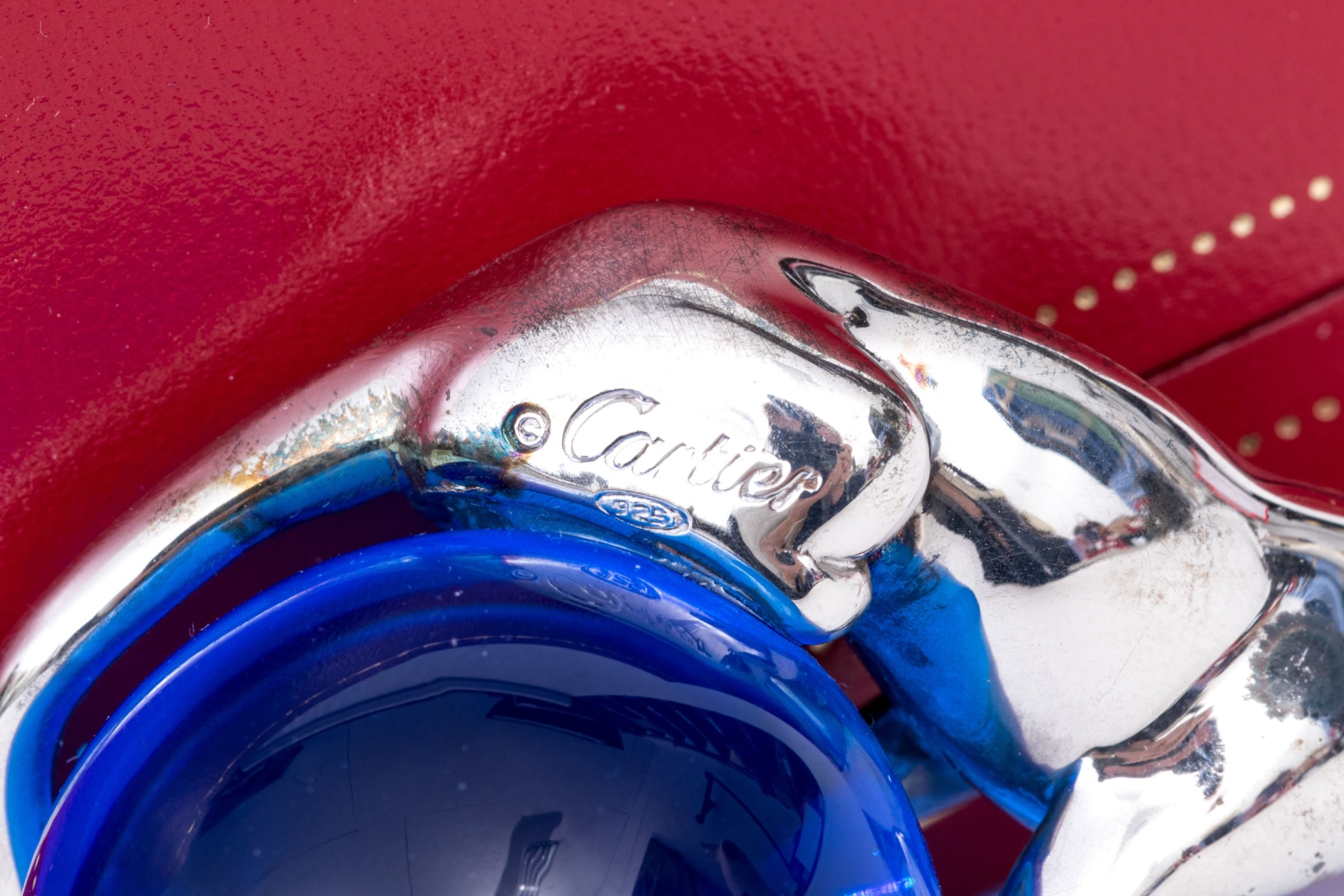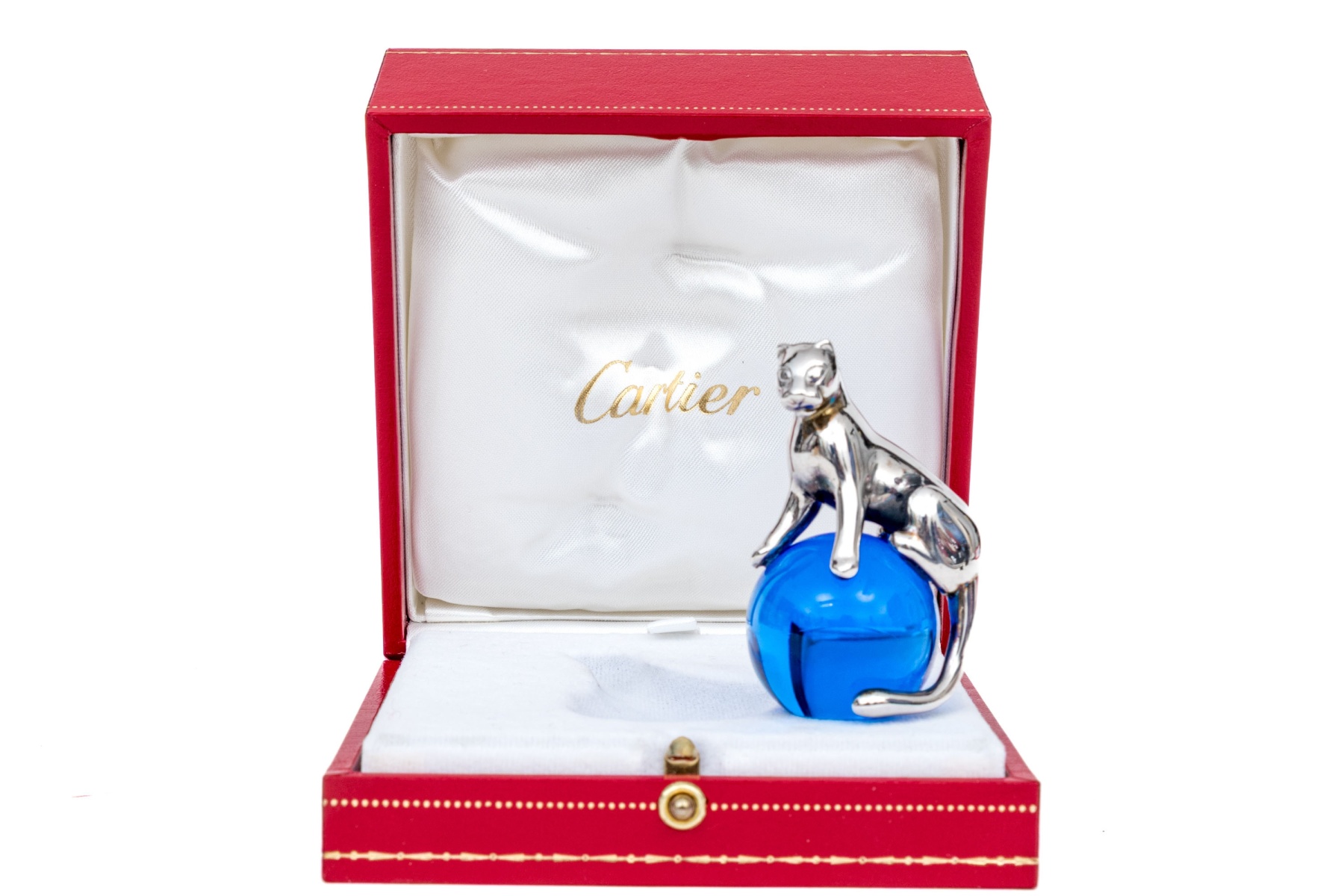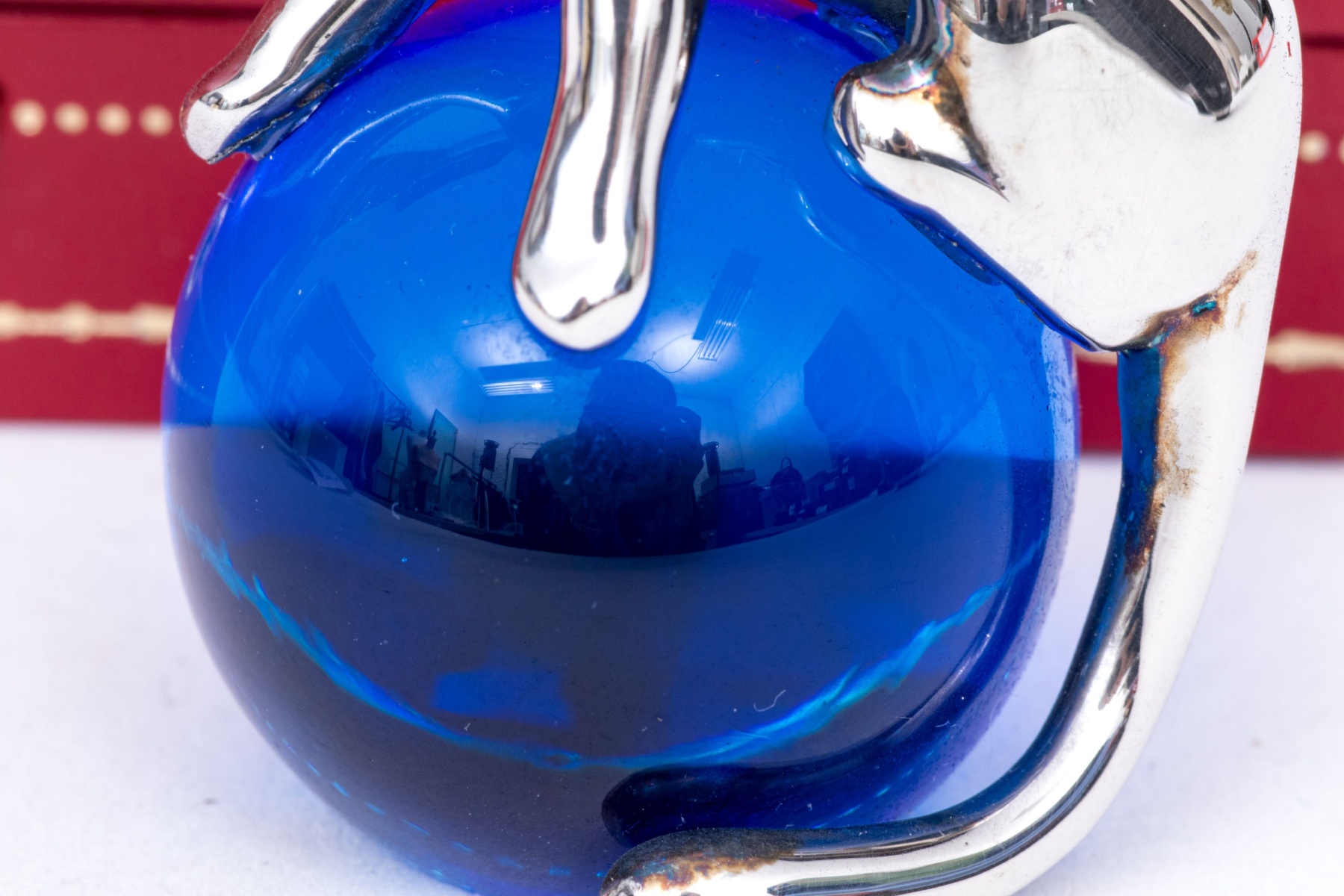 Cartier paperweight, featuring a whimsical sterling silver panther seated on a blue toned crystal ball, presented in a fitted presentation box, outer sleeve and certificate.