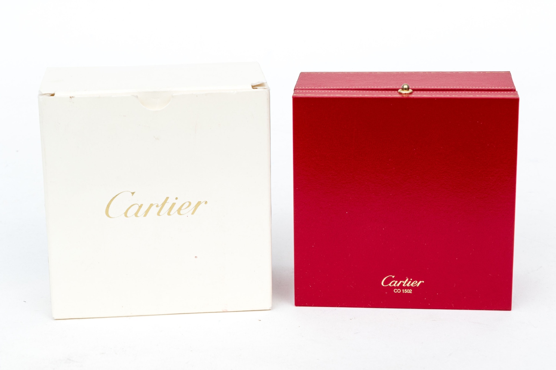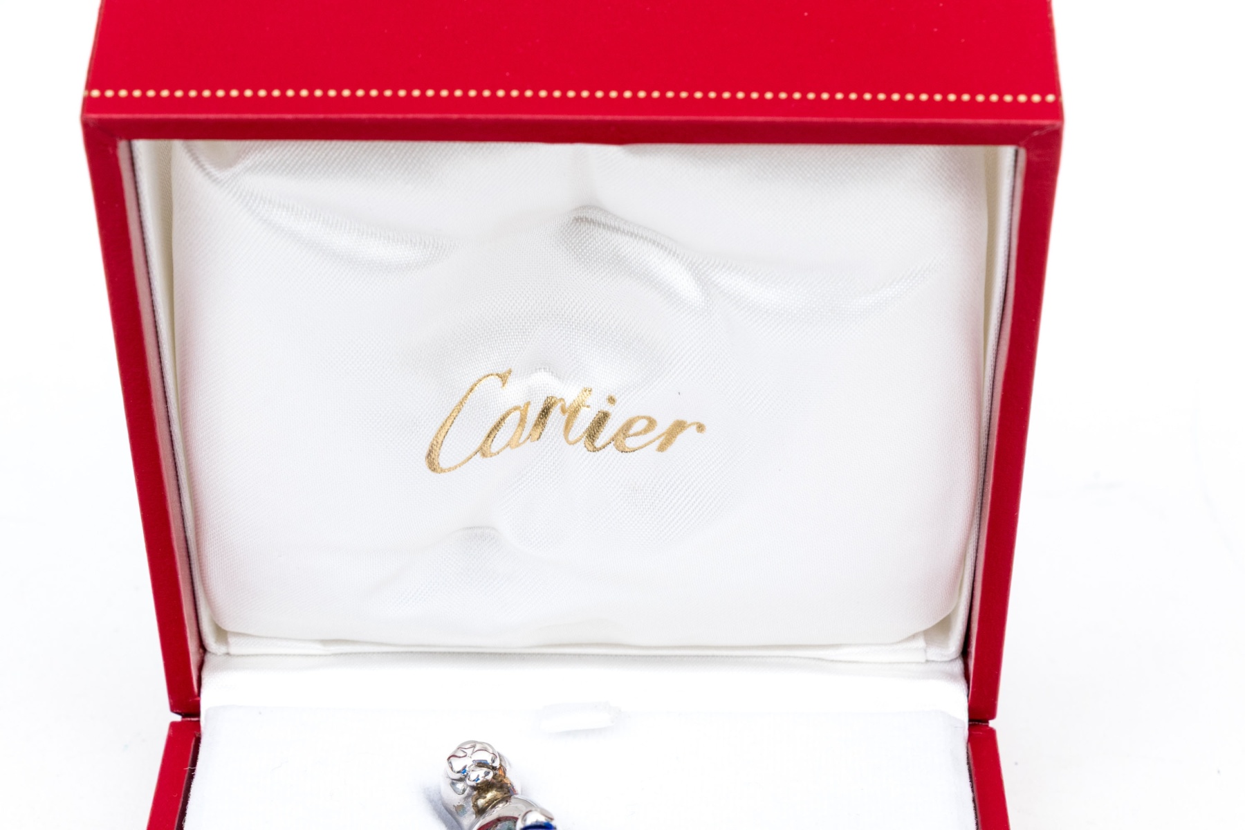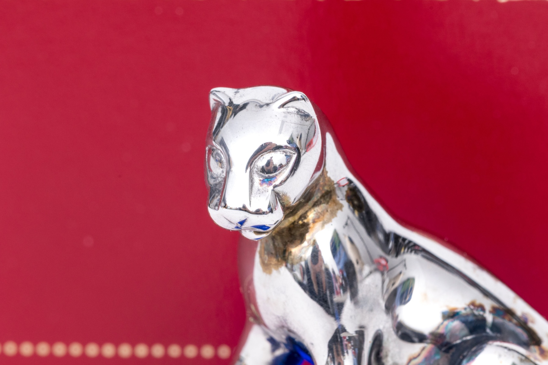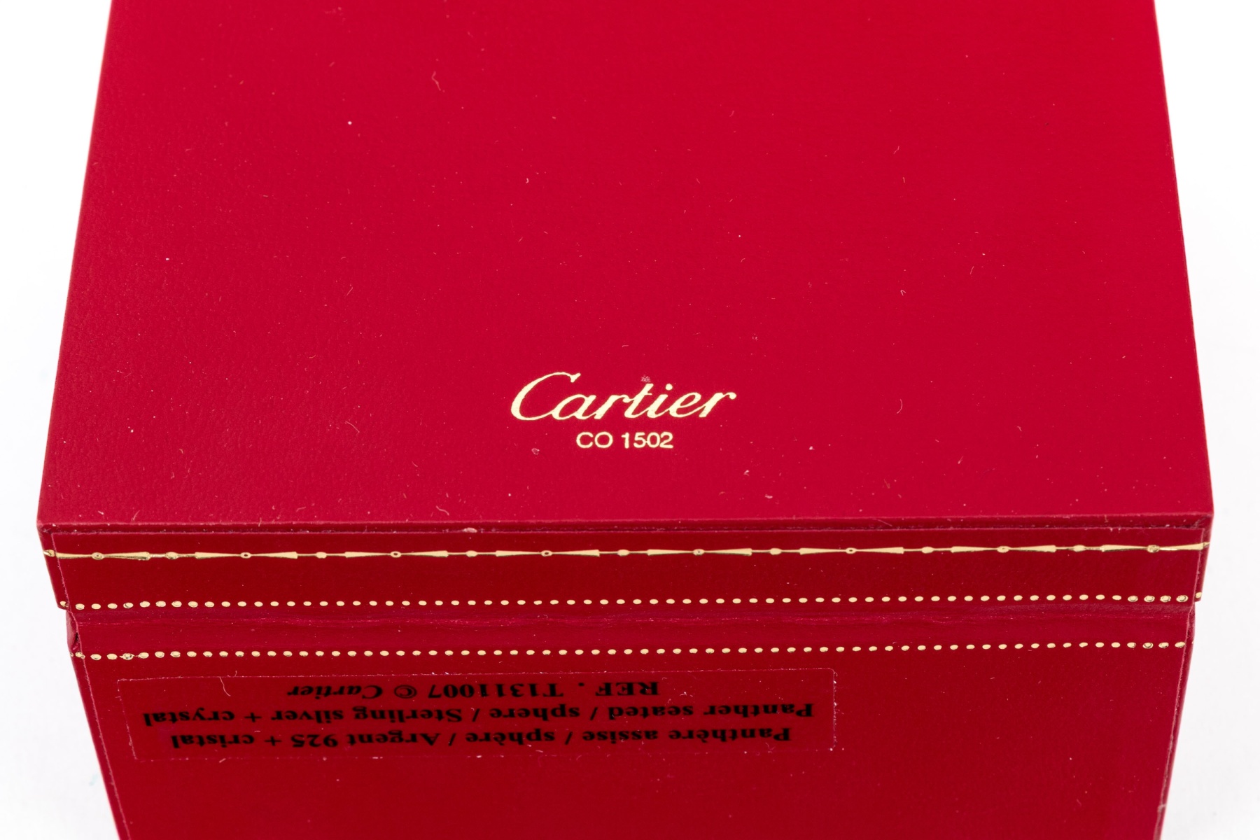 Cartier paperweight, featuring a whimsical sterling silver panther seated on a blue toned crystal ball, presented in a fitted presentation box, outer sleeve and certificate.