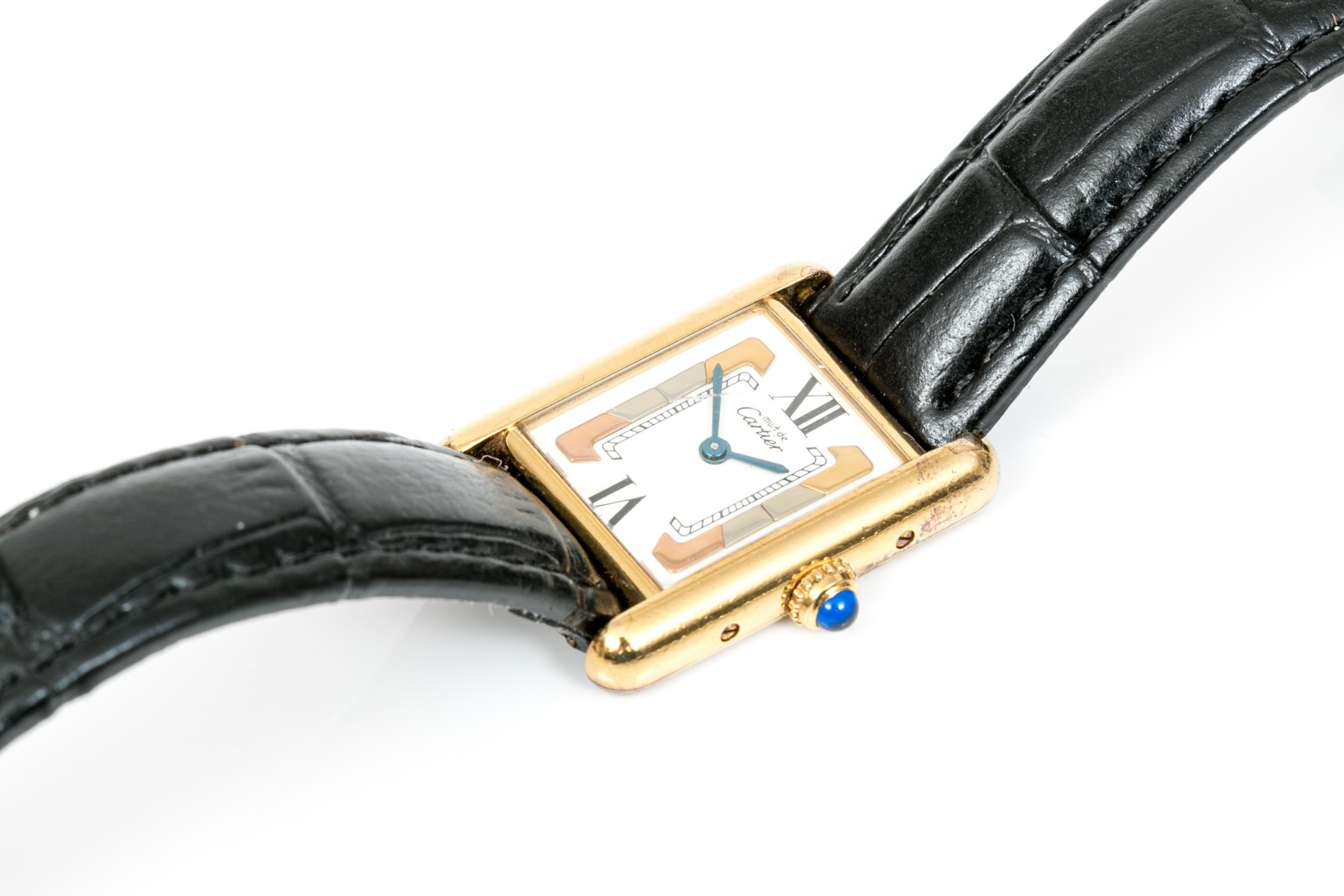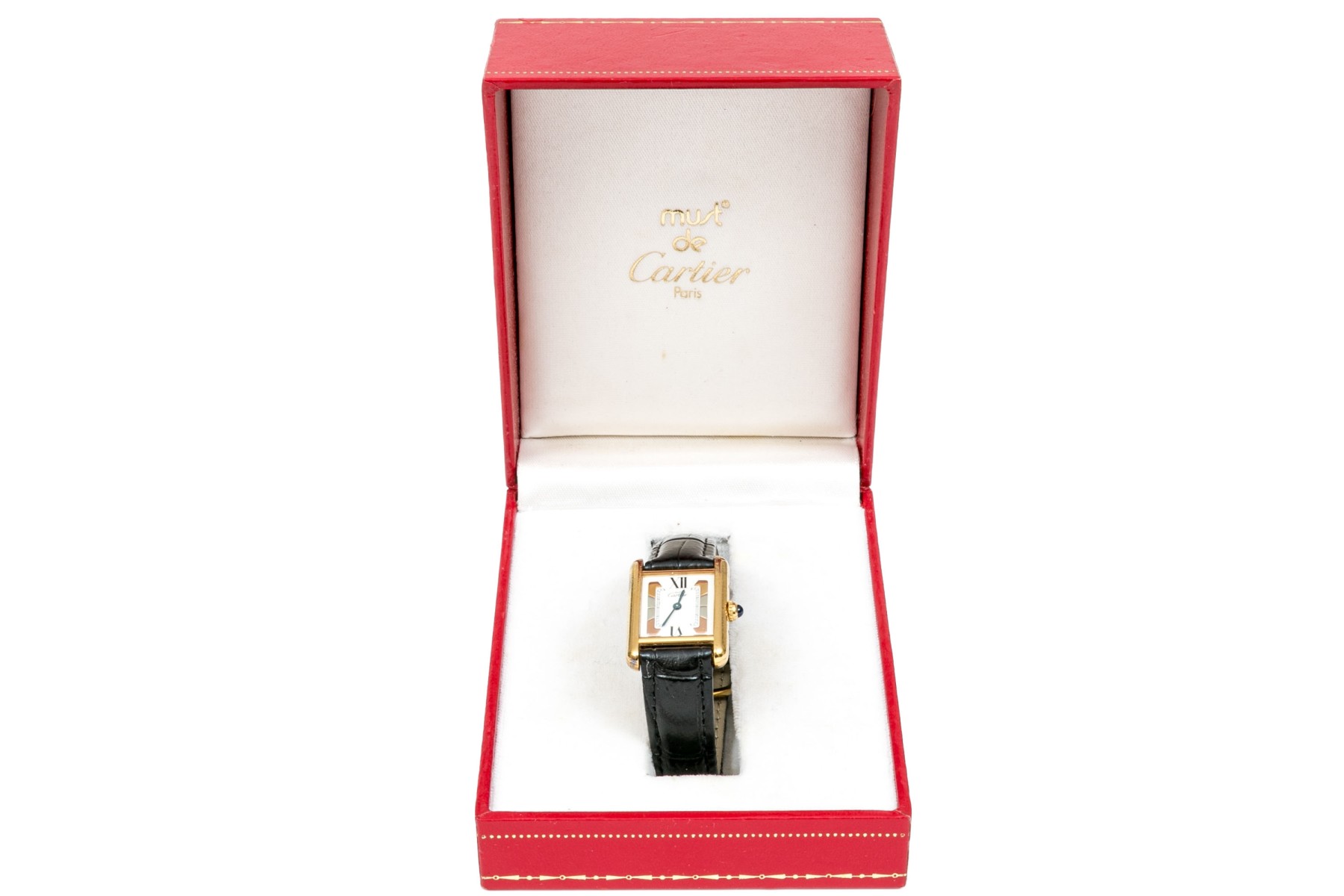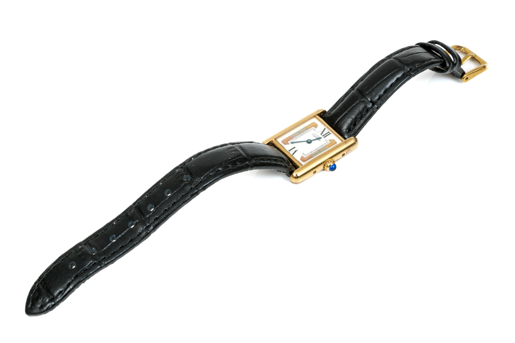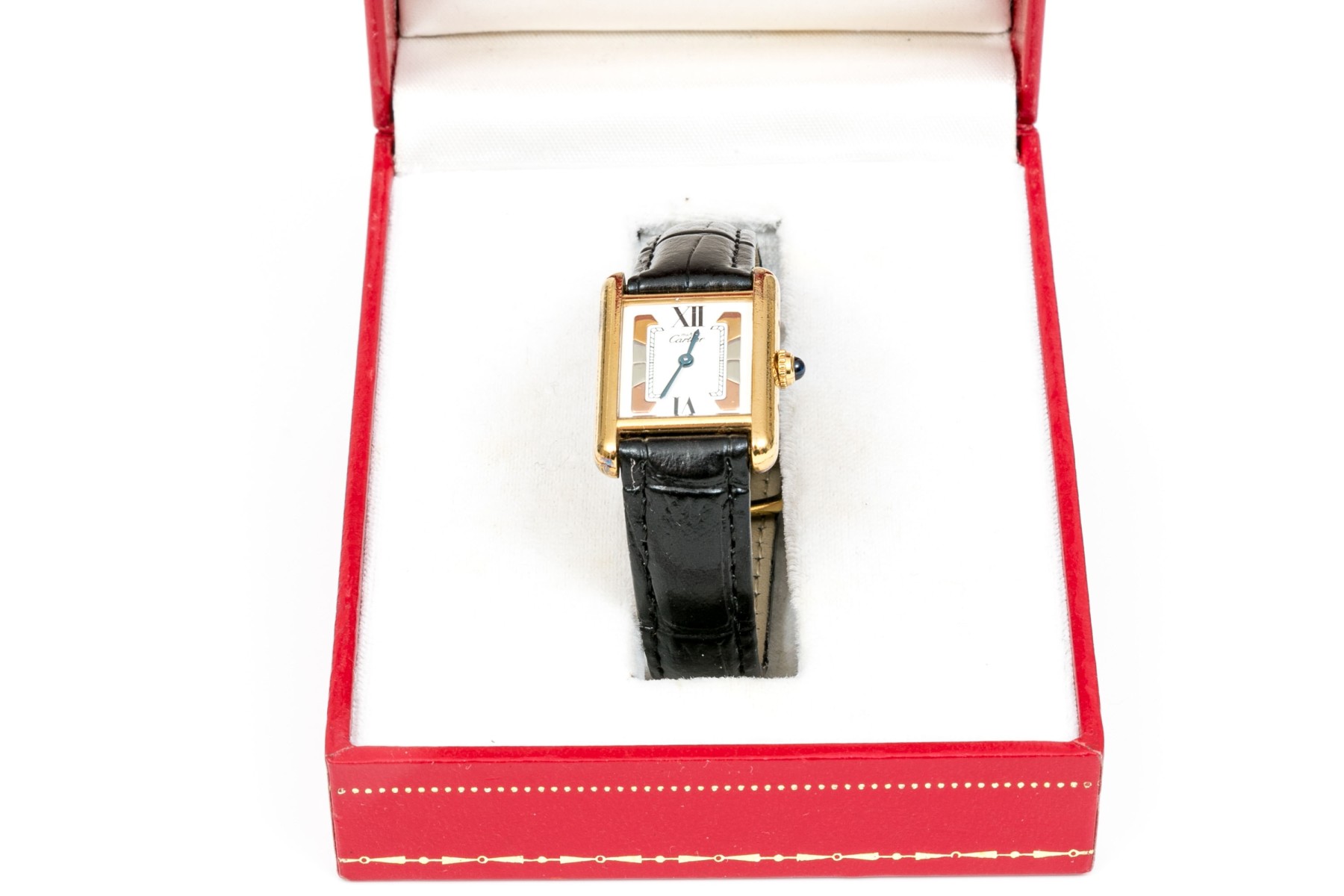 Cartier watch. This small version of the Must de Cartier tank style watch is sterling silver vermeil, with a quartz movement. The watch has a tri color decoration on the dial, with a white border set with black roman numerals and is time only. The watch has a generic strap and a generic ardillon (tang) style buckle.