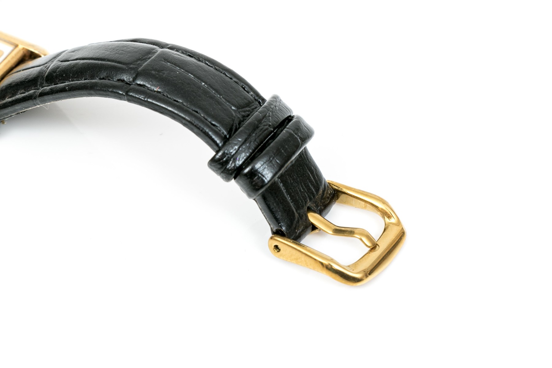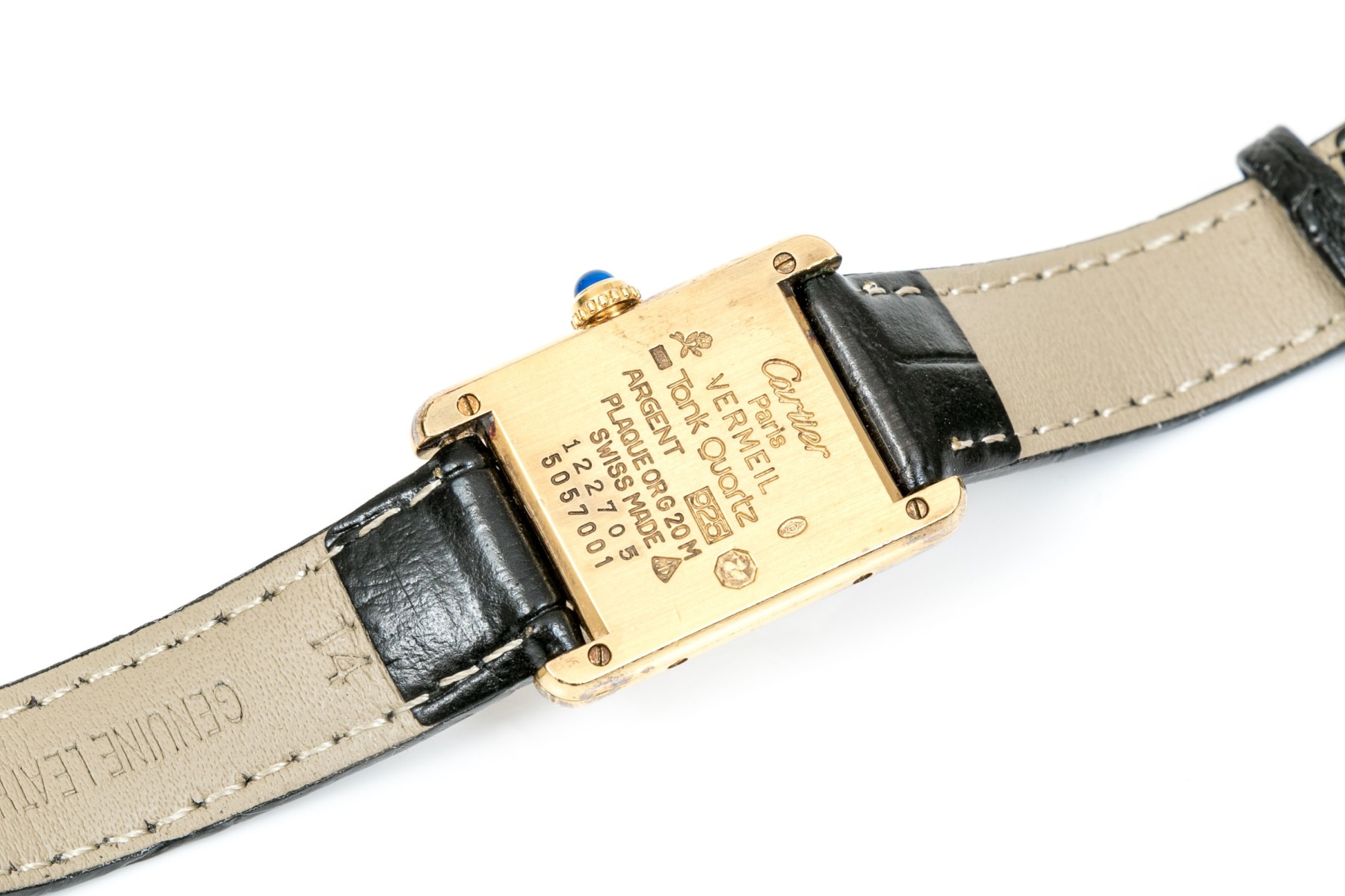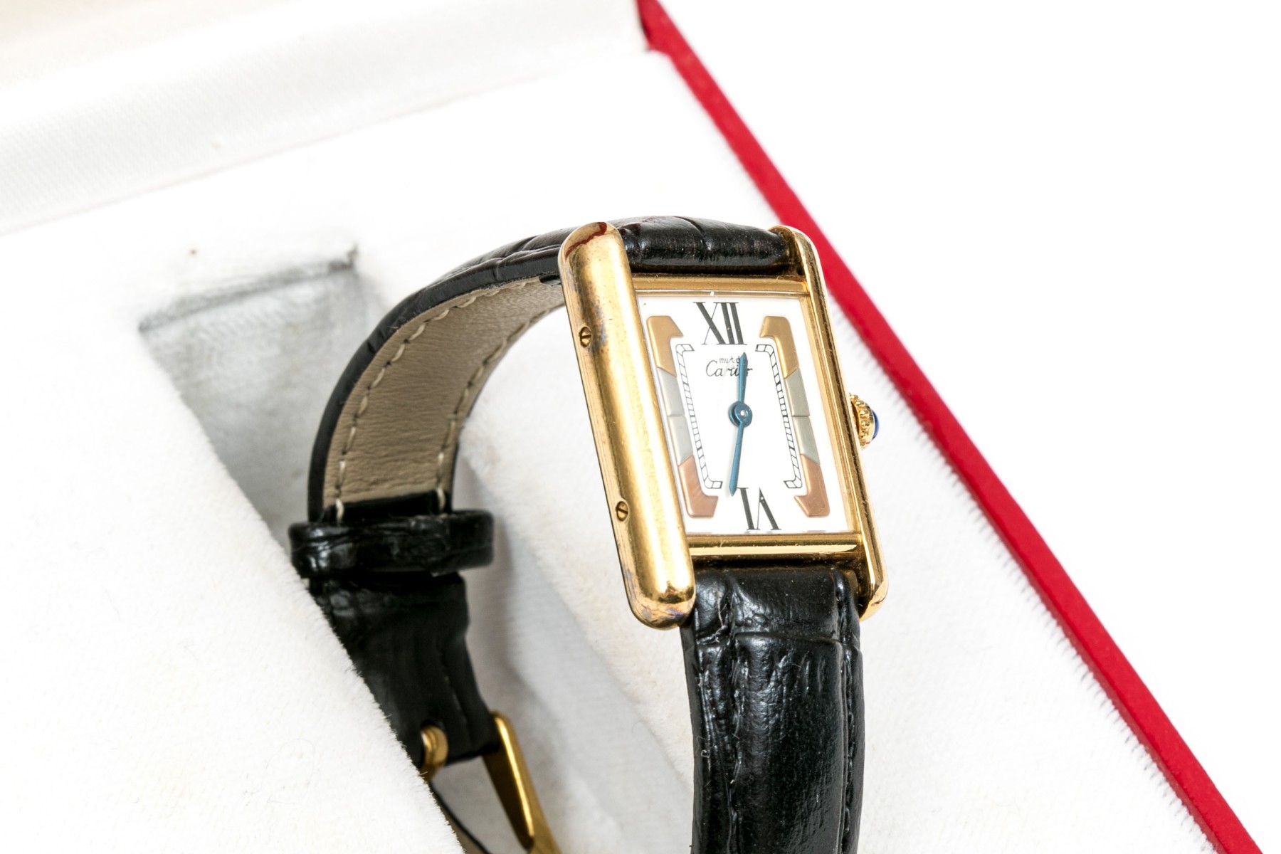 Condition: Surface scratches, scratches on case, back; crystal deeply gouged; tarnished; strap and buckle are generic and not Cartier
