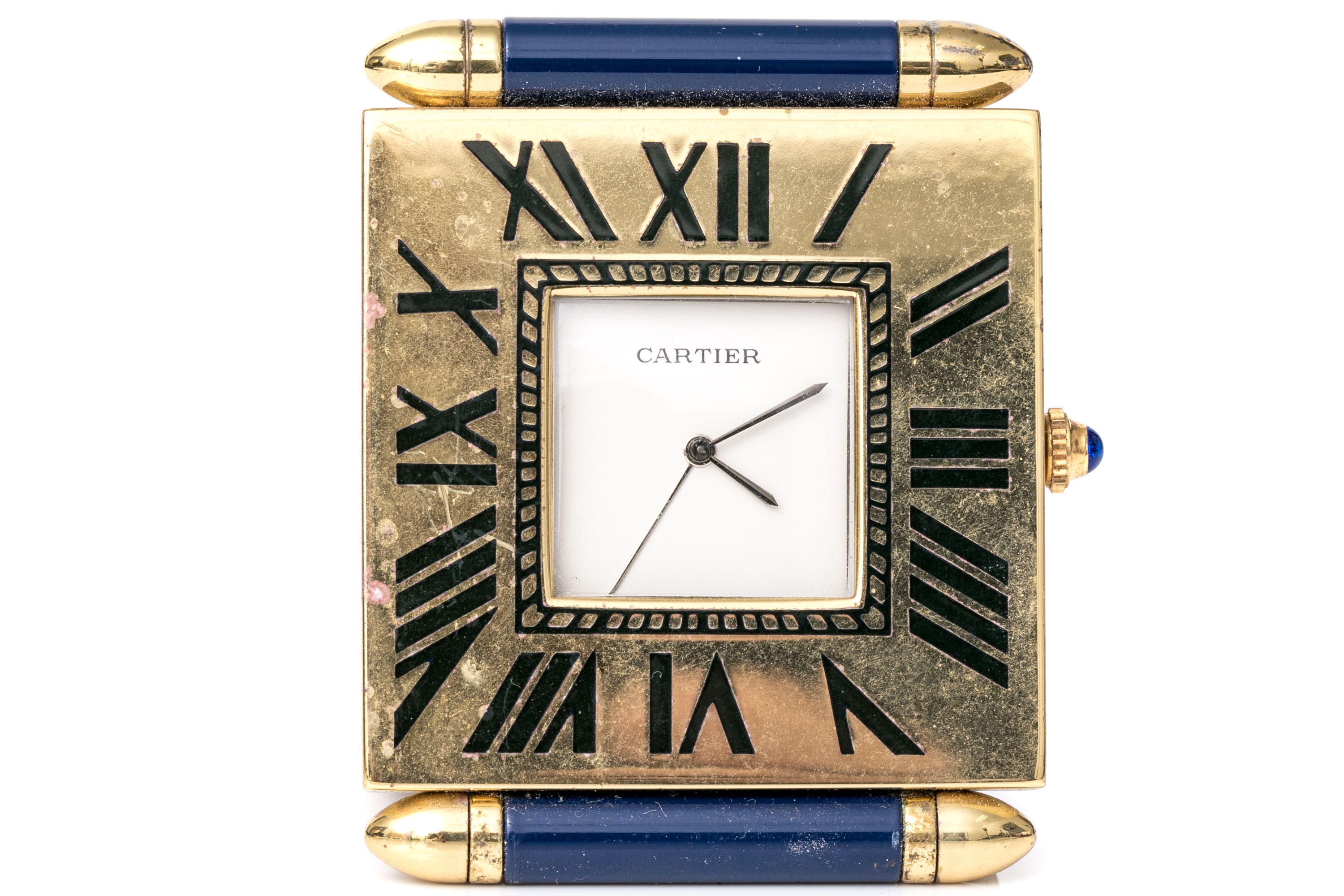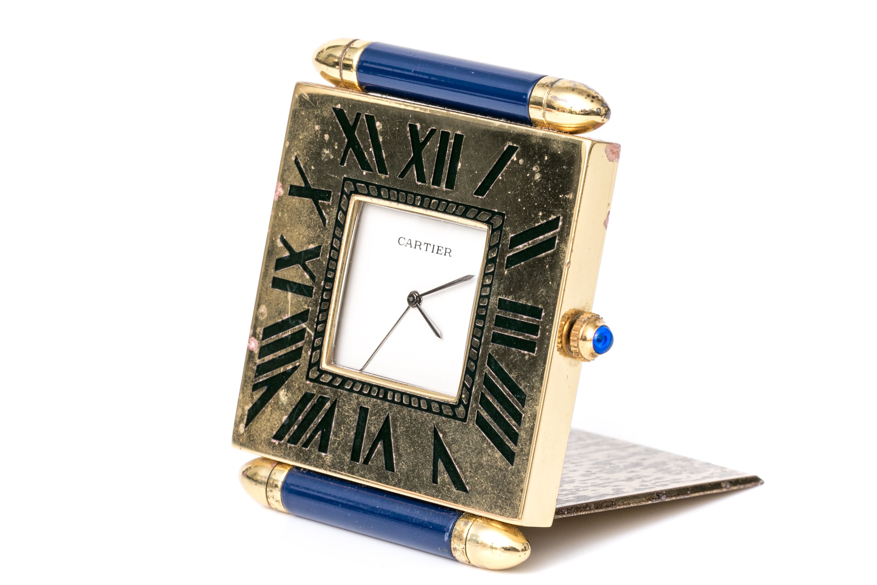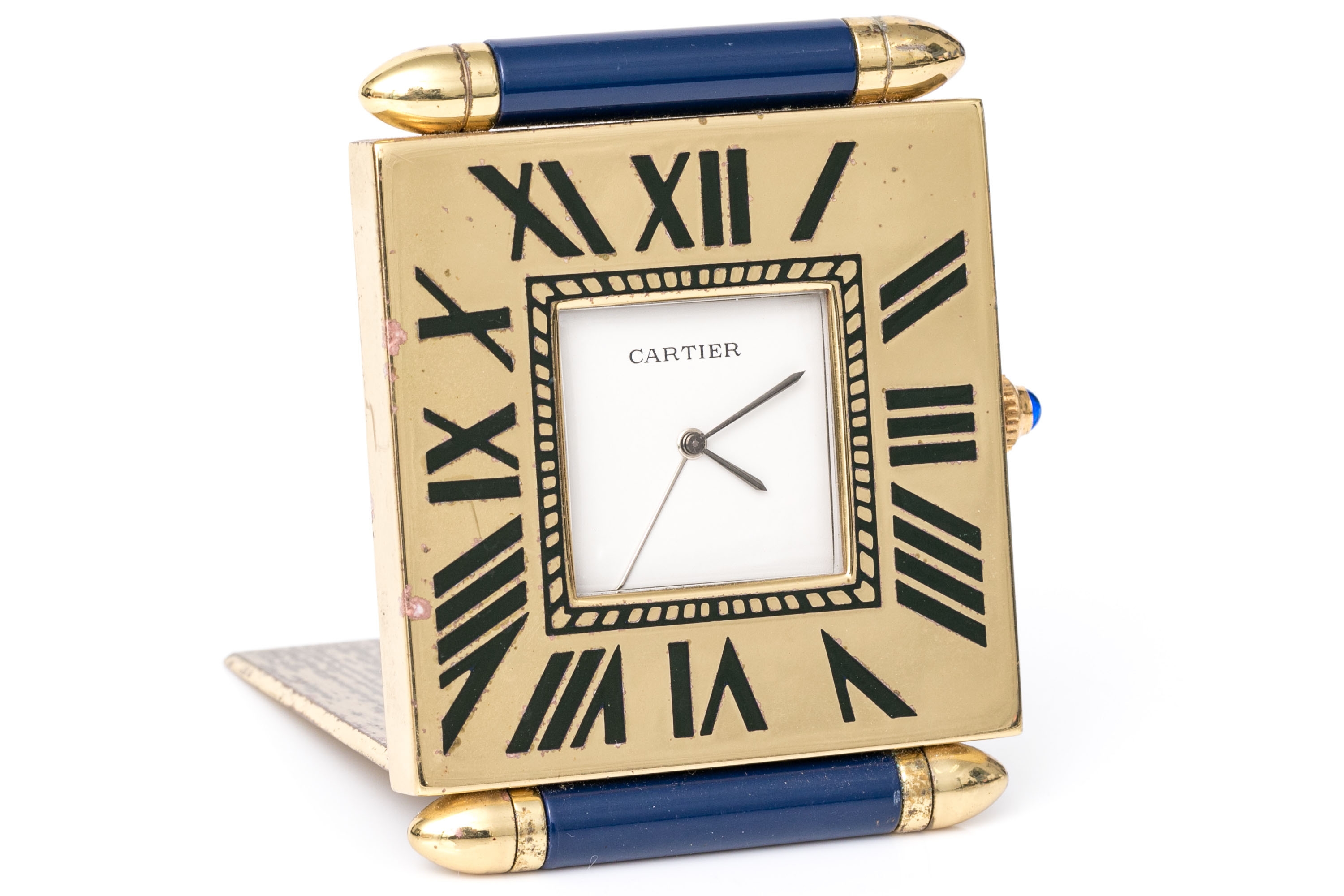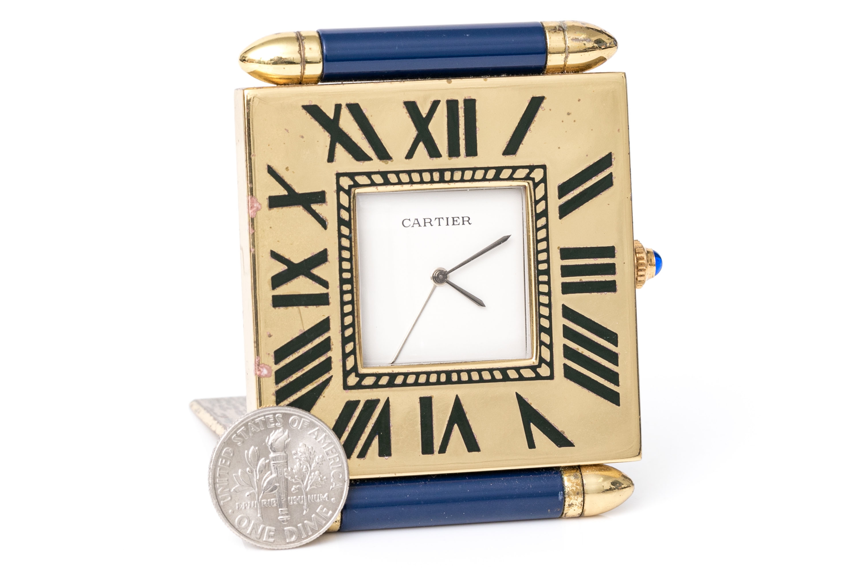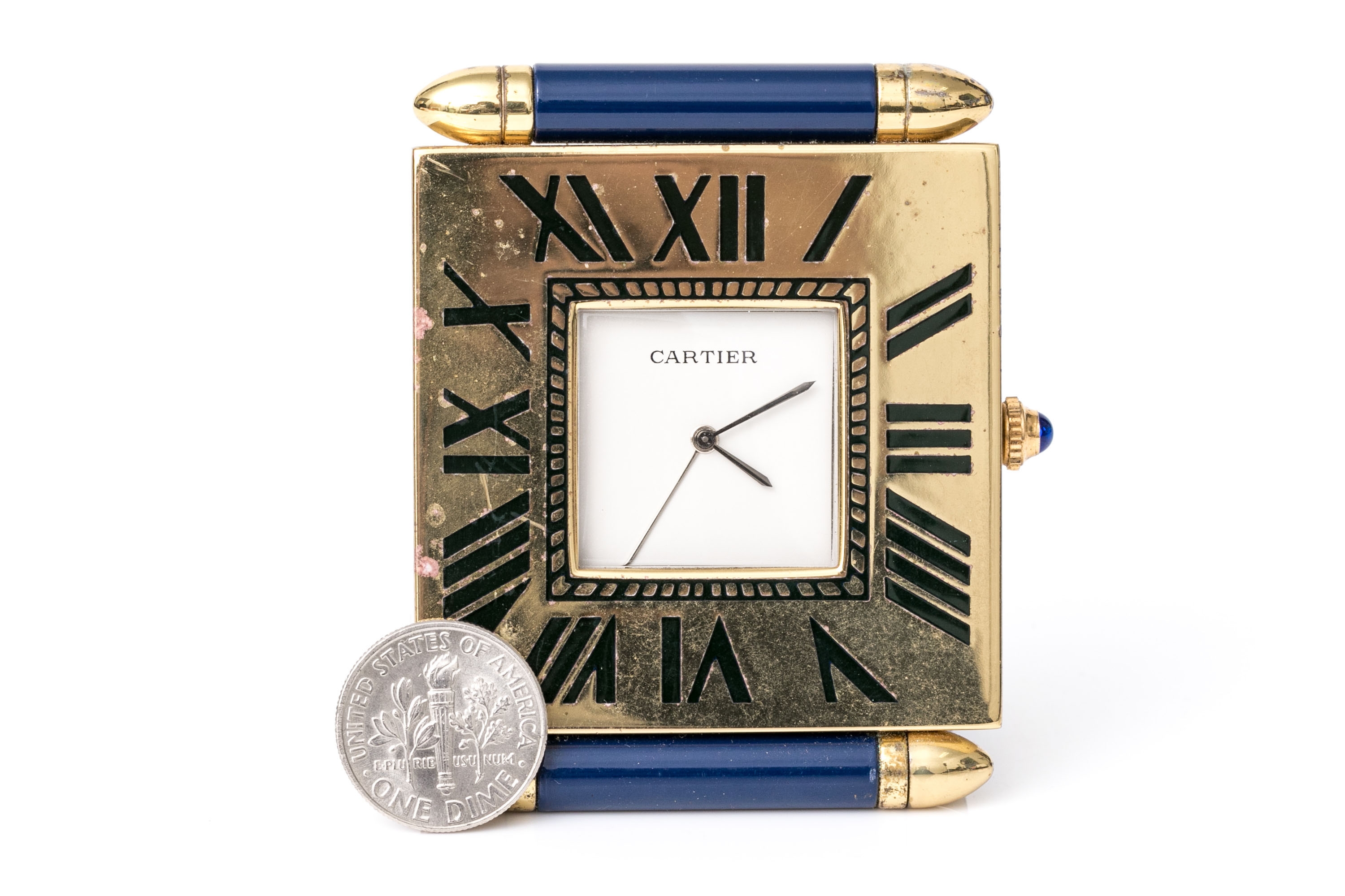 Cartier vintage Quadrant Obus blue composite Deco style travel clock. This fabulous clock is the travel alarm version of the Tank Quadrant, with the wide bezel and blue enamel Roman numeral markers, with the Obus style lugs