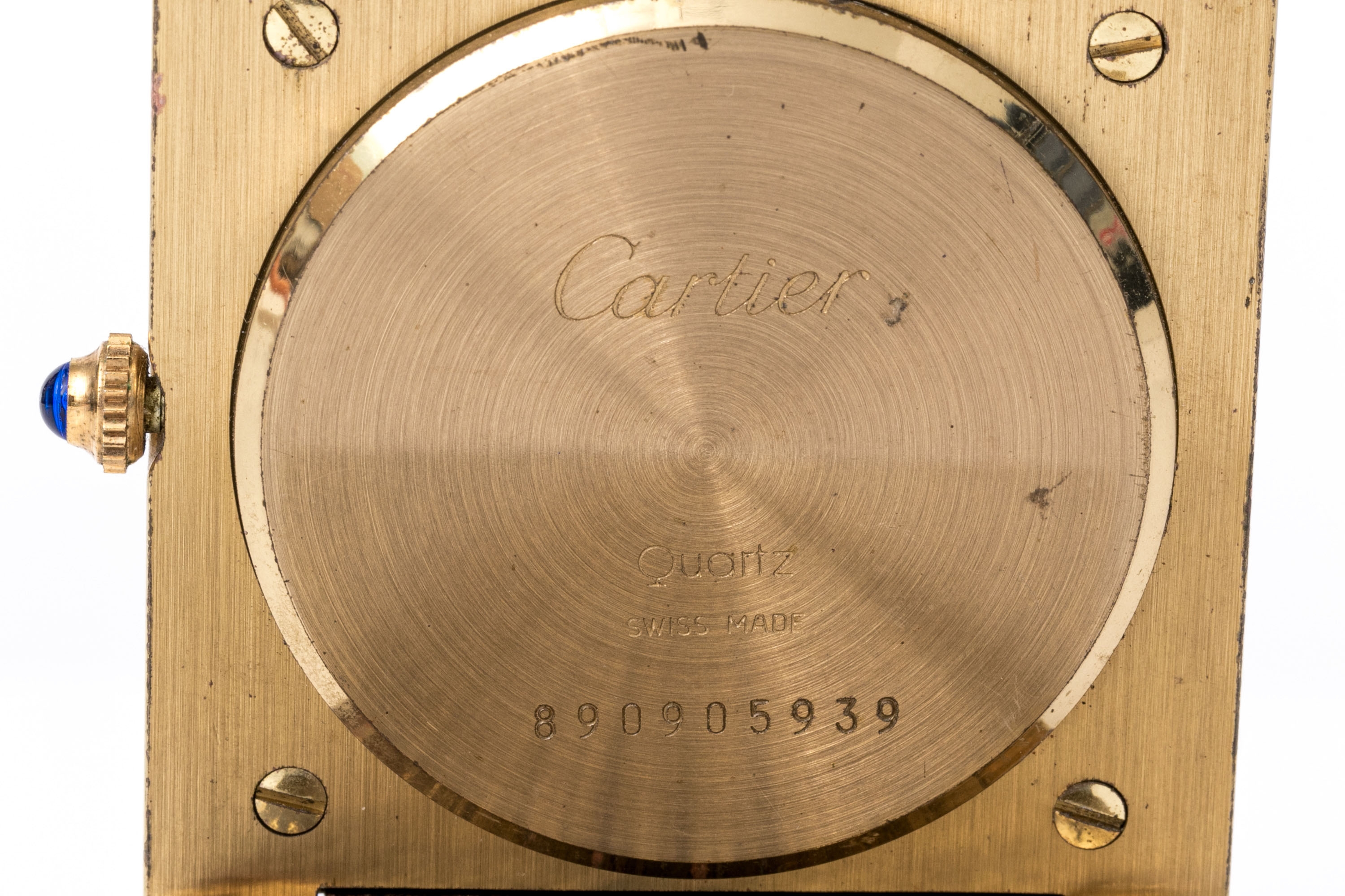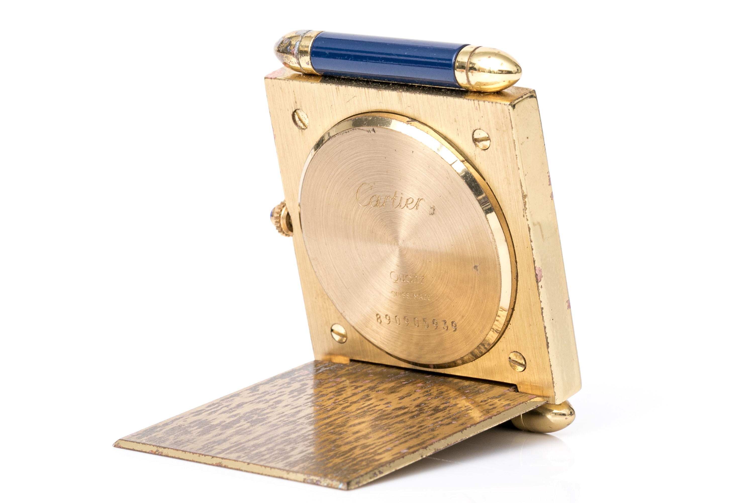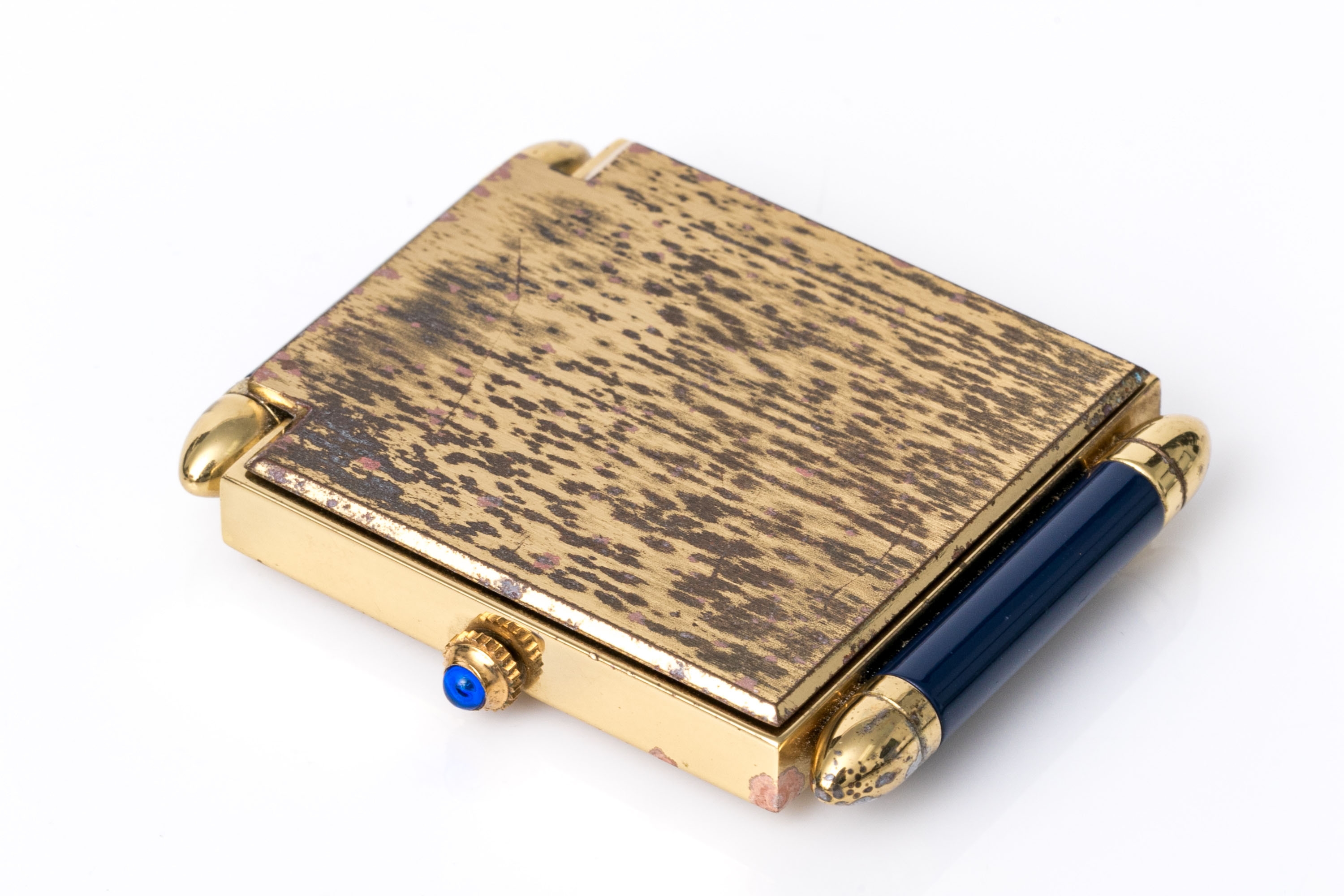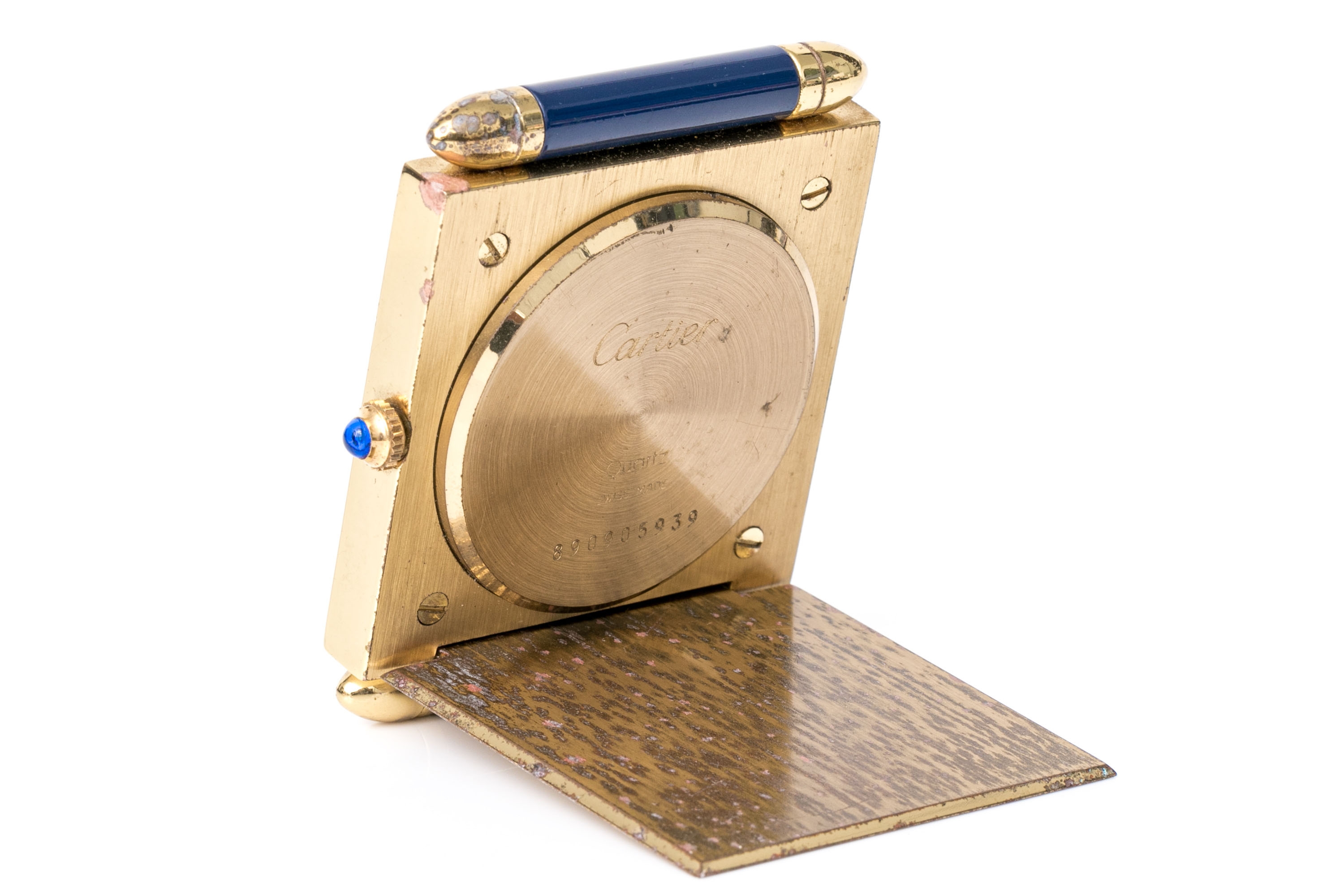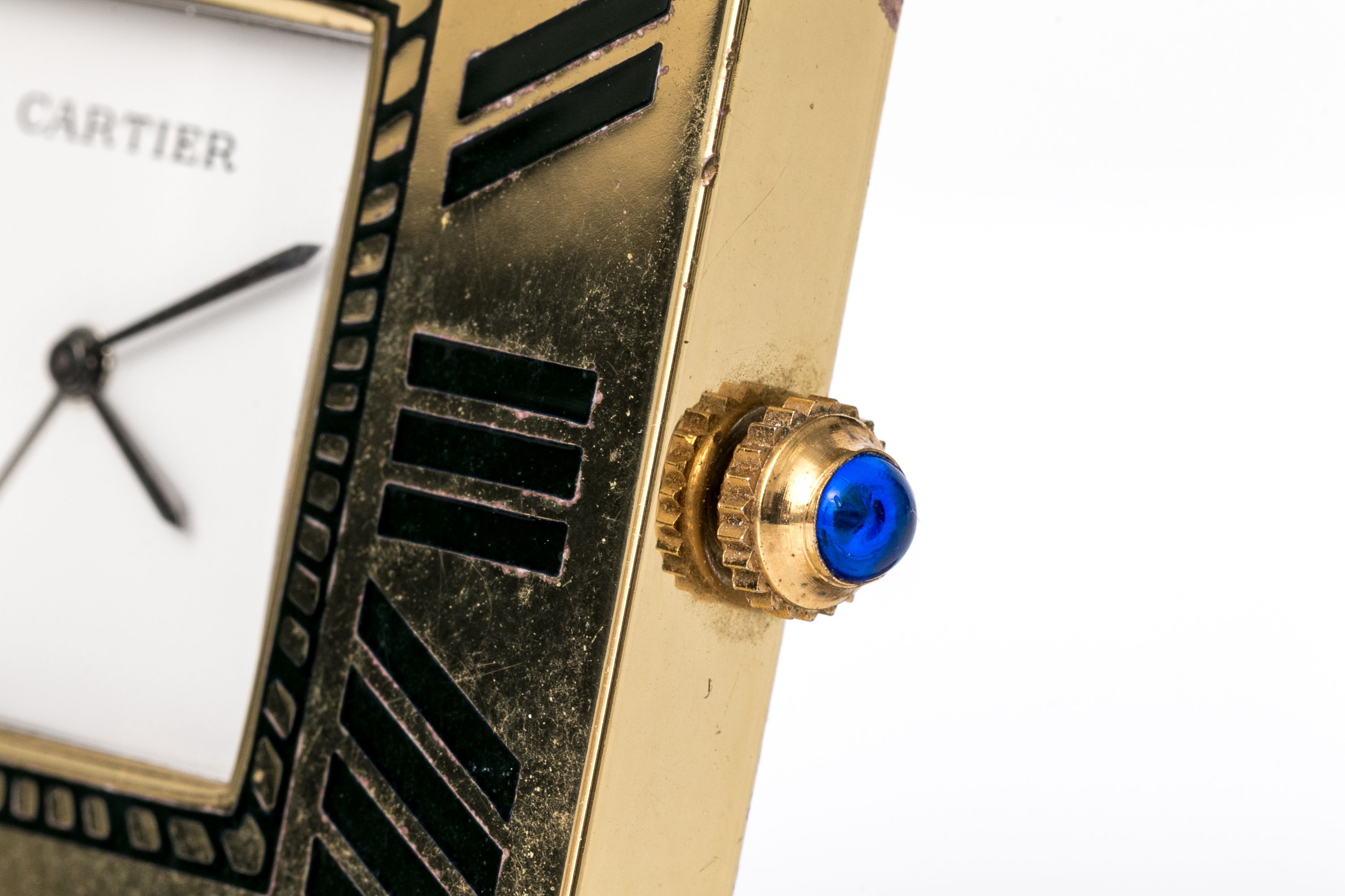 Cartier vintage Quadrant Obus blue composite Deco style travel clock. This fabulous clock is the travel alarm version of the Tank Quadrant, with the wide bezel and blue enamel Roman numeral markers, with the Obus style lugs