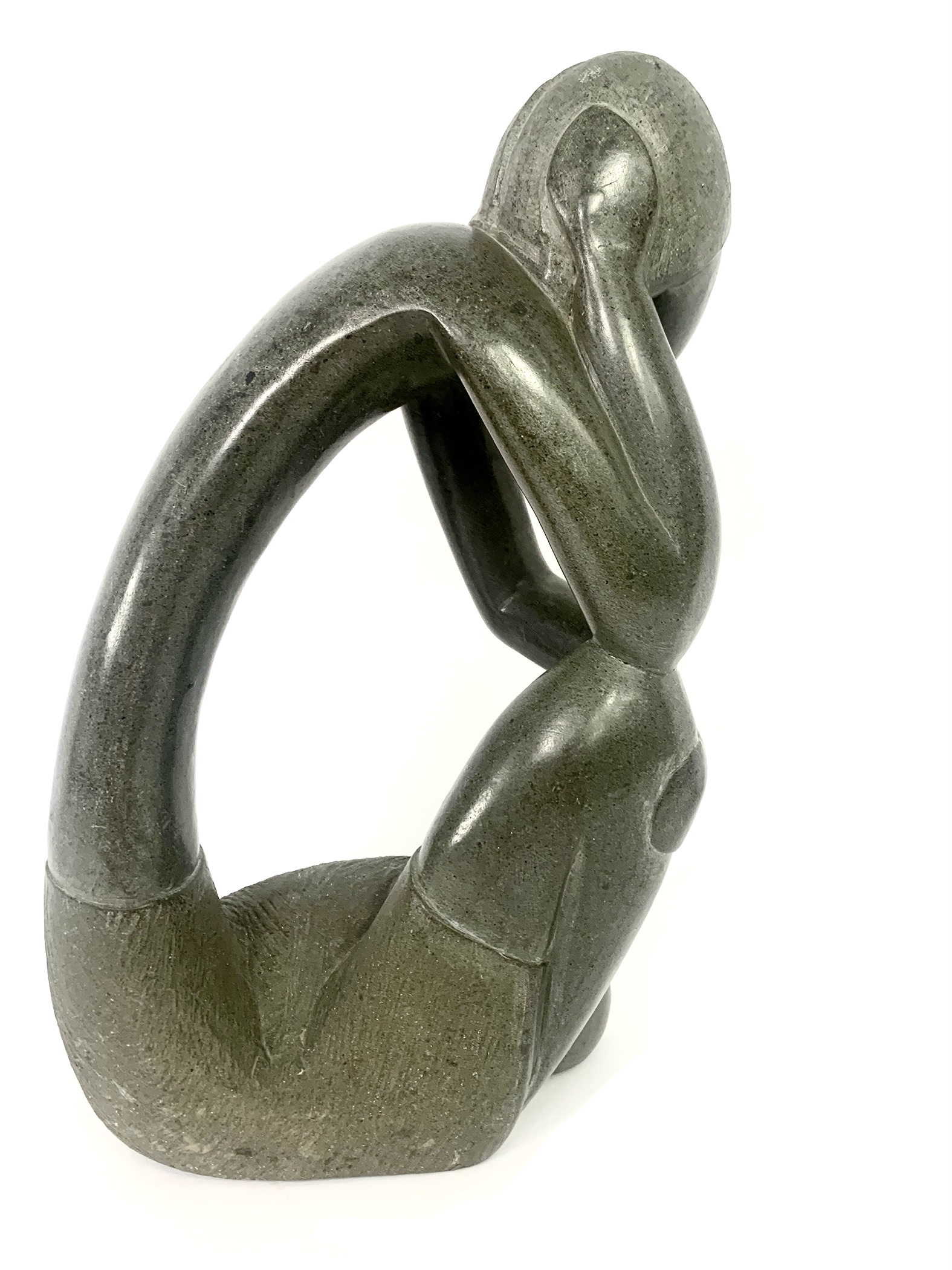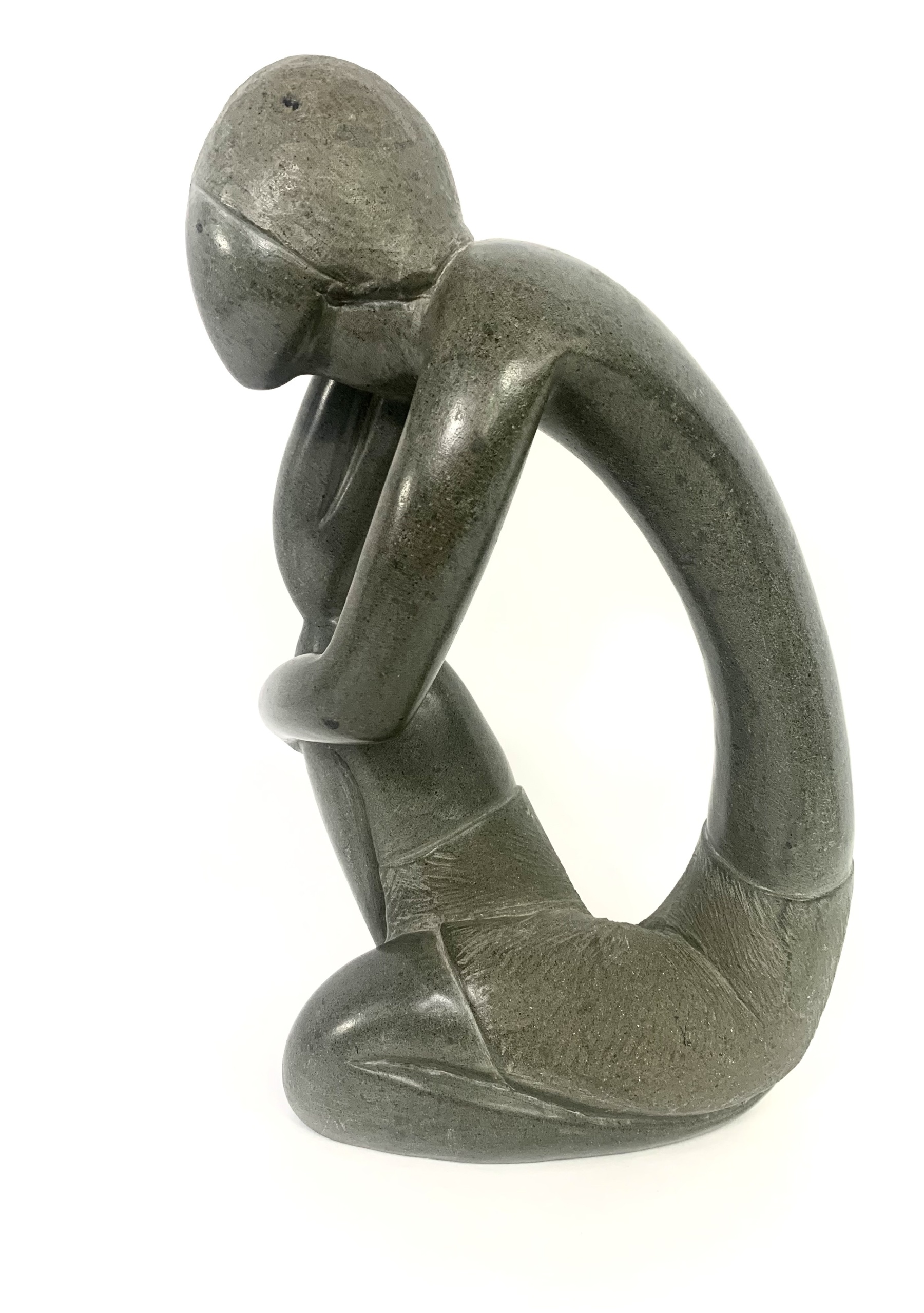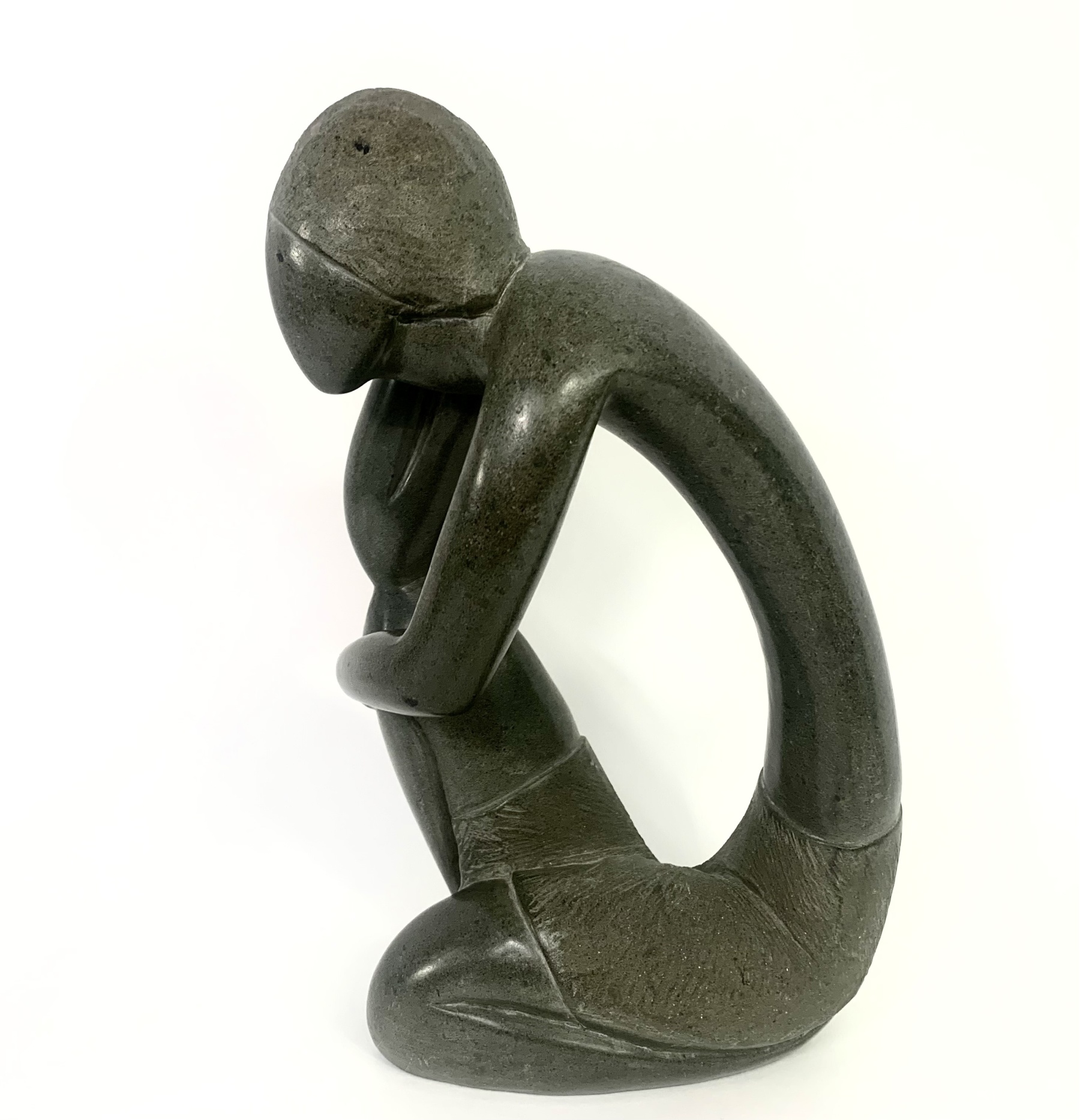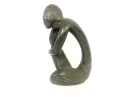 Carved abstract or modernist style stone sculpture of a figure leaning on a bent knee in a contemplative or thinking pose.