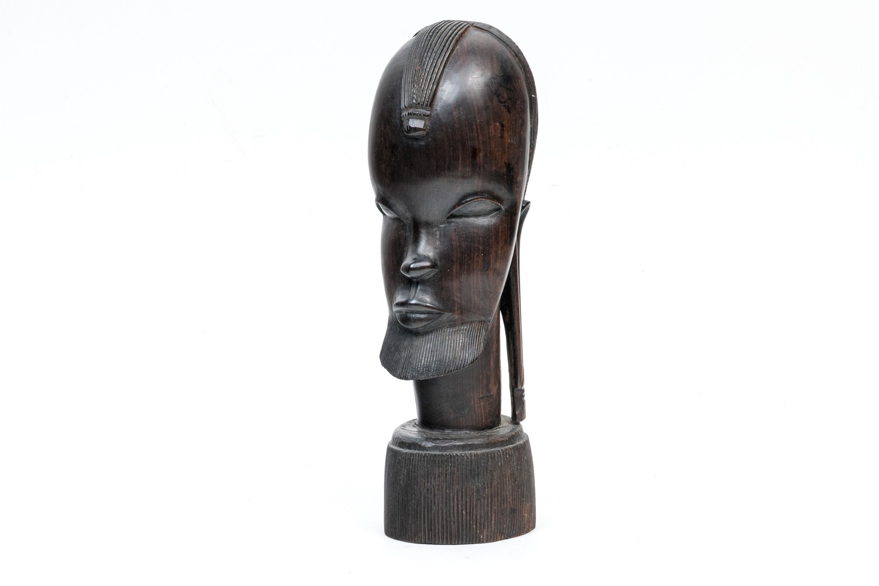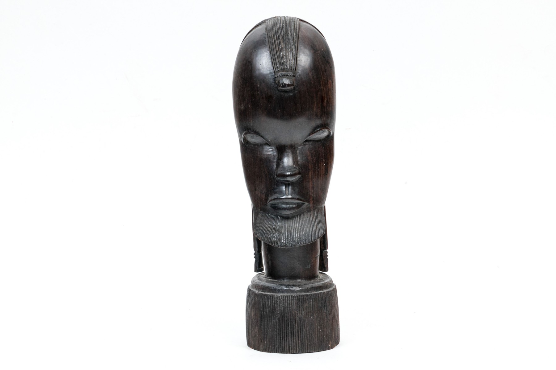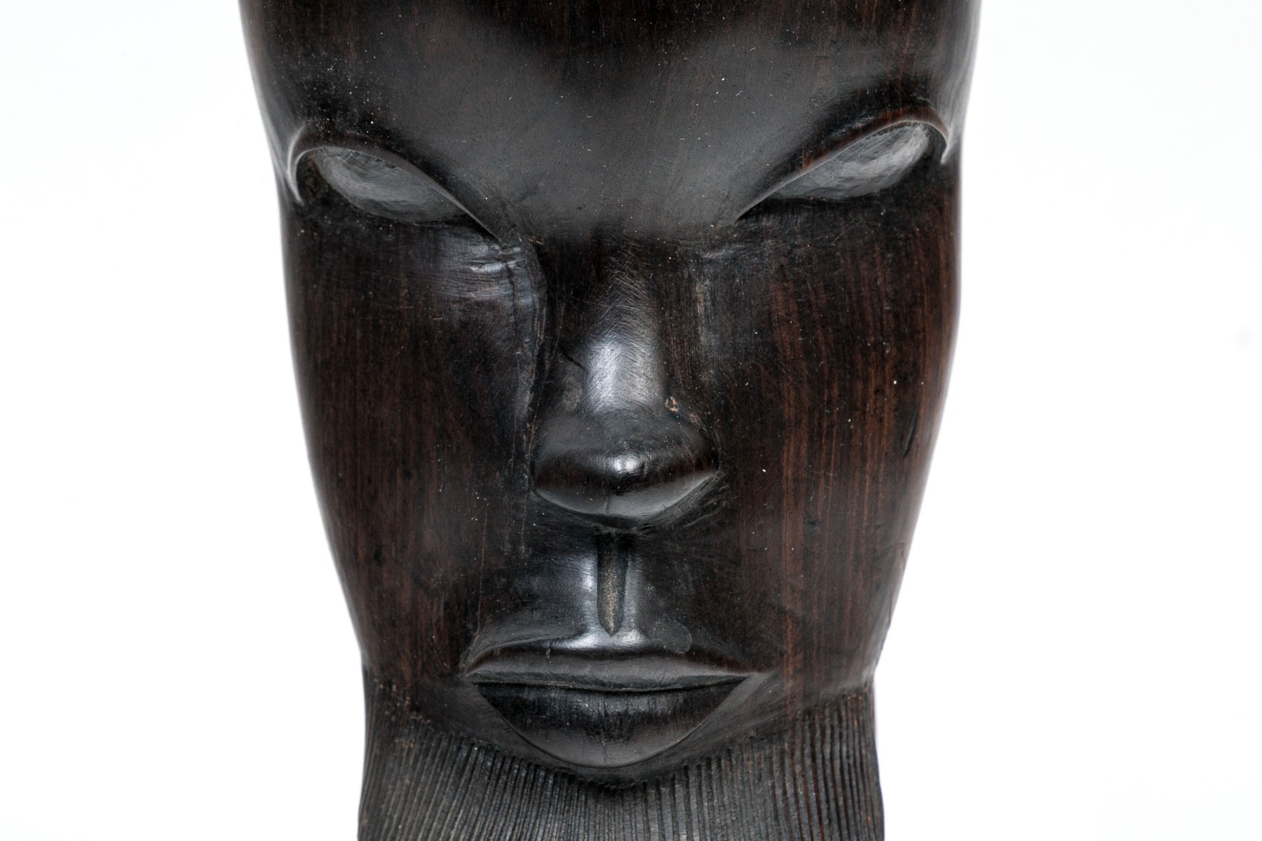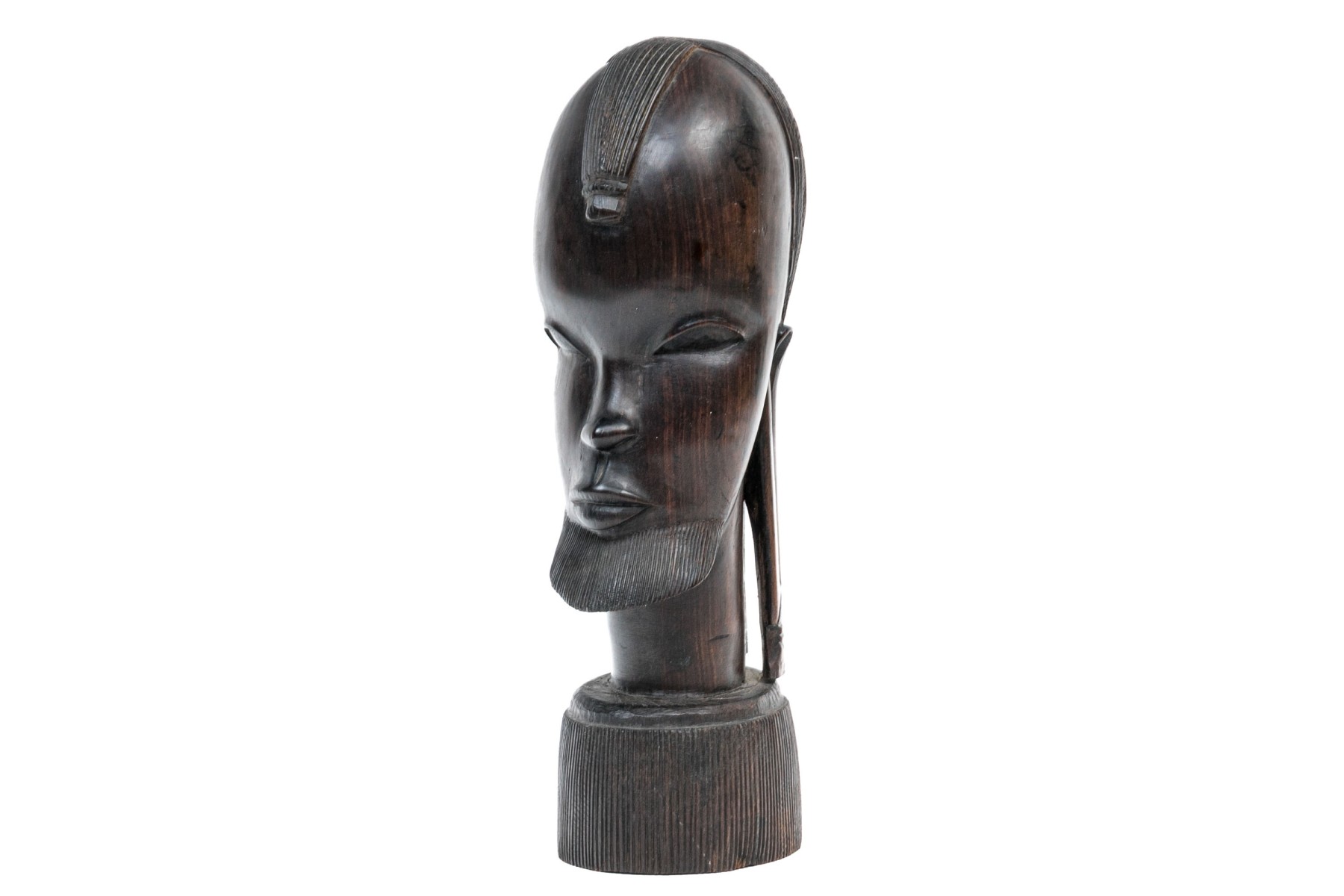 A finely carved dark wood bust of a bearded male in a modern style with an elongated shape with long earlobes and thin wavy banded hair. On a ribbed base.