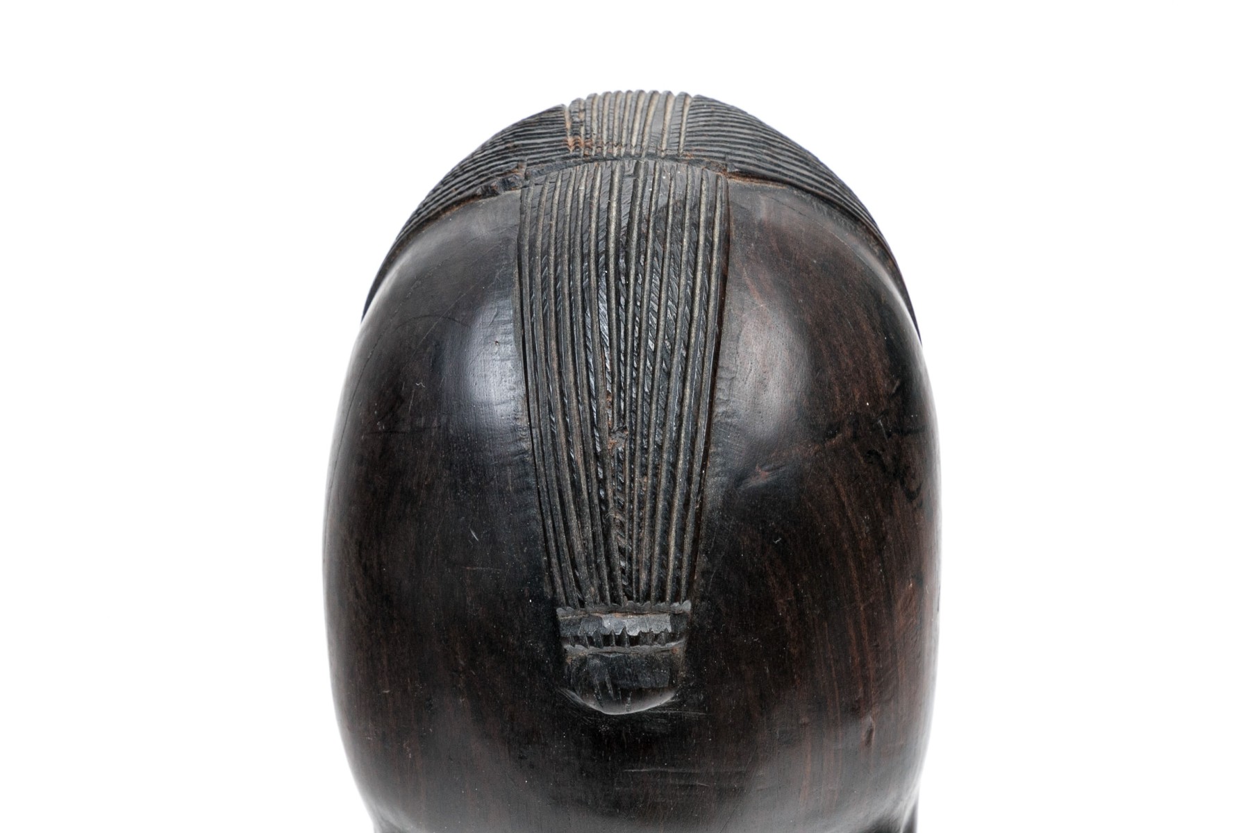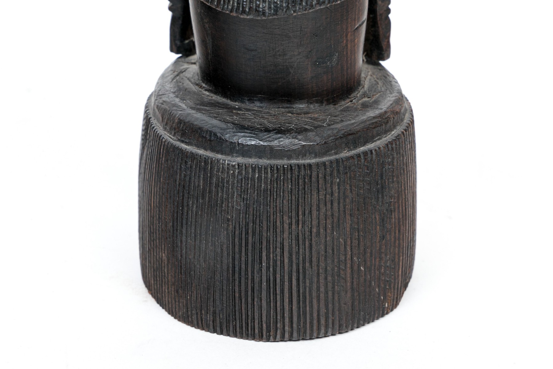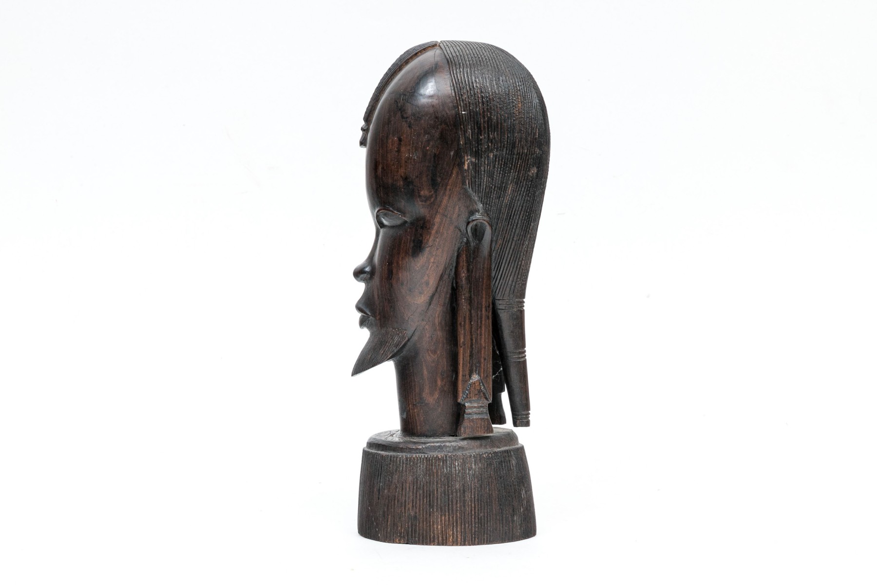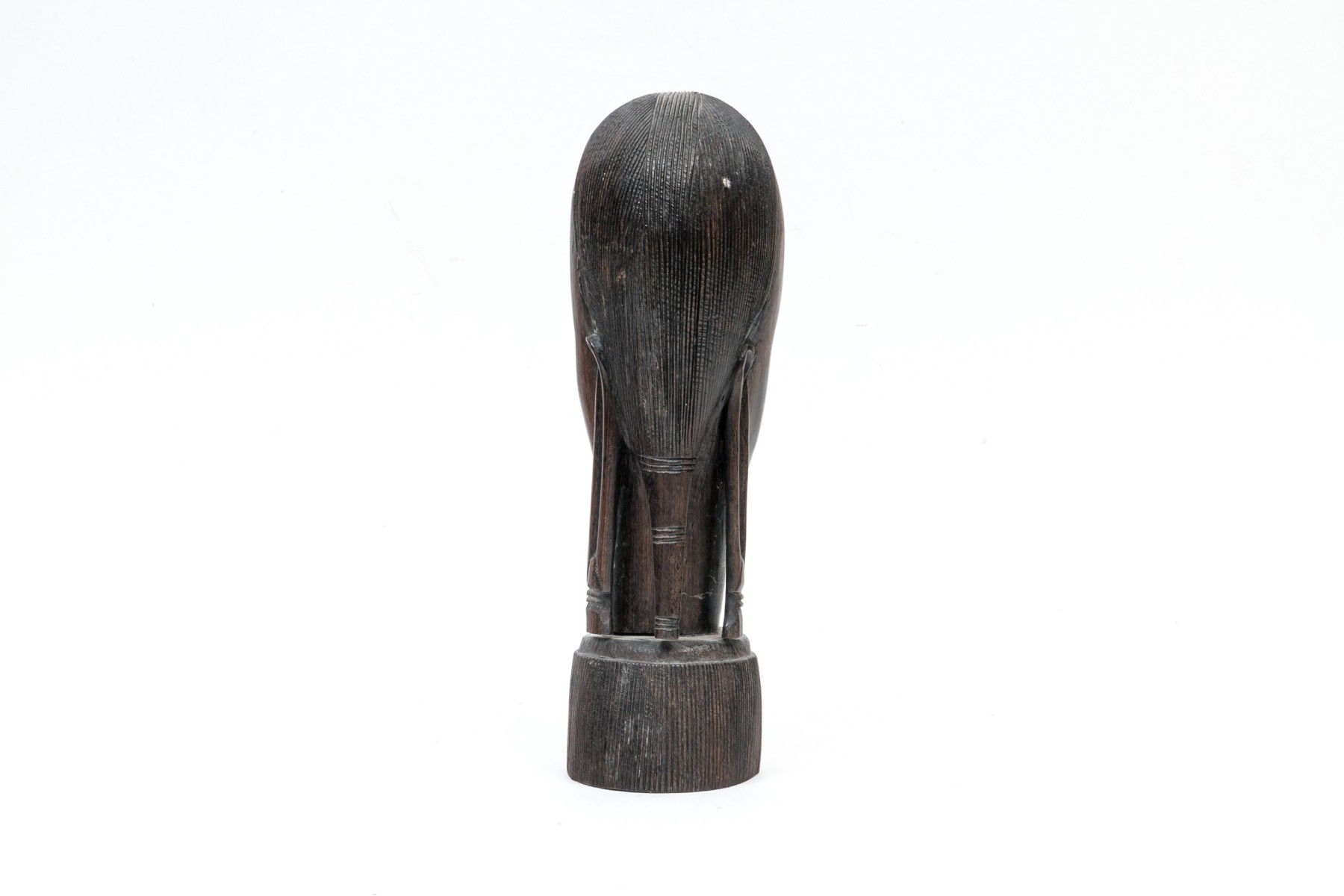 A finely carved dark wood bust of a bearded male in a modern style with an elongated shape with long earlobes and thin wavy banded hair. On a ribbed base.