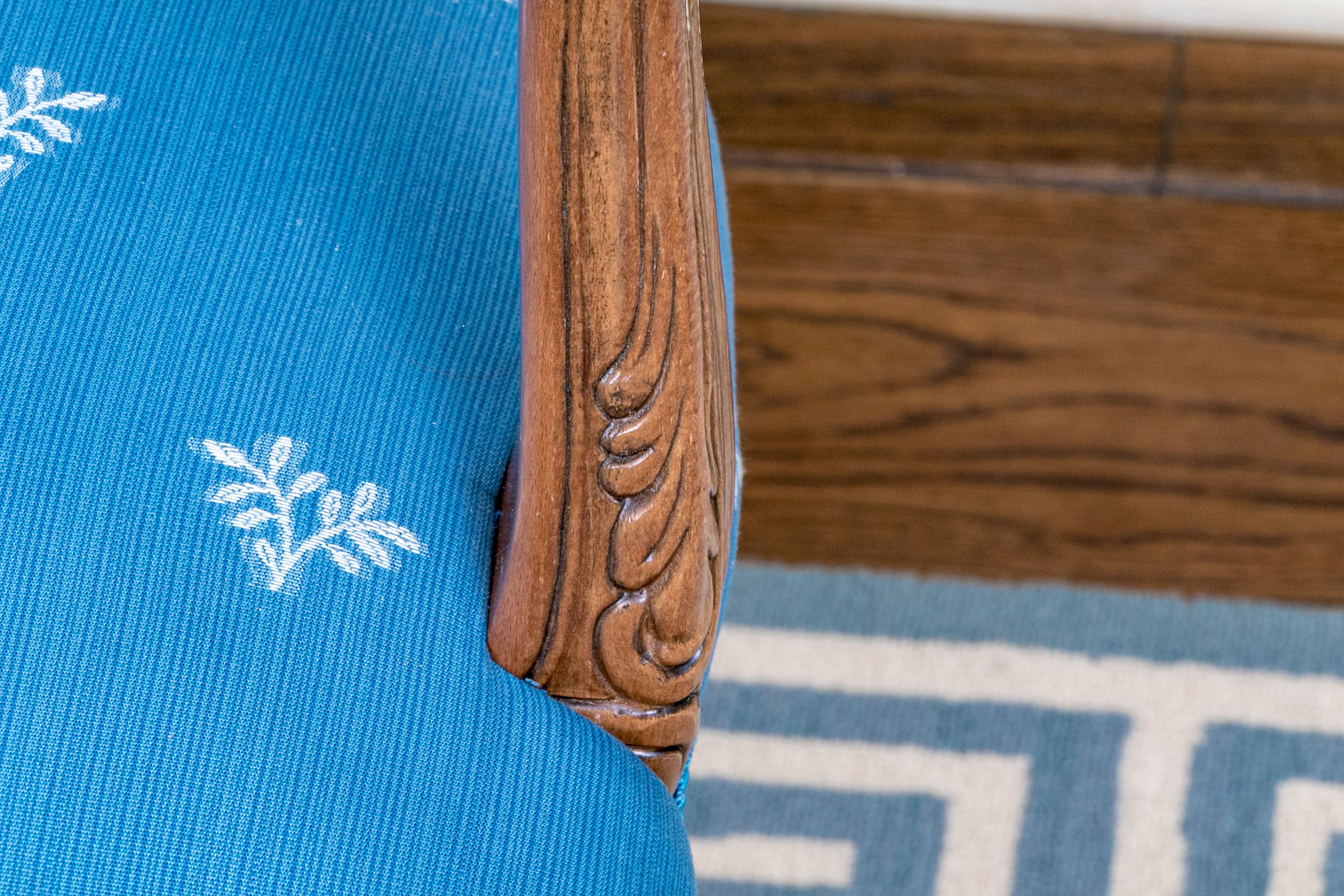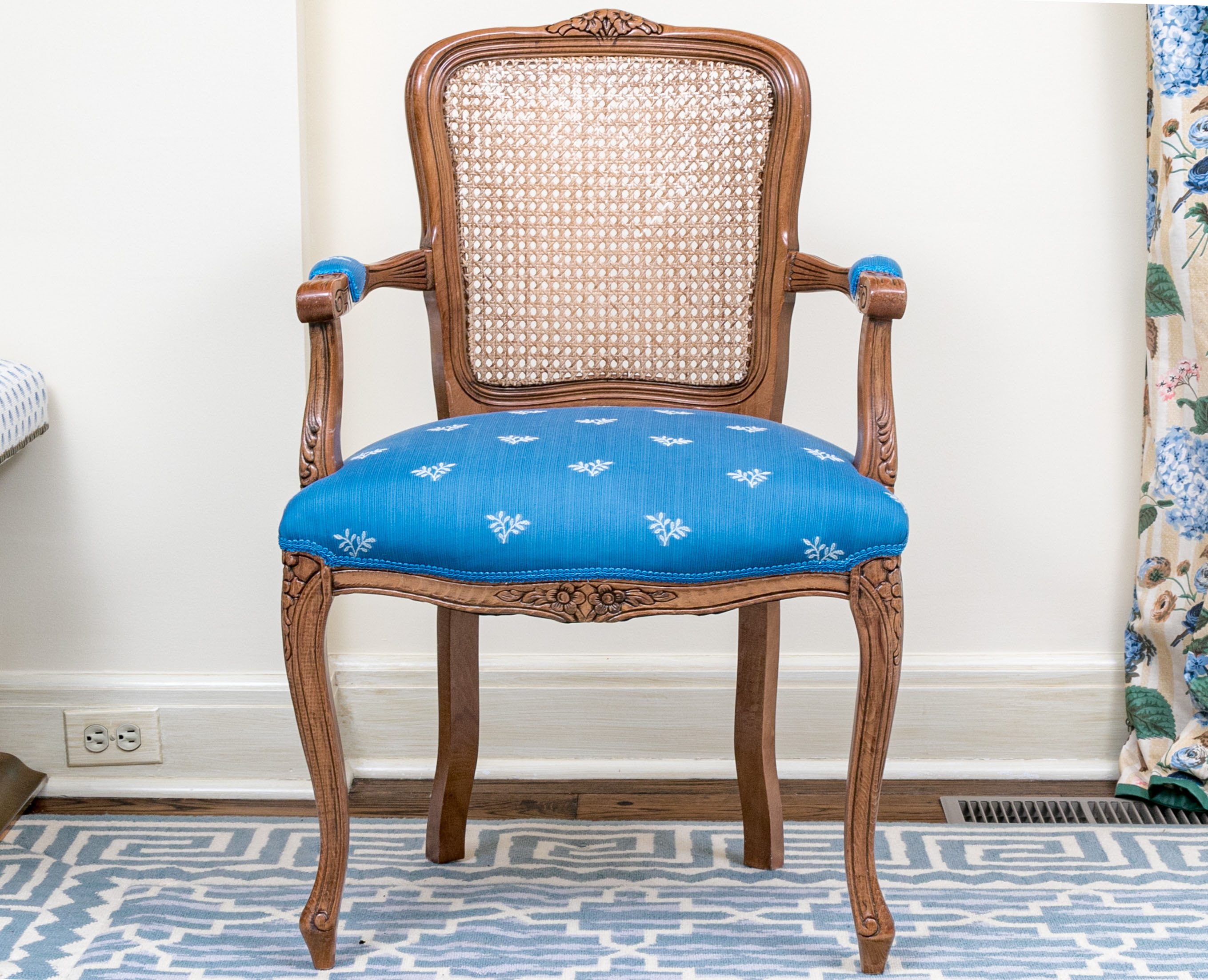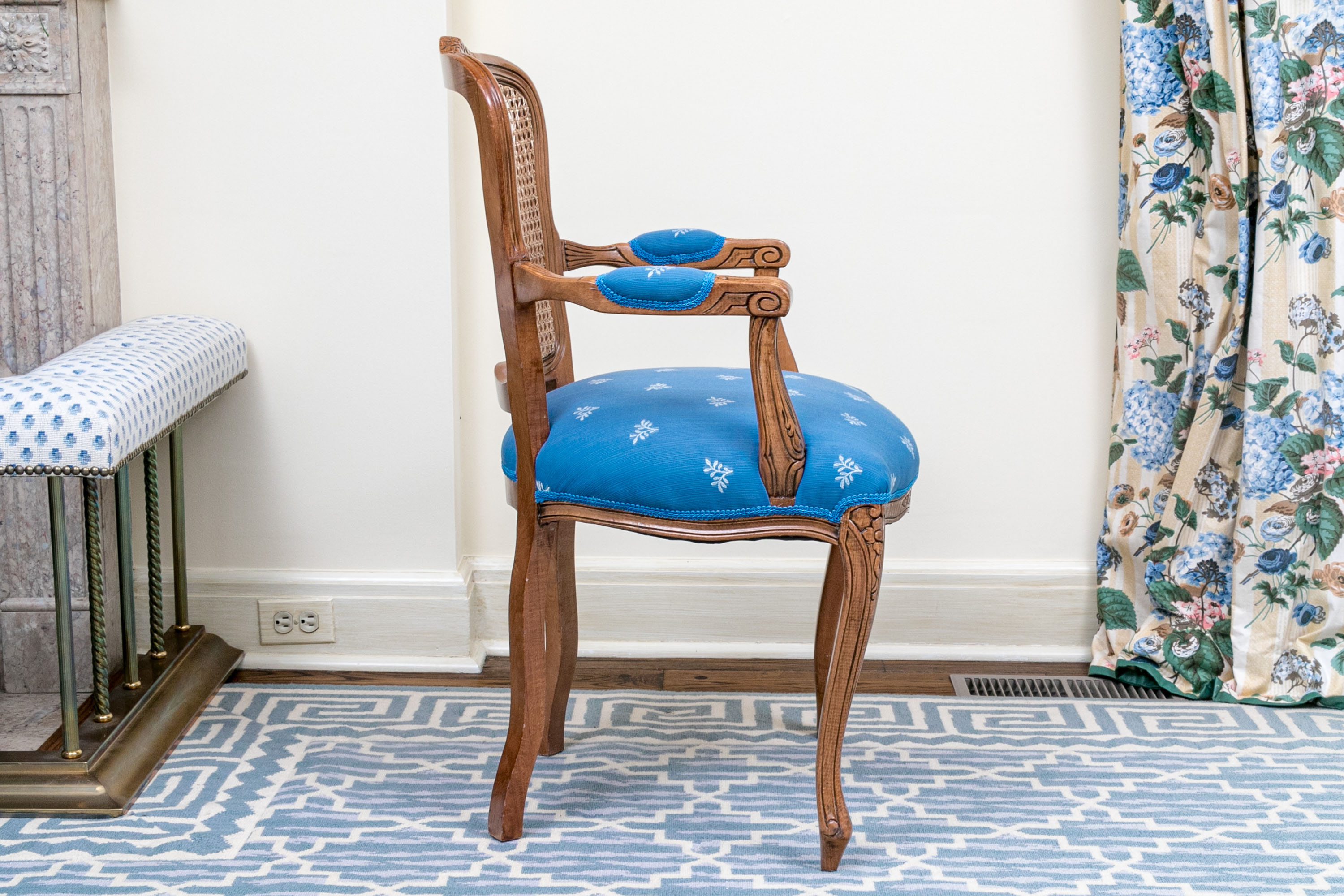 On front cabriole legs with custom upholstered seat with white flourishes against blue ground with upholstered arms pads. Floral carved embellishment to top of seat rail. Caned back.