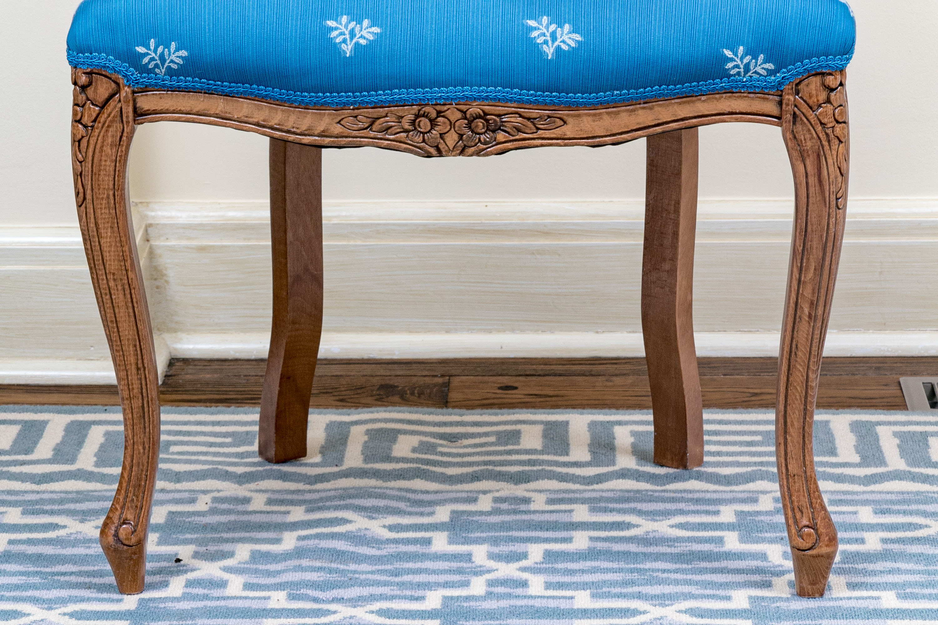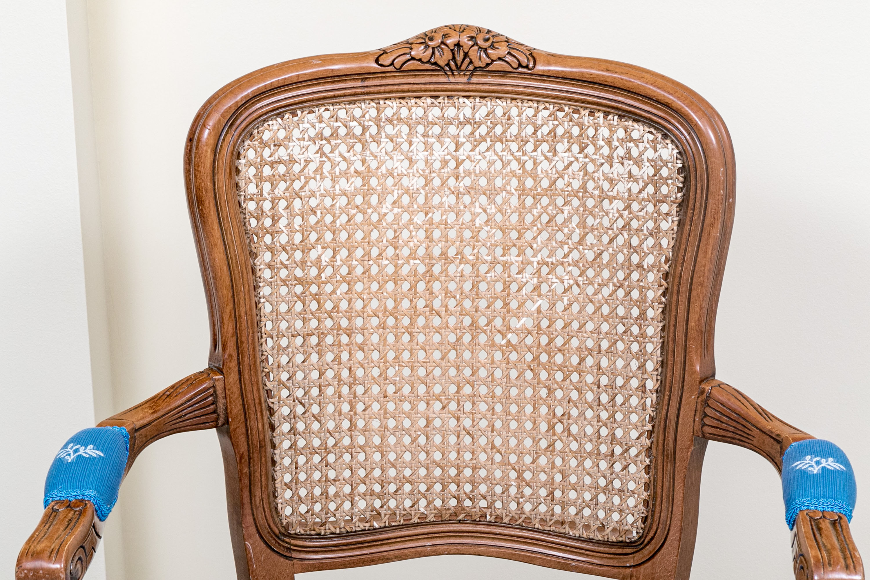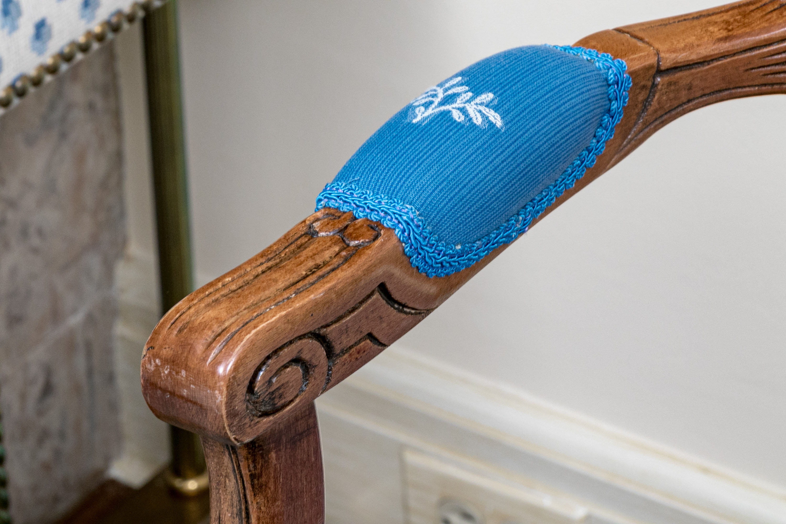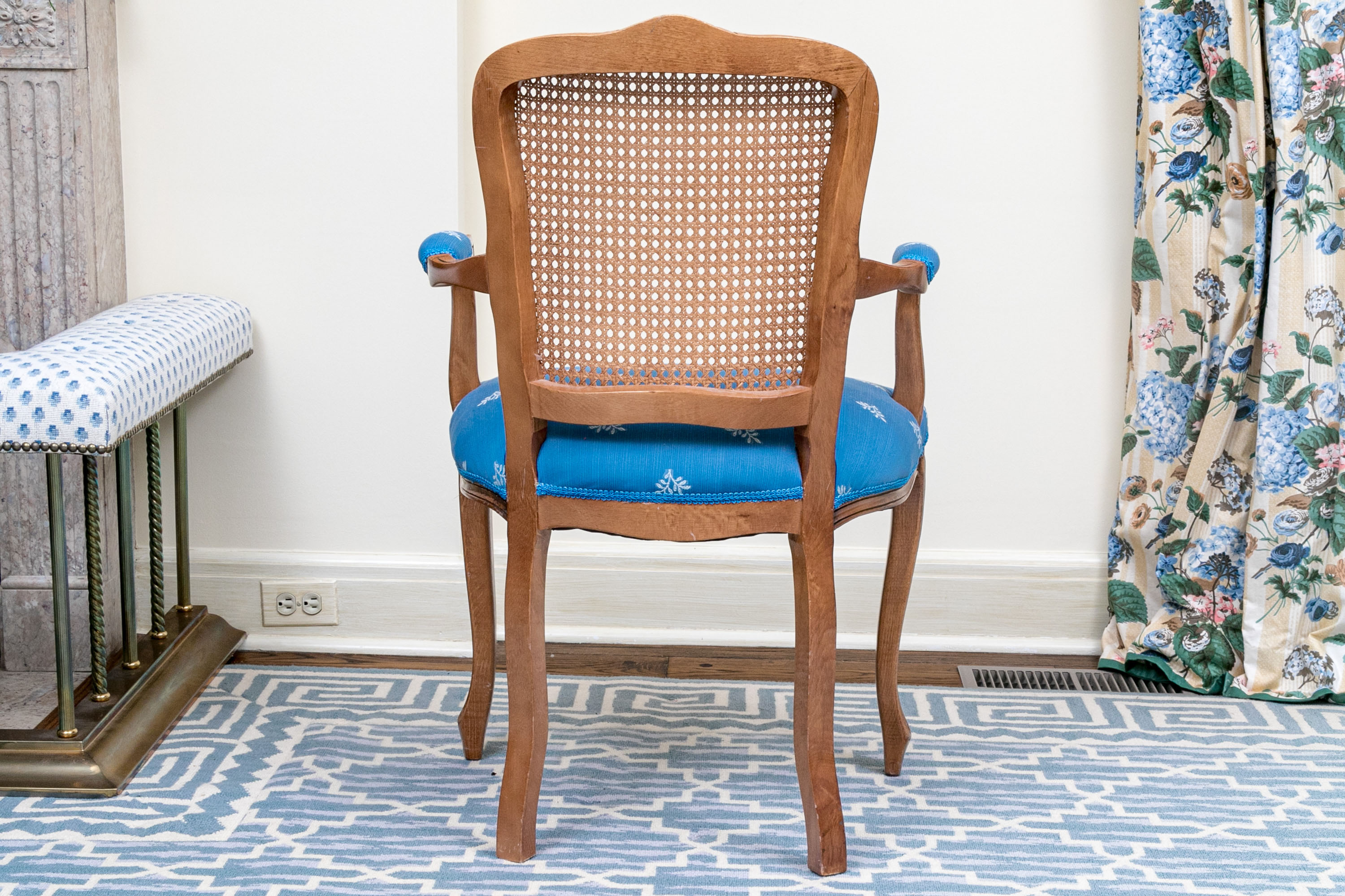 On front cabriole legs with custom upholstered seat with white flourishes against blue ground with upholstered arms pads. Floral carved embellishment to top of seat rail. Caned back.