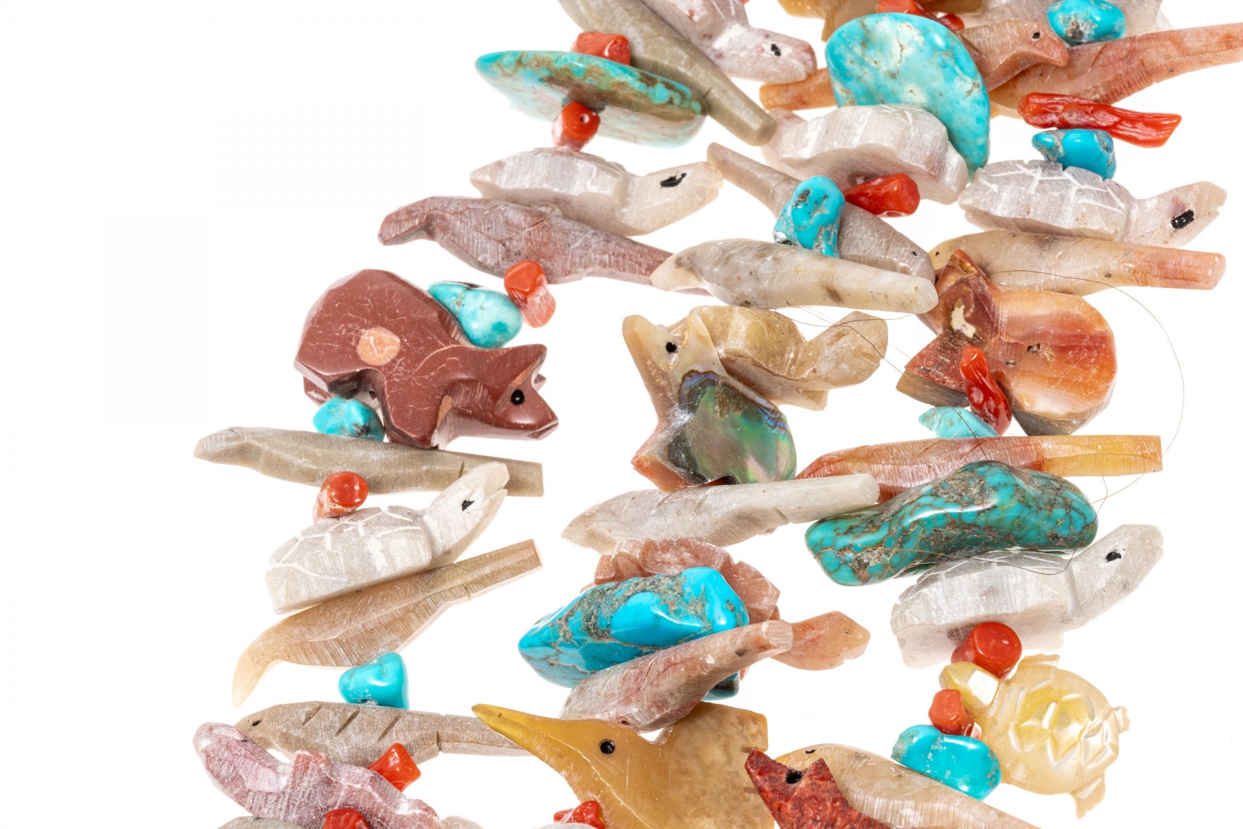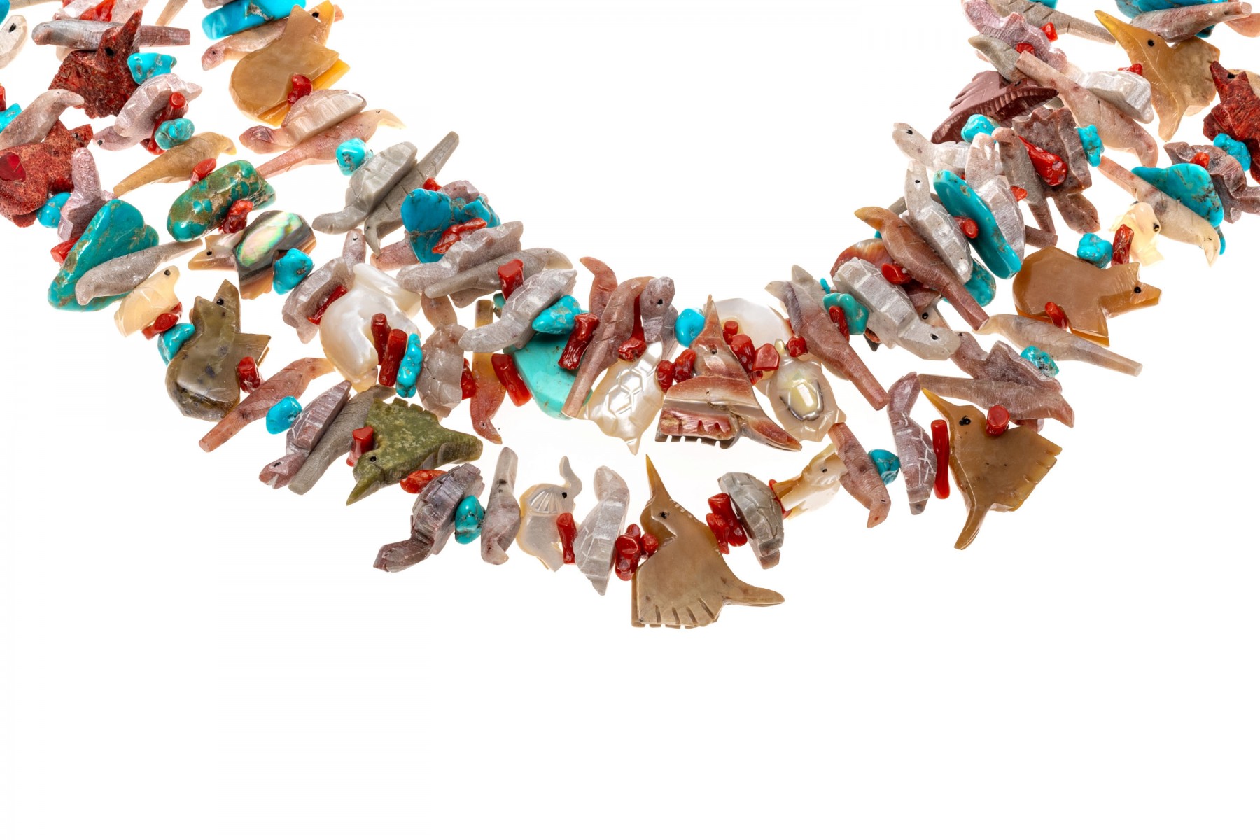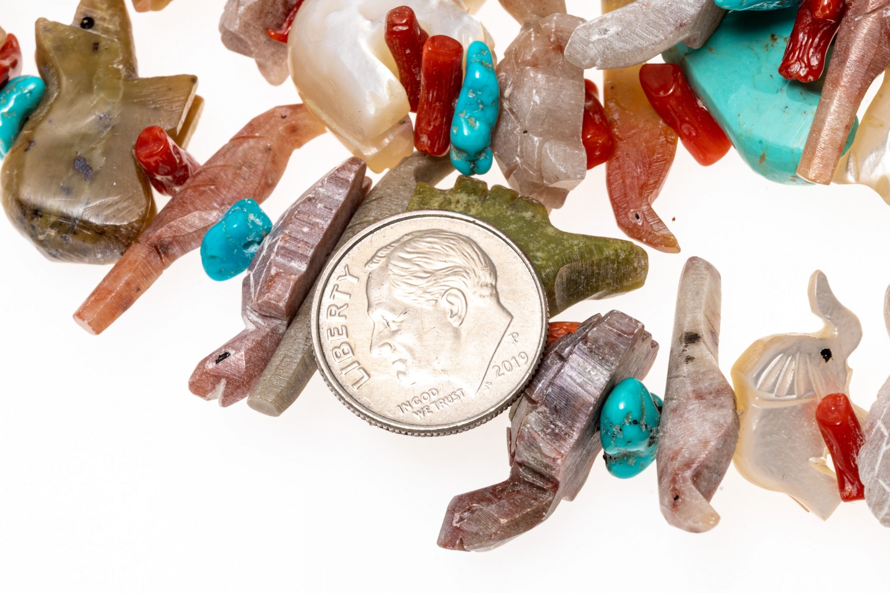 A necklace of multiple strands strung with carved hard stone animals, mother of pearl, turquoise, coral and jasper. The necklace secures with sterling silver hook style clasp.