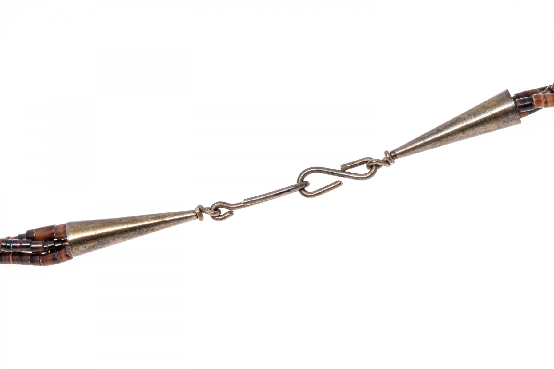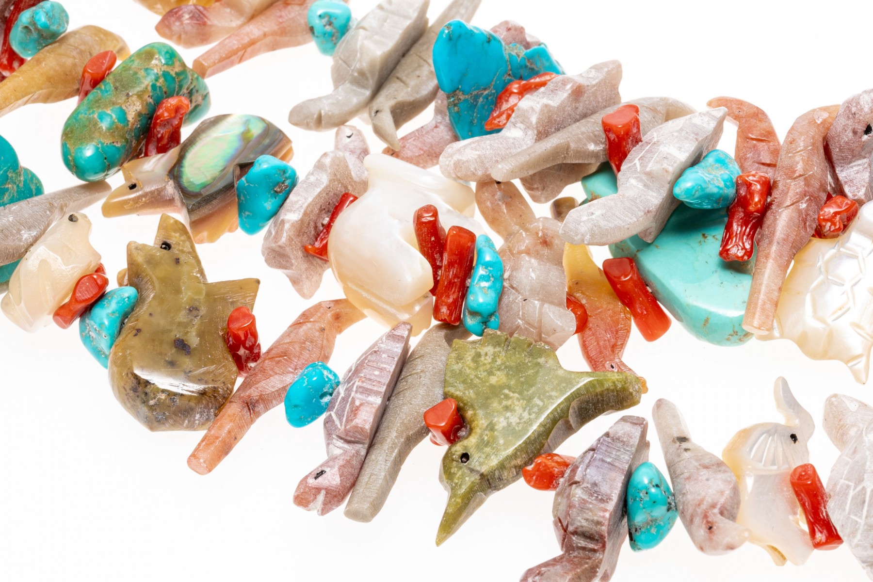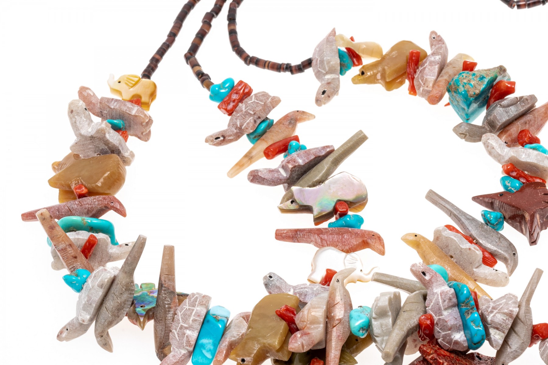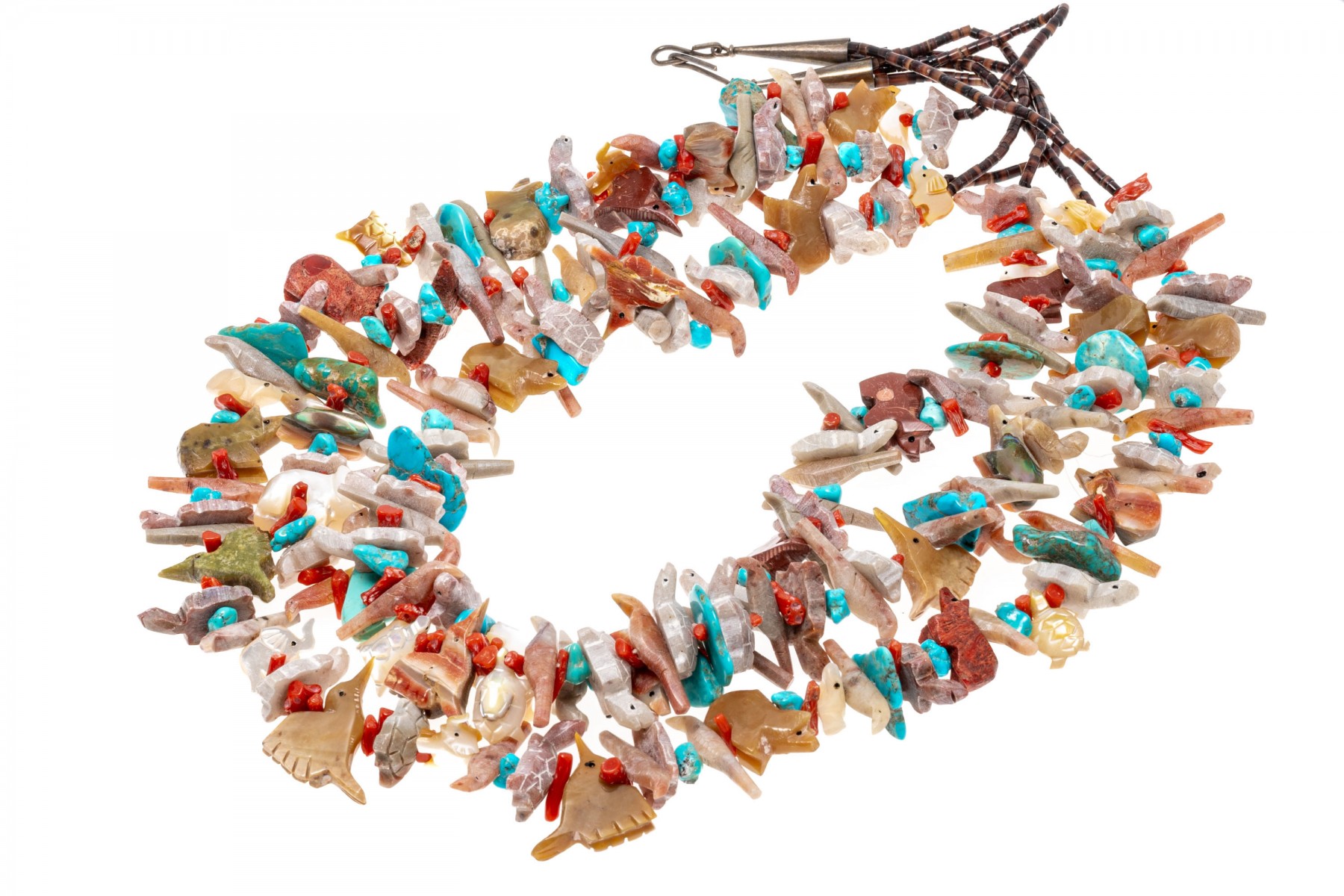 A necklace of multiple strands strung with carved hard stone animals, mother of pearl, turquoise, coral and jasper. The necklace secures with sterling silver hook style clasp.