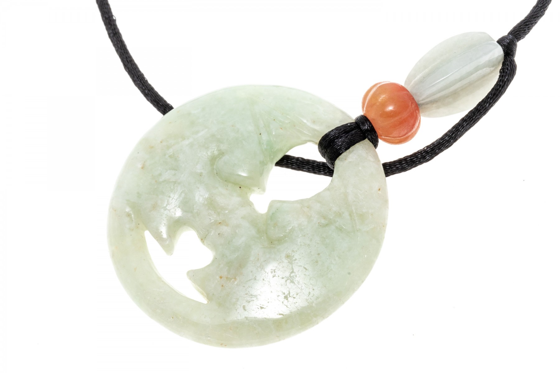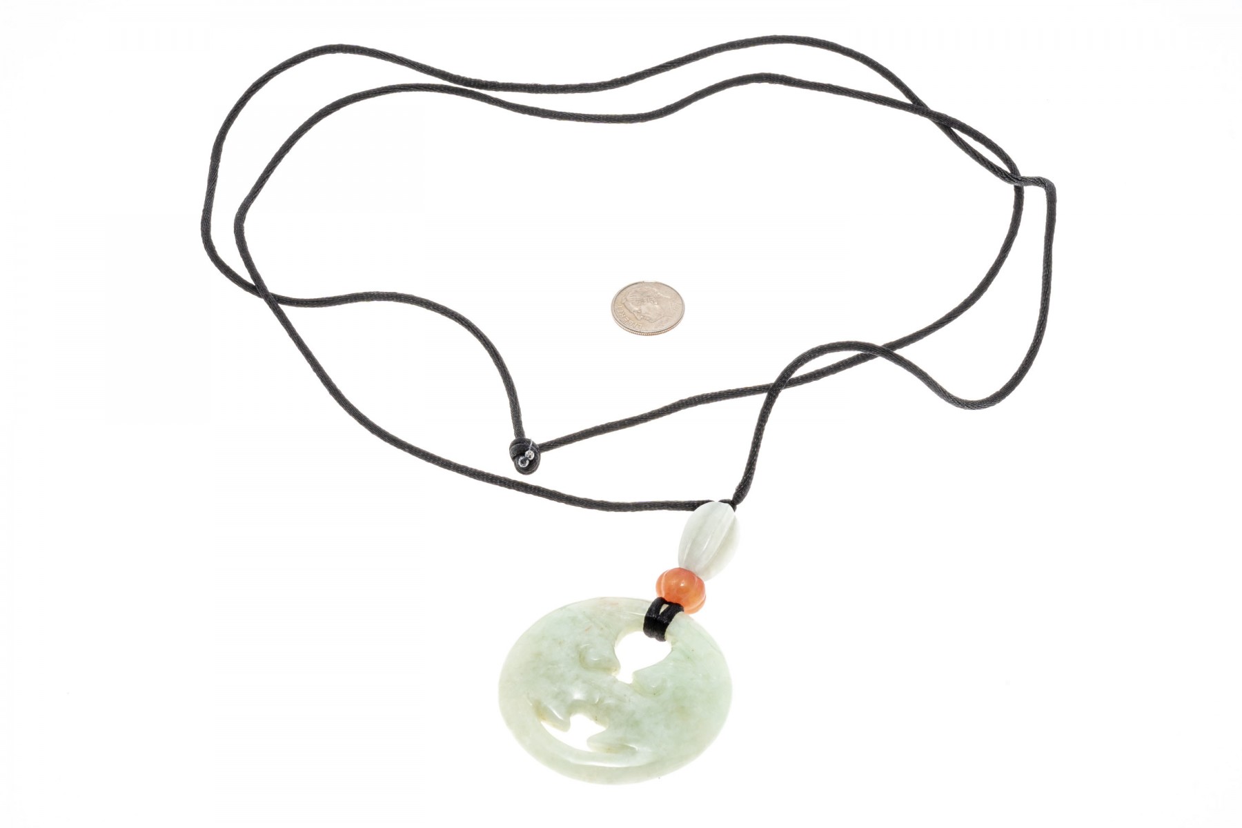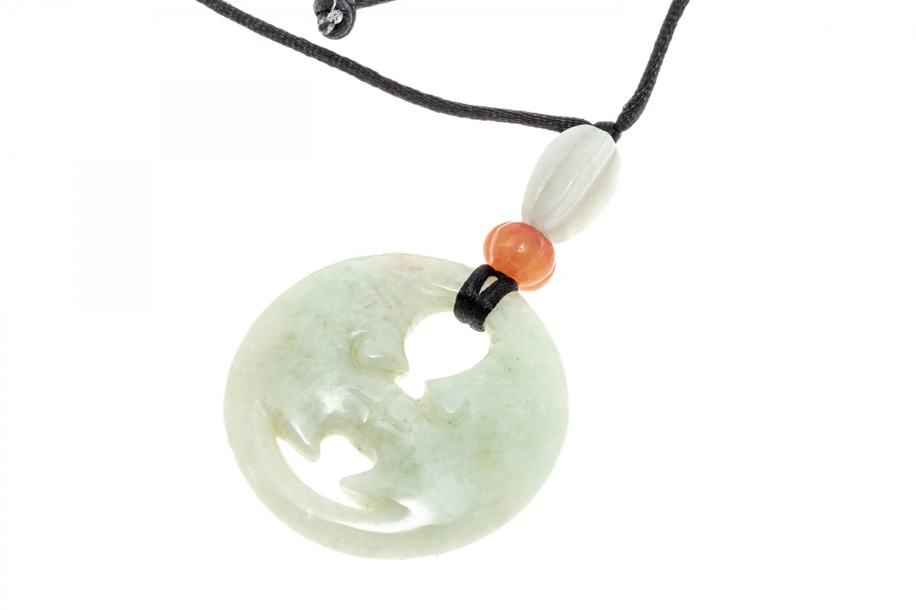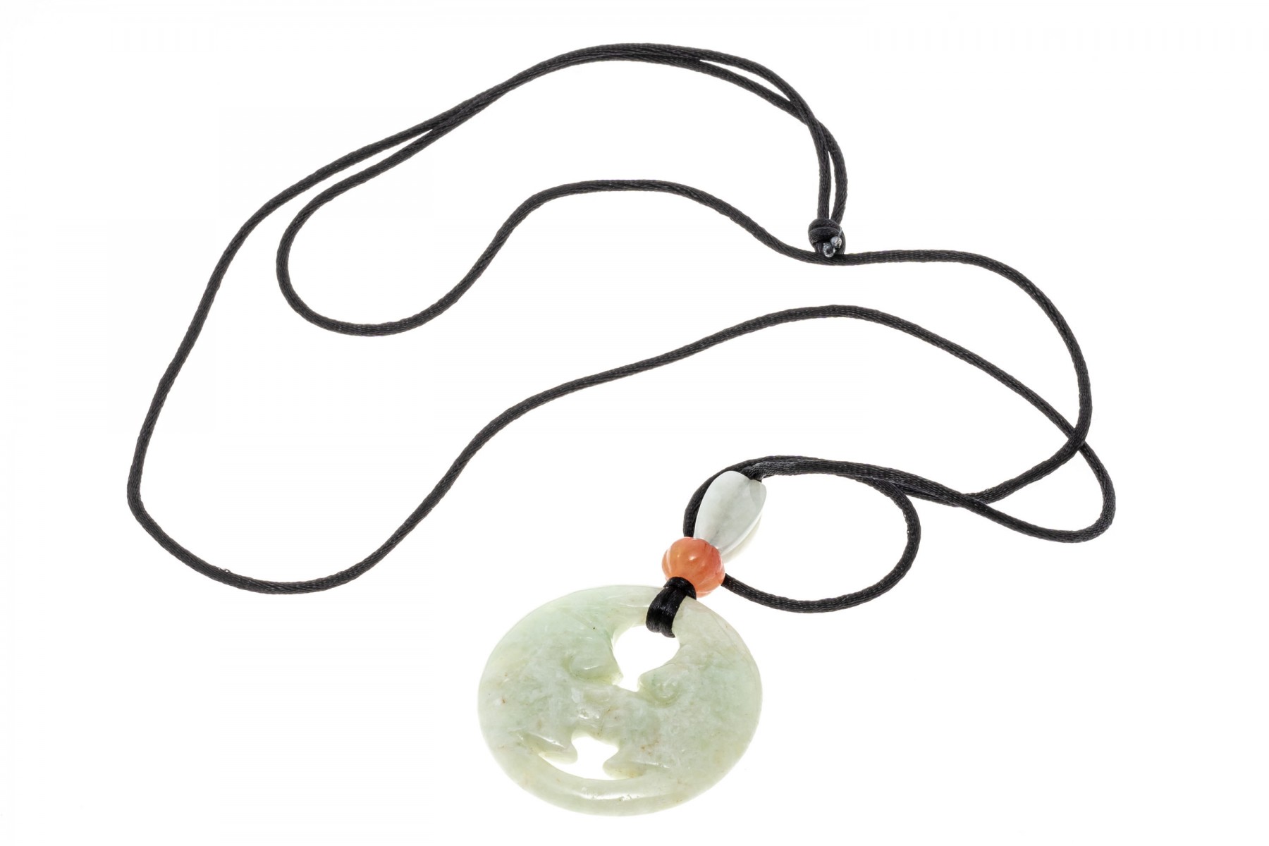 Pendant necklace. Suspended from a black cord is a carved jade pendant with a soft green color.