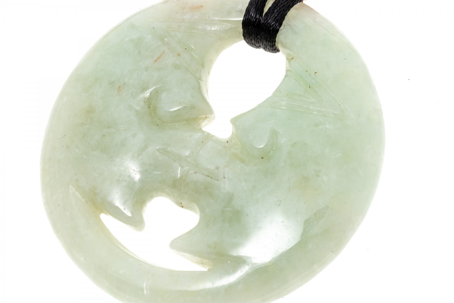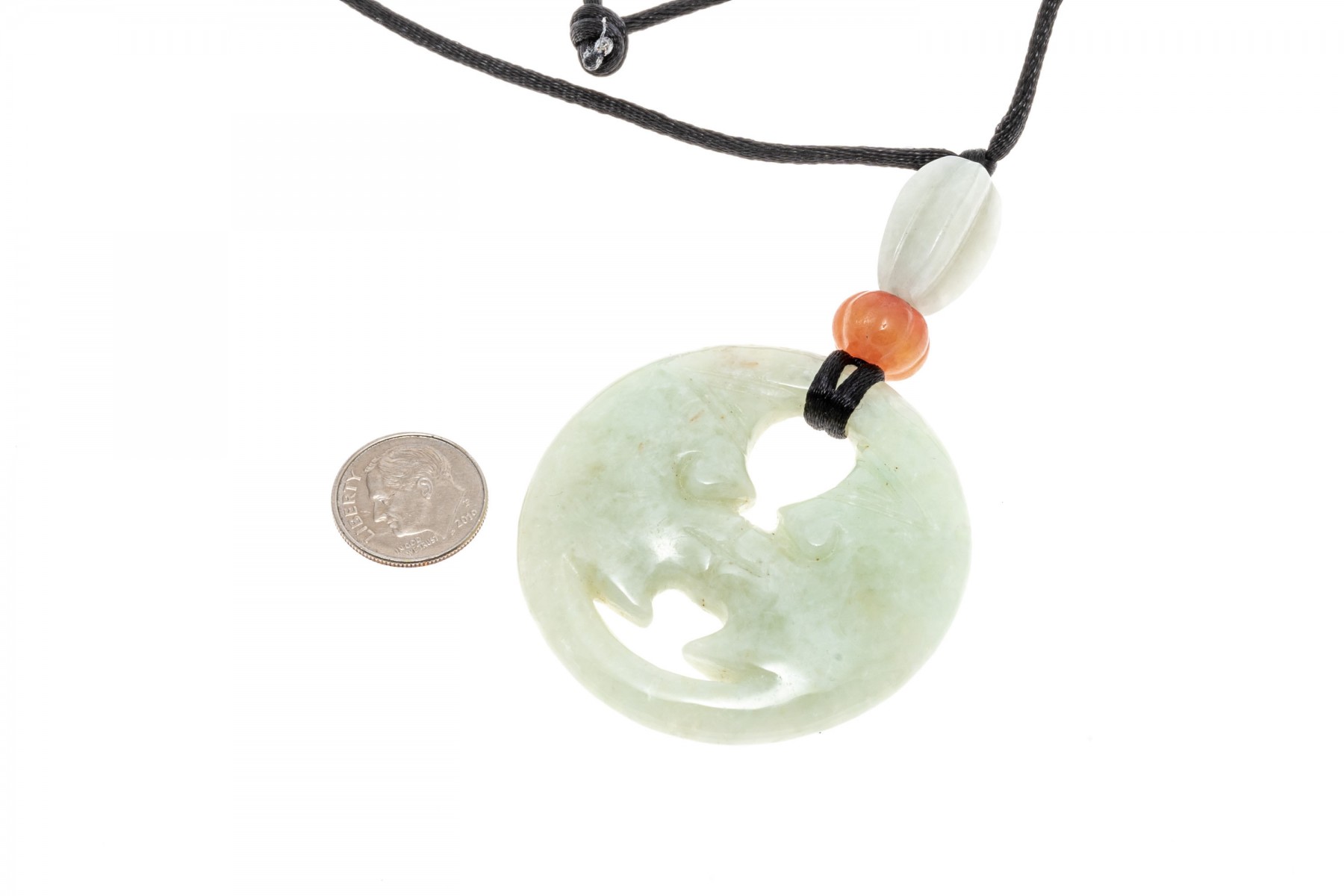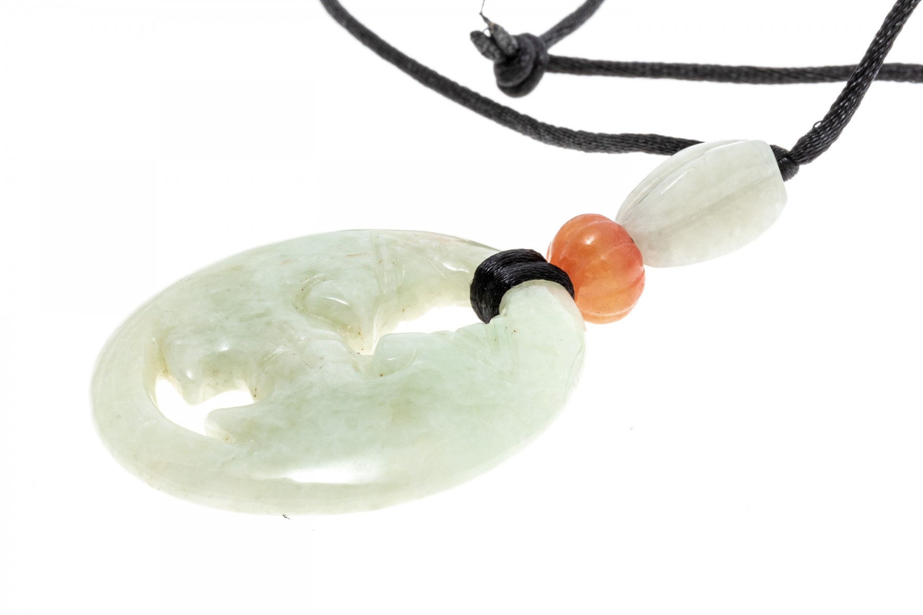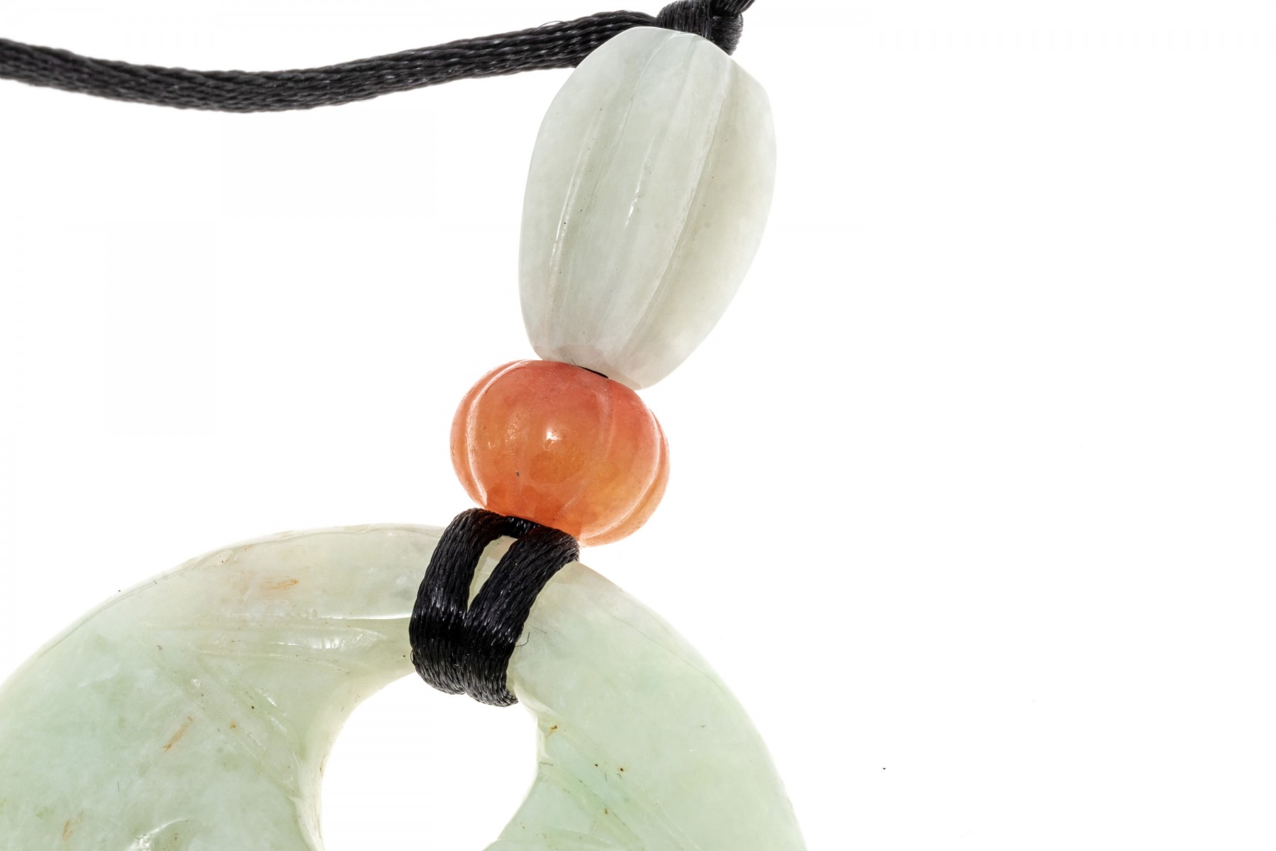 Pendant necklace. Suspended from a black cord is a carved jade pendant with a soft green color.
